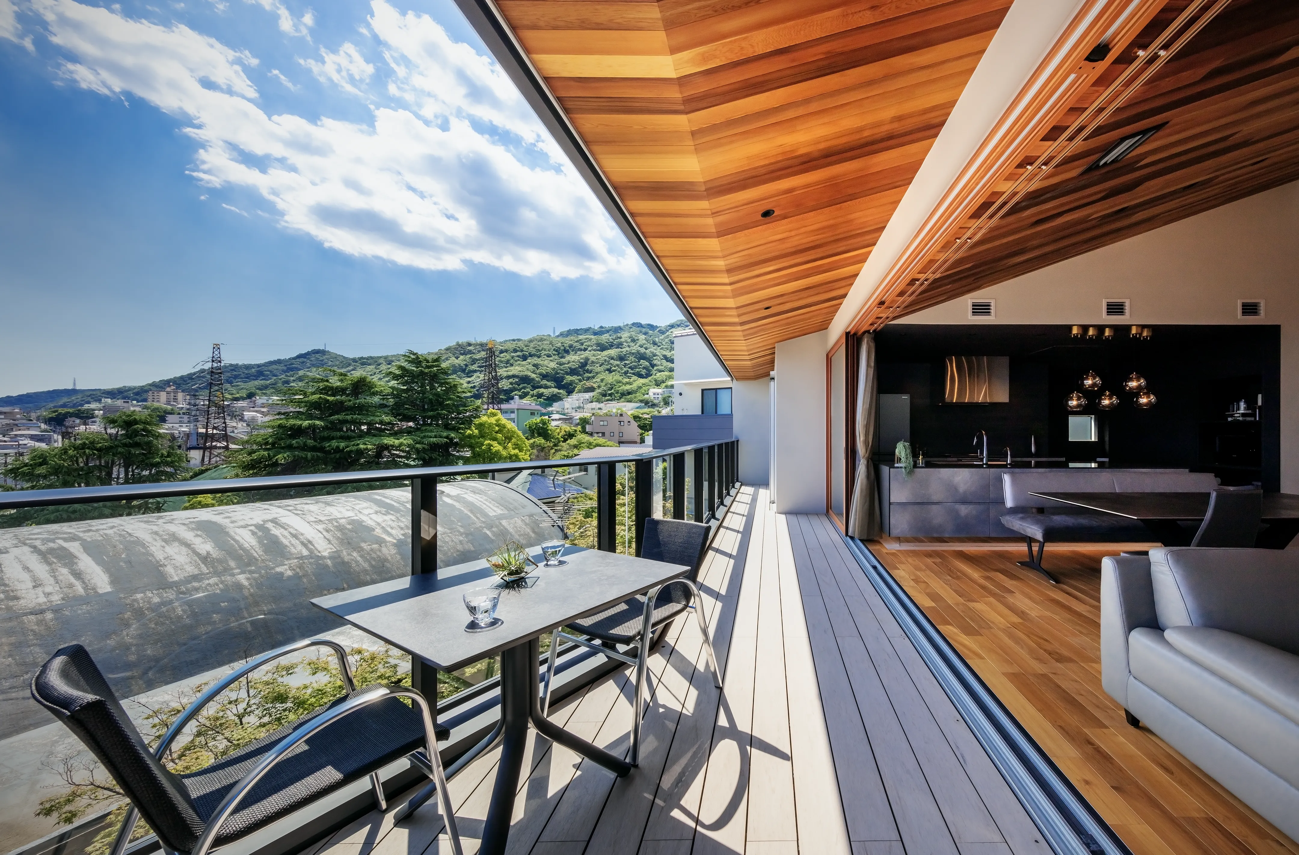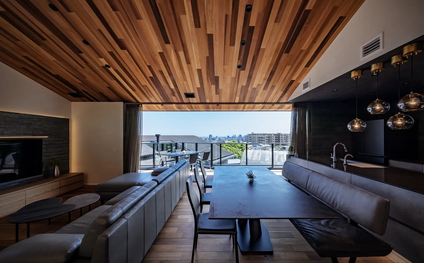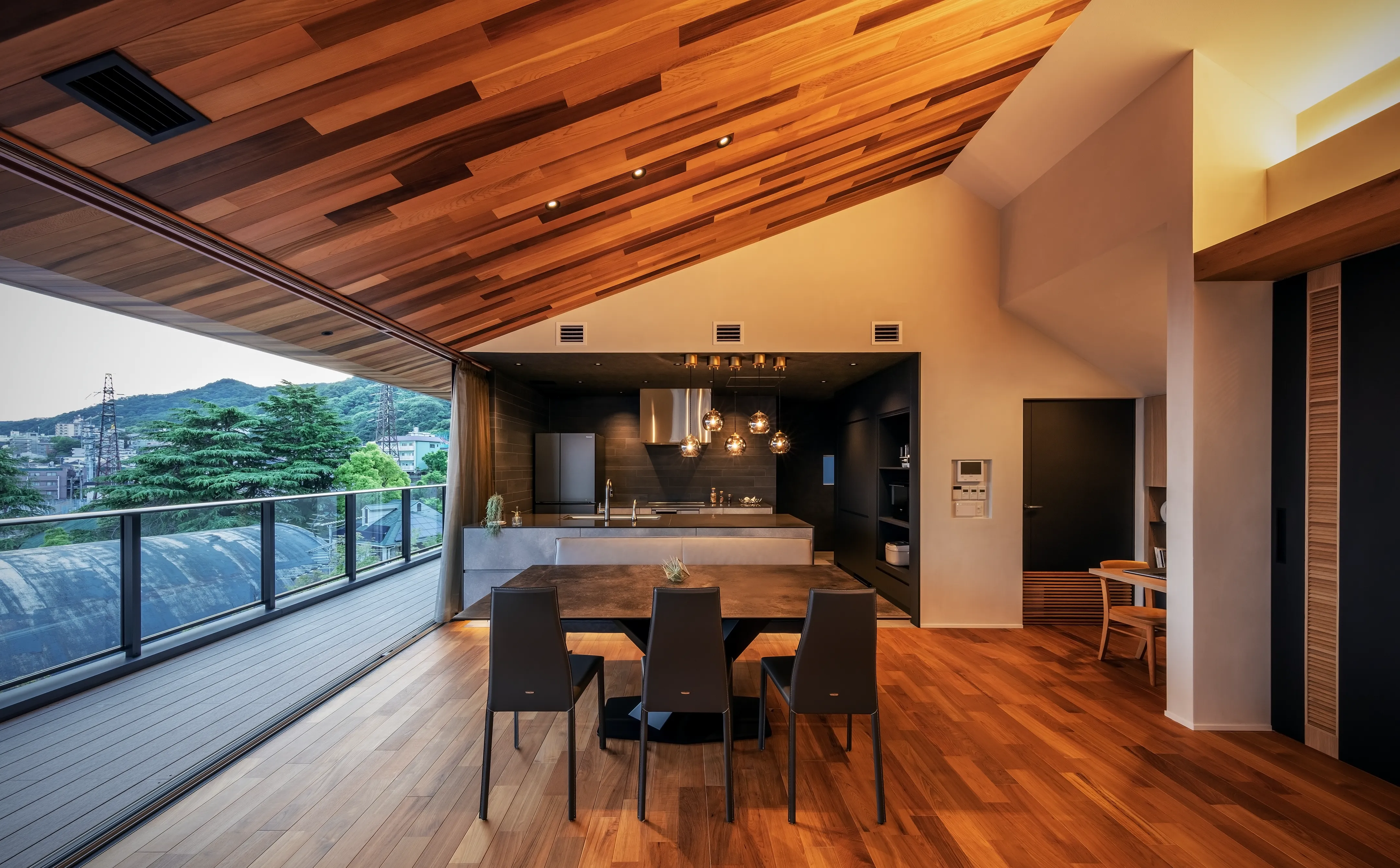 On the second floor, the LDK expands into the 9.2-tatami panoramic terrace to form a space that feels as large as 35-tatami. The opening between the LDK and the terrace measures 4.9 m wide and 2.5 m high; its four panels slide fully into the wall to open the entire span. The terrace railing uses glass panels, and the floor continues as a wood deck aligned with the LDK flooring. The usual raised waterproof threshold step of about 200 mm was eliminated by lowering the waterproof layer, allowing a flat transition. These elements create both openness and continuity that encourage stepping outside.