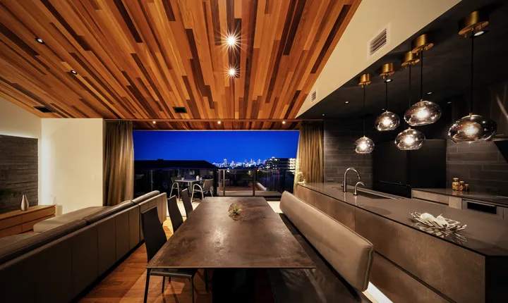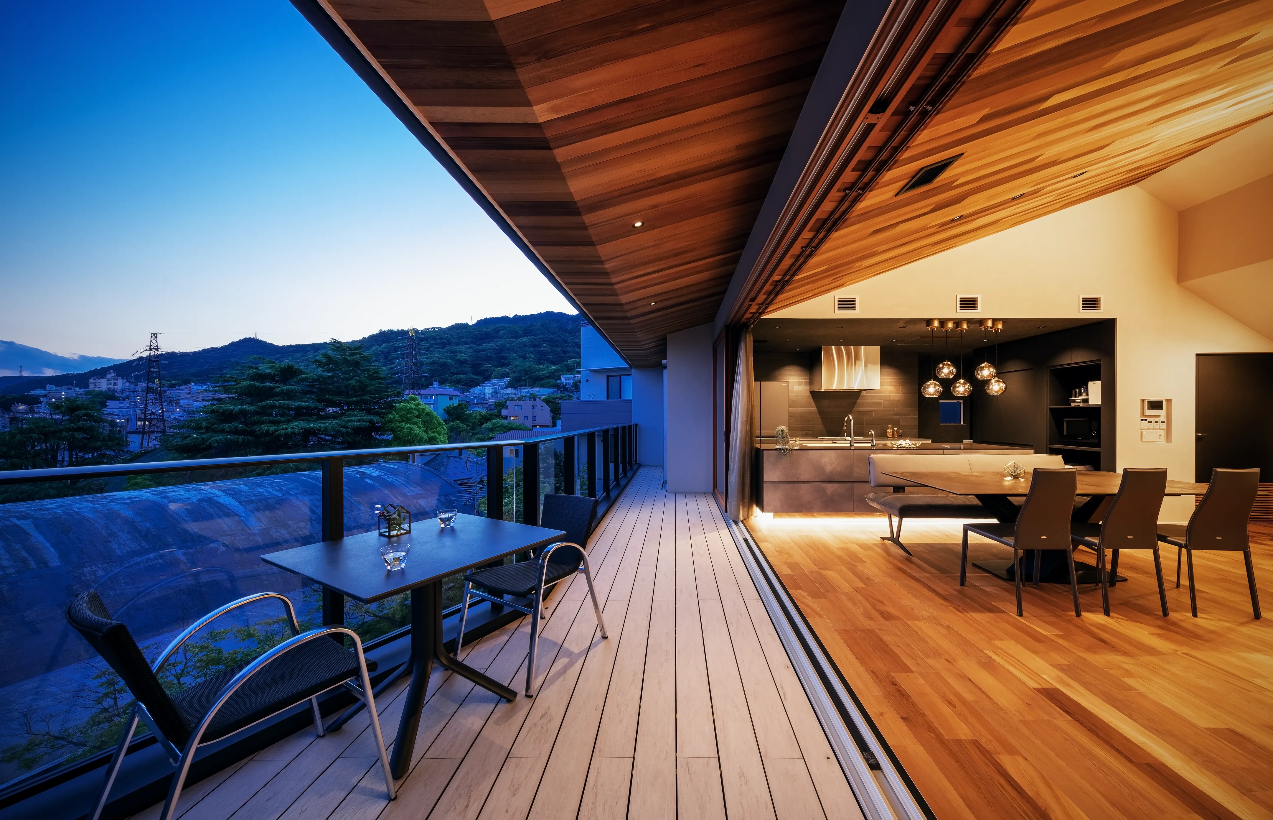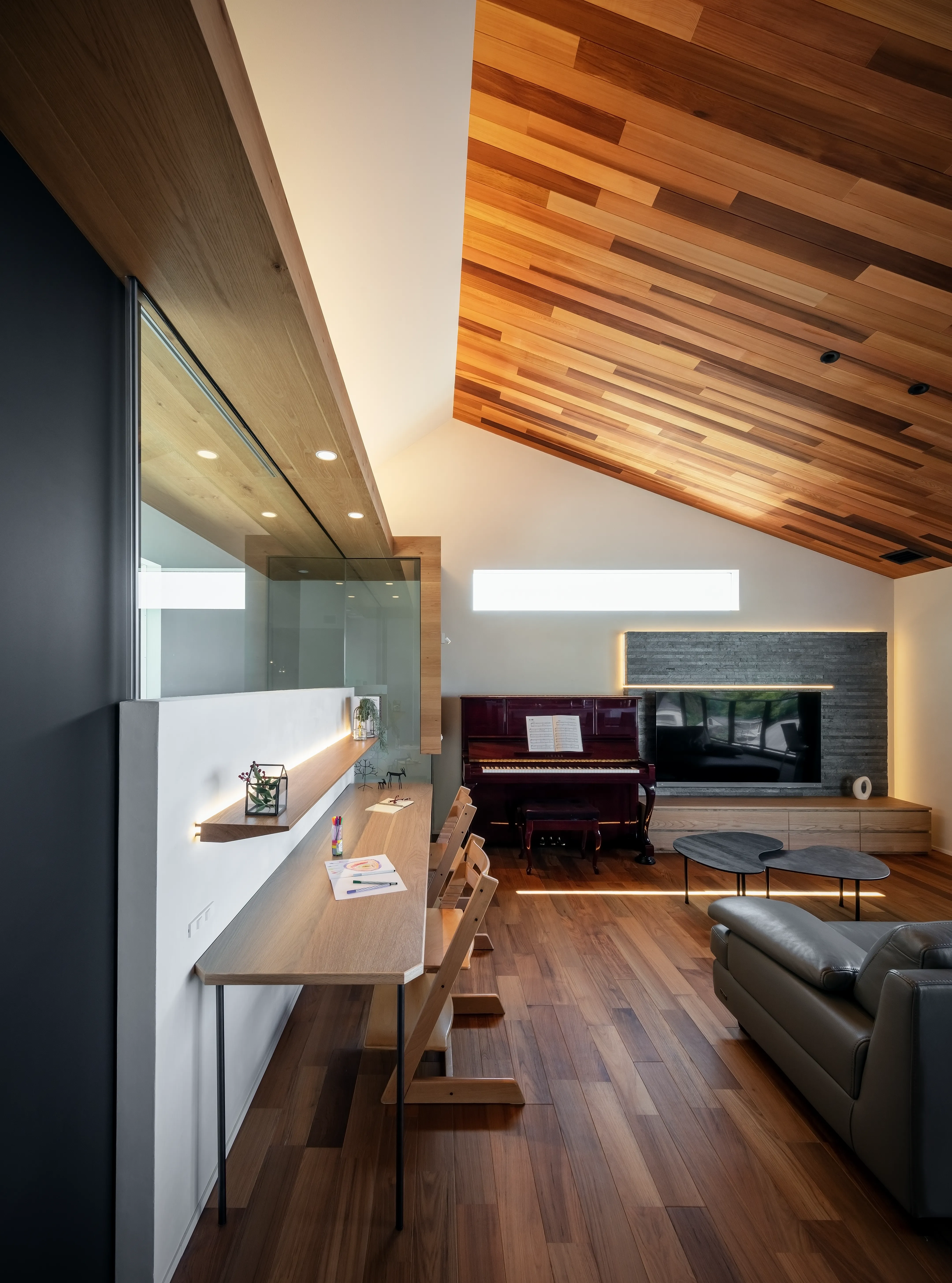 On the second floor, the LDK expands into the 9.2-tatami panoramic terrace to form a space that feels as large as 35-tatami. The opening between the LDK and the terrace measures 4.9 m wide and 2.5 m high; its four panels slide fully into the wall to open the entire span. The terrace railing uses glass panels, and the floor continues as a wood deck aligned with the LDK flooring. The usual raised waterproof threshold step of about 200 mm was eliminated by lowering the waterproof layer, allowing a flat transition. These elements create both openness and continuity that encourage stepping outside.