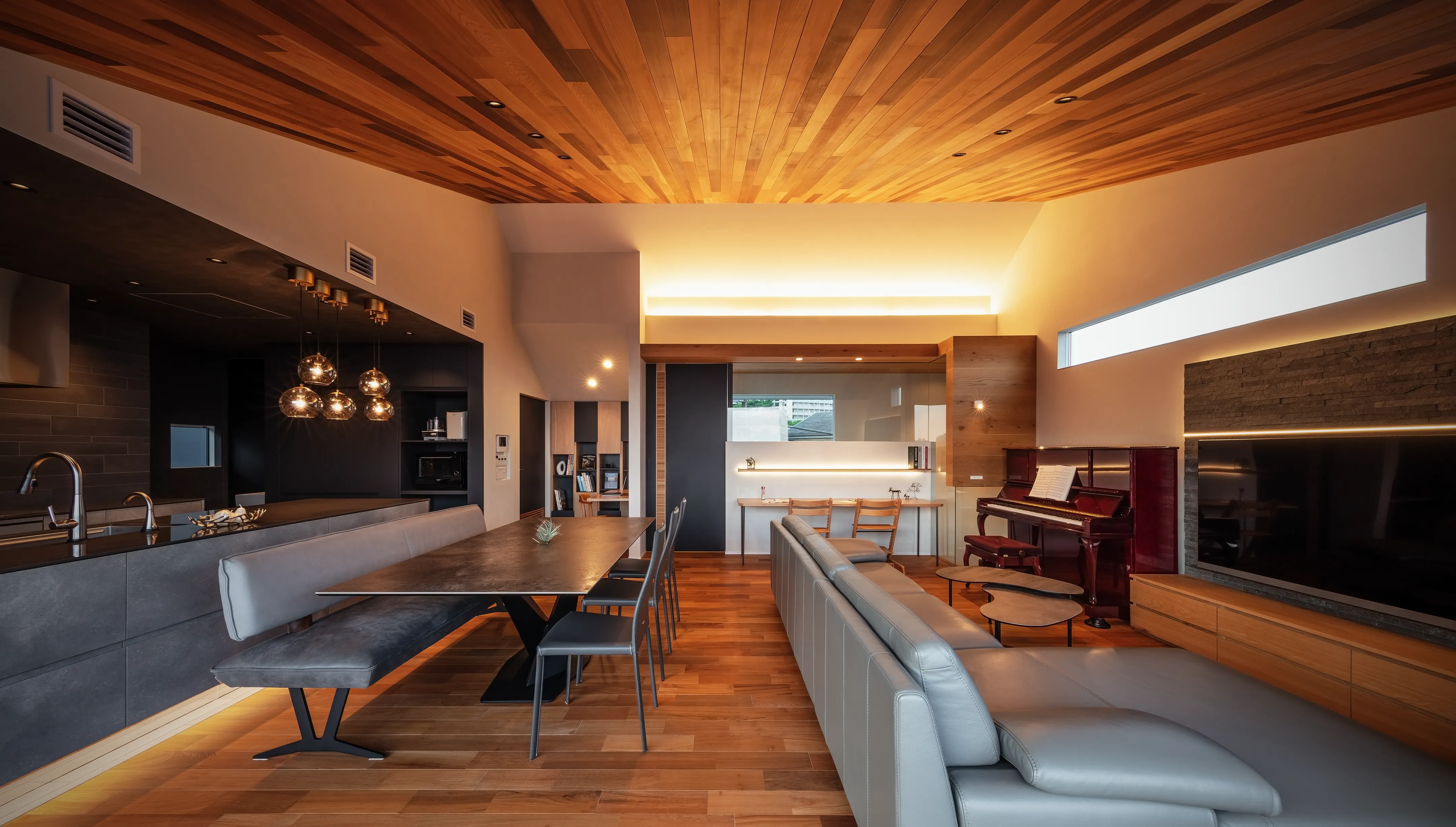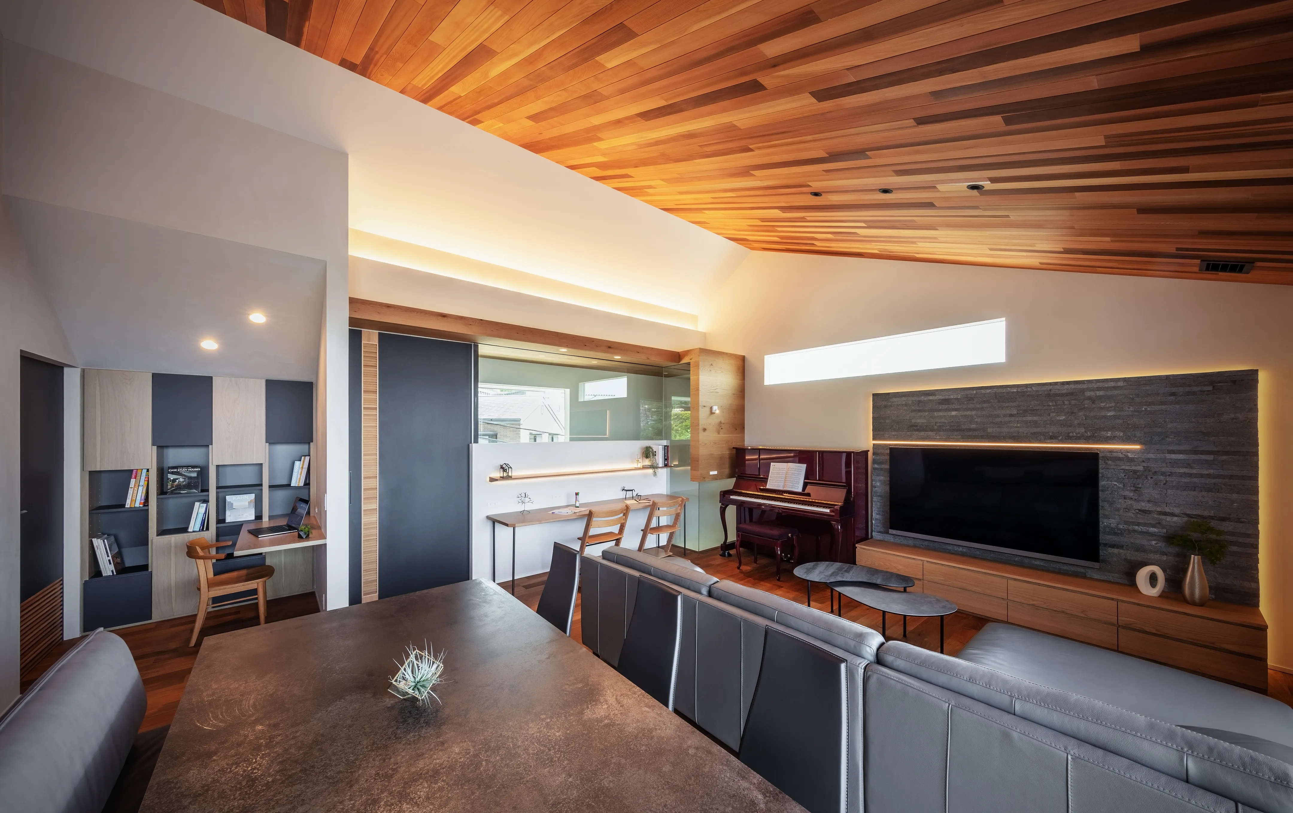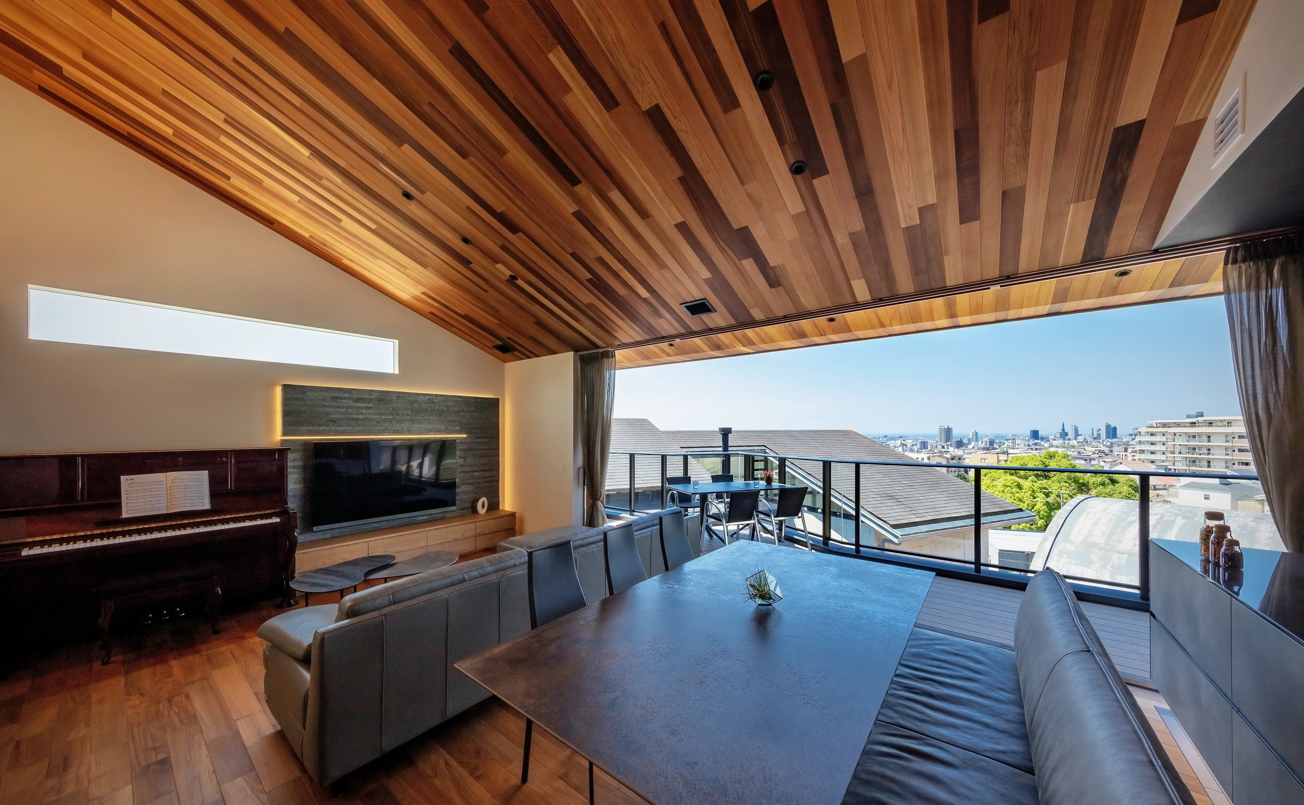 As a result, the private rooms were placed on the first floor, while the second floor was given a panoramic terrace connected directly to the family’s living-dining-kitchen (LDK). The 9.2-tatami panoramic terrace links seamlessly with the 25.8-tatami LDK through a full-opening sash, creating a space that naturally invites one outdoors, functioning almost like an outdoor living room. Together they amount to 35-tatami, with the open view beyond forming a large gathering place for the family.