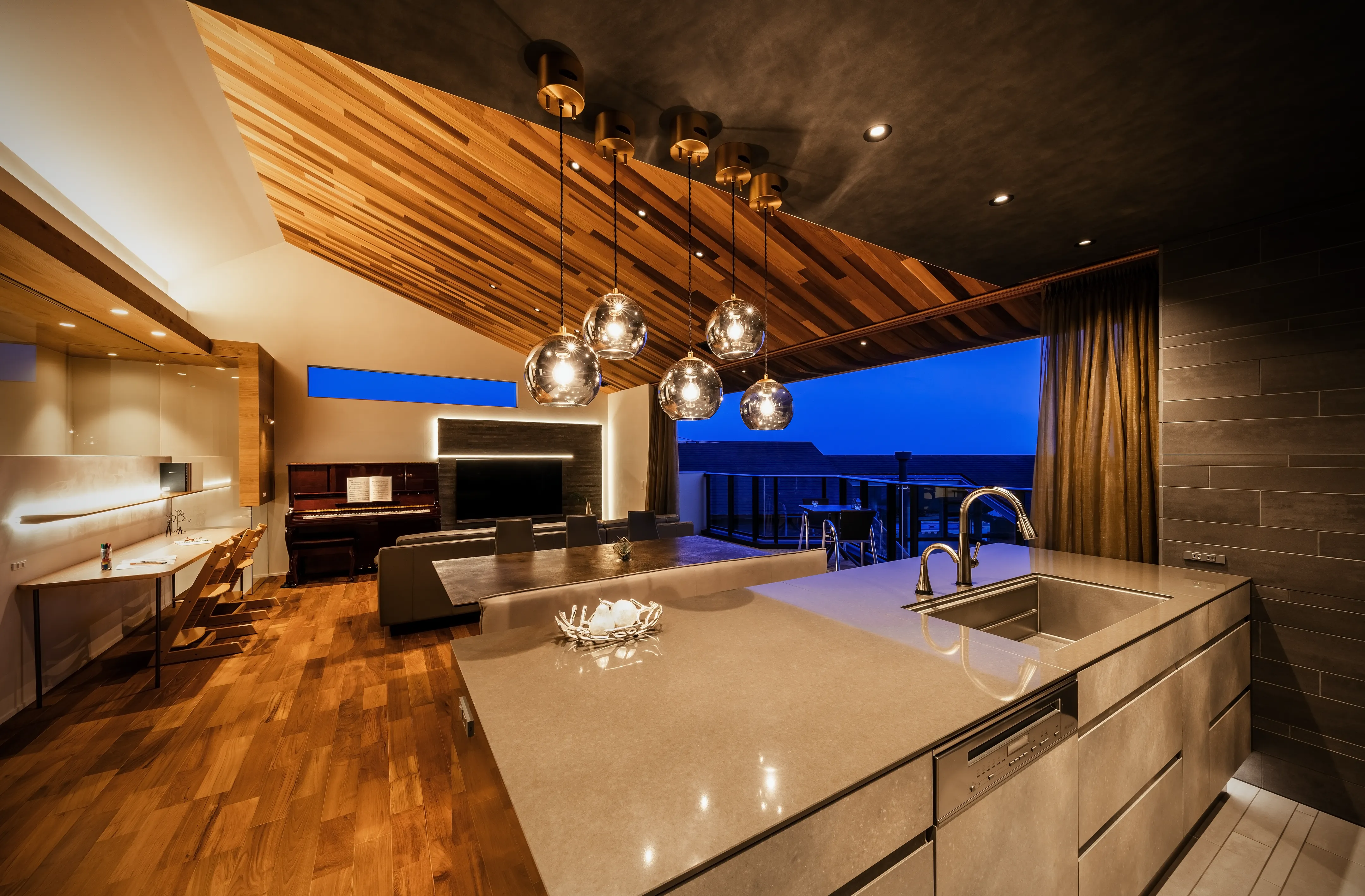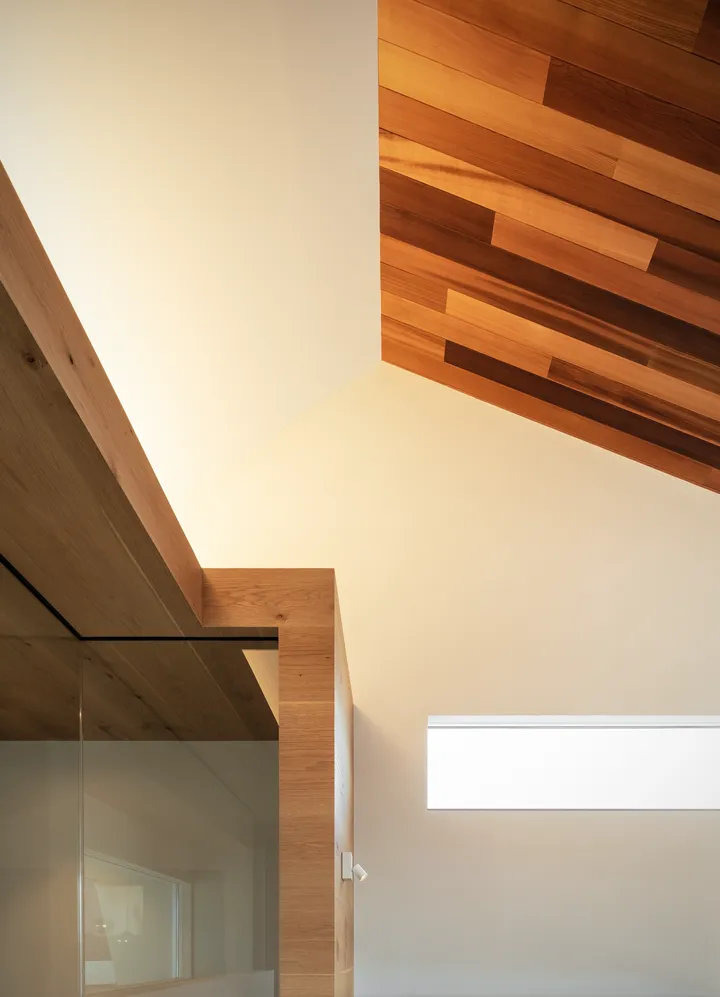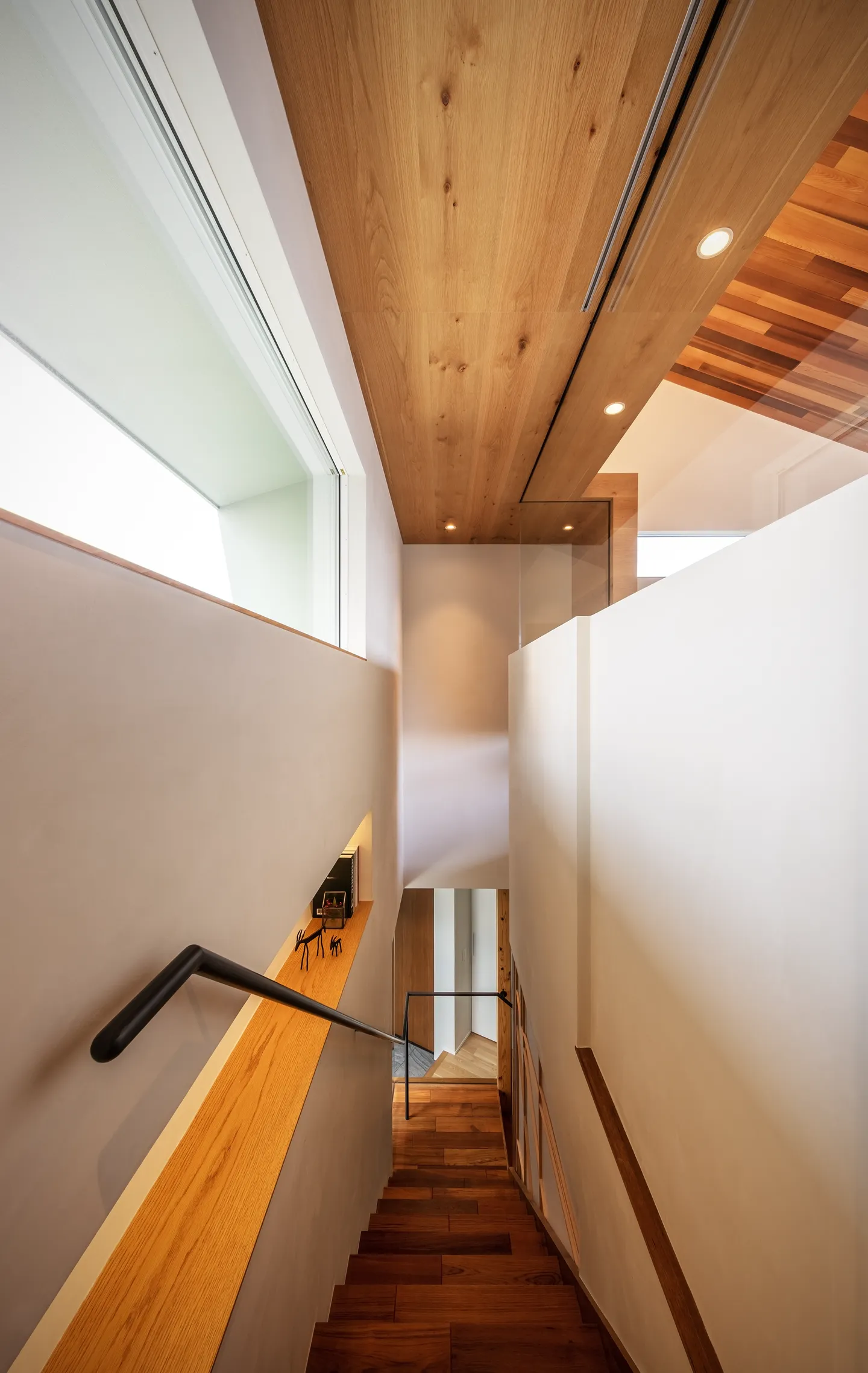 In planning, our first concern was “where” and “in what kind of space” to set the best vantage point for the view. With favorable surroundings and wide-open prospects, there were many options, which made the decision less straightforward. Guidance came from two conditions: the location of the parking space and approach, already fixed by the land development, and the fact that neighboring plots to the south and east are about one level lower, with the roofs of their houses also kept low. These hints helped define the layout.