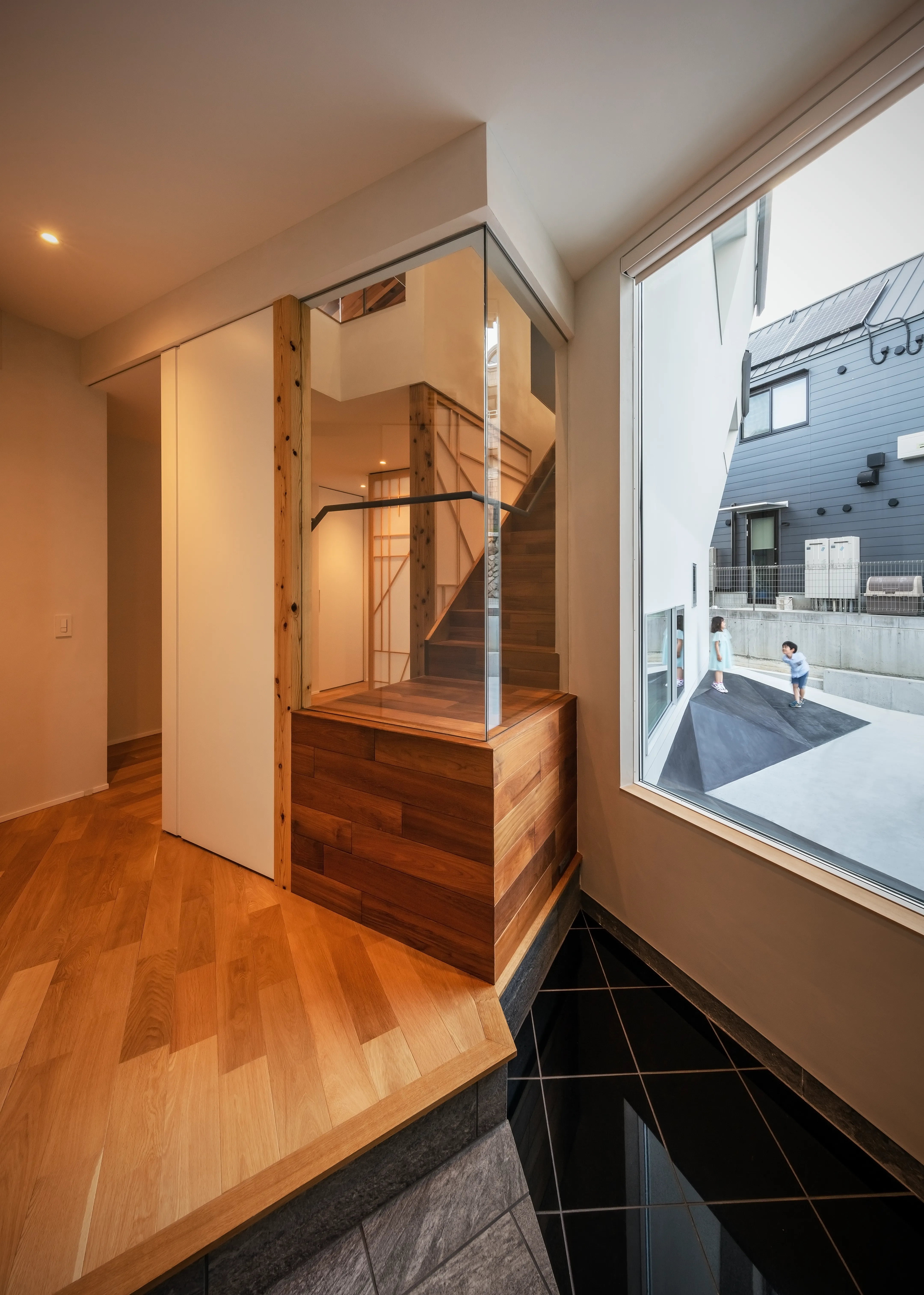 Passing through the distinctive gabled entrance, one enters a 4.7-tatami entrance hall with a large window and ceiling heights over 3 m at the highest point. It connects visually through a glass partition to the adjacent 5-tatami stair hall, giving a spacious impression. From the inside, the glass partition also buffers heat and cold from the entrance, making the stair and corridor more comfortable to use.