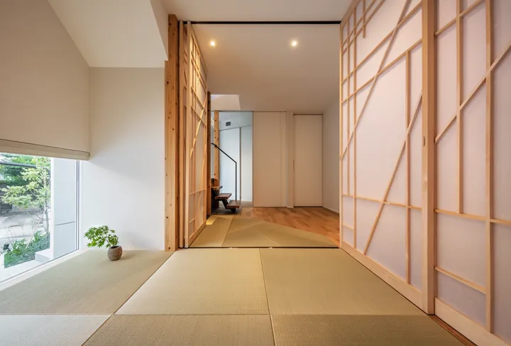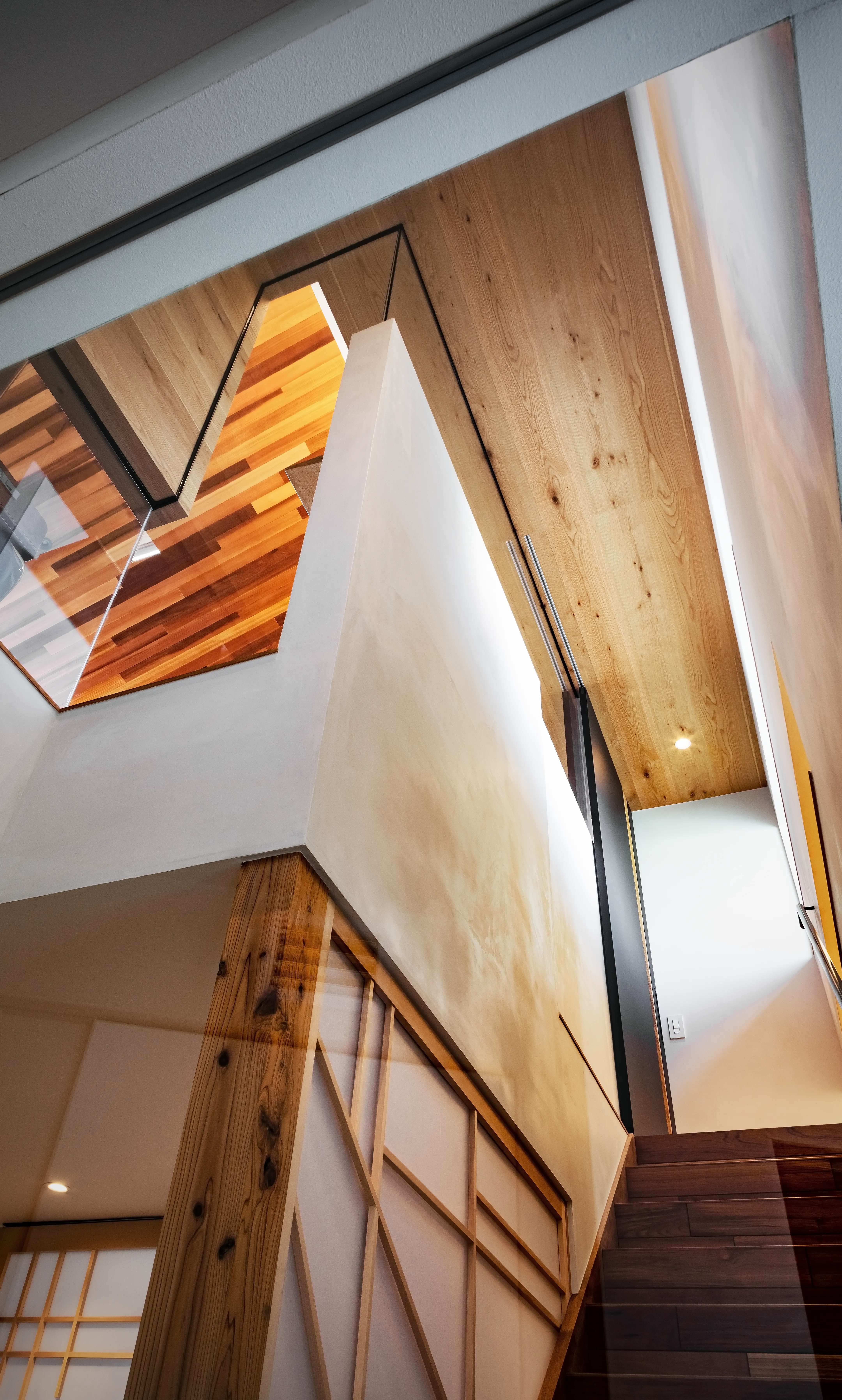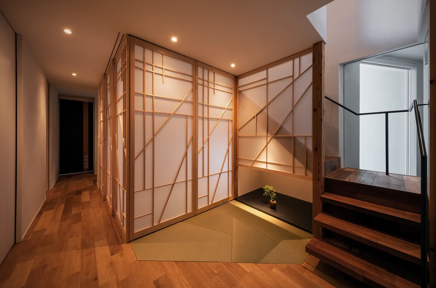 The washitsu (Japanese-style room) beyond the stair hall serves as both a guest room and a Buddhist altar room, while also functioning as a light source for the corridor and stair hall. In large houses, corridors tend to be long and dark, but here, light filtered through the shoji brightens the hallway. Leaving the shoji open further shortens the sense of distance, making the corridor feel broader. A 1.1-tatami custom-shaped mat that projects into the stair hall strengthens the unity between hall and washitsu, enhancing the everyday experience of moving through the house.
