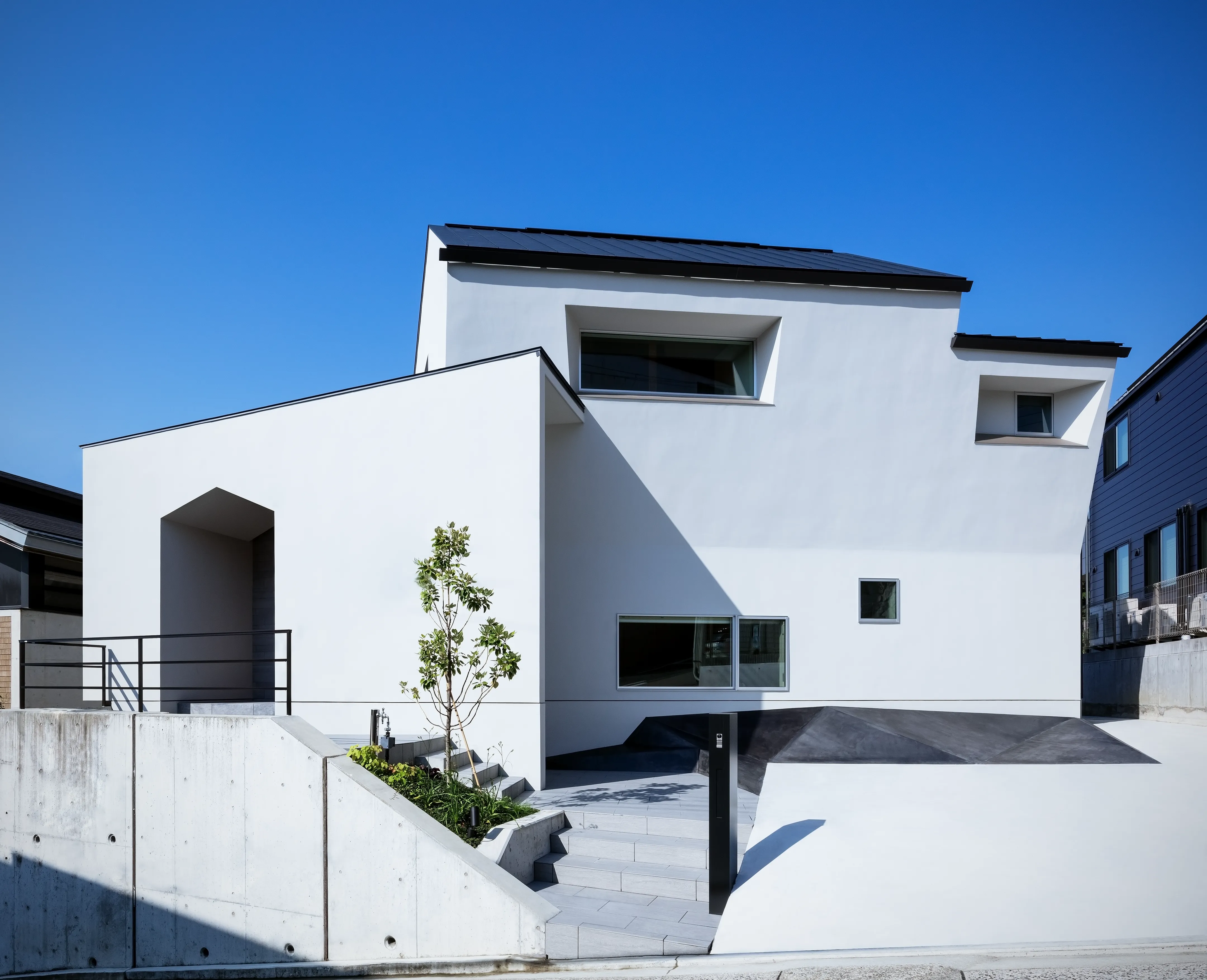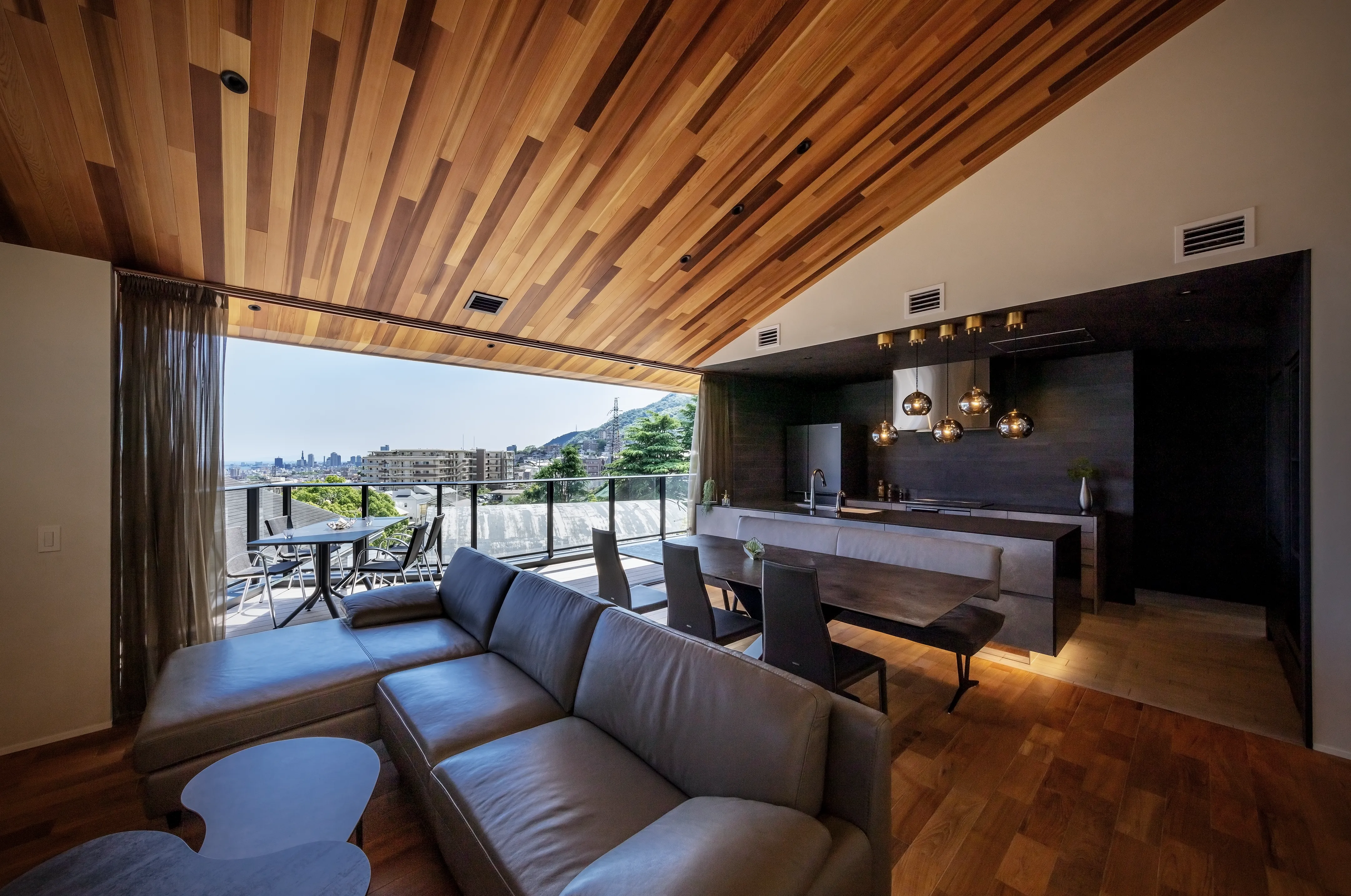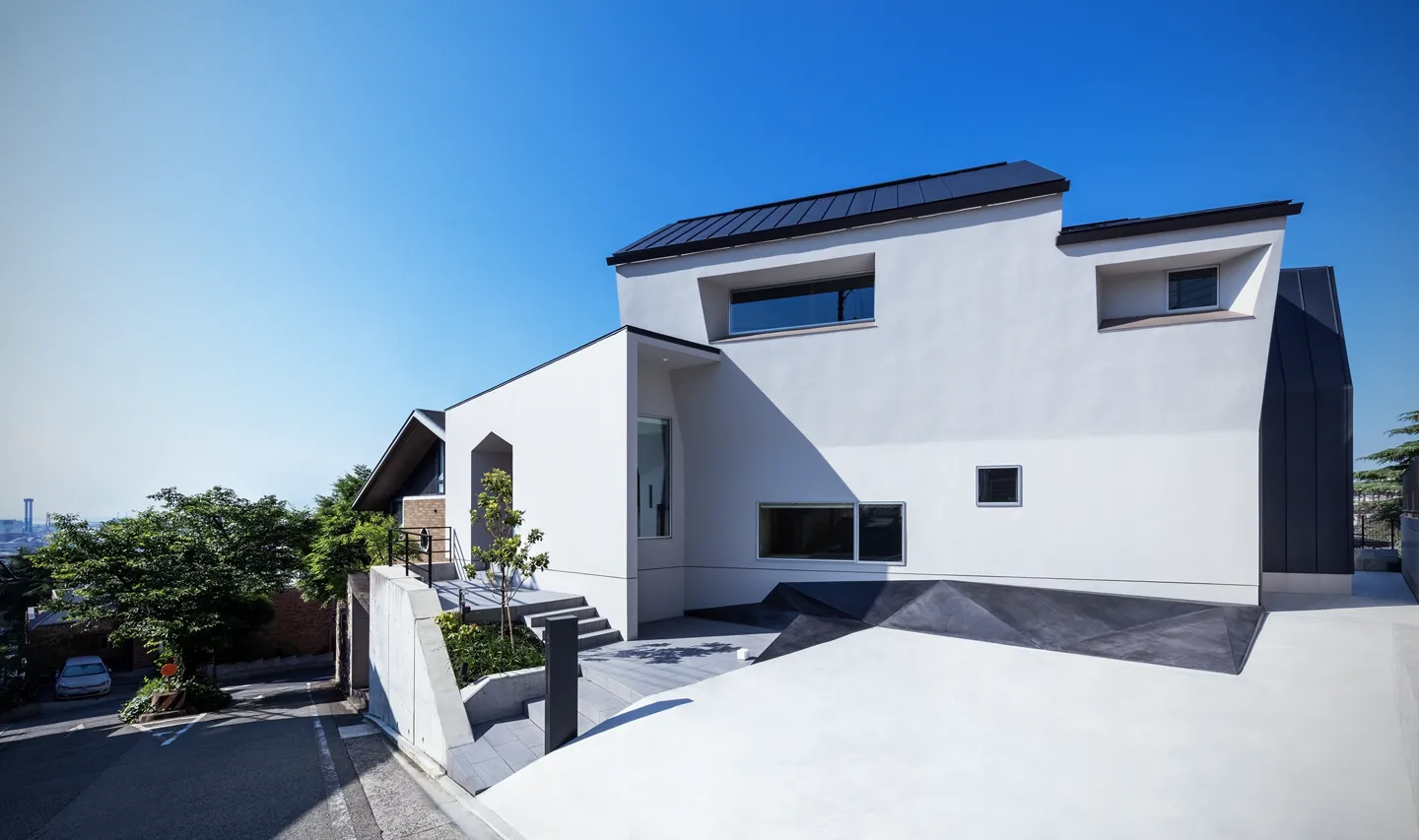 The site lies at the foot of the mountains in Kobe, reached by climbing a steep slope to a place with sweeping views. It is part of a quiet, upscale residential district characteristic of Kobe, where large houses stand with space around them. Here we planned a two-story wooden house with a building footprint of 27 tsubo (≈89 m²) and a total floor area of 48 tsubo (≈159 m²).