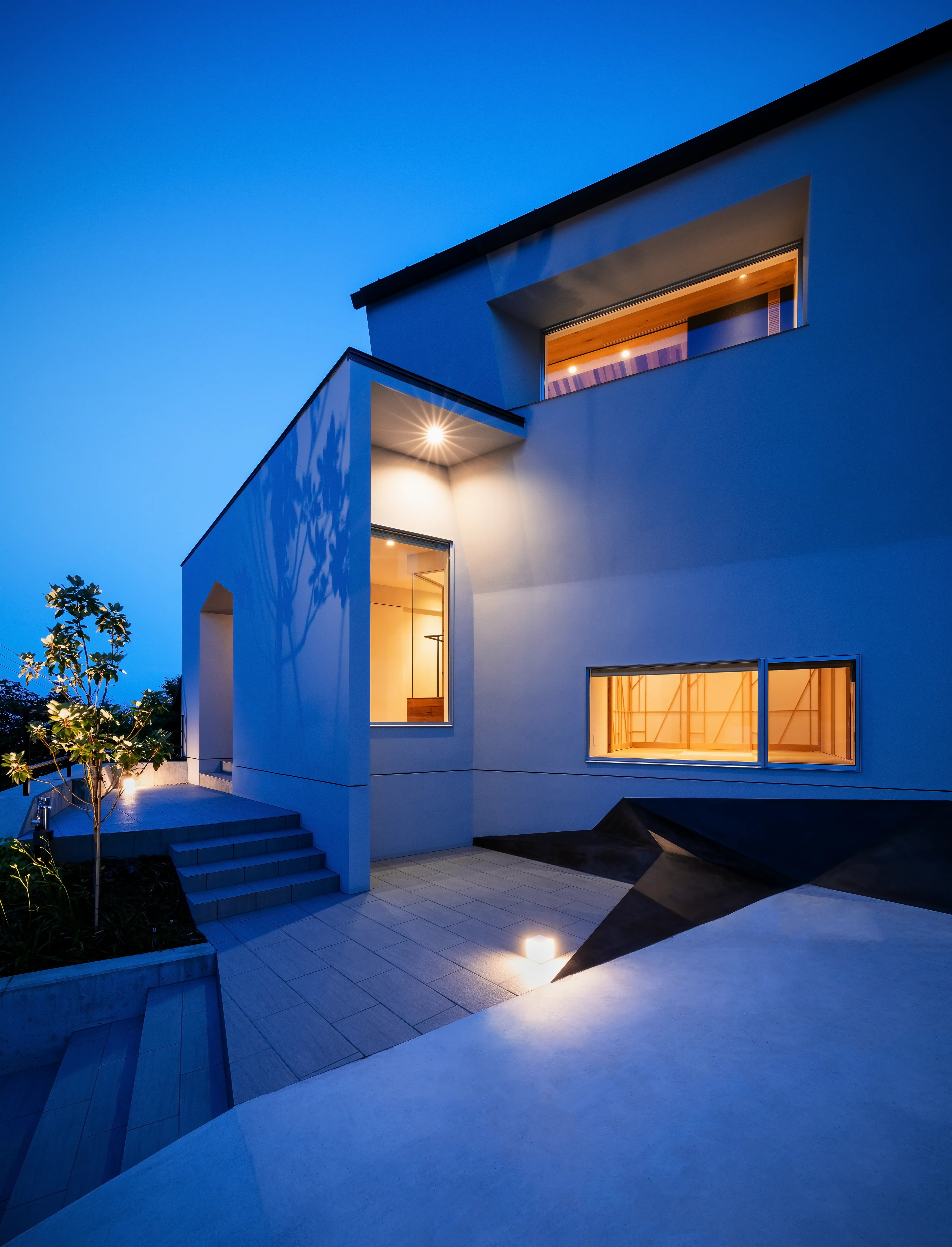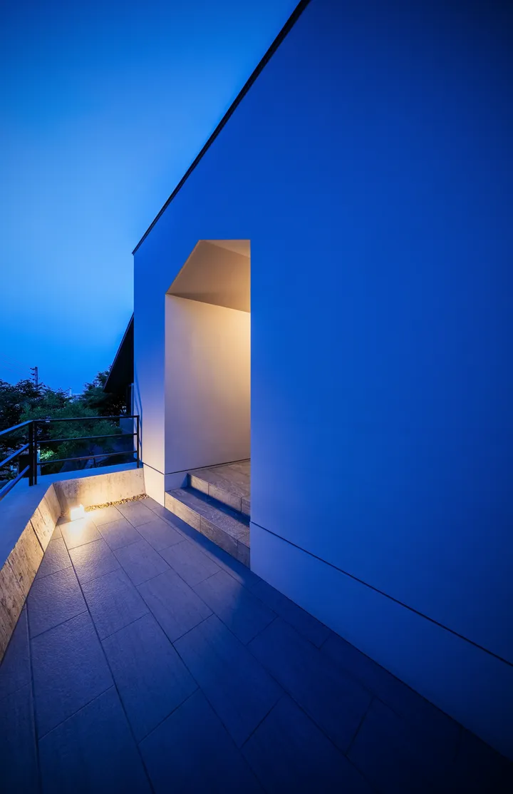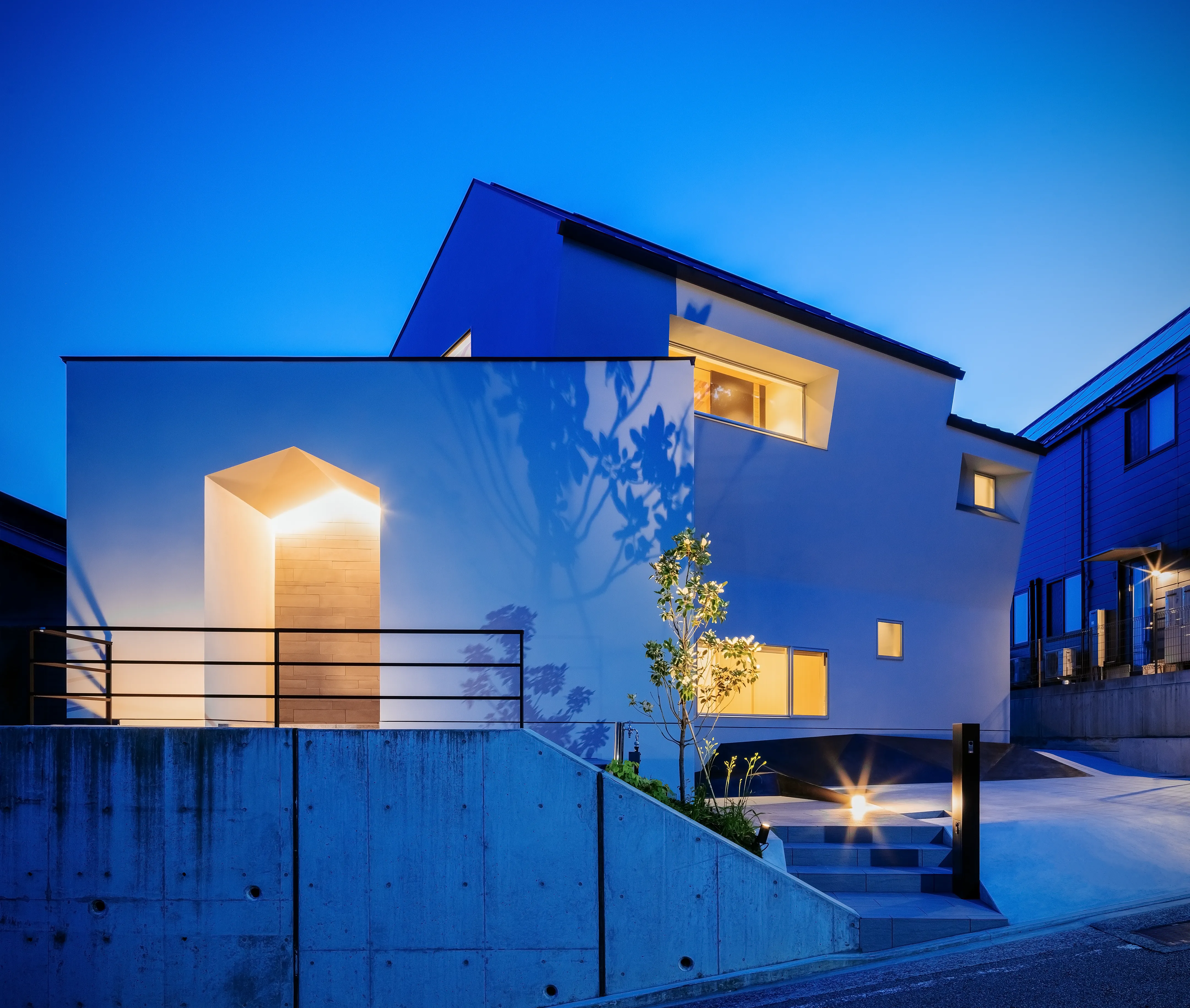 The site lies at the foot of the mountains in Kobe, reached by climbing a steep slope to a place with sweeping views. It is part of a quiet, upscale residential district characteristic of Kobe, where large houses stand with space around them. Here we planned a two-story wooden house with a building footprint of 27 tsubo (≈89 m²) and a total floor area of 48 tsubo (≈159 m²).