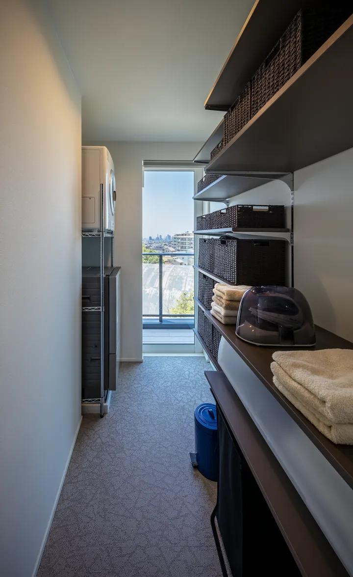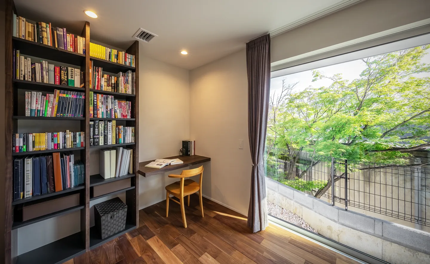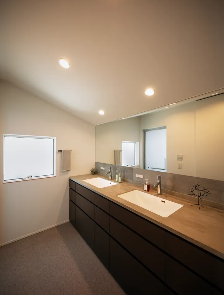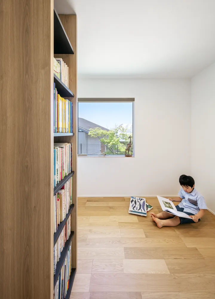 To allocate more area to the LDK where the family gathers, the private rooms are minimal. Since most time is spent together in the LDK, large private rooms are unnecessary. Children’s rooms are for study and sleep only, with space just for a 1.35 m-wide closet, bed, and desk. The main bedroom is somewhat more spacious but sized only for a double bed. It does, however, include a 3.1 m-long walk-in closet with ample storage capacity.