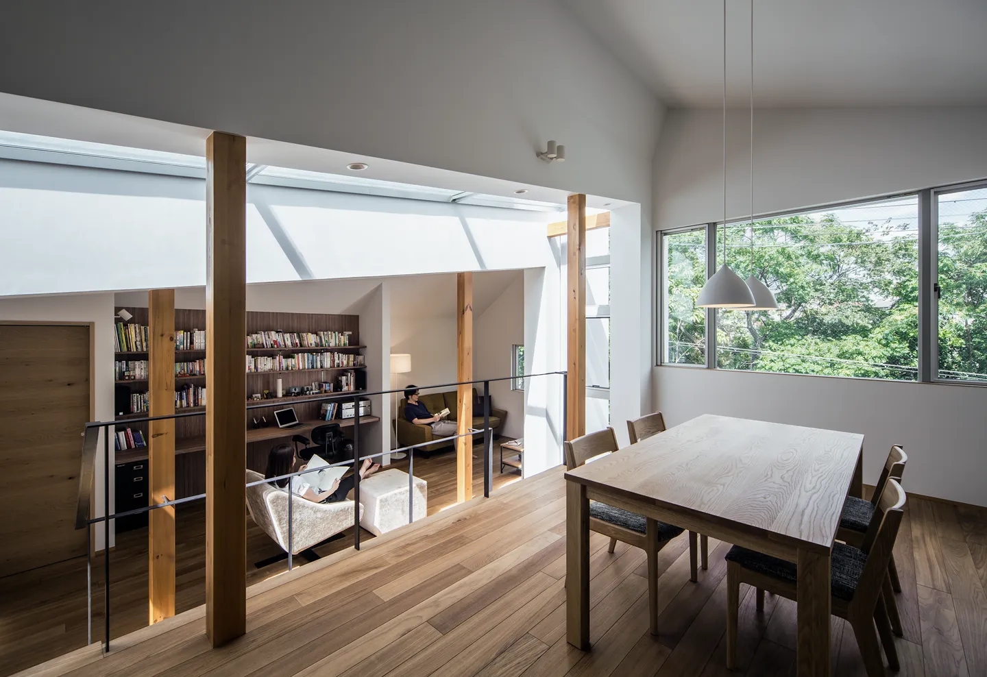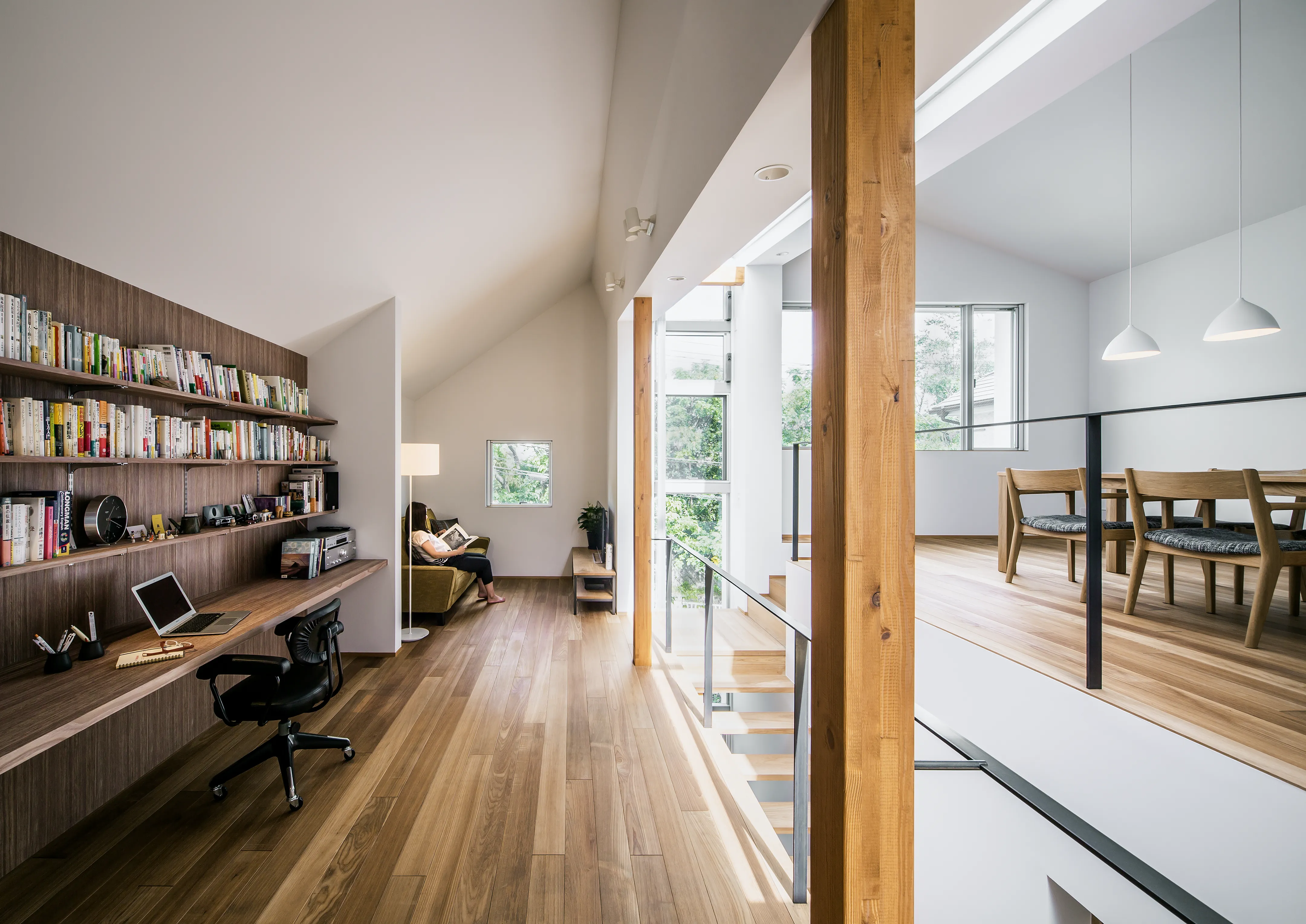 The living space opens toward the adjacent park, while the study sits under the crevasse, making both zones comfortable for daily use and allowing for varied ways of inhabiting the home.