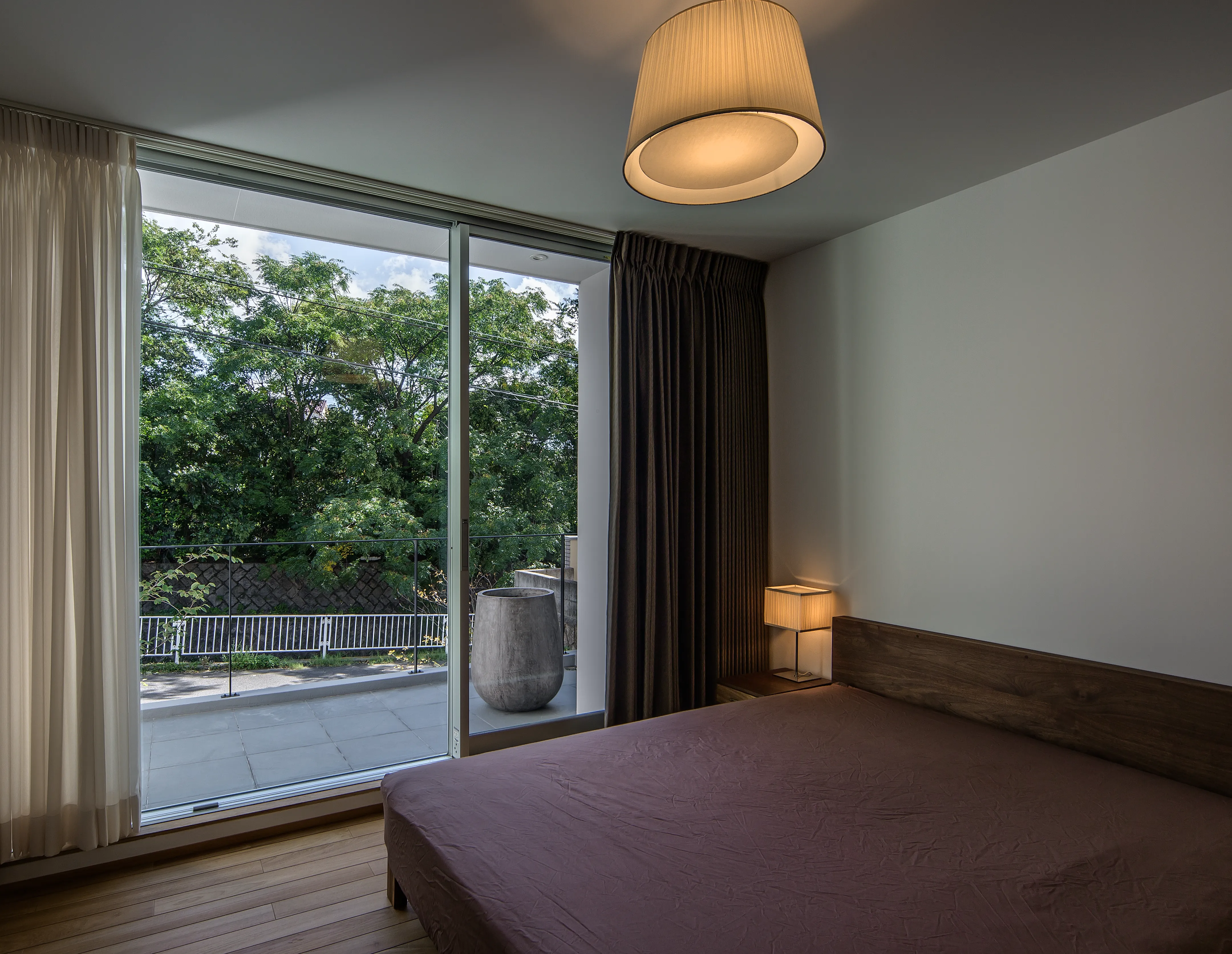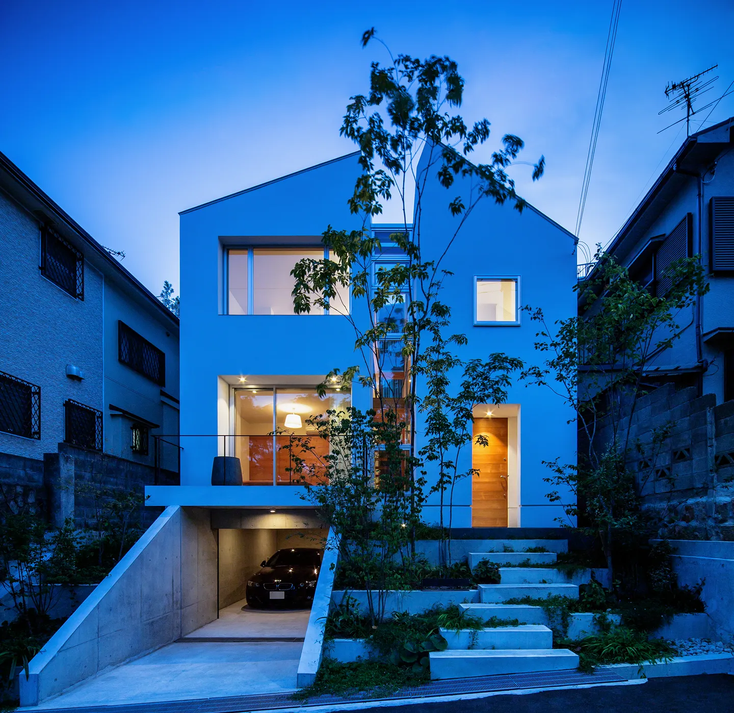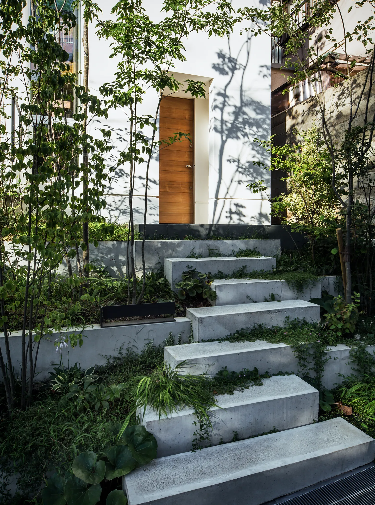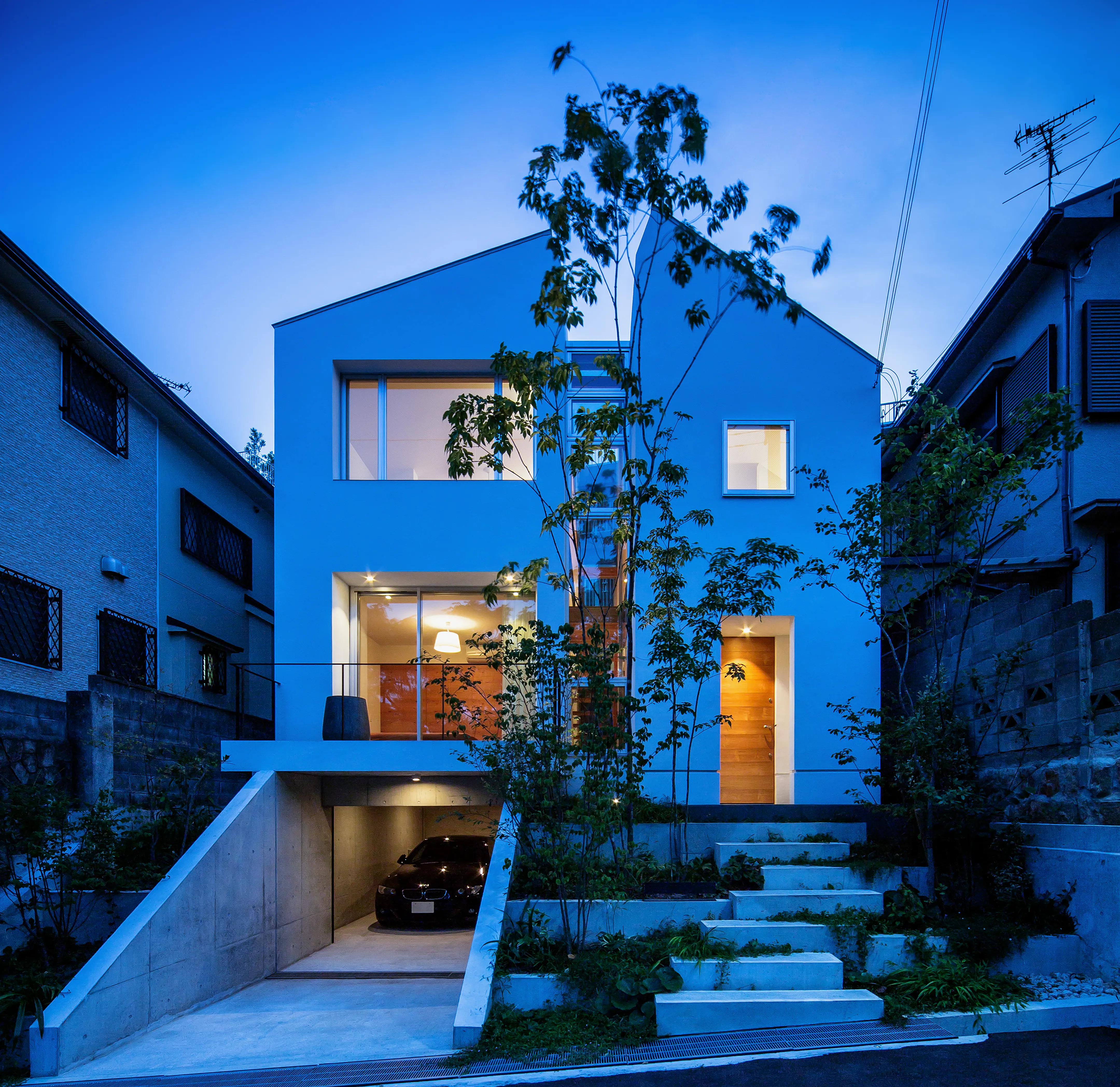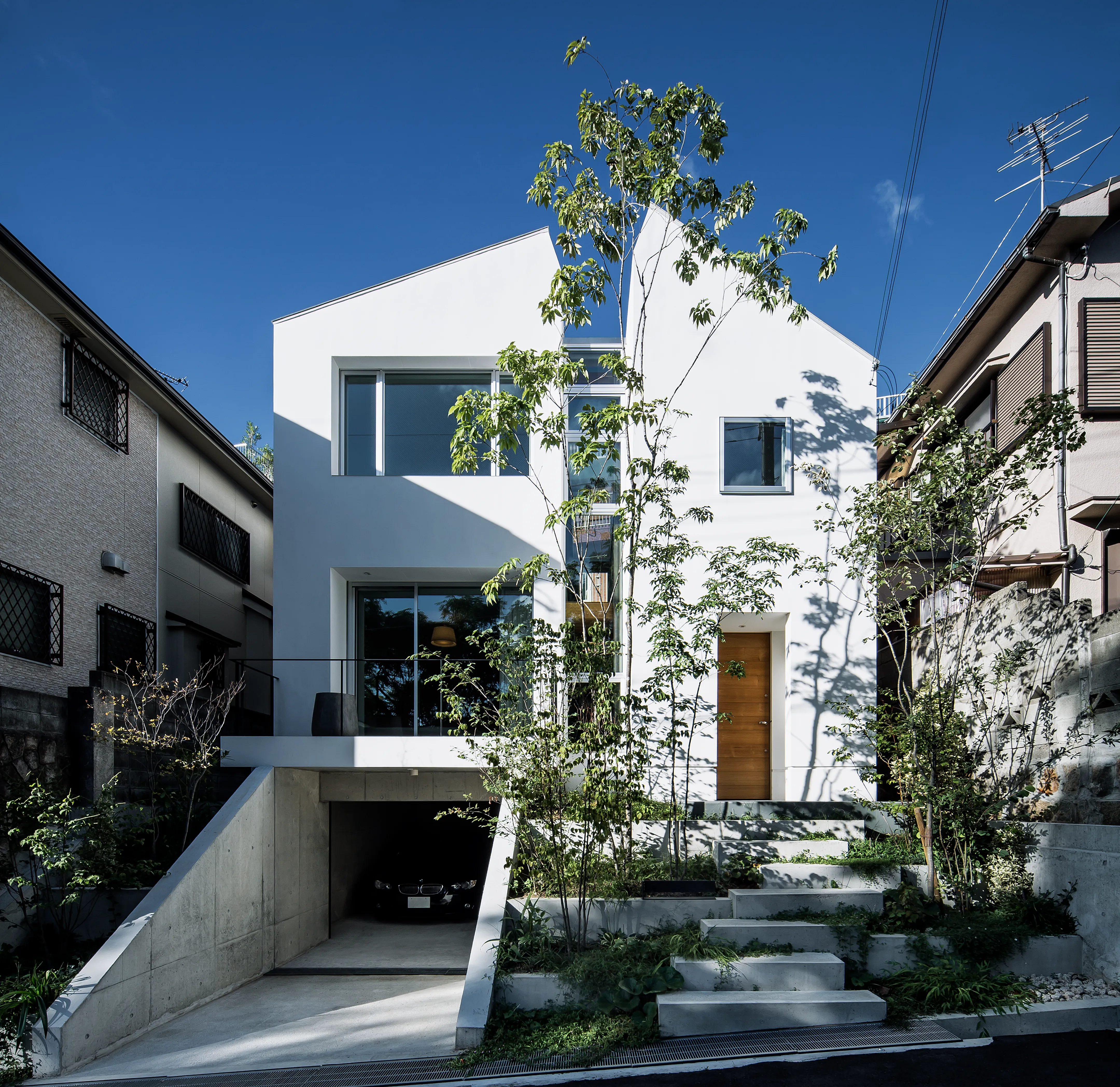 A shutter is set approximately 5 meters in from the street, allowing the driveway to serve as an additional guest parking space. This layout avoids the typical appearance of a cut-in garage. Plantings along the side walls and above the shutter give the approach the feel of entering a cave nestled in a hill.