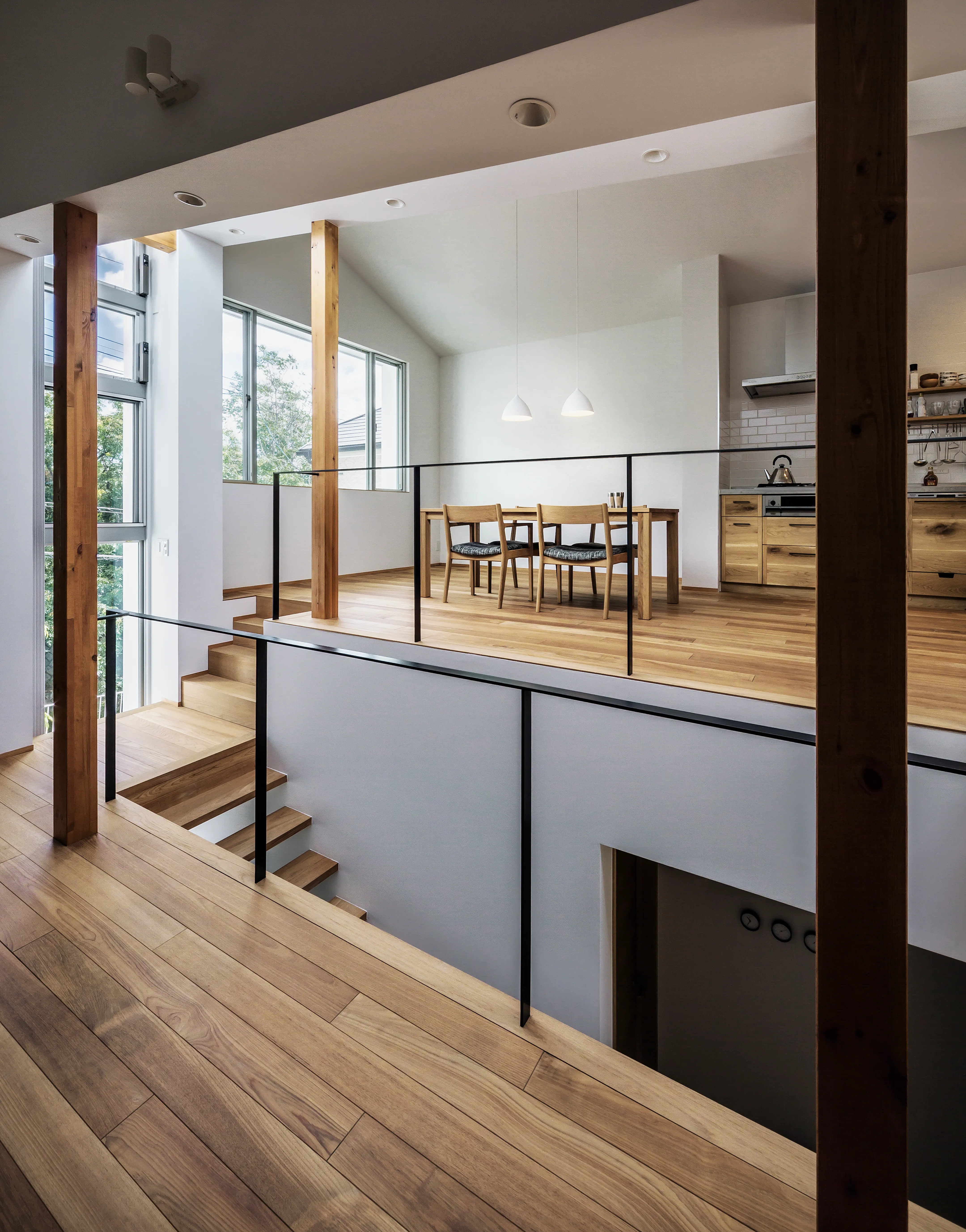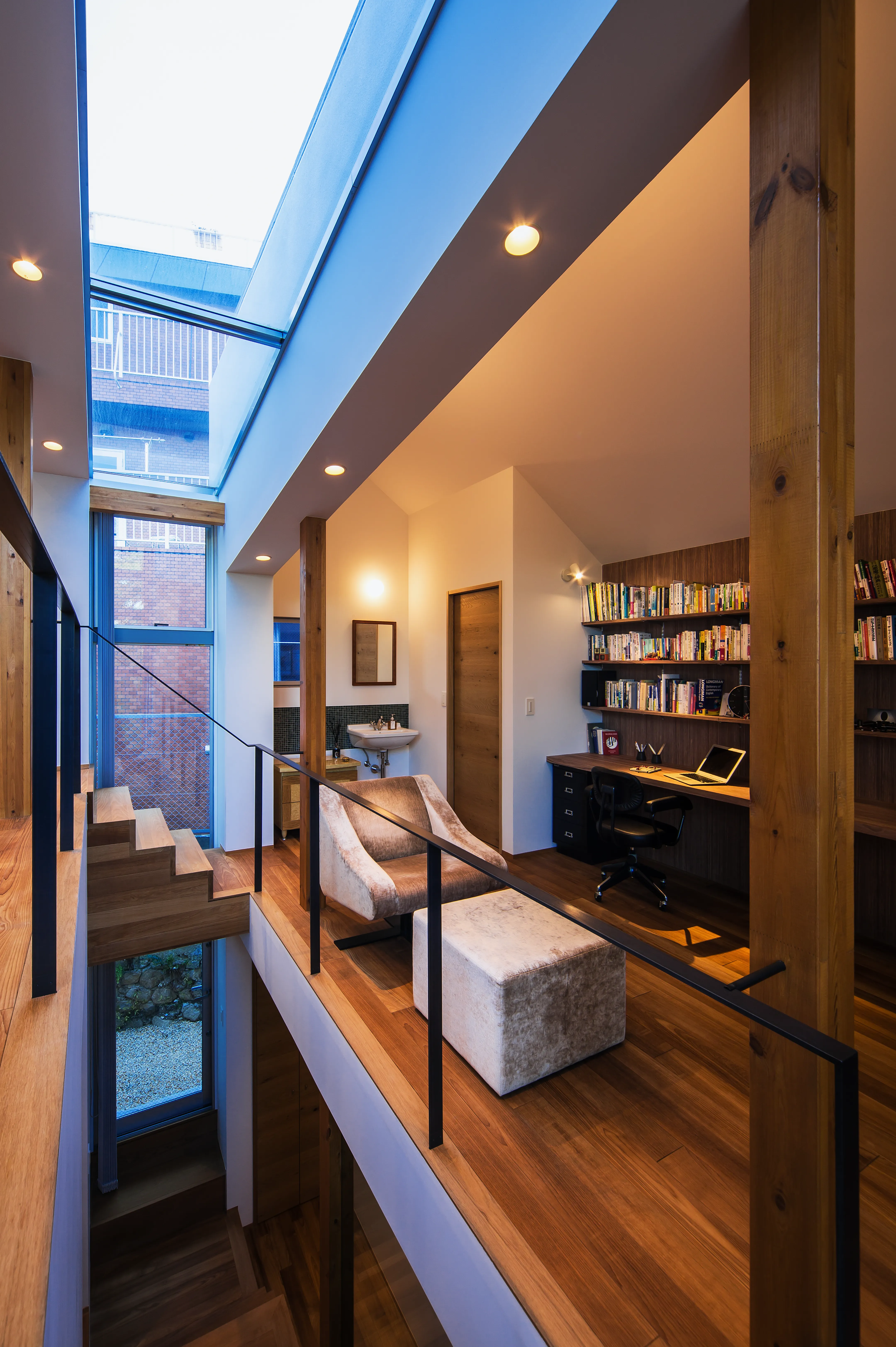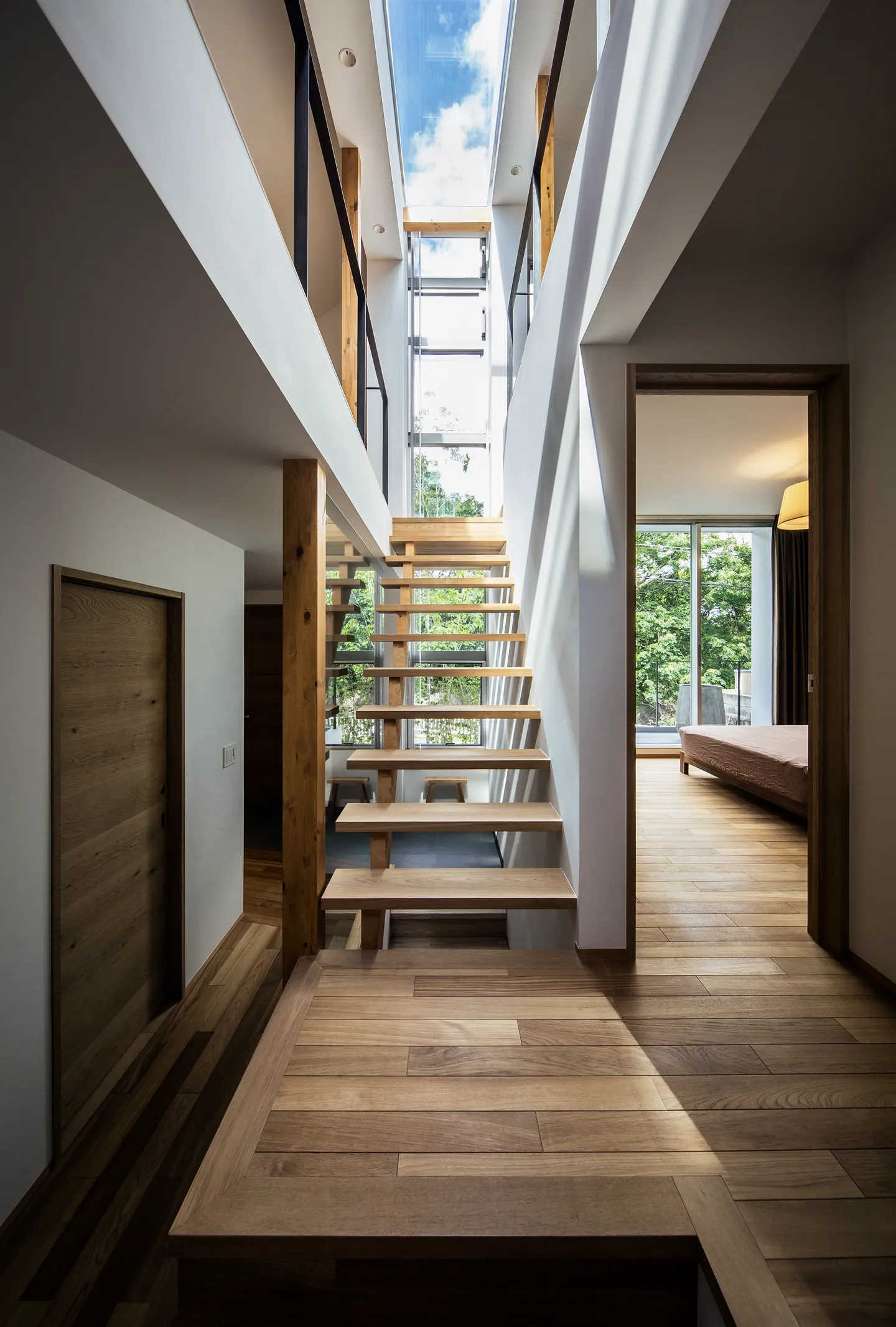 The crevasse functions as a stair hall enclosed in glass. As one ascends, a narrow slit opens toward the park, offering a glimpse of greenery. Light passing through this space reaches not only the upper level but also the ground and basement floors, softly illuminating the entire house.
