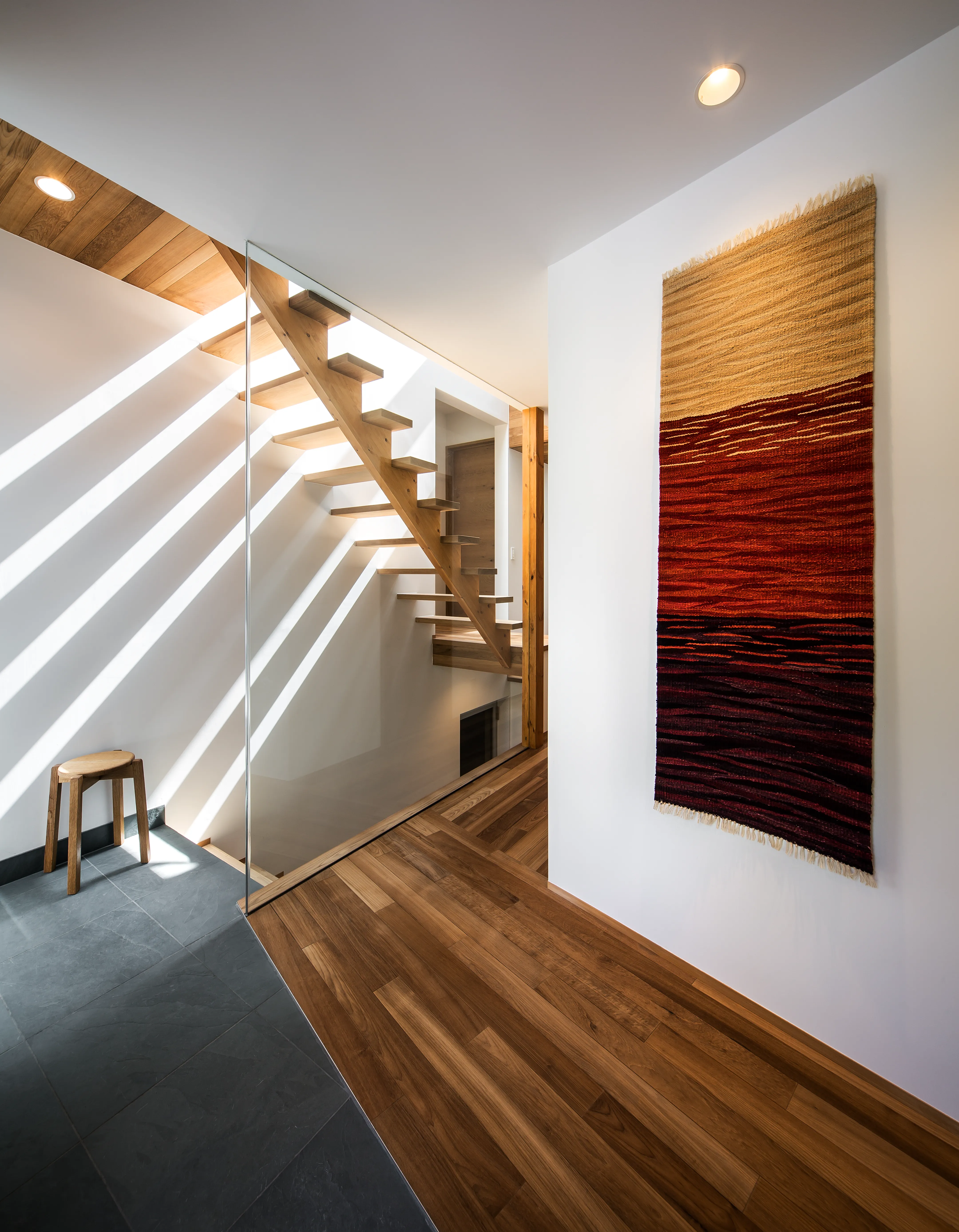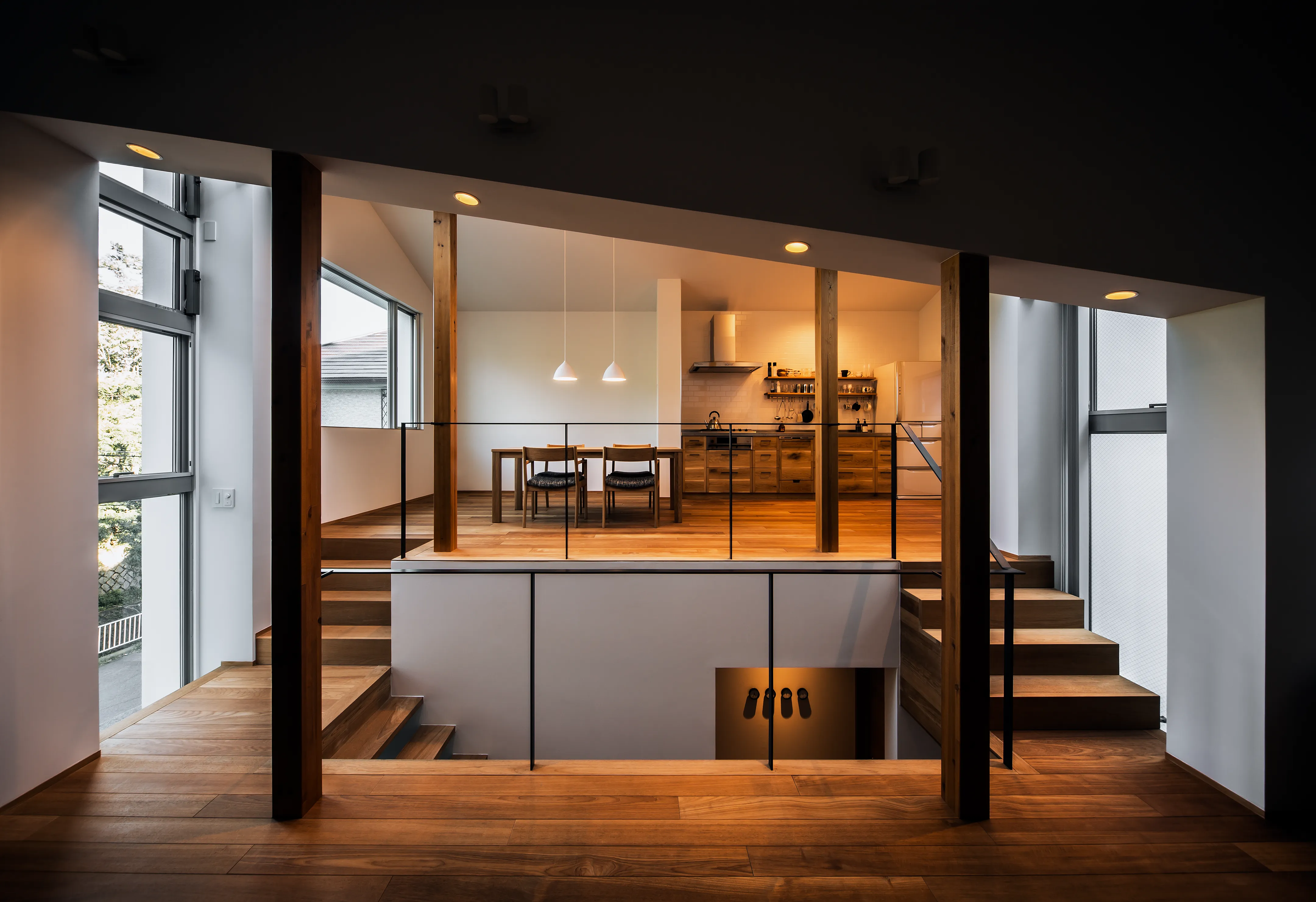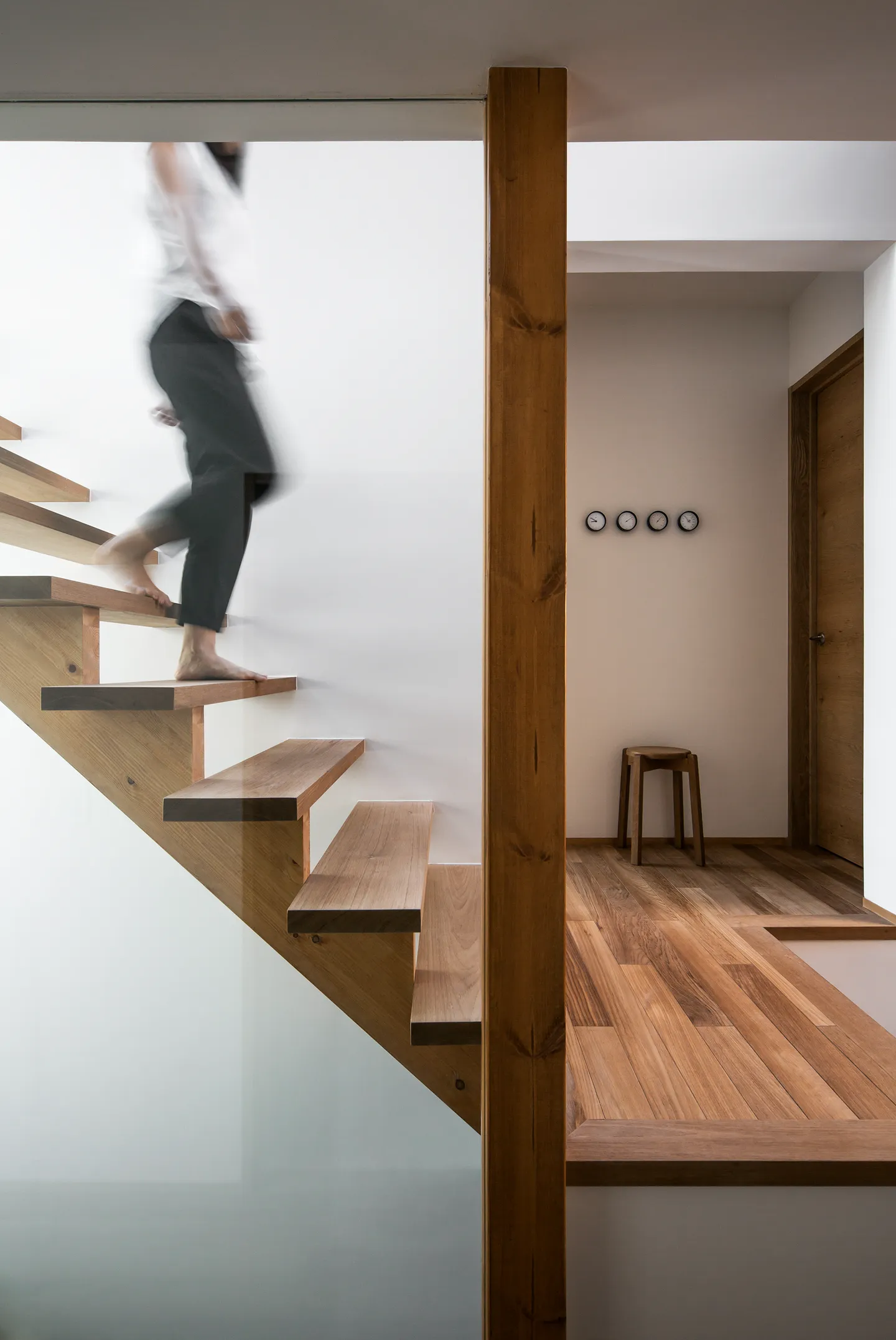 The crevasse functions as a stair hall enclosed in glass. As one ascends, a narrow slit opens toward the park, offering a glimpse of greenery. Light passing through this space reaches not only the upper level but also the ground and basement floors, softly illuminating the entire house.