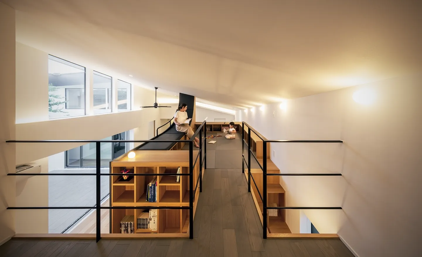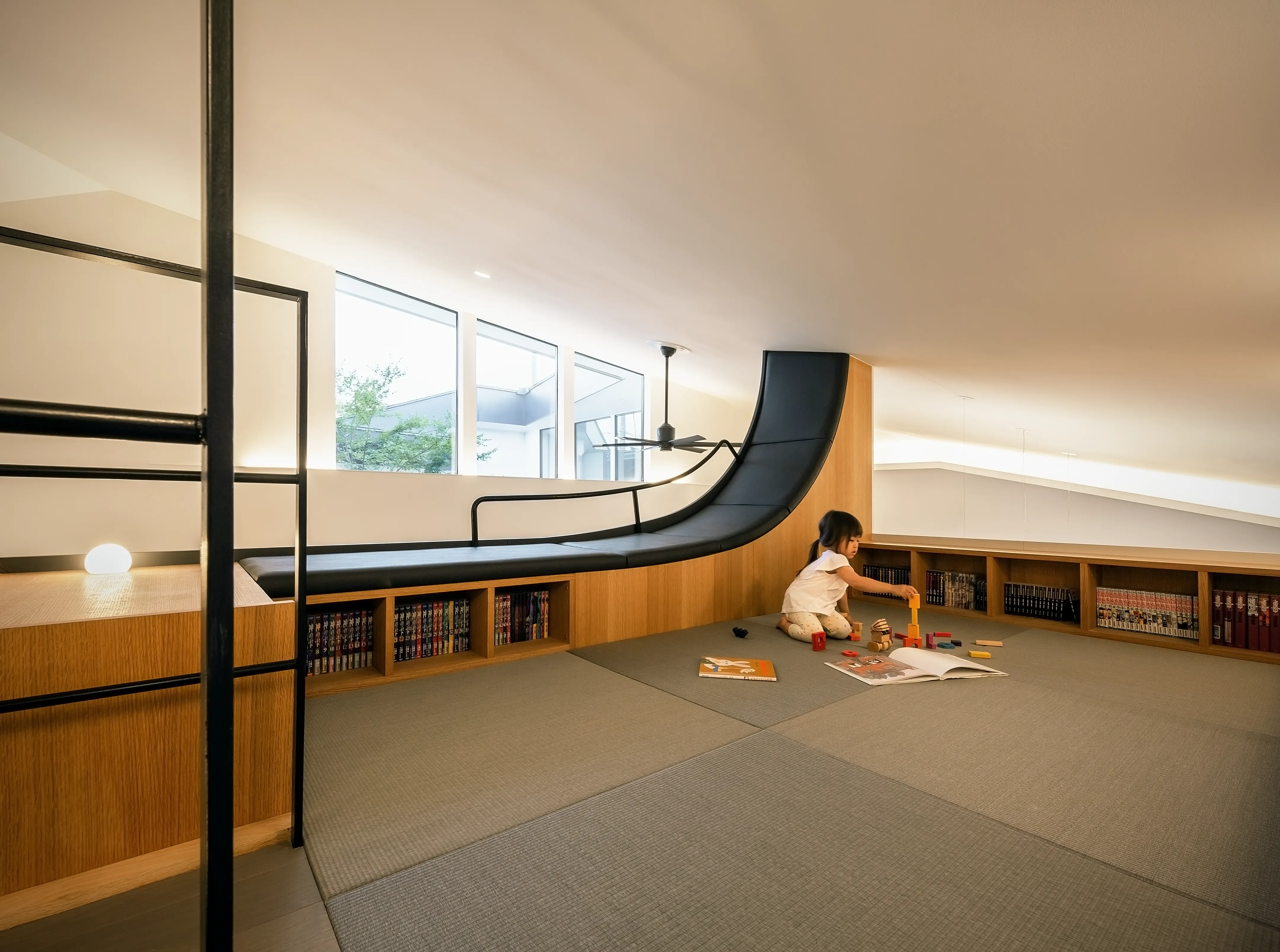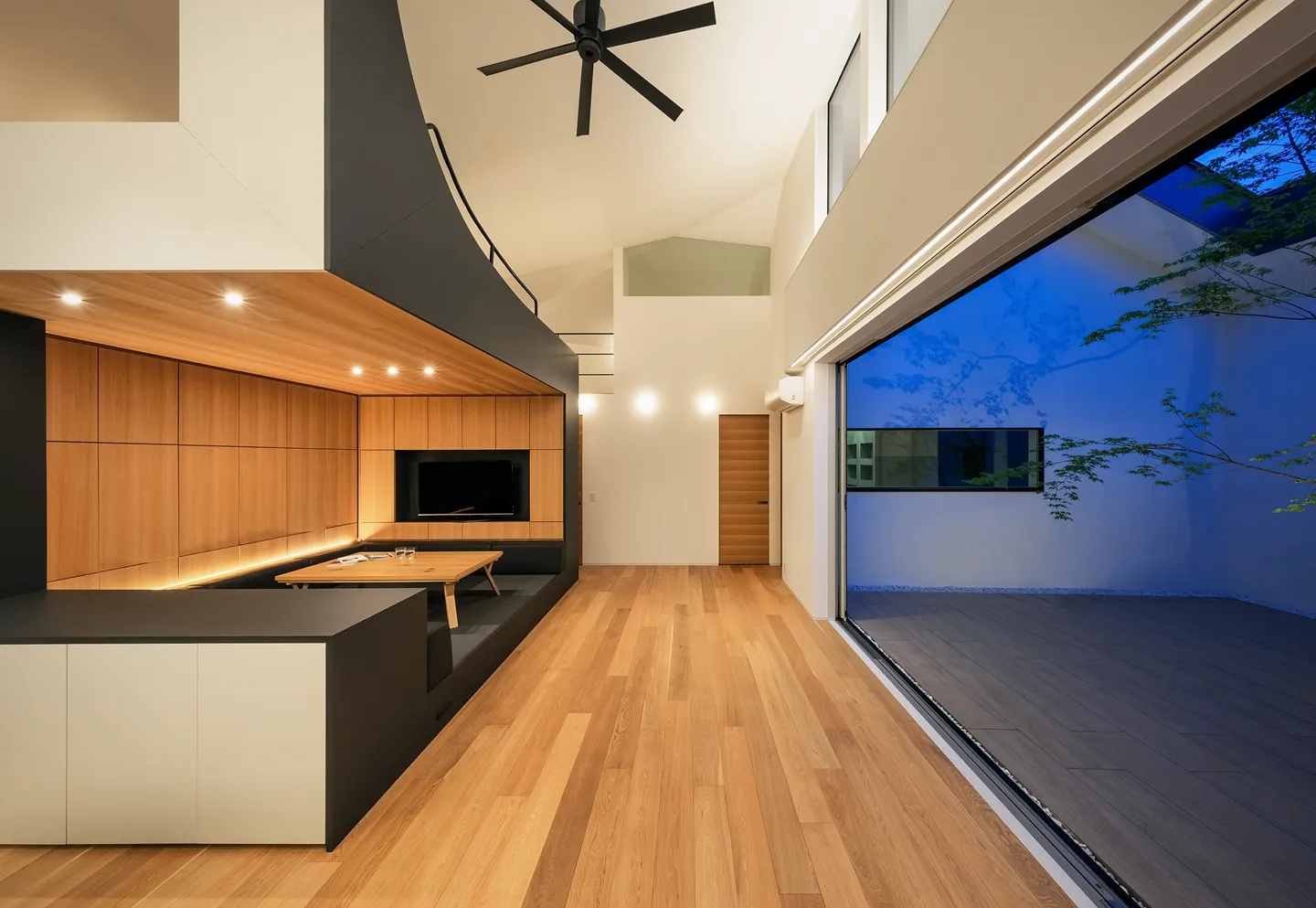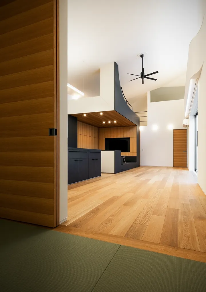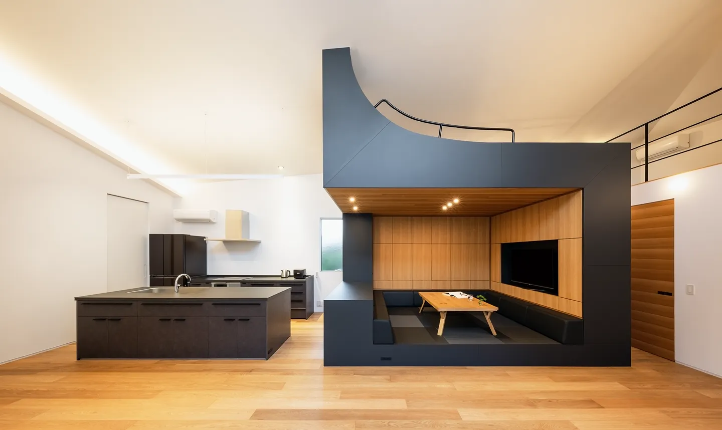 Within the broad, high-ceilinged LDK, a piece of Architectural furniture acts as a symbol of the house. It functions as a bookcase, a koagari (a step-up raised-floor seating nook), a kotatsu (a low, heated table used with floor seating) with a backrest, and a structure that creates a loft.