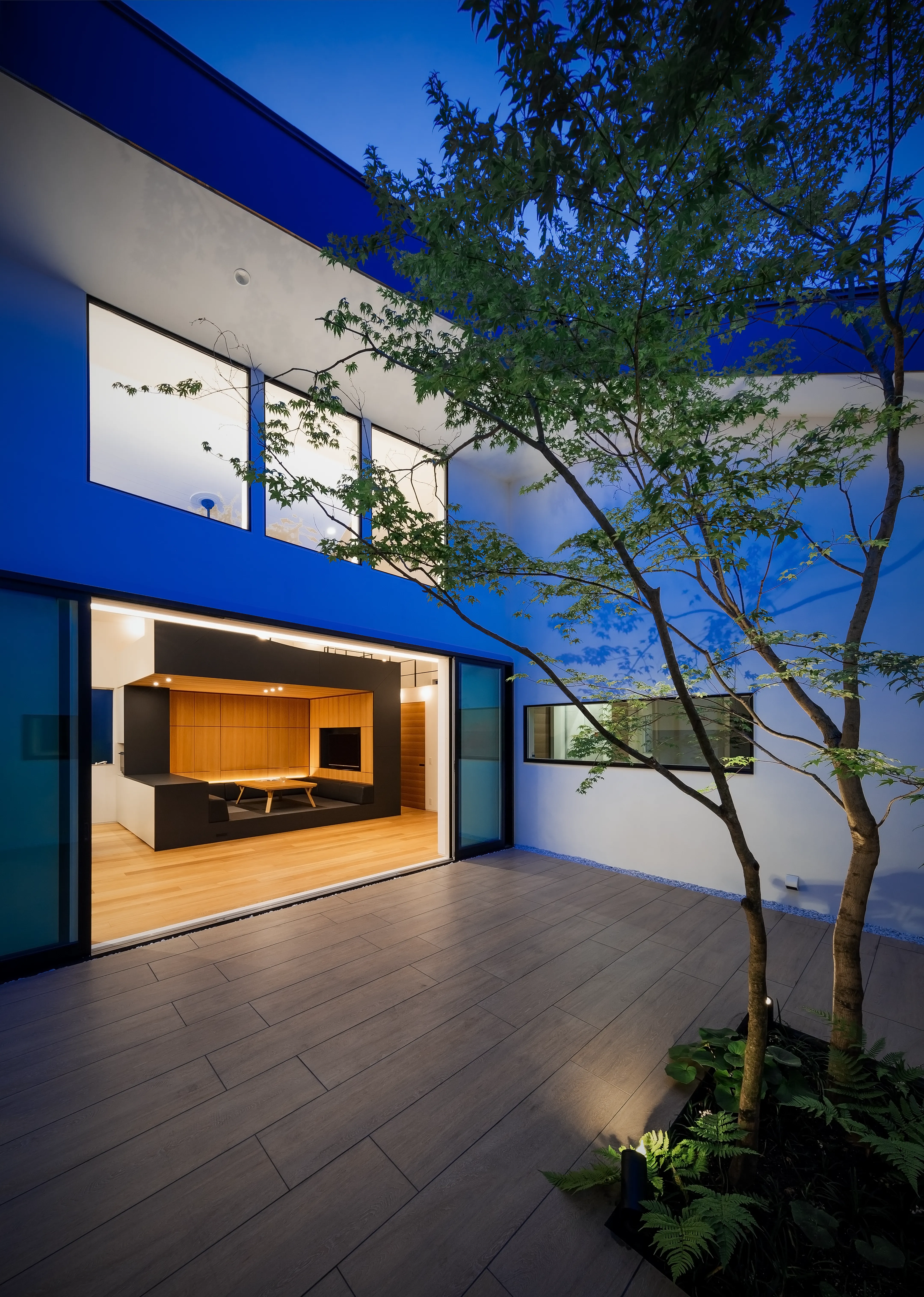 The courtyard becomes a wood-decked outdoor living room continuous with the LDK. By softening the boundary between outside and inside, the design encourages a natural flow from the LDK to the exterior. Together with the 29-tatami LDK, the total space comes to about 50 tatami.