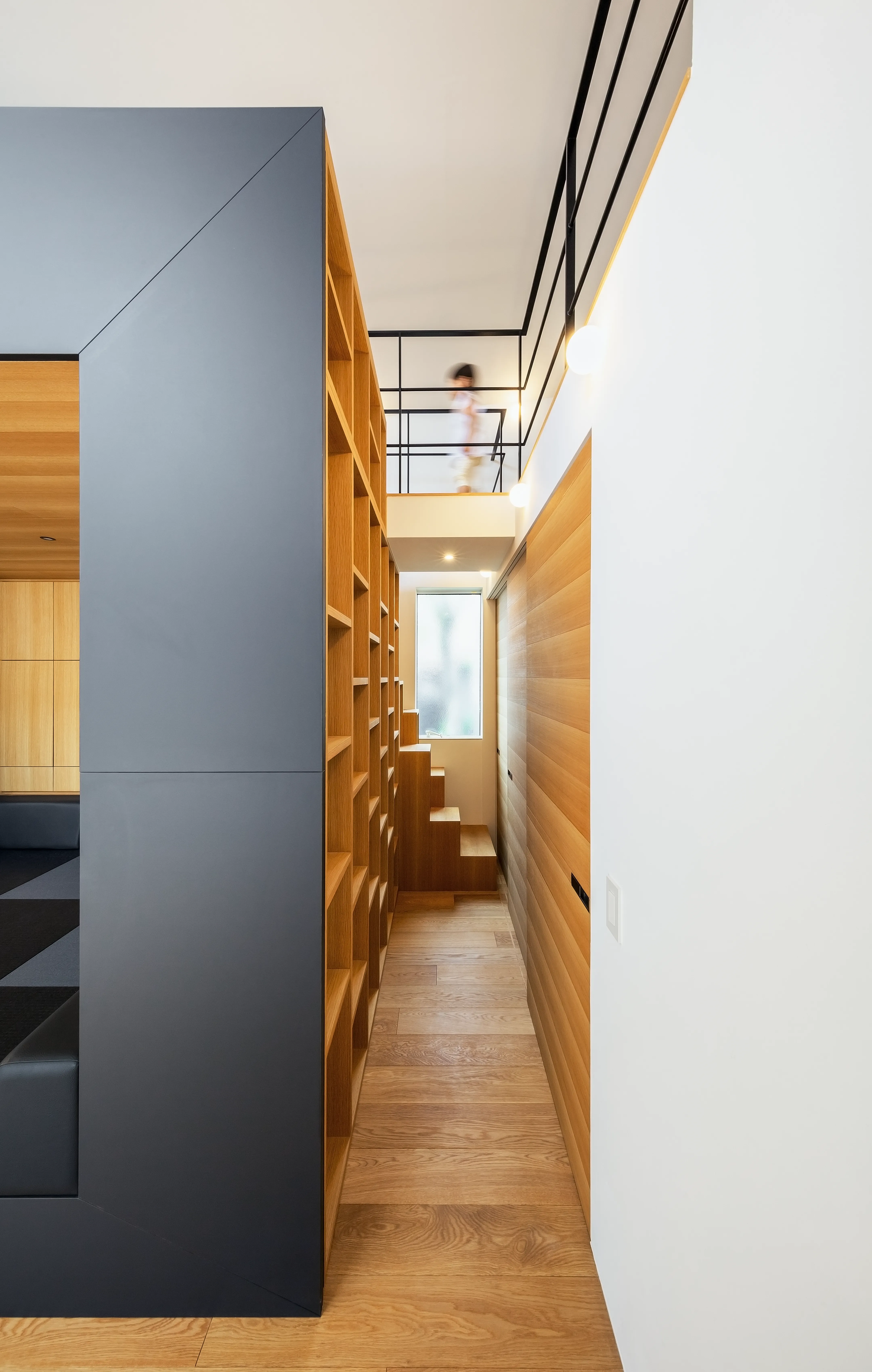 The piece was designed as if carving into a “mass of bookcase.” In the small grotto-like space created by carving, we placed a kotatsu. Gathering closely as a family or with friends is part of a kotatsu’s appeal; for that, this low-ceilinged, modestly sized nook is well suited. Although the LDK is expansive, providing a place where one can settle in quietly introduces a different register to the space.