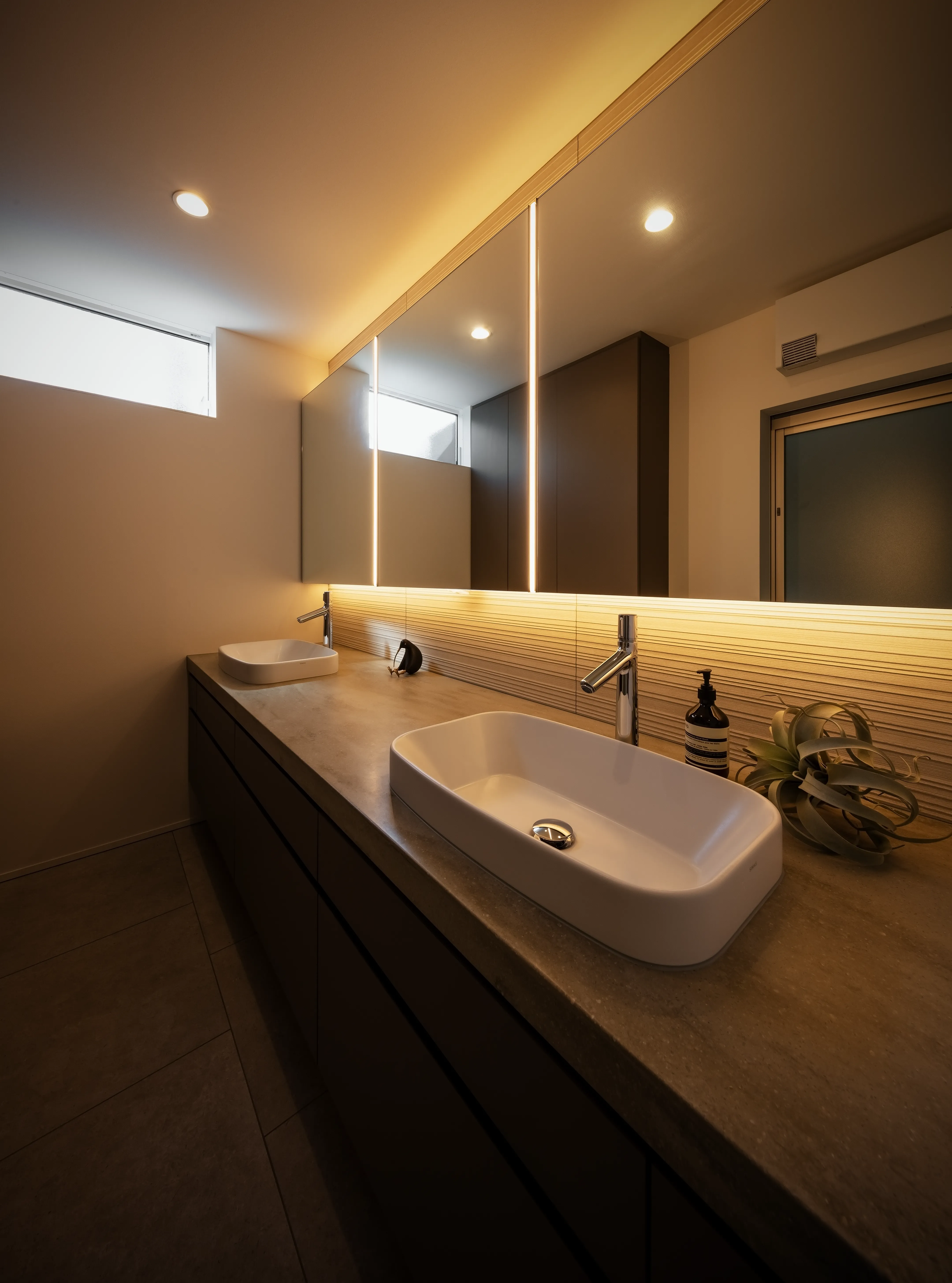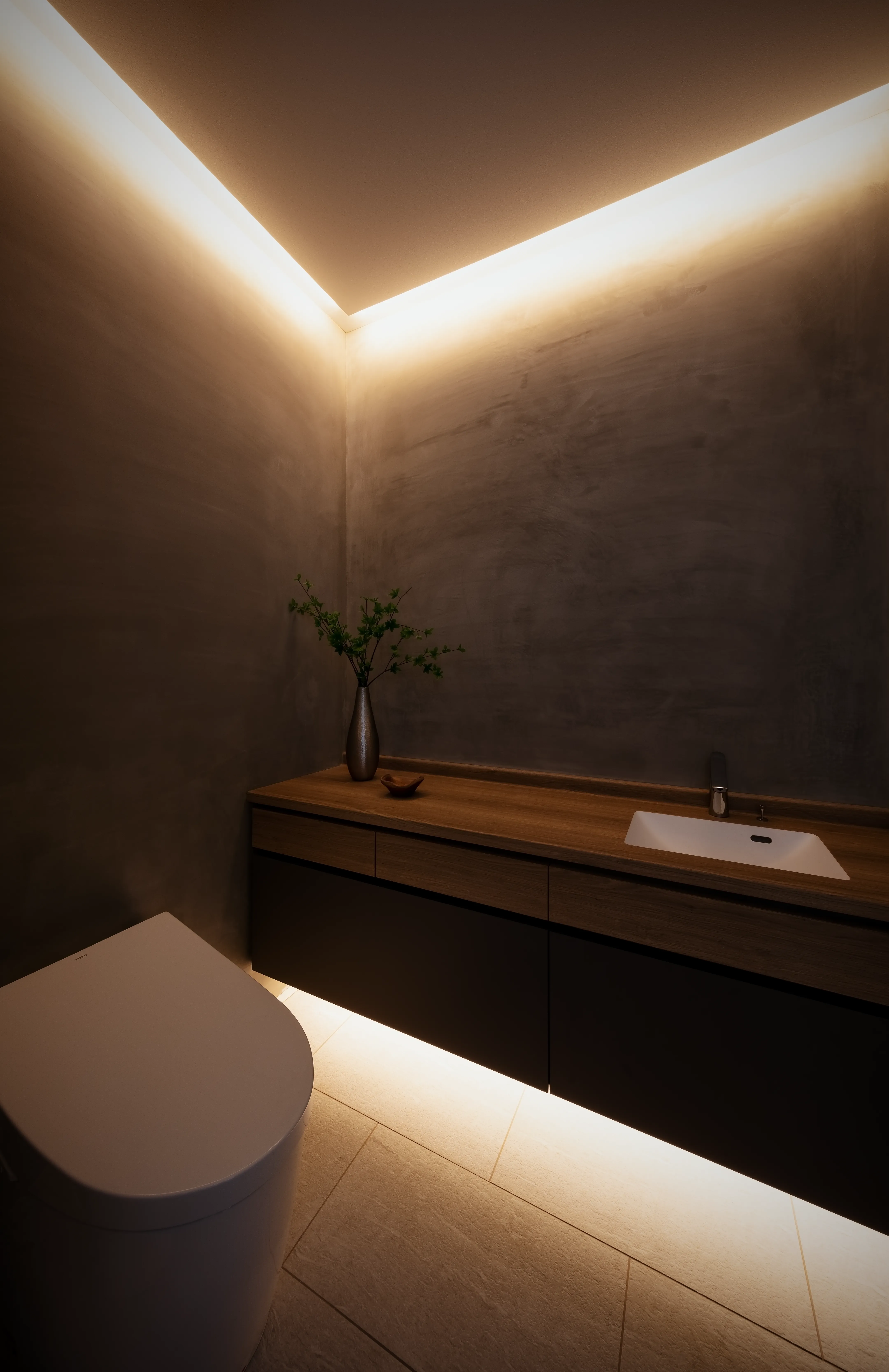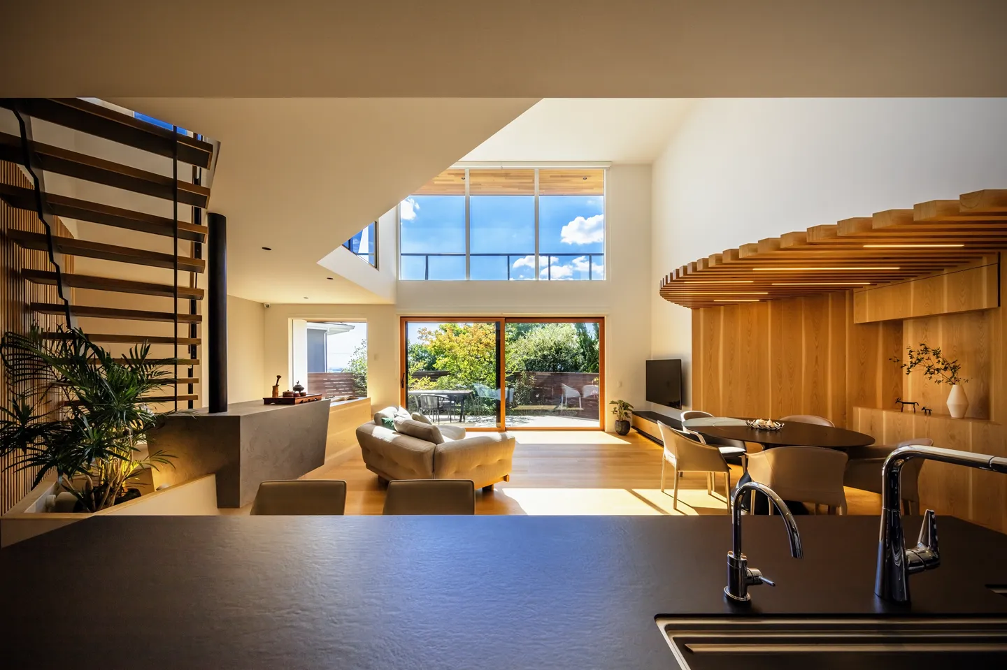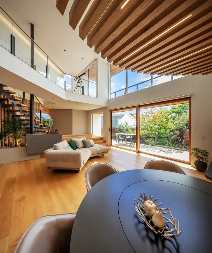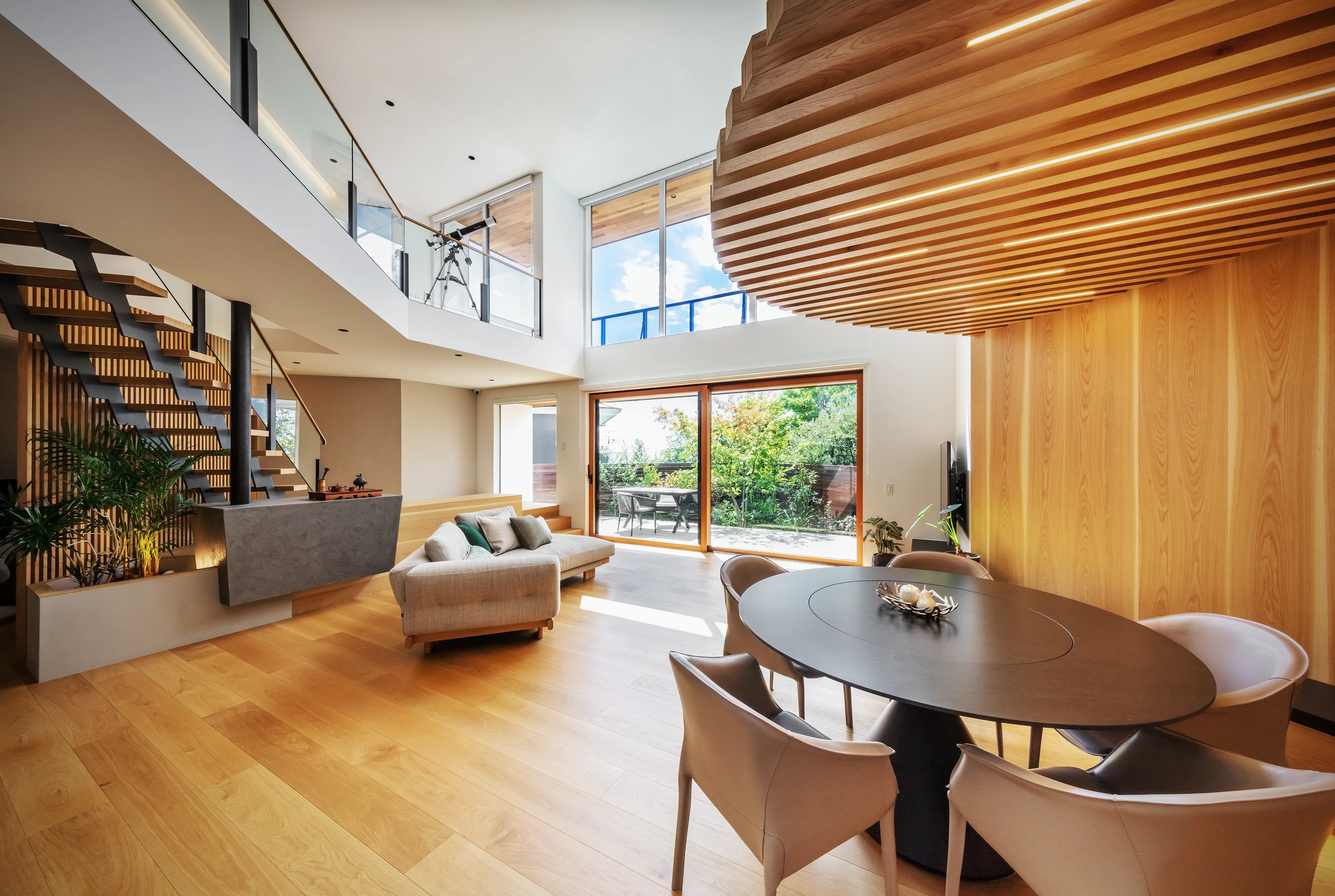 On the second floor, three terraces take advantage of the favorable surroundings. The Sunset Terrace offers a spacious setting for enjoying dusk as part of daily life. The Outdoor Lounge, linked to the indoor lounge, faces southwest over the city of Kobe and serves as a quiet place for night views and drinks. The Private Balcony adjoins the master bedroom, opening southward to the morning sun. Together, these outdoor spaces bring seasonal variety and everyday moments into the life of the home.
