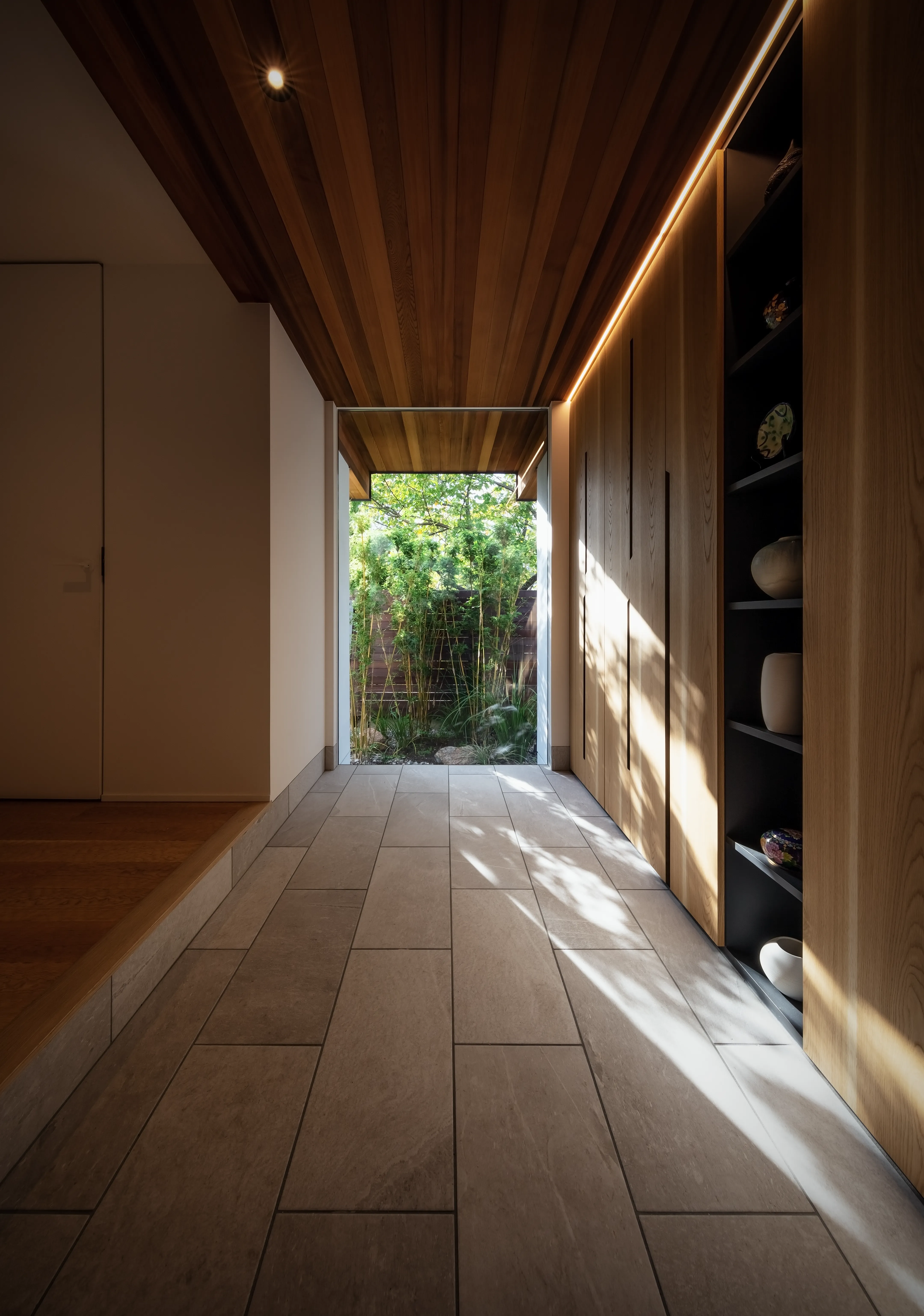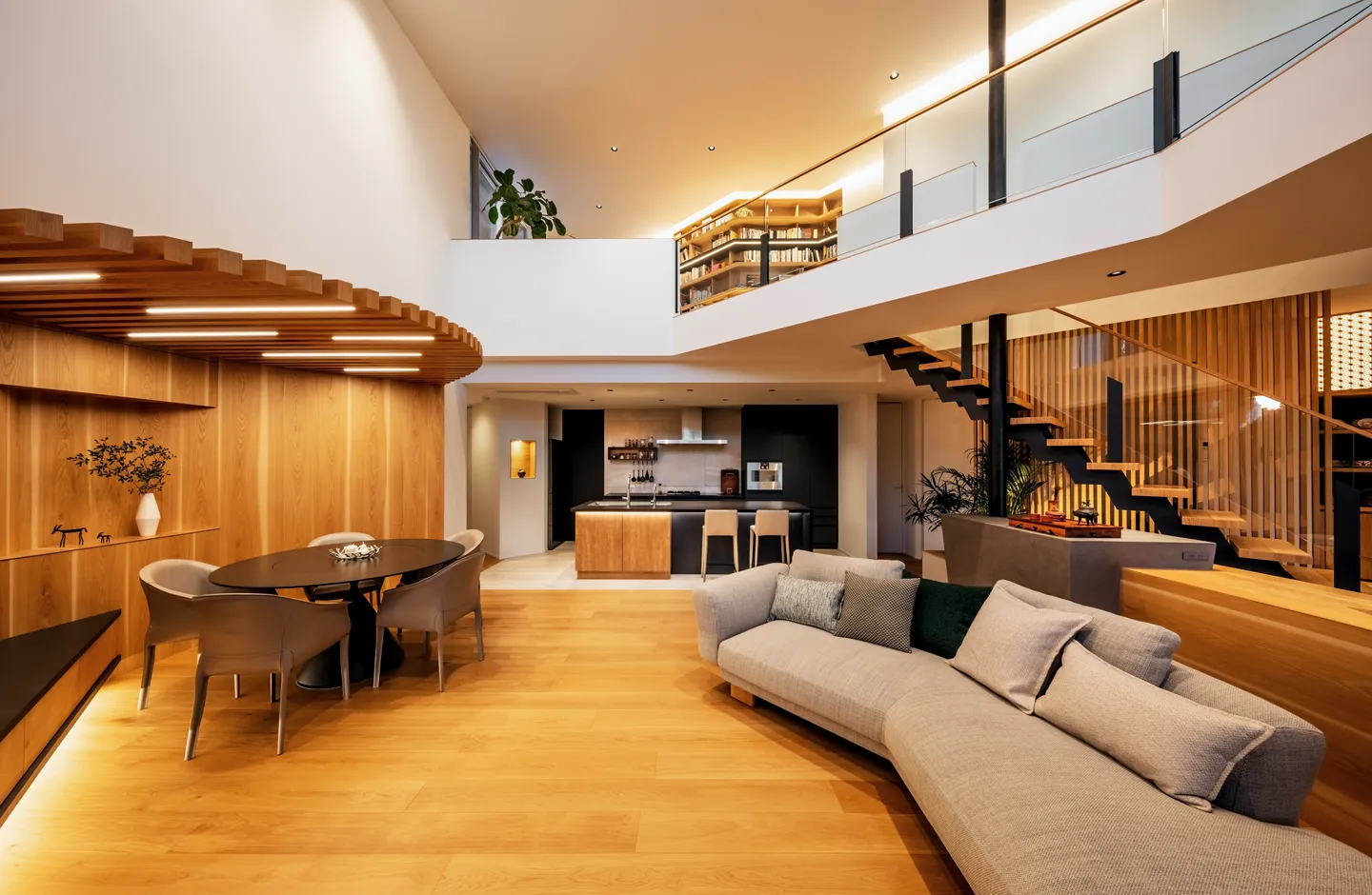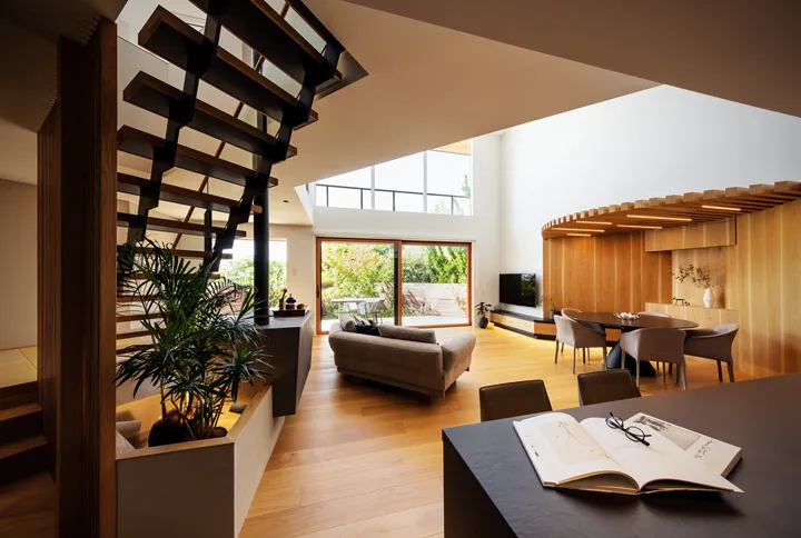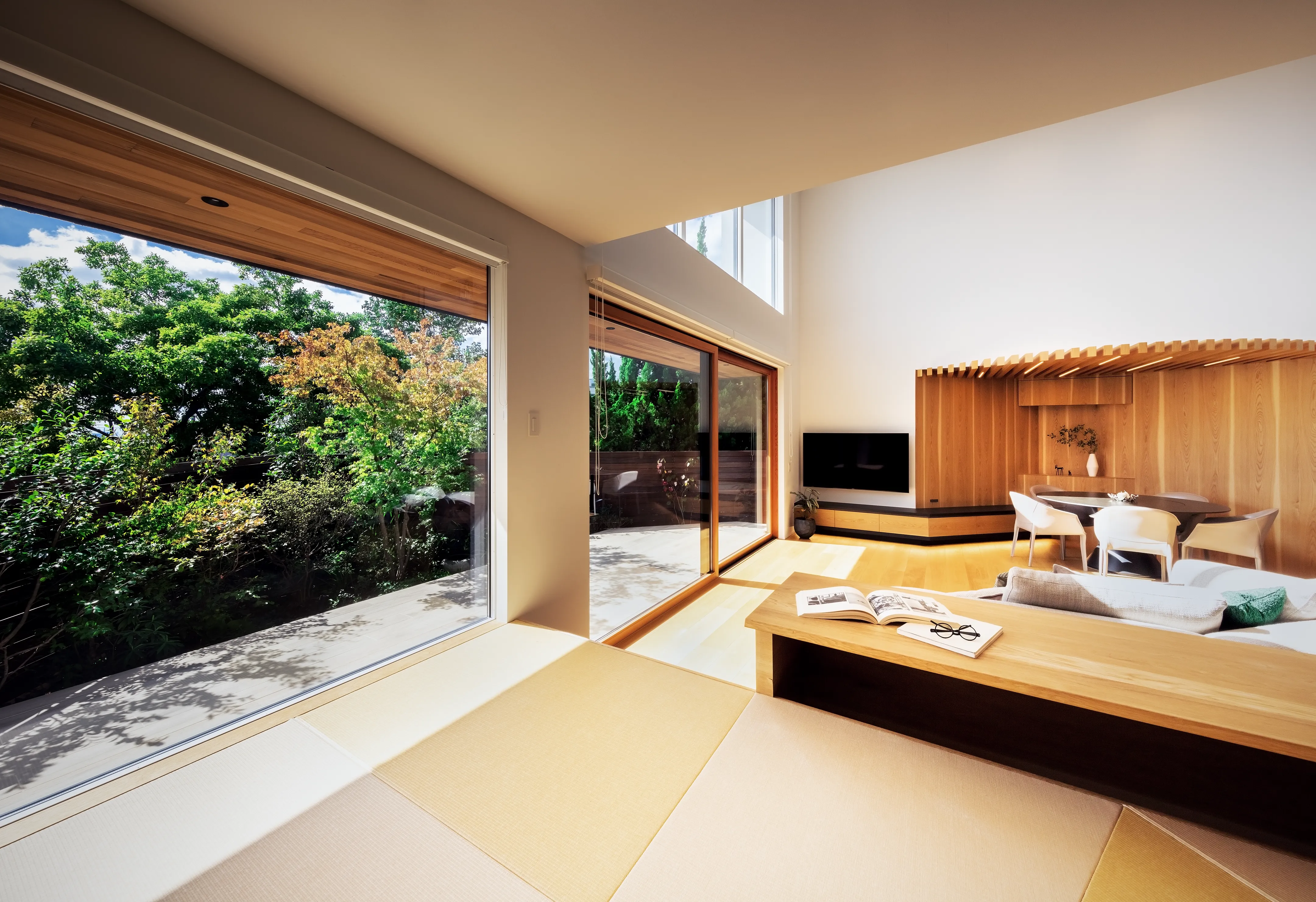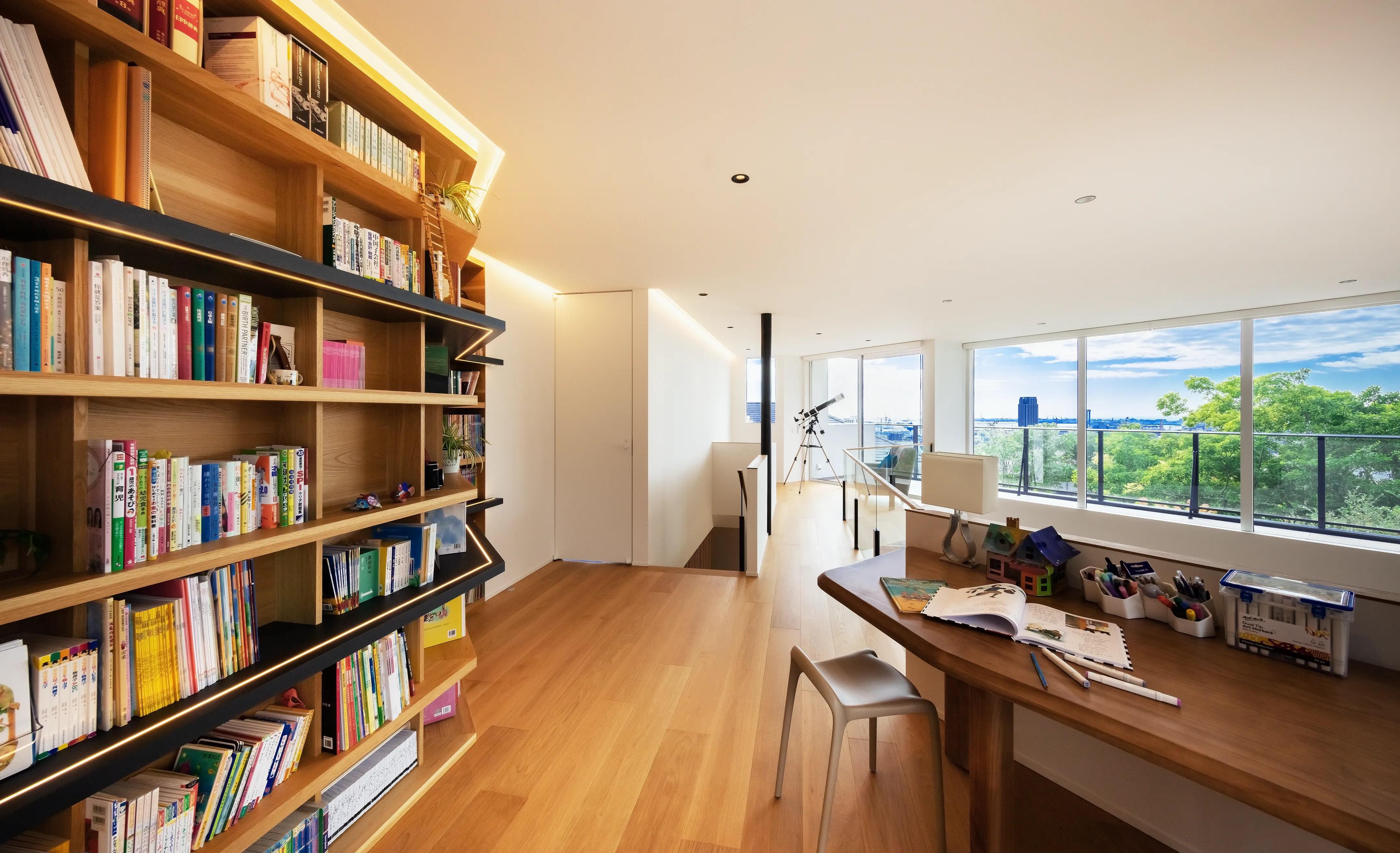 The expansive double-height LDK of 51 m² connects to a washitsu library (washitsu: a tatami-matted Japanese room) set on an extended stair landing, as well as to a living-study and a lounge on the second floor. These connections enrich the sense of openness, allowing the family to spend time on different levels while remaining attuned to one another’s presence.