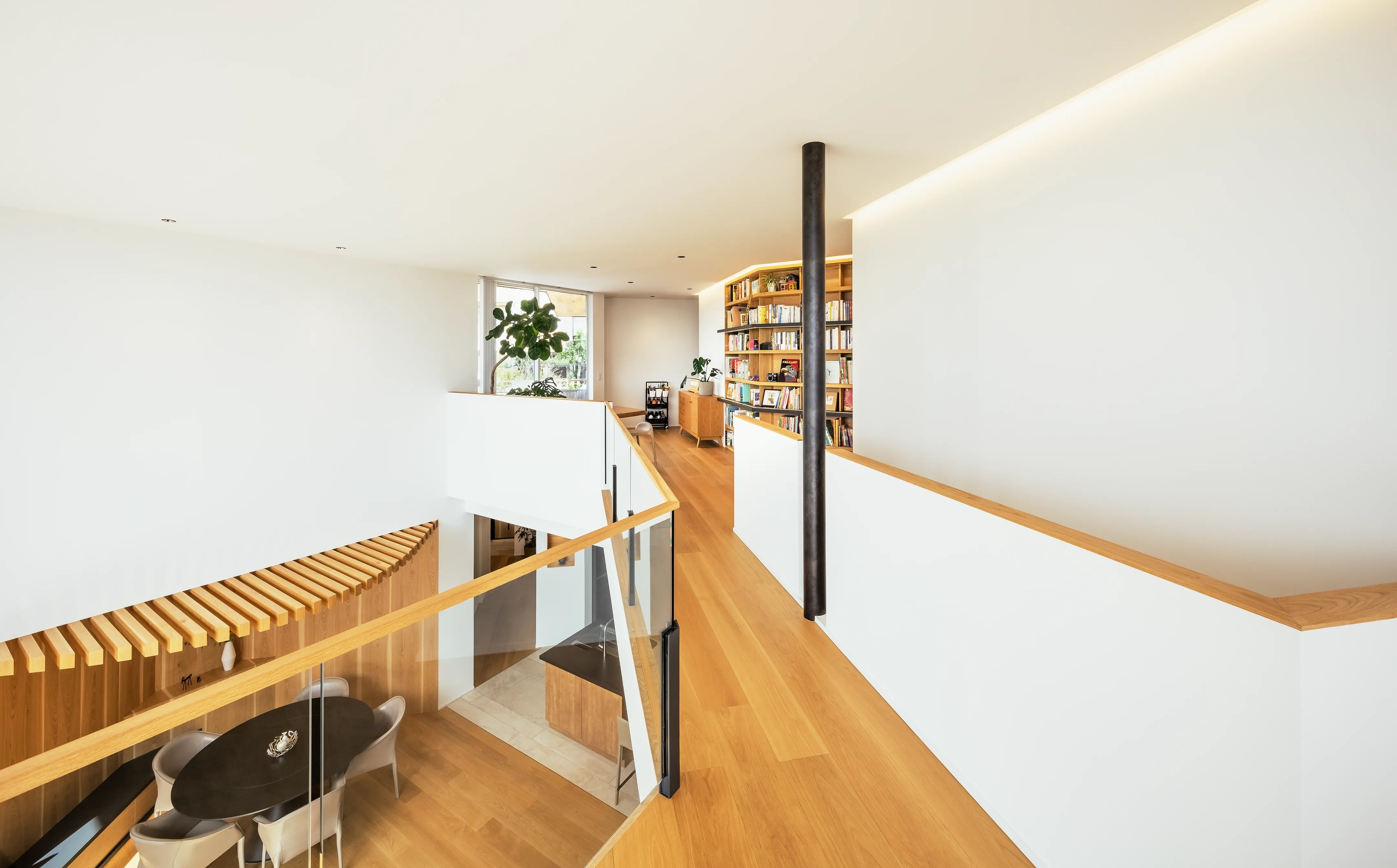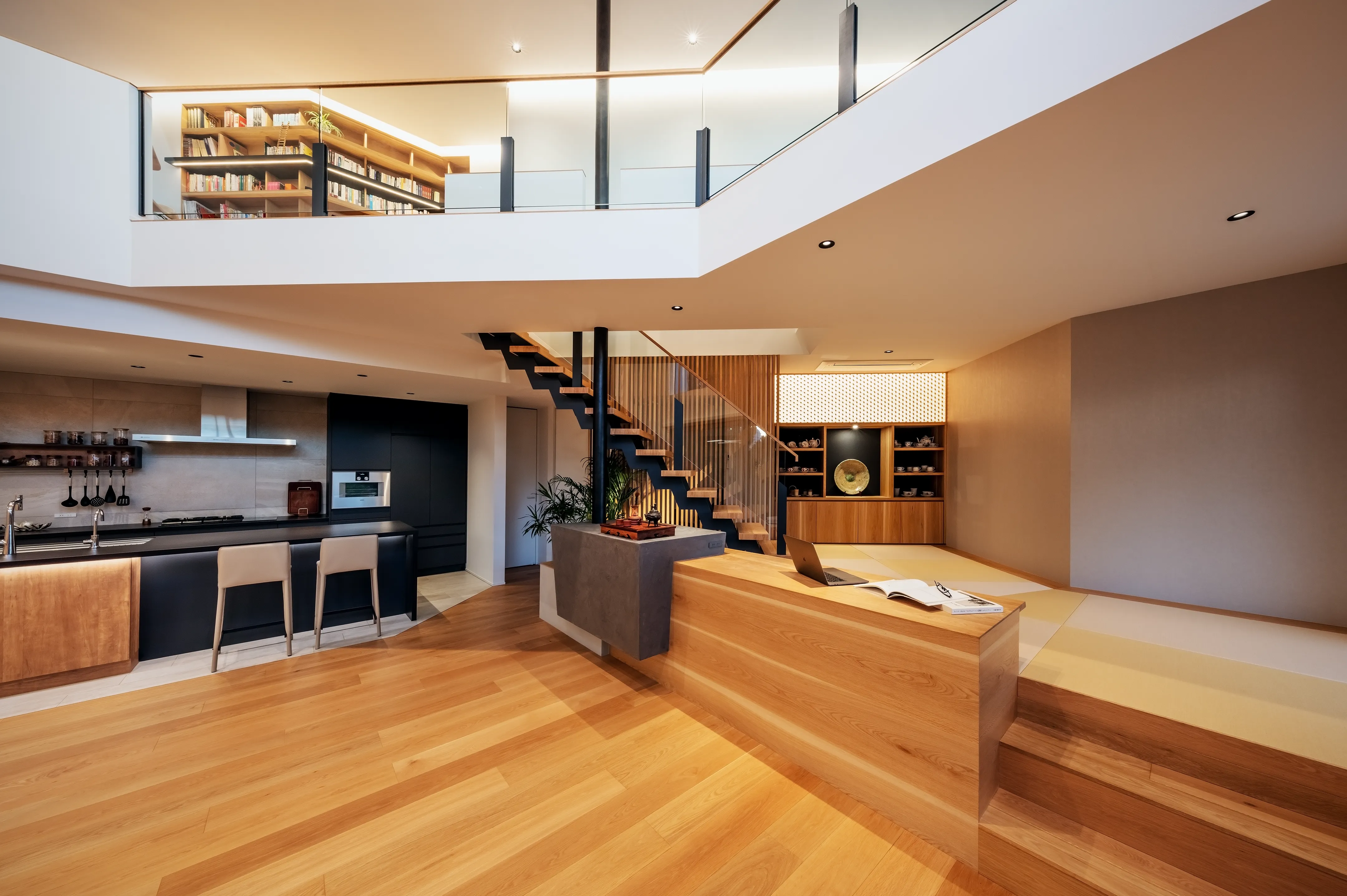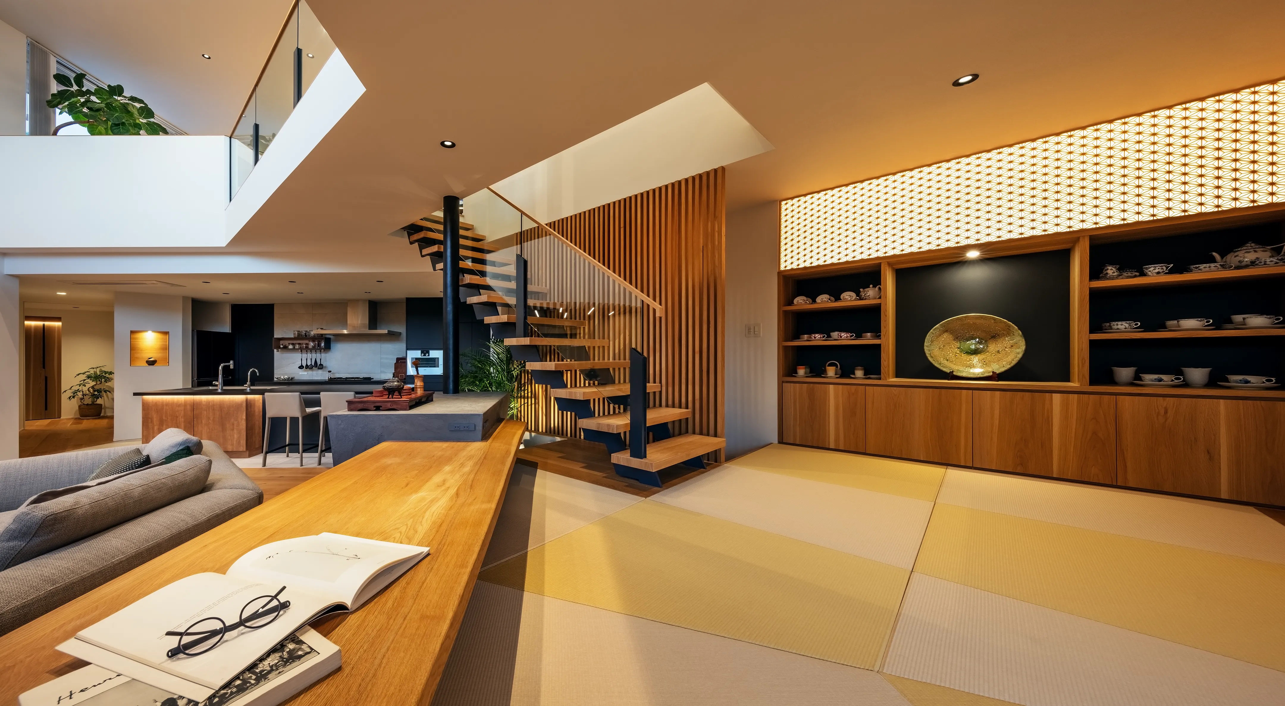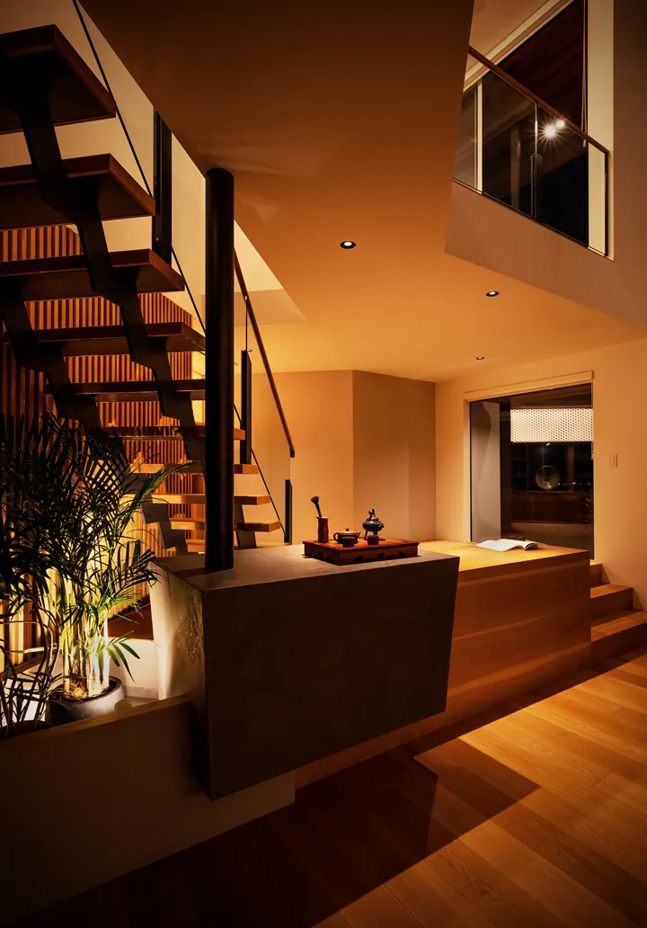 This washitsu, created by extending the stair landing midway between the first-floor LDK and the second floor, serves as a vital node linking the double-height LDK with the living-study and lounge upstairs. It reduces the distance between floors and makes movement along the stairs more engaging.