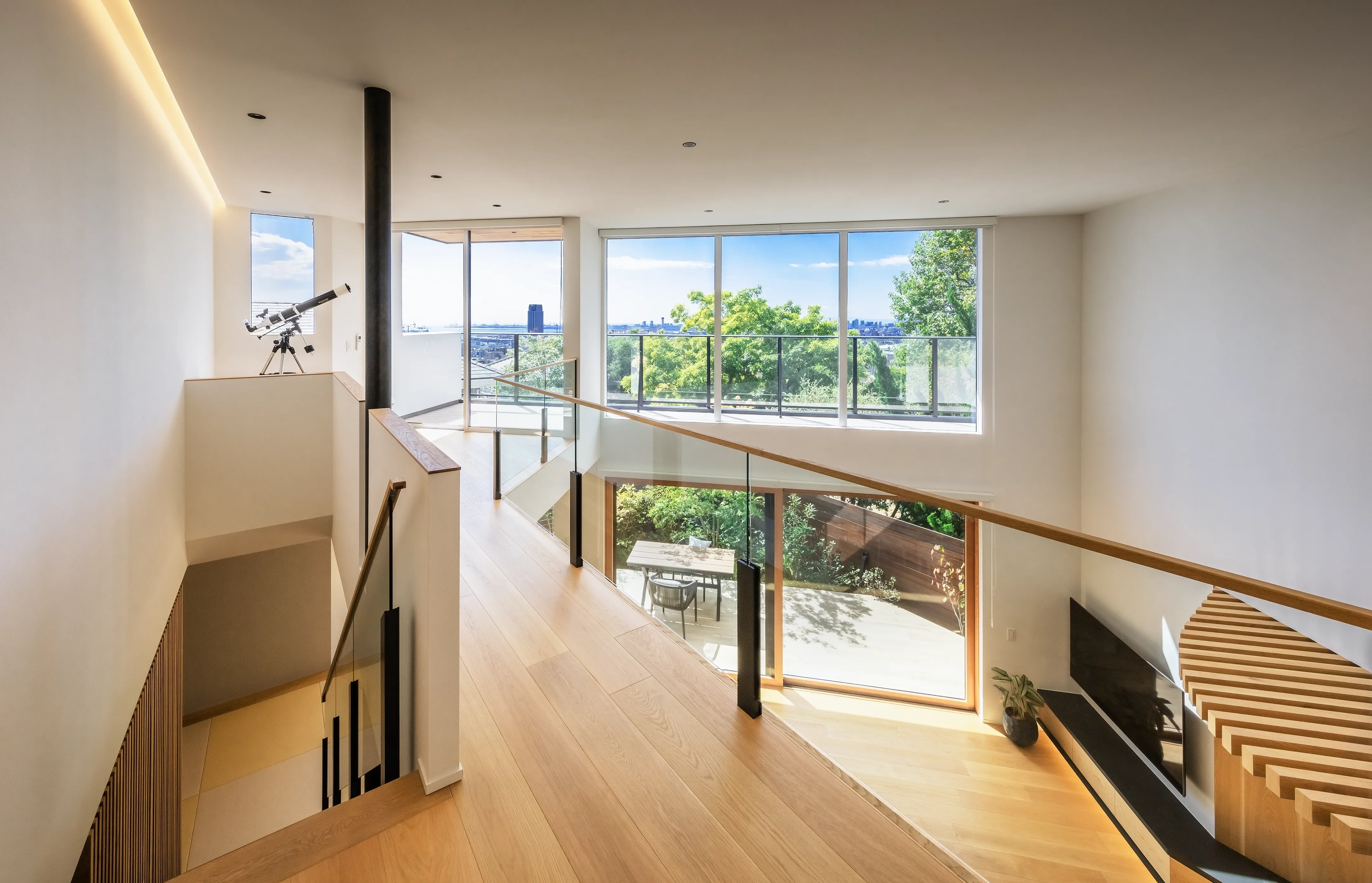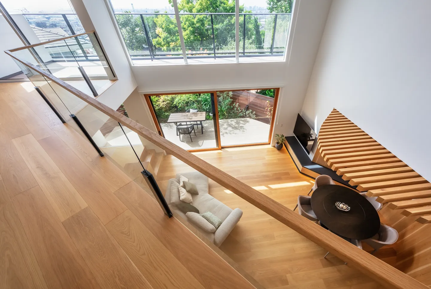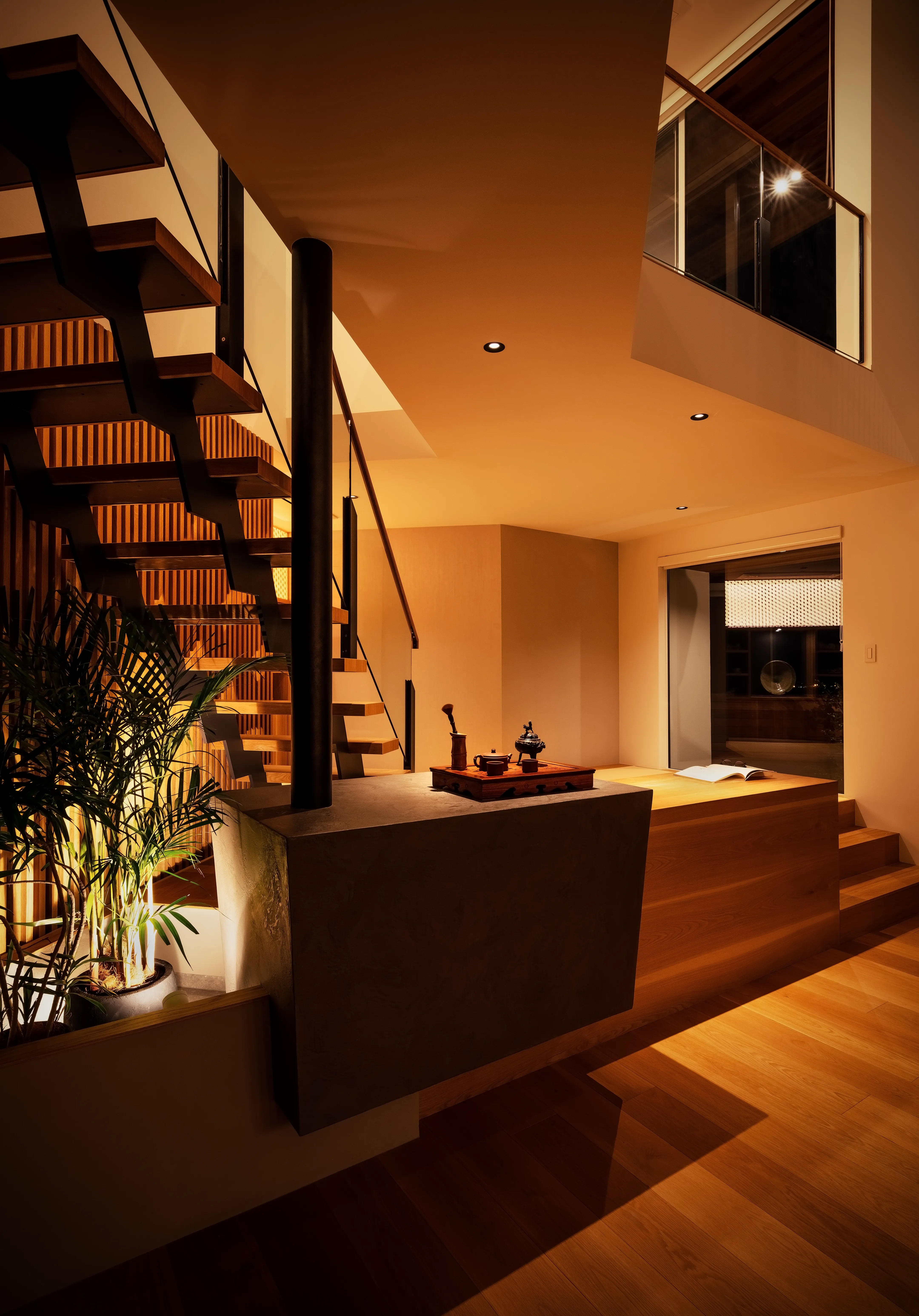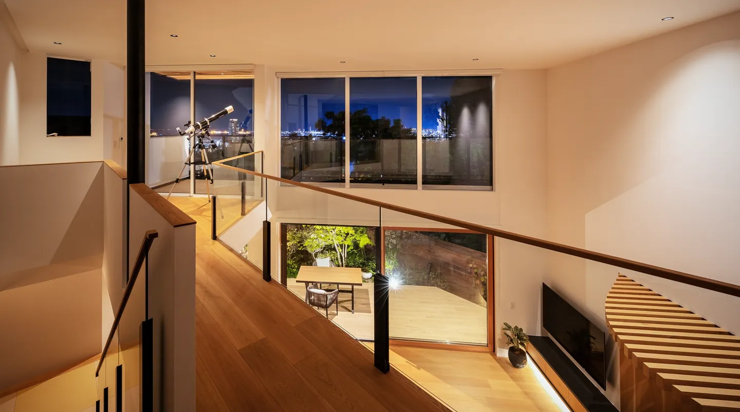 The second terrace extends from the indoor lounge and faces southwest over Kobe, looking down through the double-height void into the LDK as well as out to the trees of the garden and park. It offers a quiet setting for a small group to enjoy the night view and drinks, like a bar lounge in a hotel.