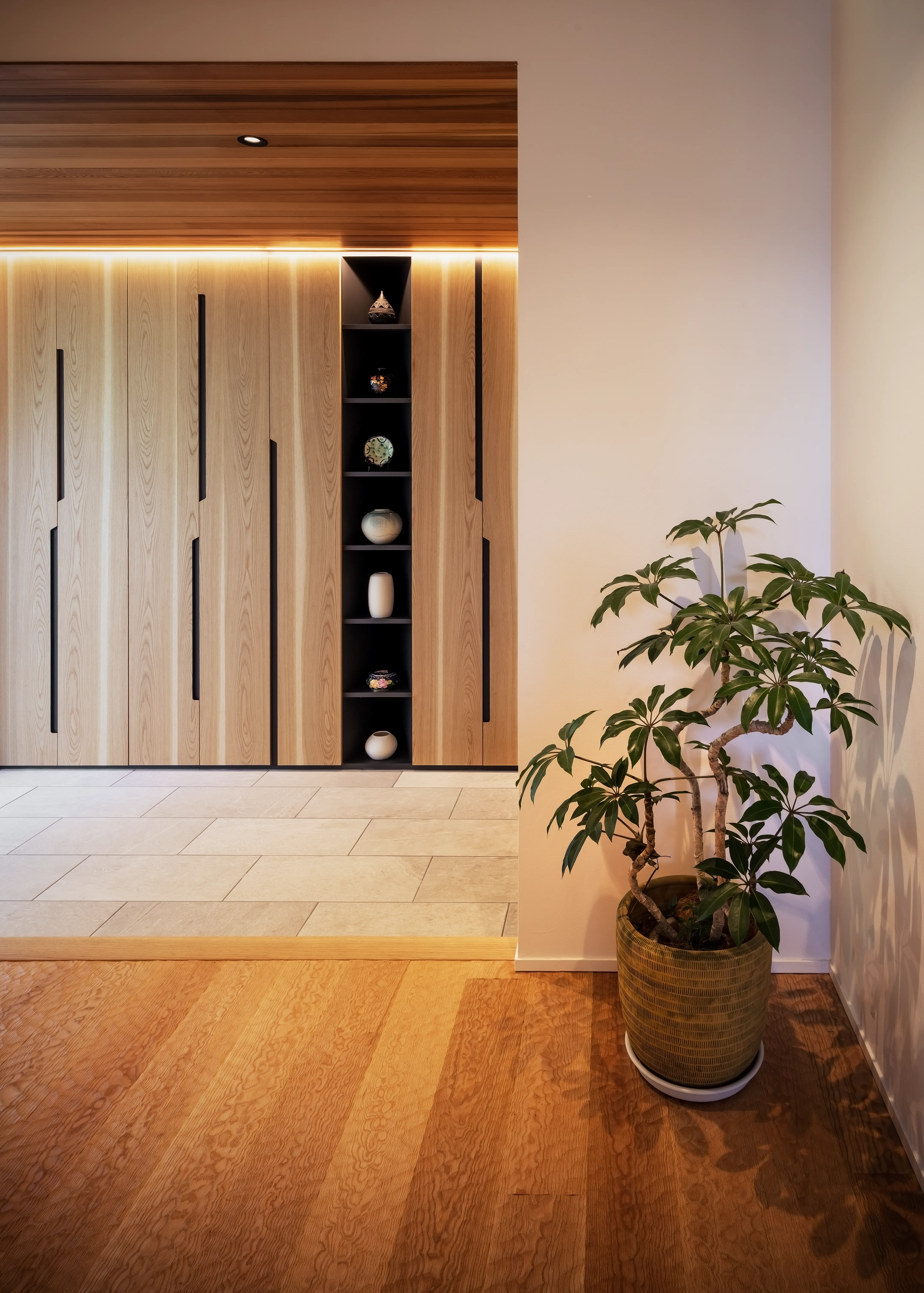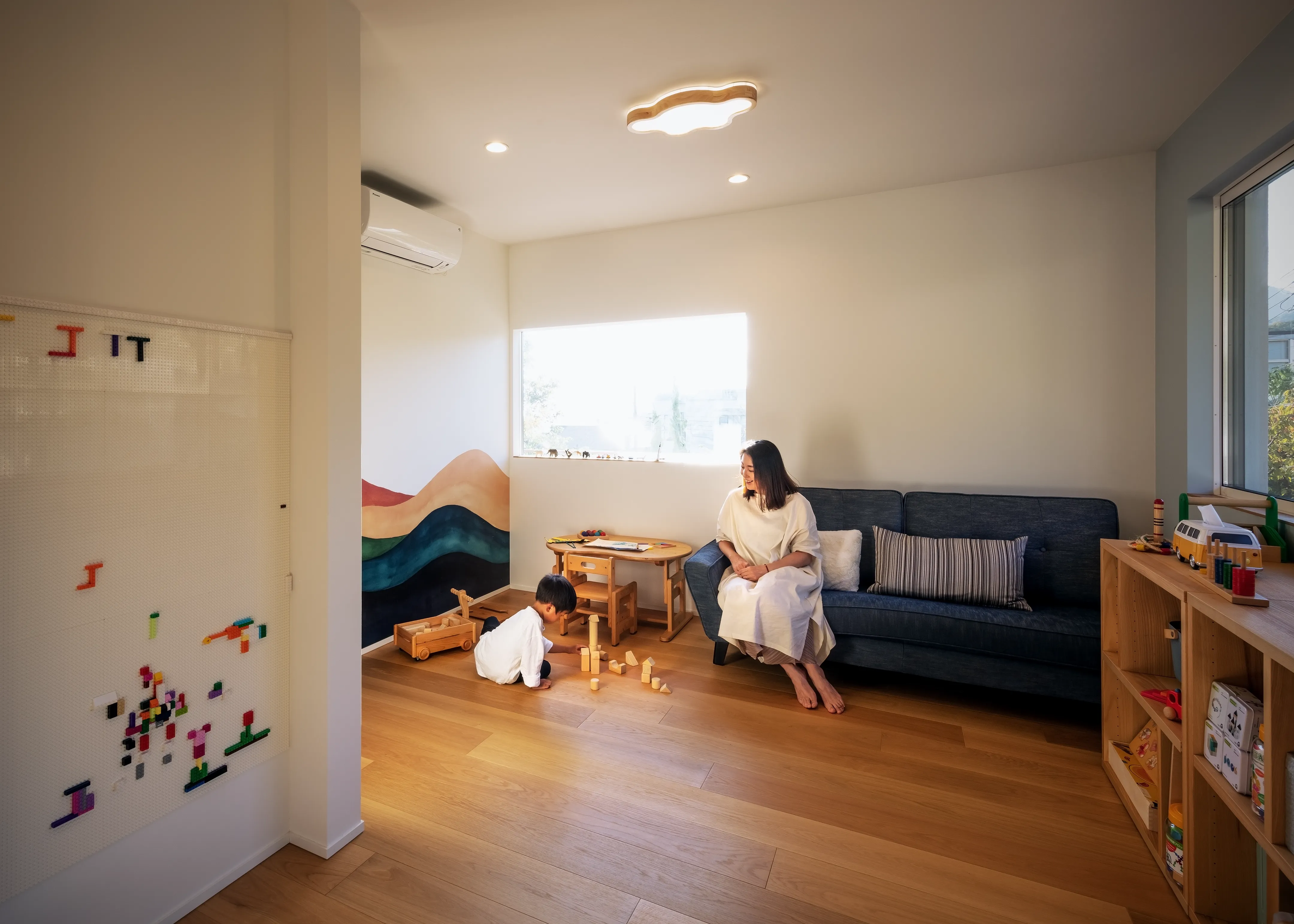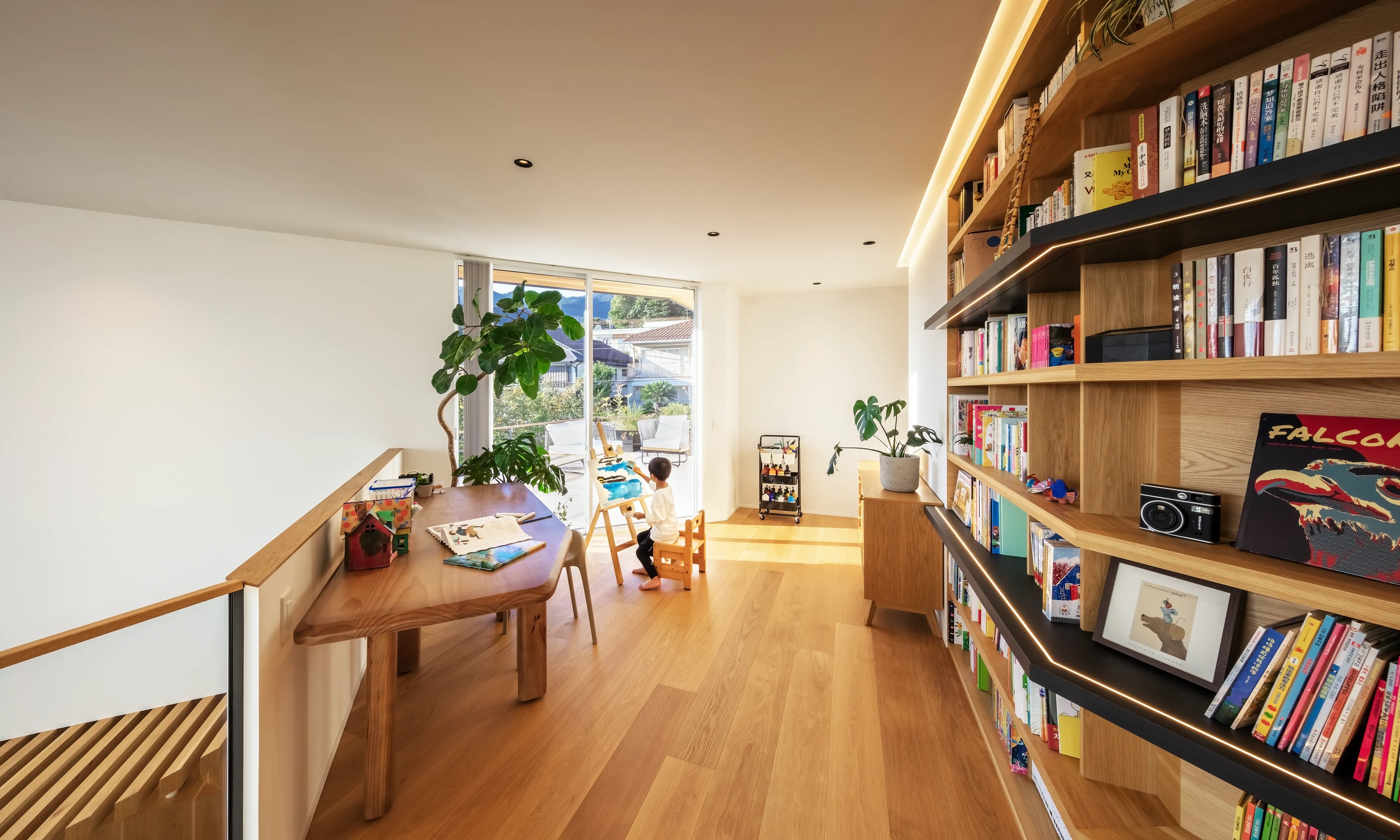 Serving also as a library, it features a counter with a sunken kotatsu seating (kotatsu: a low table with a built-in heater, covered by a quilt). One can work, read, or practice calligraphy while remaining connected to the family in the LDK, or simply relax on the tatami. It readily accommodates meditation, yoga, and other activities—an adaptable place that invites shared presence while allowing individual pursuits.