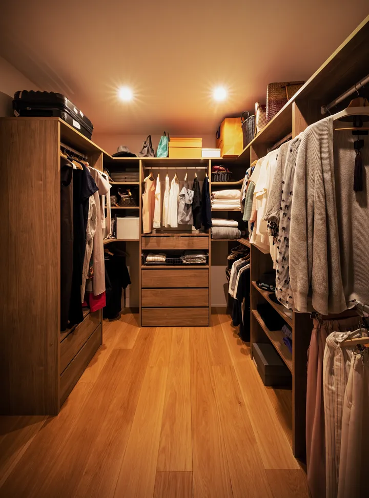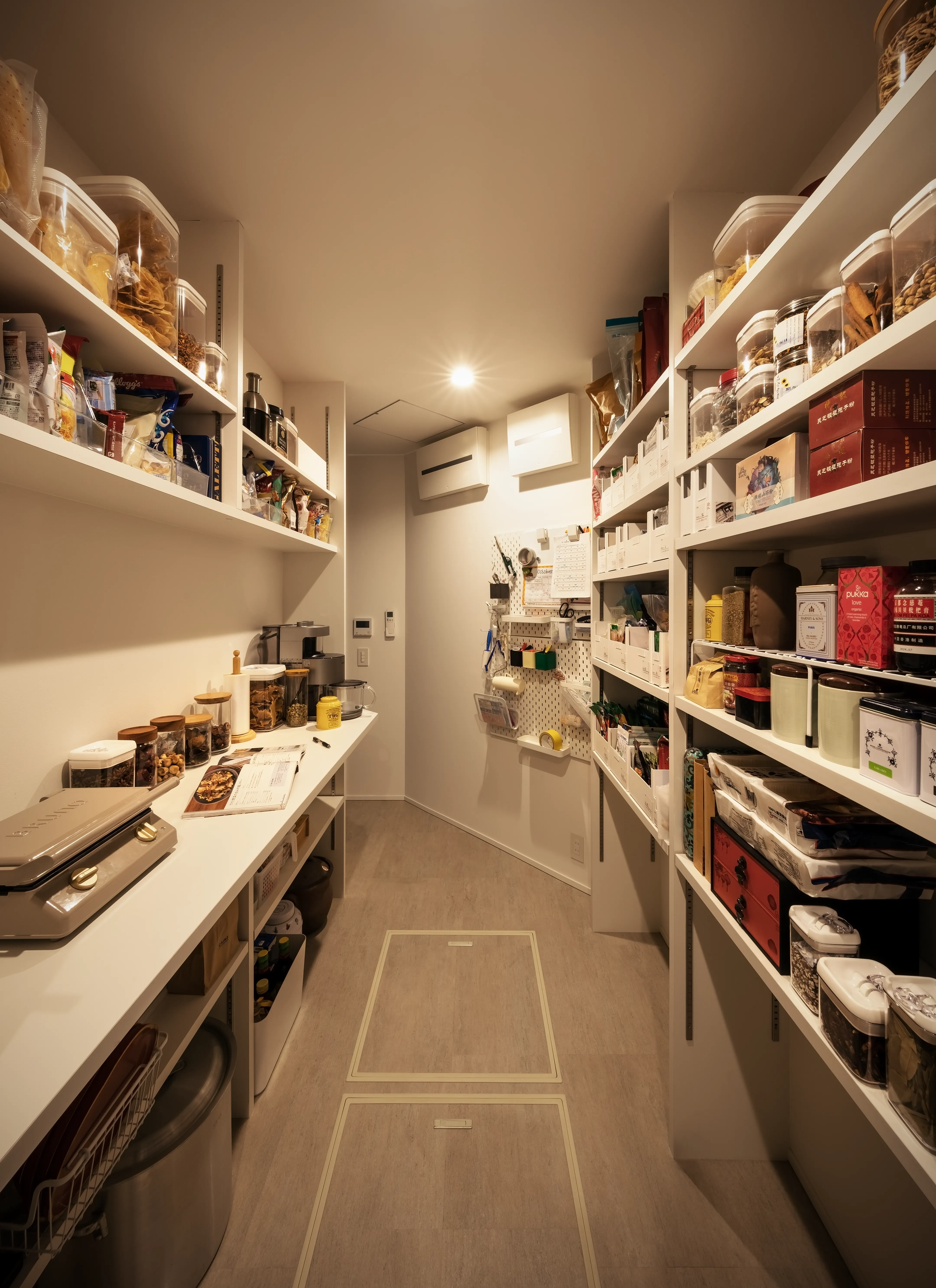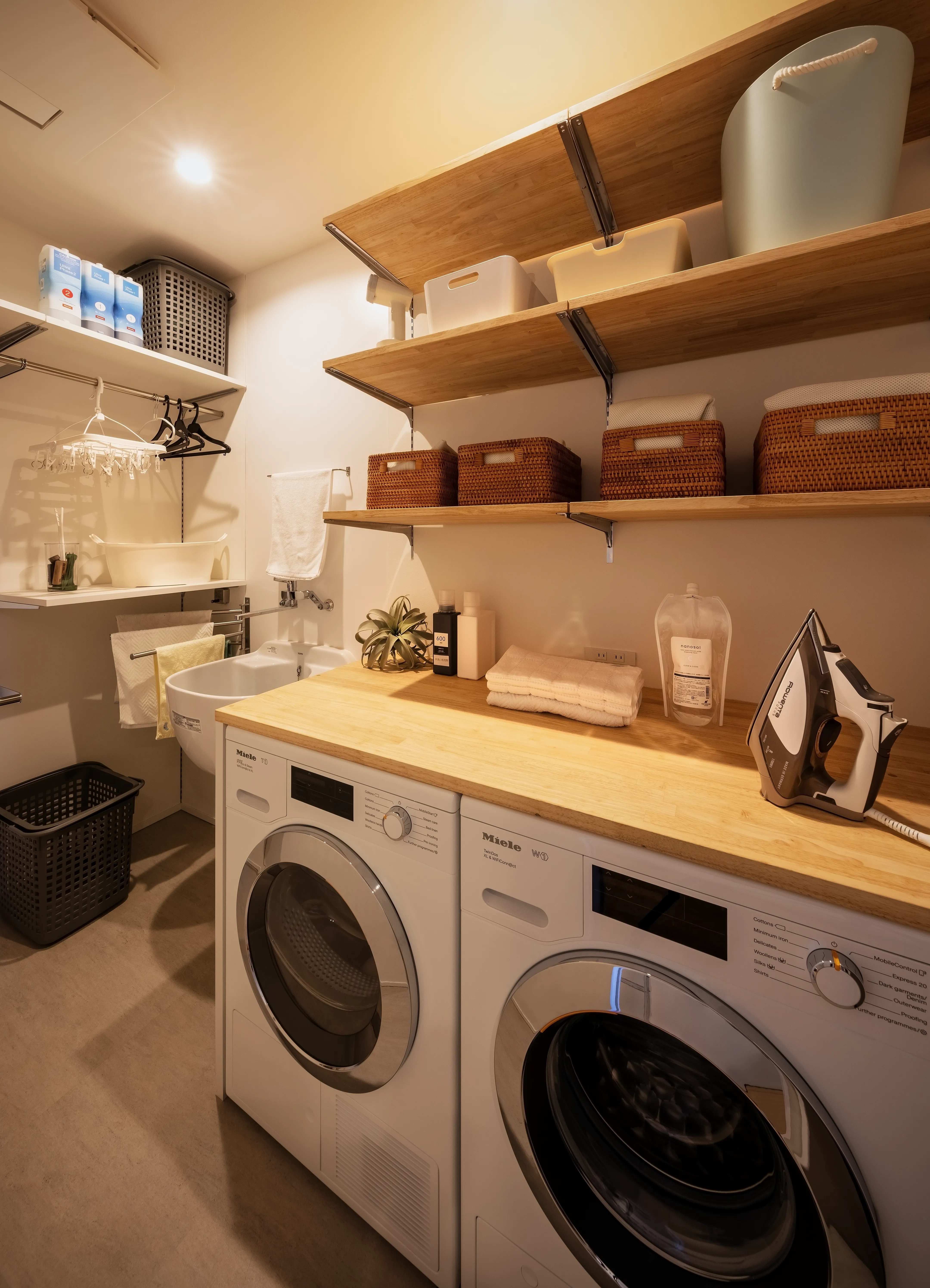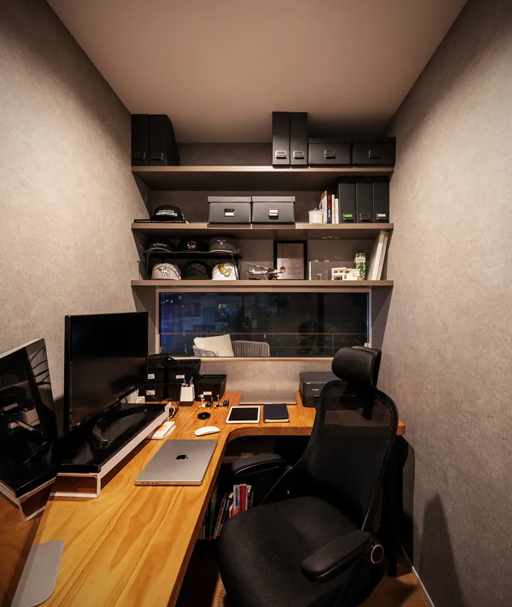 Serving also as a library, it features a counter with a sunken kotatsu seating (kotatsu: a low table with a built-in heater, covered by a quilt). One can work, read, or practice calligraphy while remaining connected to the family in the LDK, or simply relax on the tatami. It readily accommodates meditation, yoga, and other activities—an adaptable place that invites shared presence while allowing individual pursuits.