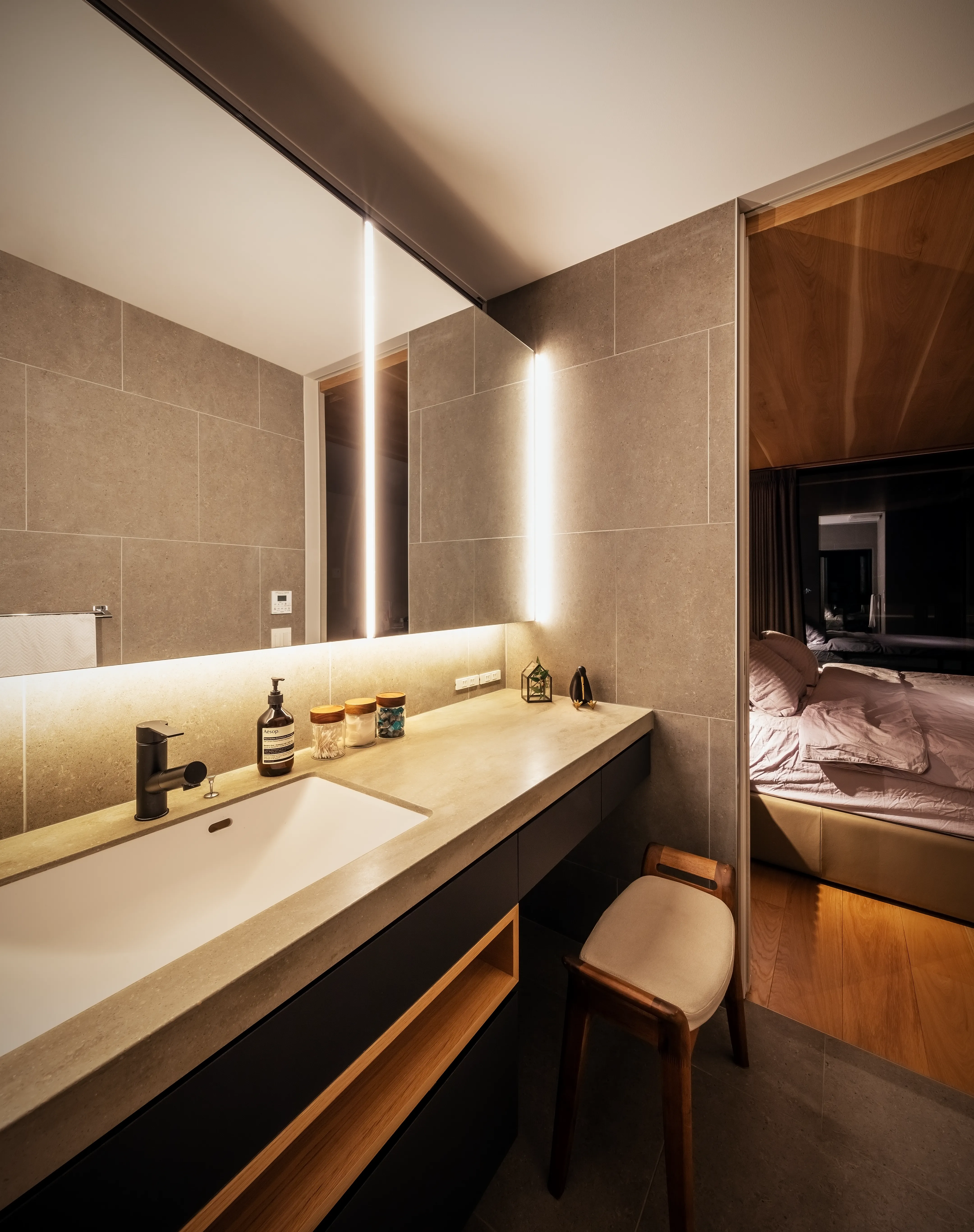The third outdoor space is a south-facing balcony adjoining the master bedroom. Facing south but open to the morning light from the east, it provides an ideal spot for leisurely coffee or breakfast together on weekends. At the same time, it screens the bedroom from being overlooked from below, contributing to privacy.
