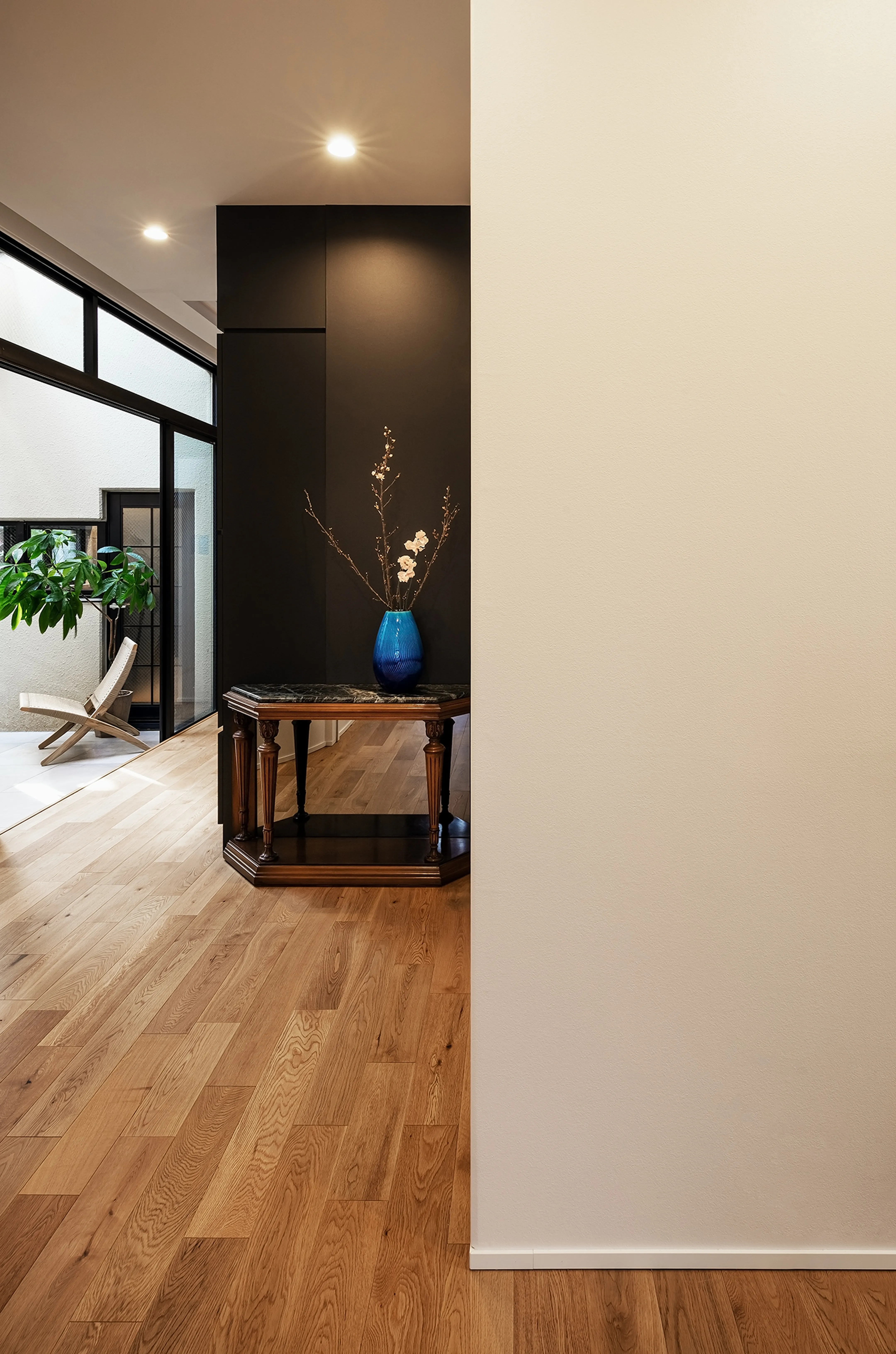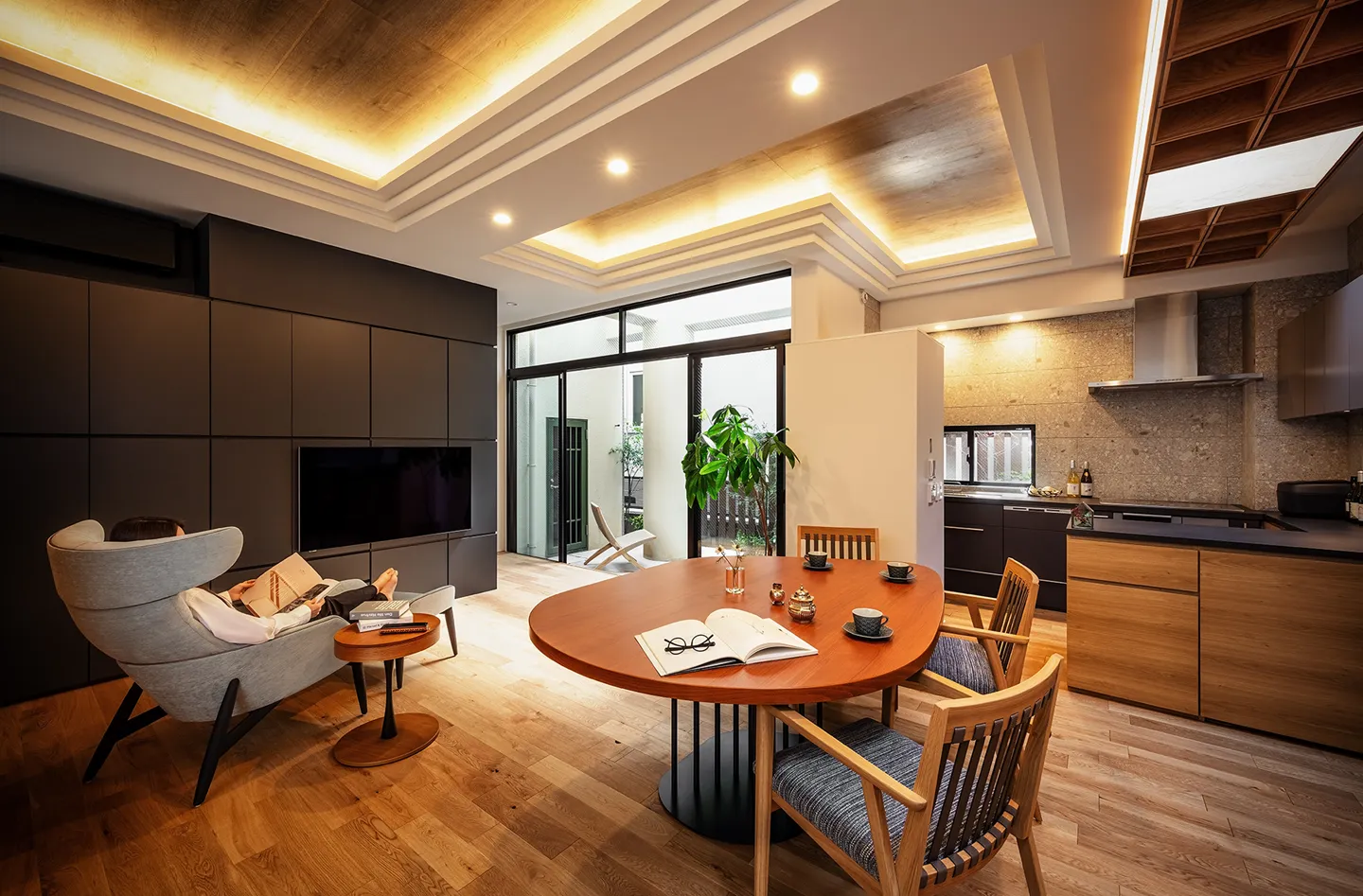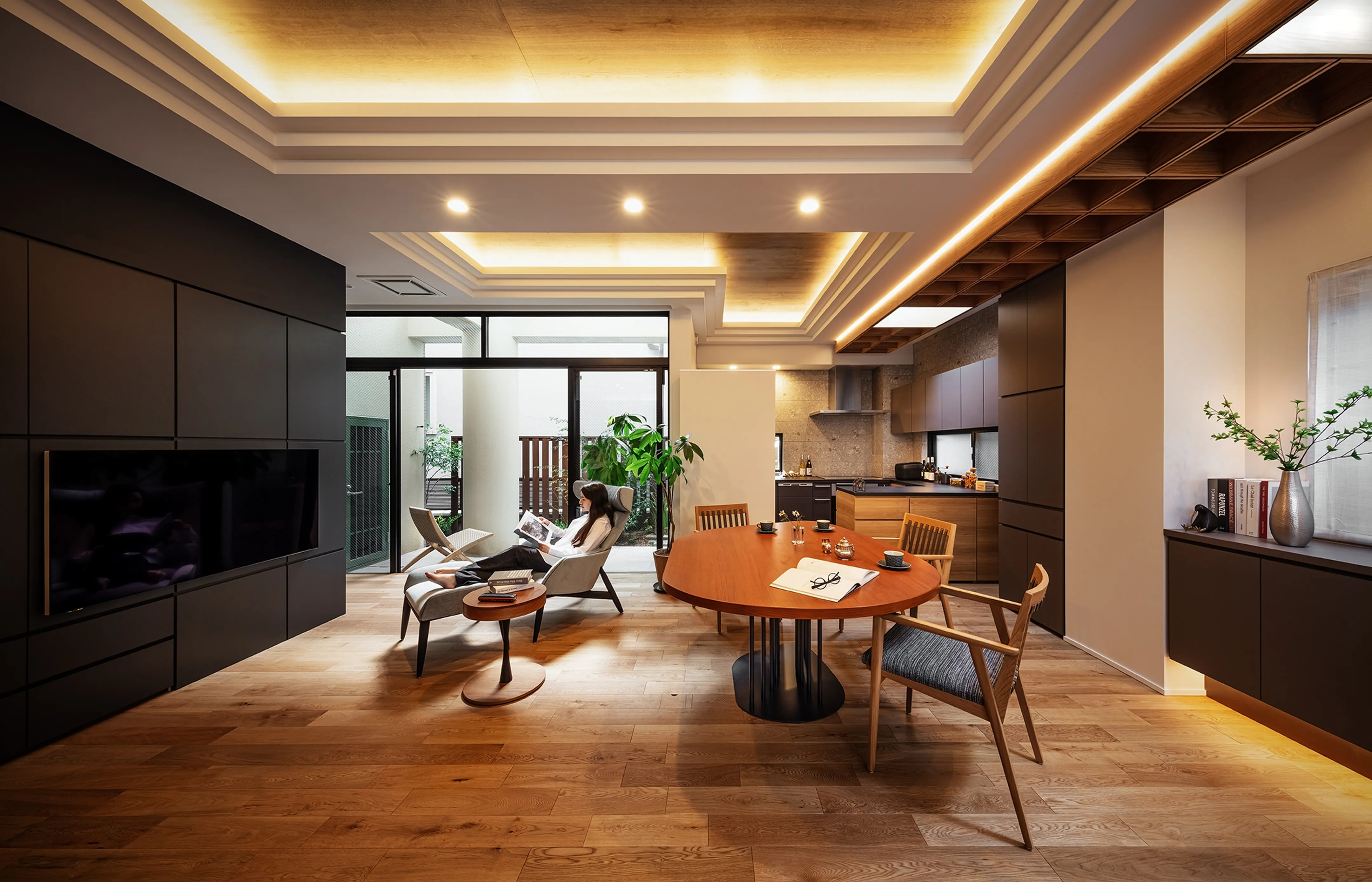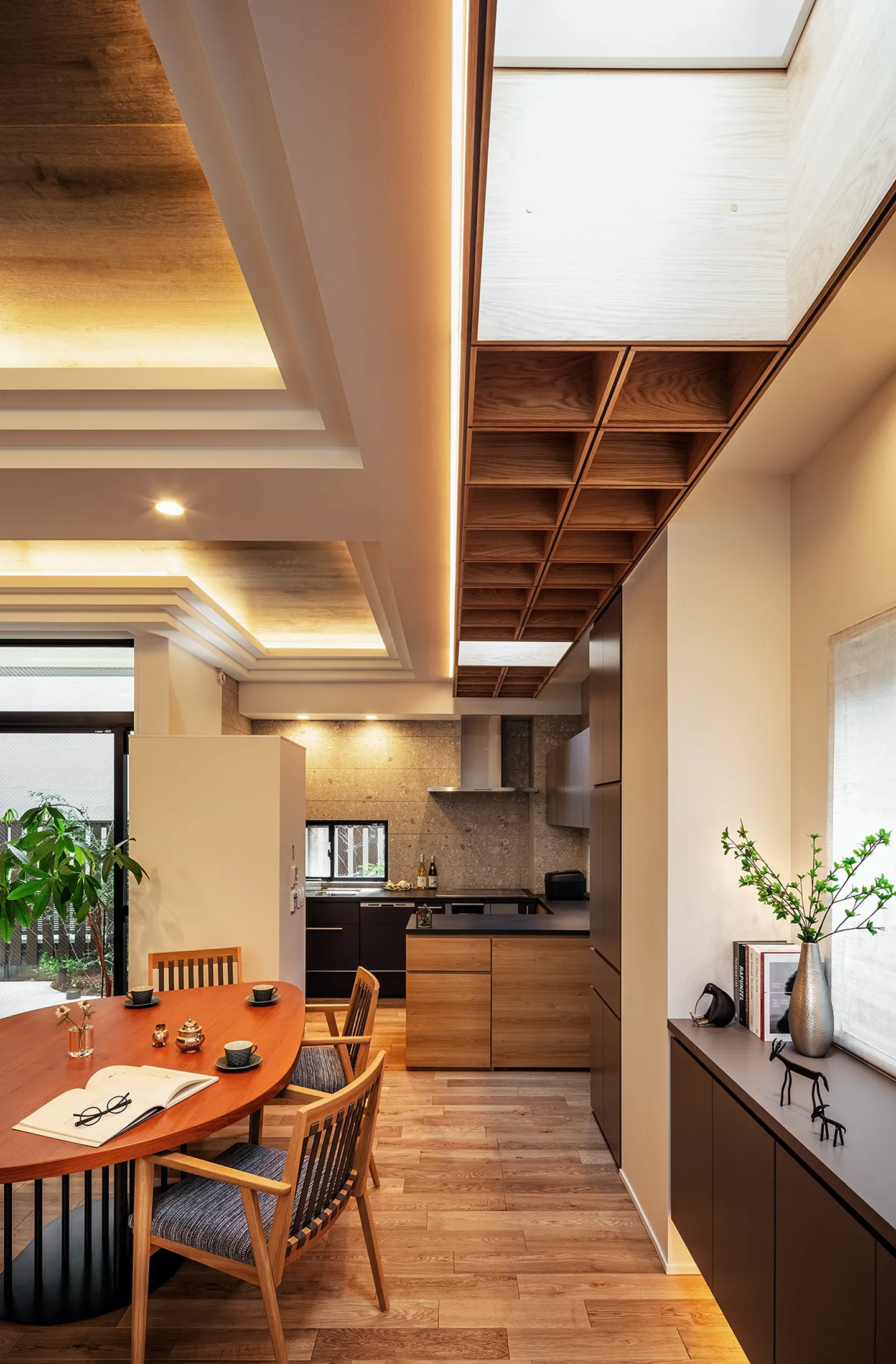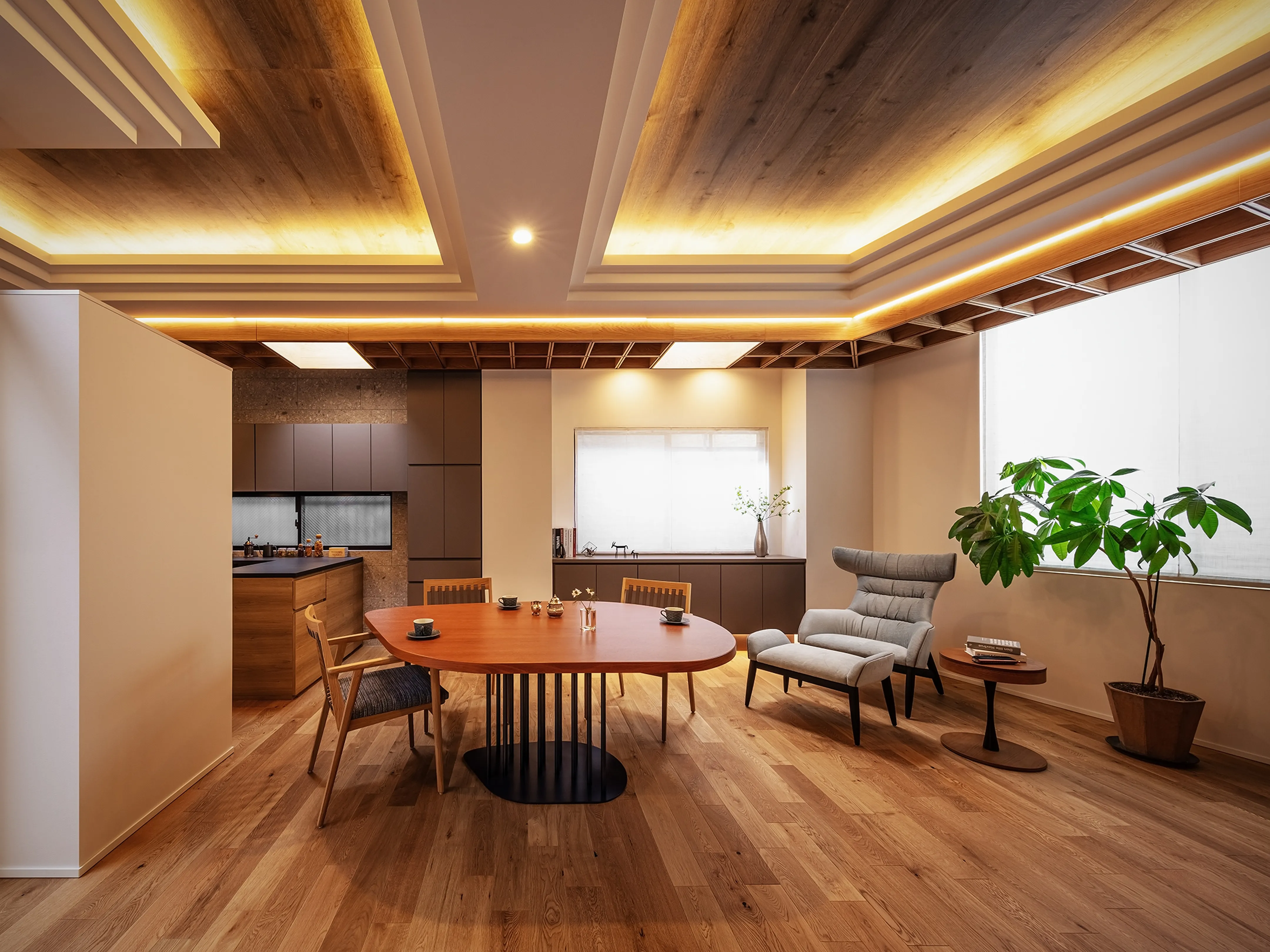 Given the location, artificial lighting was necessary to support brightness in the LDK. Yet the aim was not simply brightness, but a space filled as much as possible with natural light—or something close to it.
