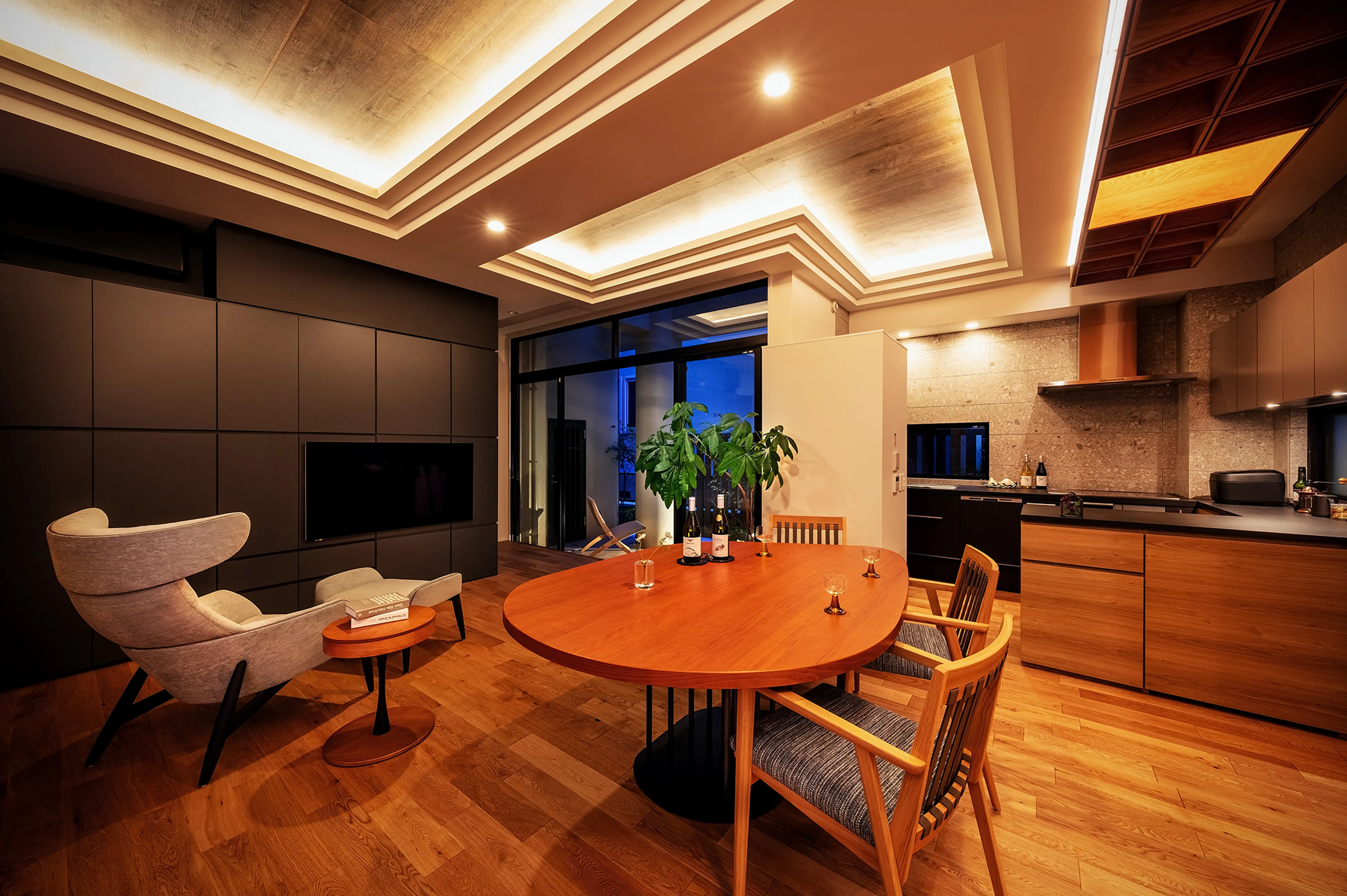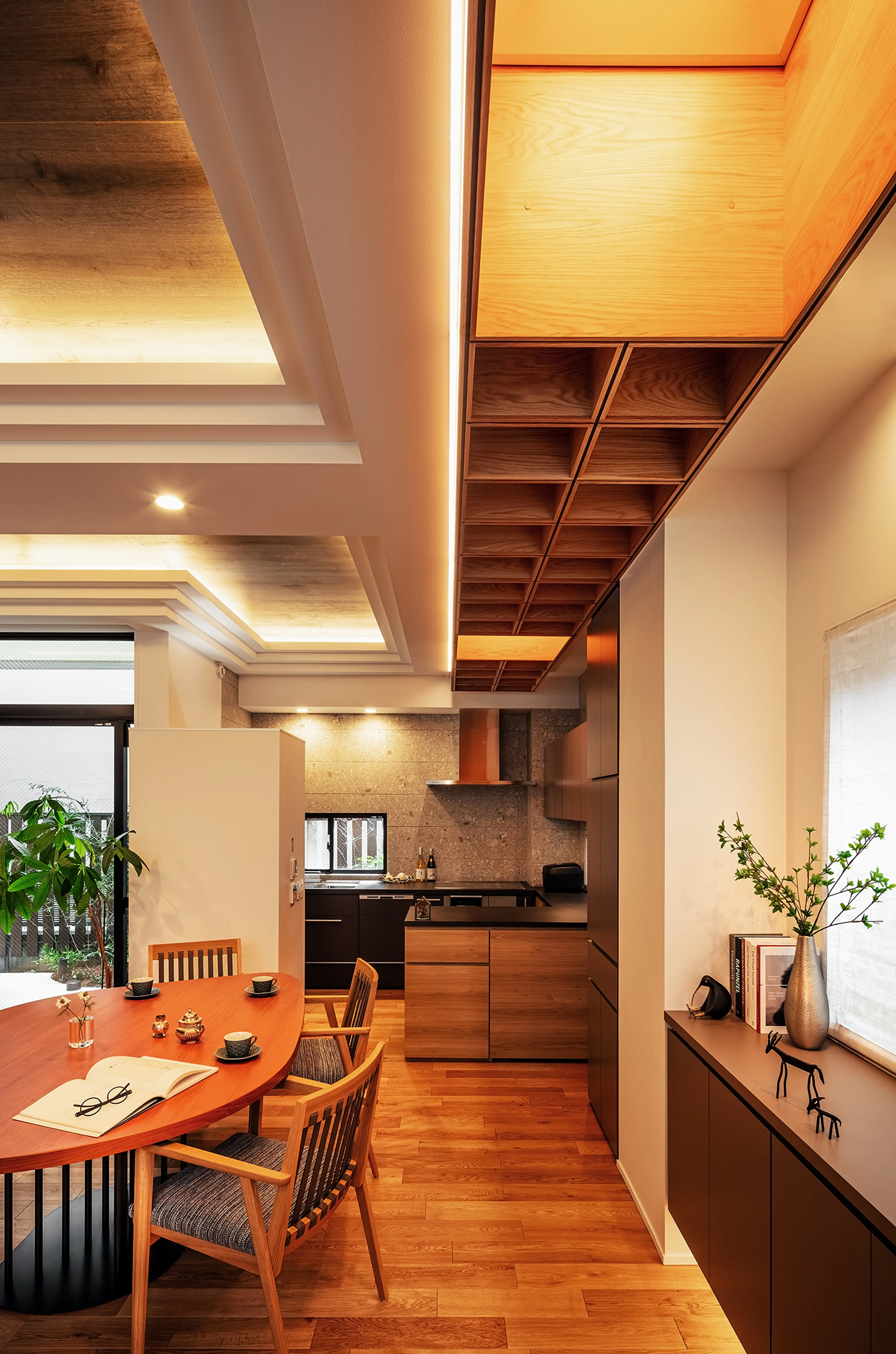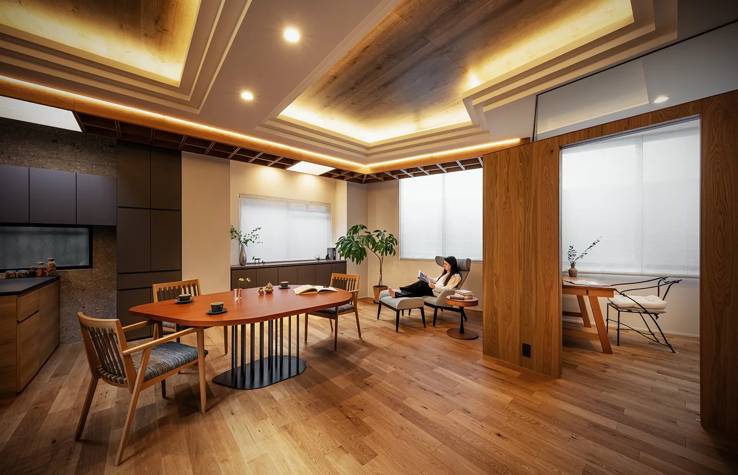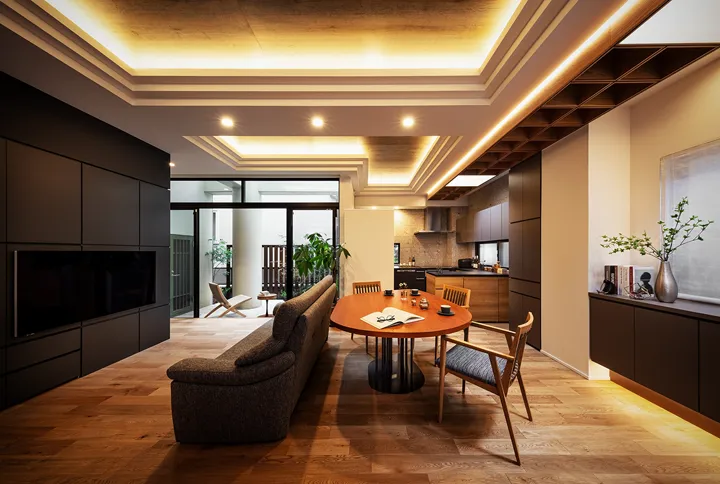 The solution was Synca by ENDO Lighting Corporation. This new lighting system can reproduce a wide range of natural light, from candlelight to clear daylight. Installed within the lattice ceiling, it works like light filtering in from a skylight. By spending the day in bright daylight and gradually shifting toward lower color temperature and lower intensity in the evening, the couple can relax body and mind, enhancing the quality of sleep—an approach to healthier, more comfortable living within the LDK.