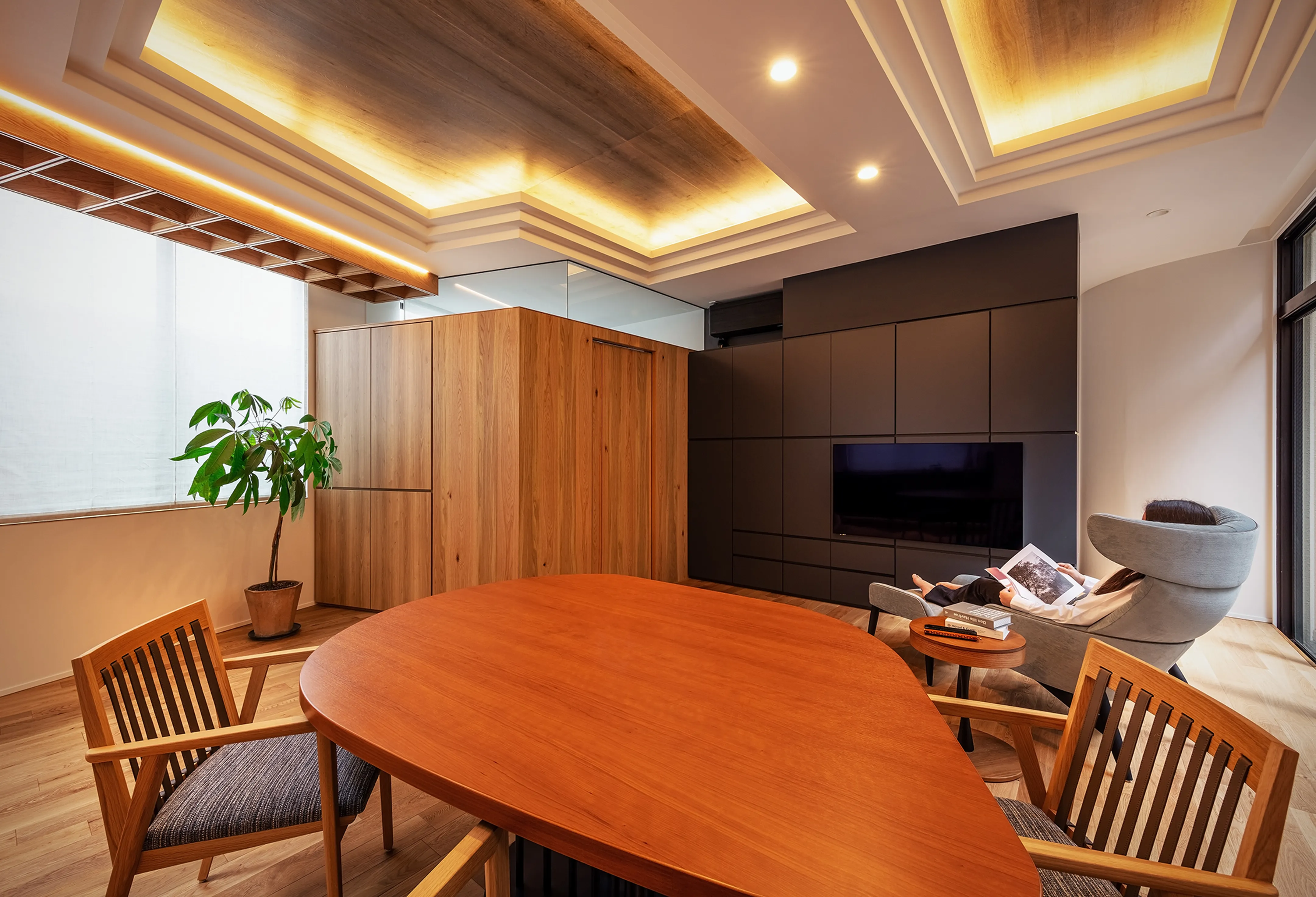 The plan was originally non-rectangular, but by skillfully using the obtuse and acute angles to arrange the furniture, the space was transformed from “difficult to use” to one that feels expansive, distinctive, and engaging.