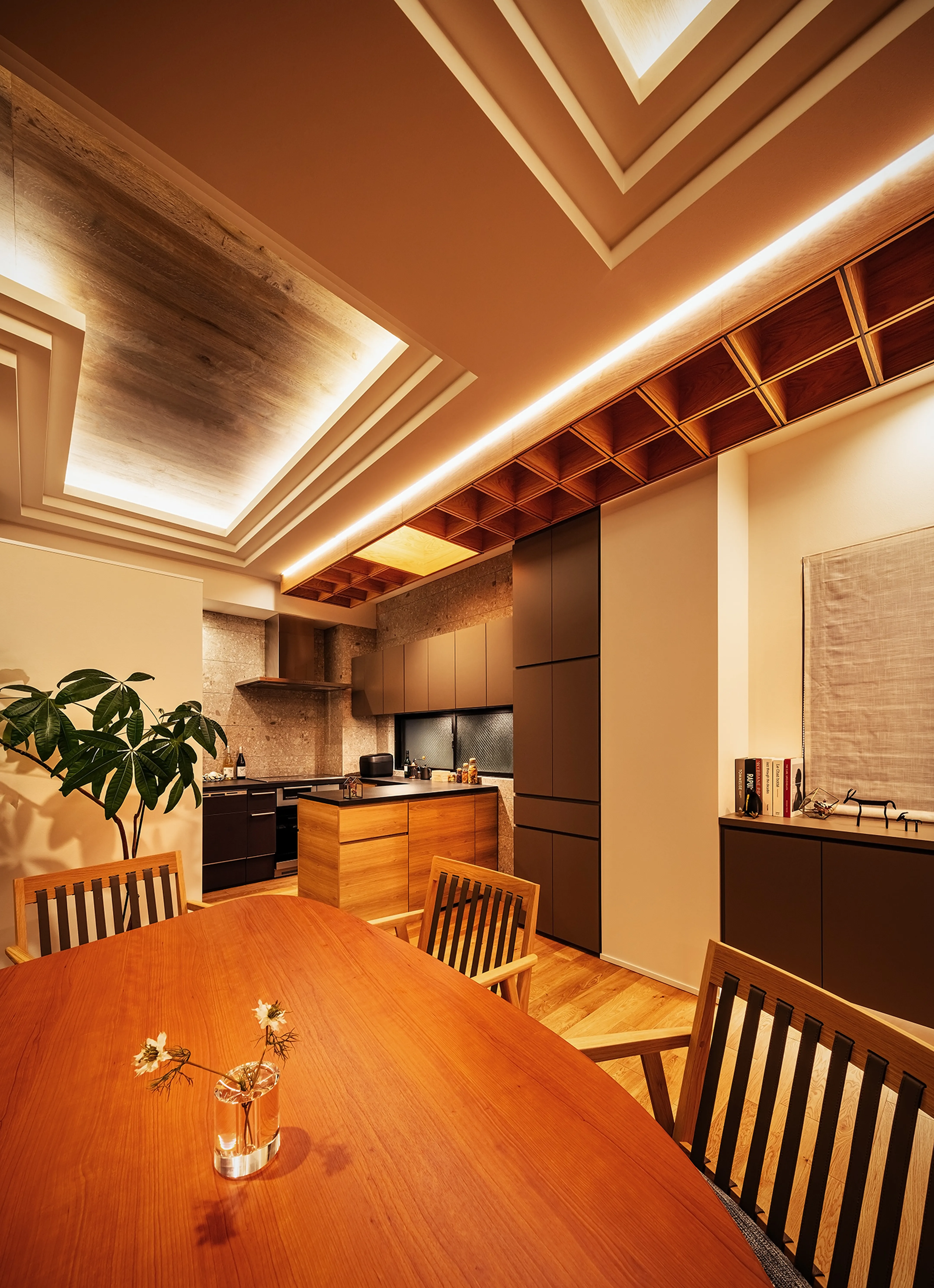 The custom-designed dining table was created to suit the space and to unify it as a whole. For the couple and their friends, who often host concerts, the ceiling was conceived with the image of a music hall in mind.