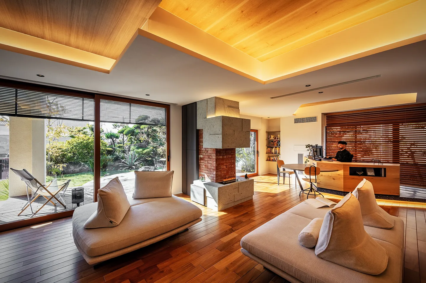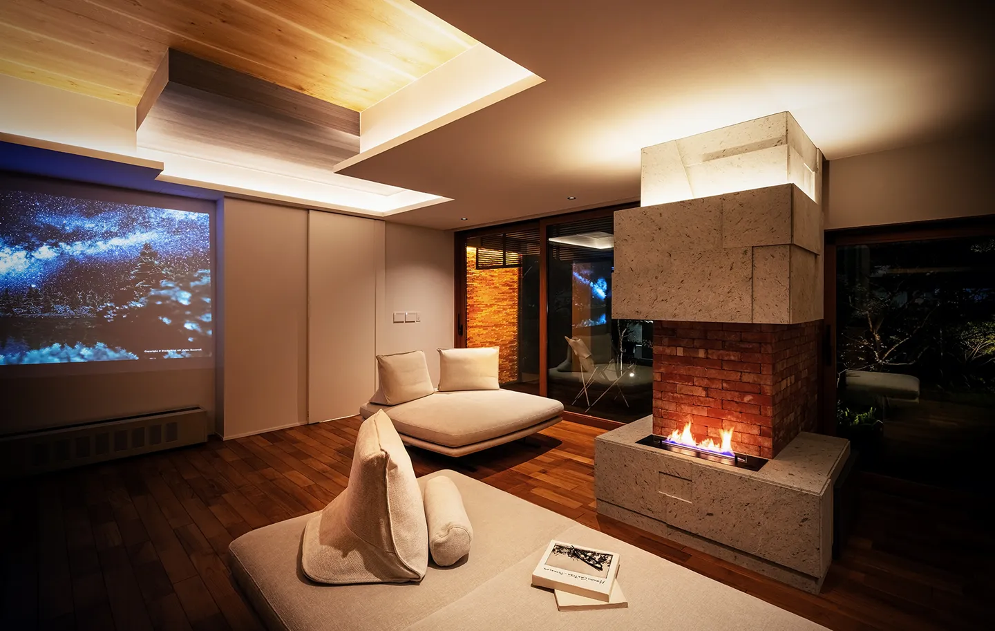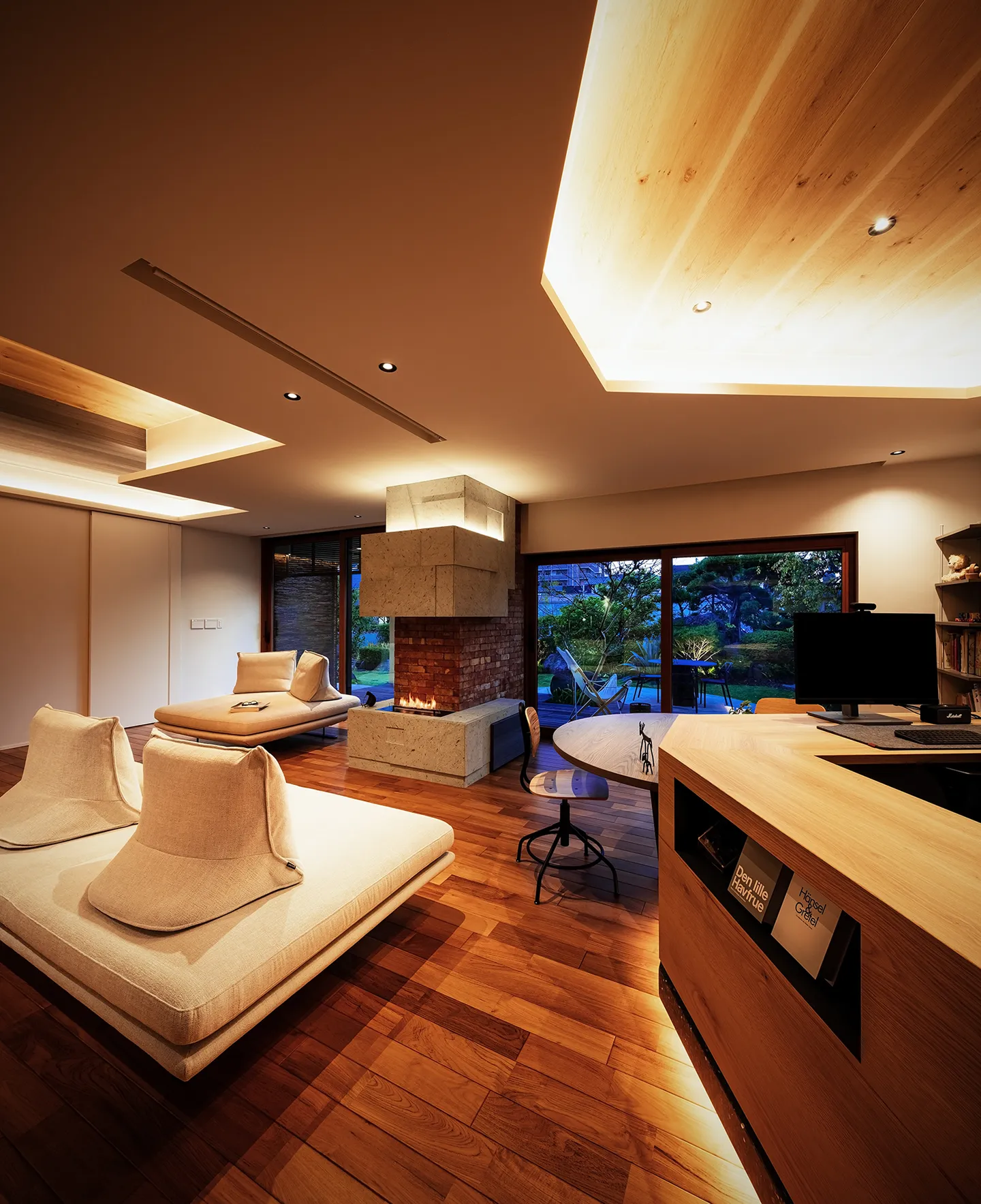 The living room is furnished with a bioethanol fireplace and a central sofa. The fireplace produces no soot or smoke, making it easy to enjoy the presence of a hearth. Around it, a sofa with movable backrests allows flexible use—whether facing the flames, the greenery of the garden, or the family gathered in the LDK.