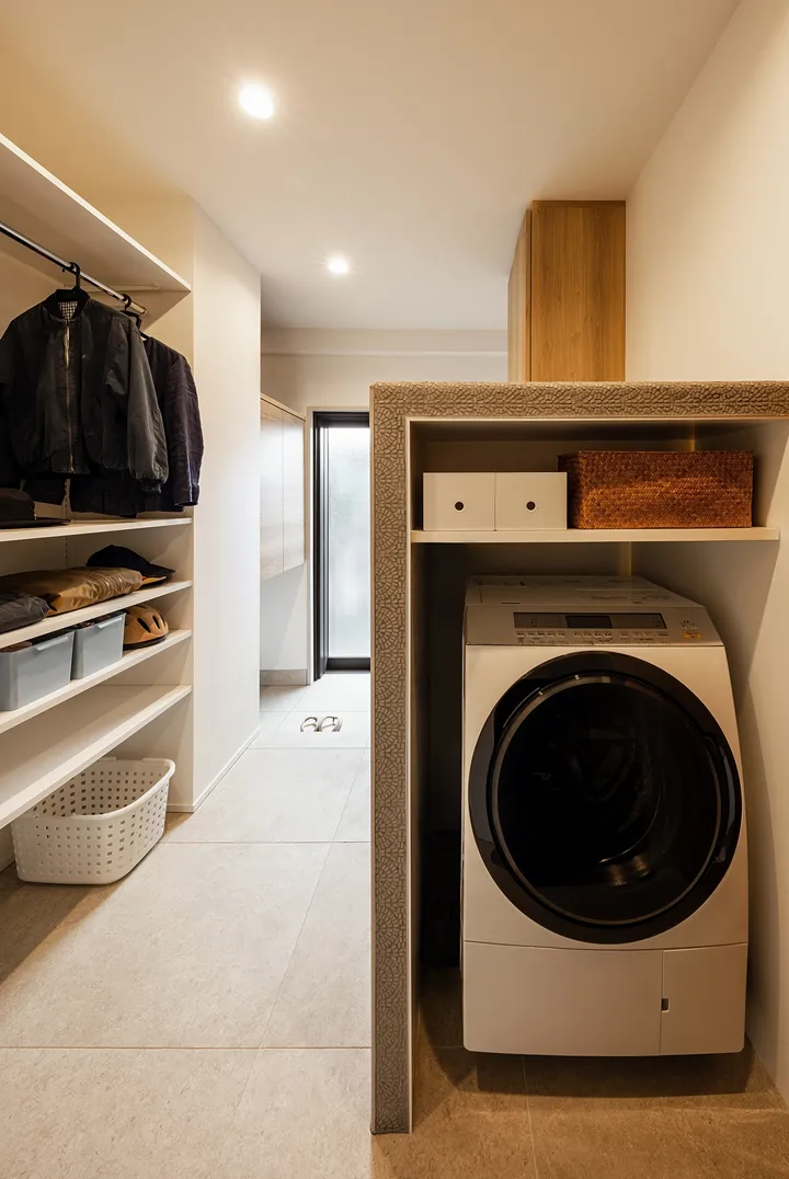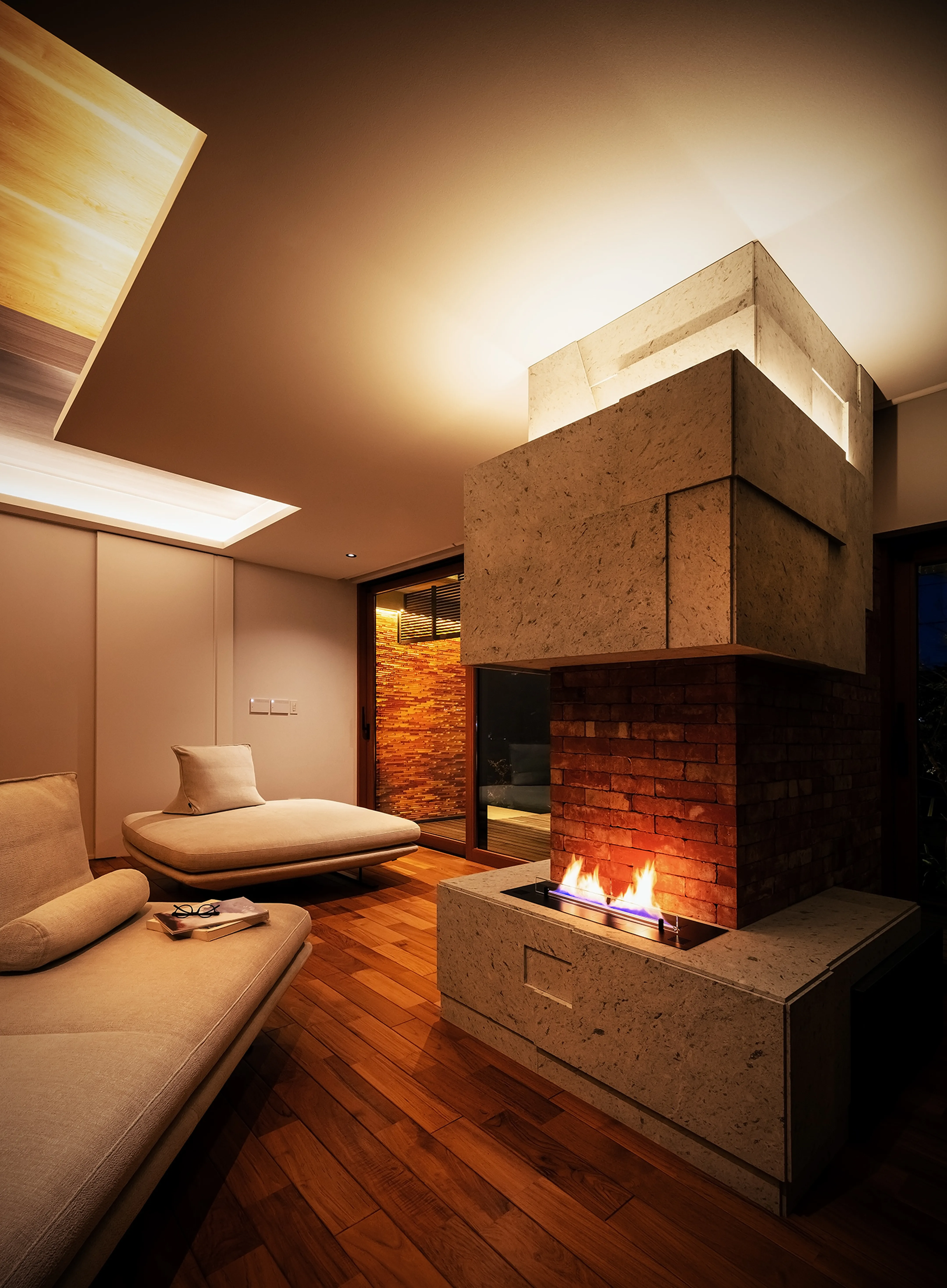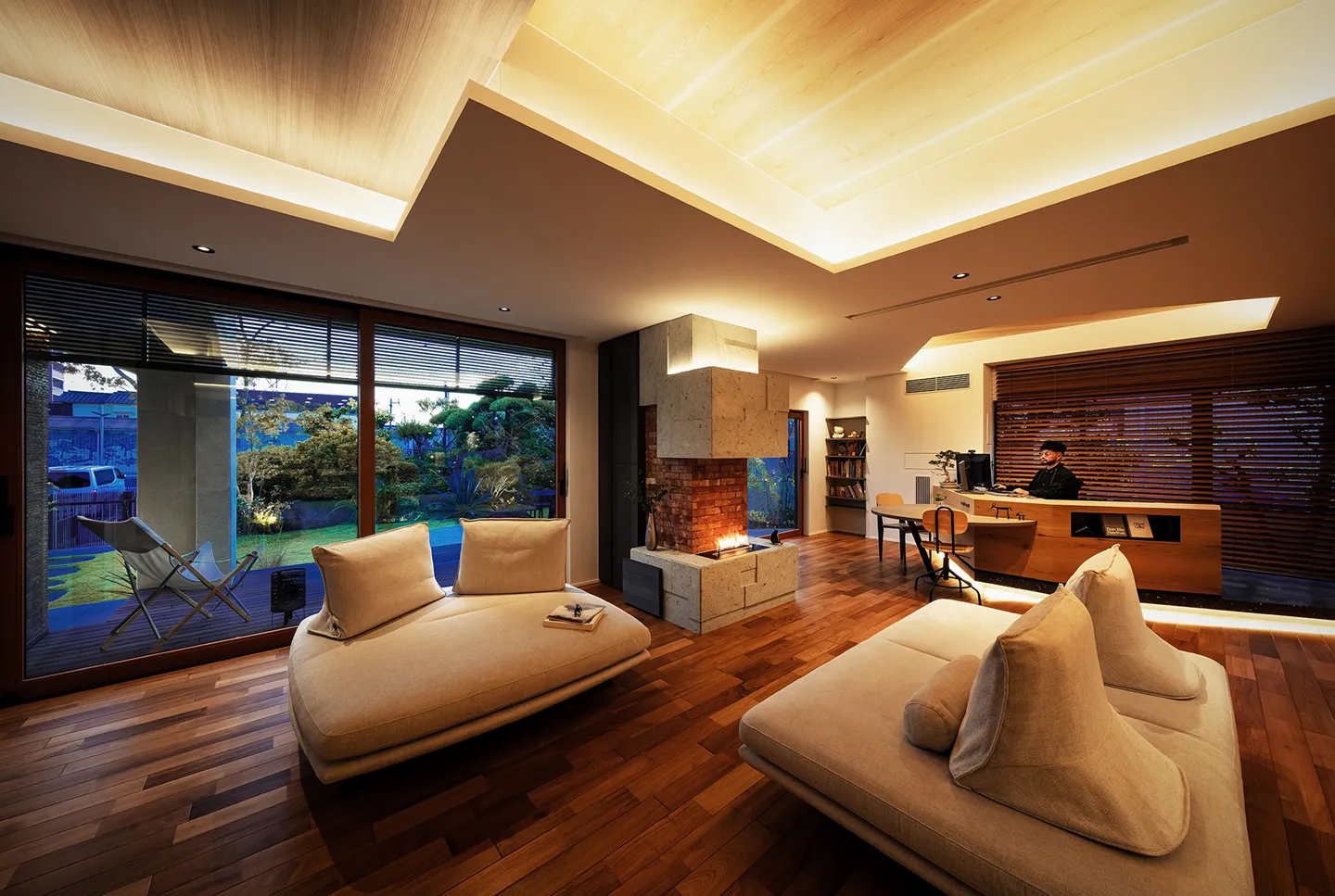The living room is furnished with a bioethanol fireplace and a central sofa. The fireplace produces no soot or smoke, making it easy to enjoy the presence of a hearth. Around it, a sofa with movable backrests allows flexible use—whether facing the flames, the greenery of the garden, or the family gathered in the LDK.