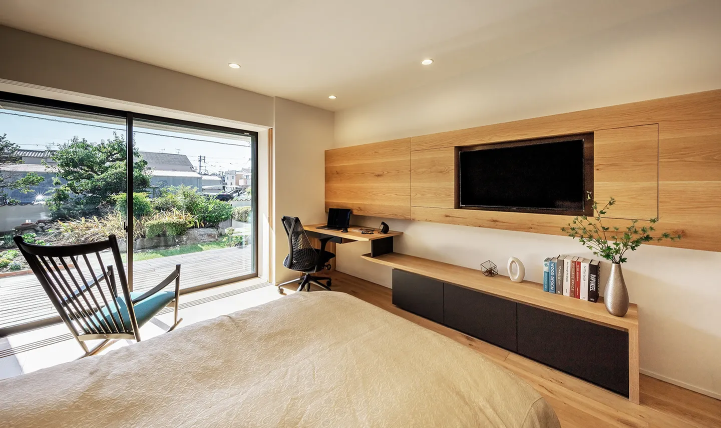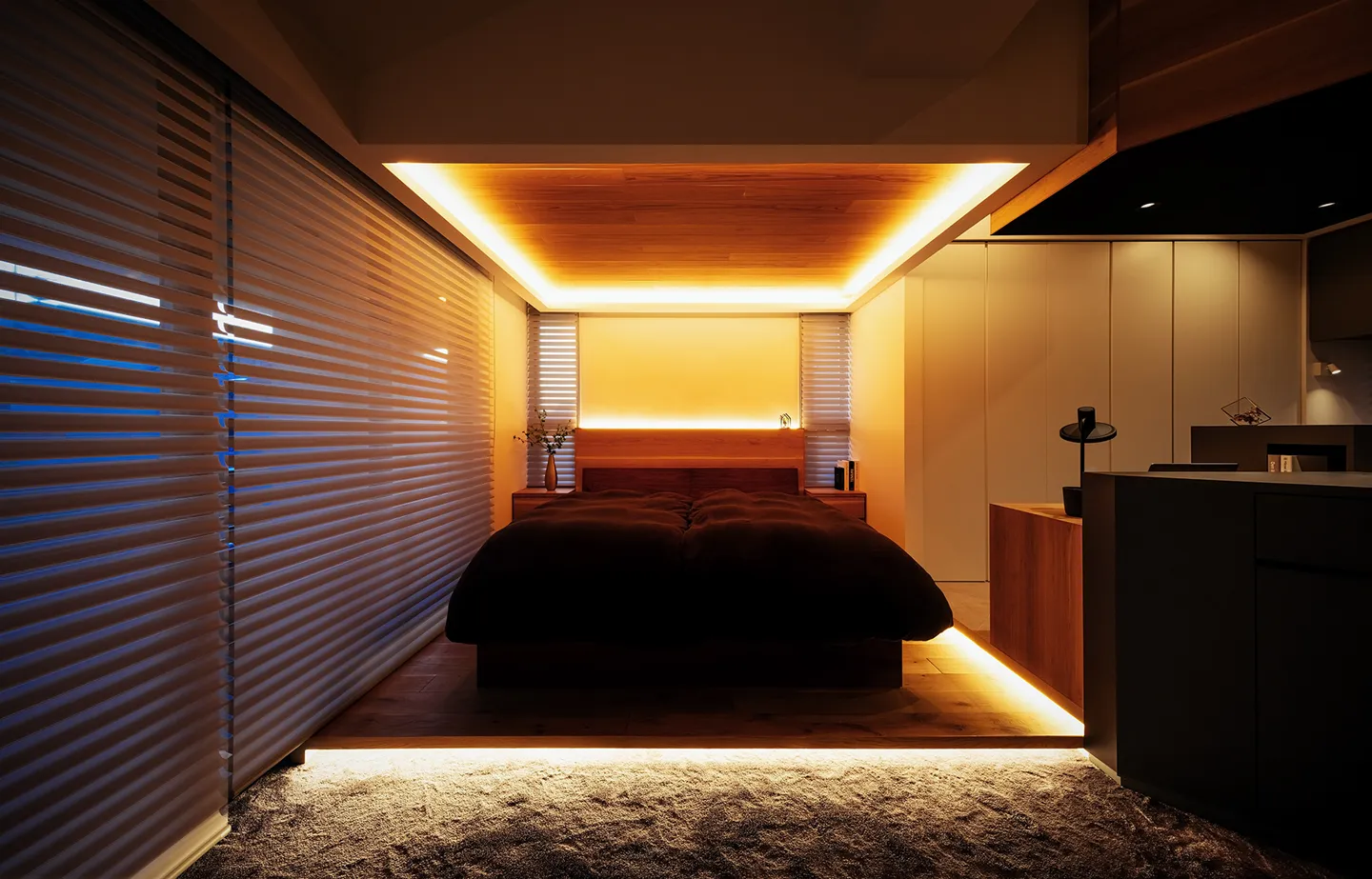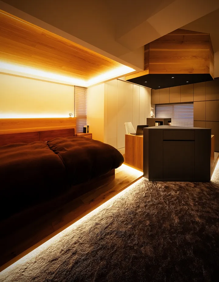 The master bedroom is arranged with a slightly stepped-up bed corner, a study corner, a minibar, and a personal sofa oriented toward the terrace, evoking the feel of a hotel suite.