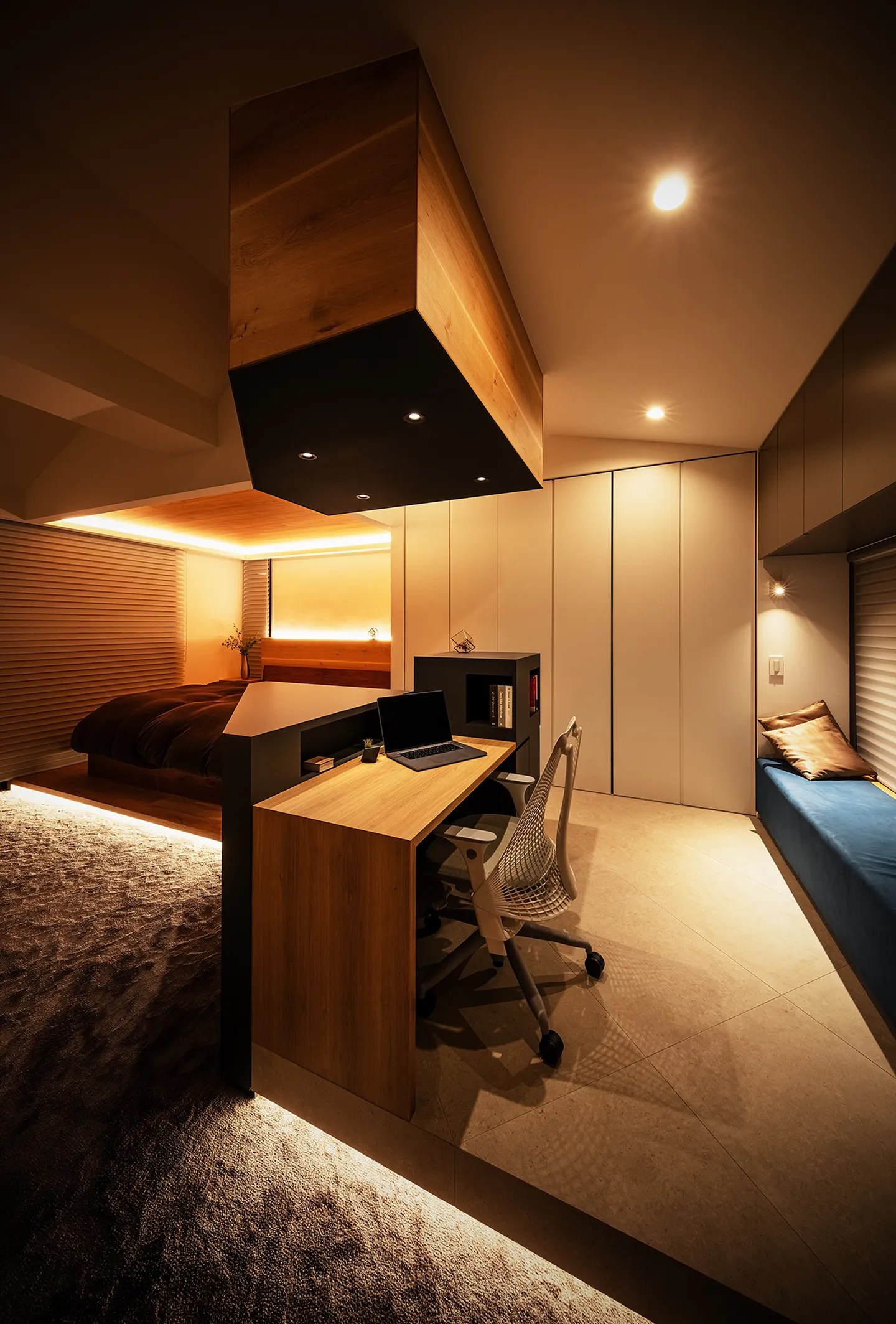 Uncovering hidden volume within the existing roof, the ceiling was raised along its slope—up to about 4 meters—and given a distinctive design. Lowered areas form calm corners for rest and study, while the higher ceiling provides a sense of openness. This variation brings rhythm and subtle zoning to the room.