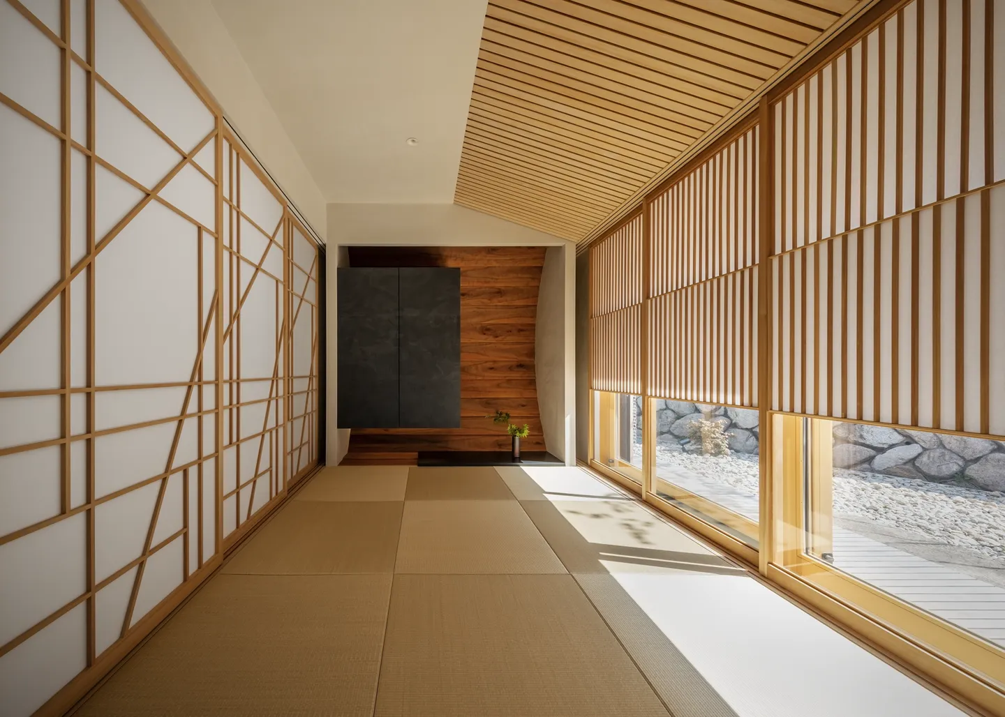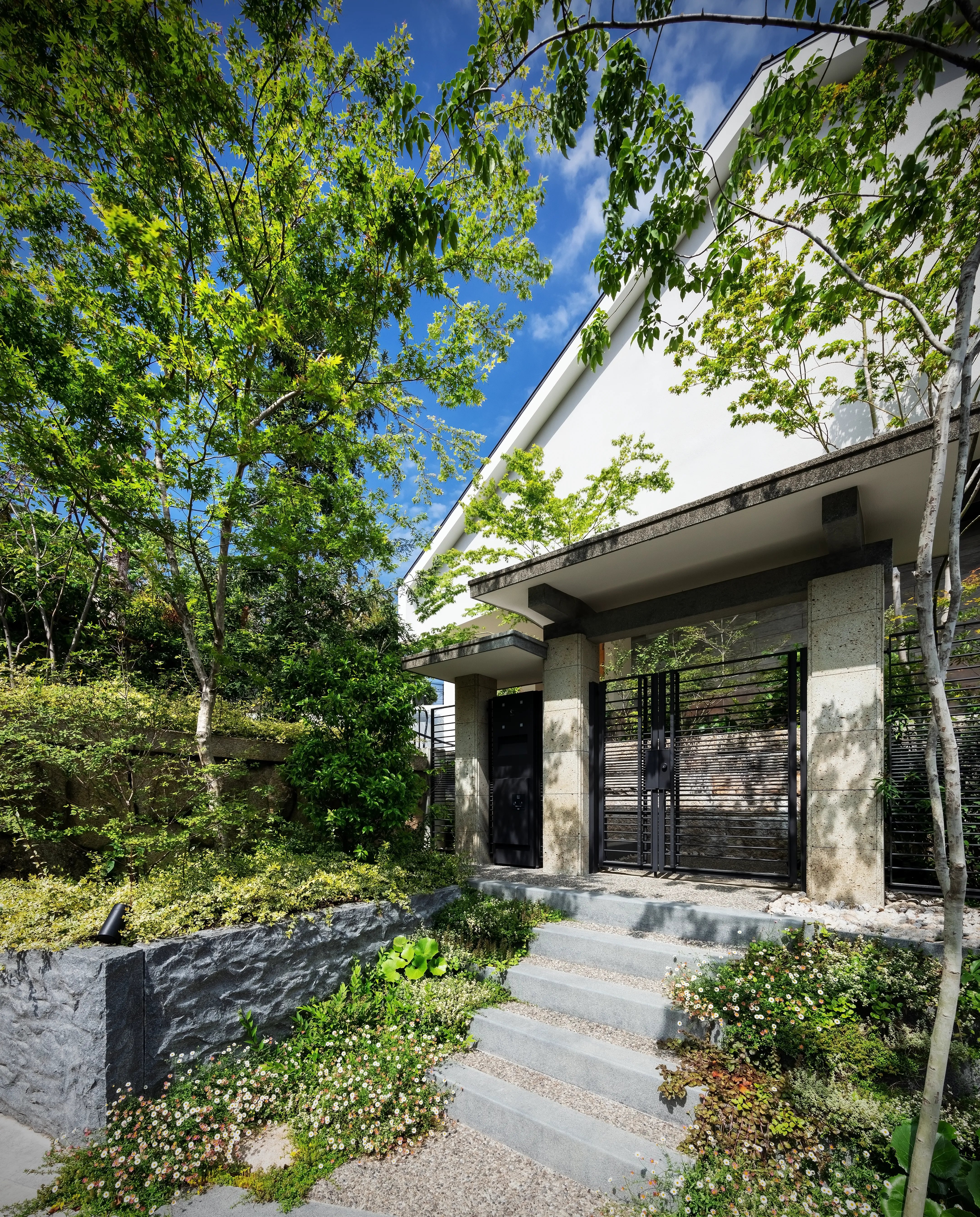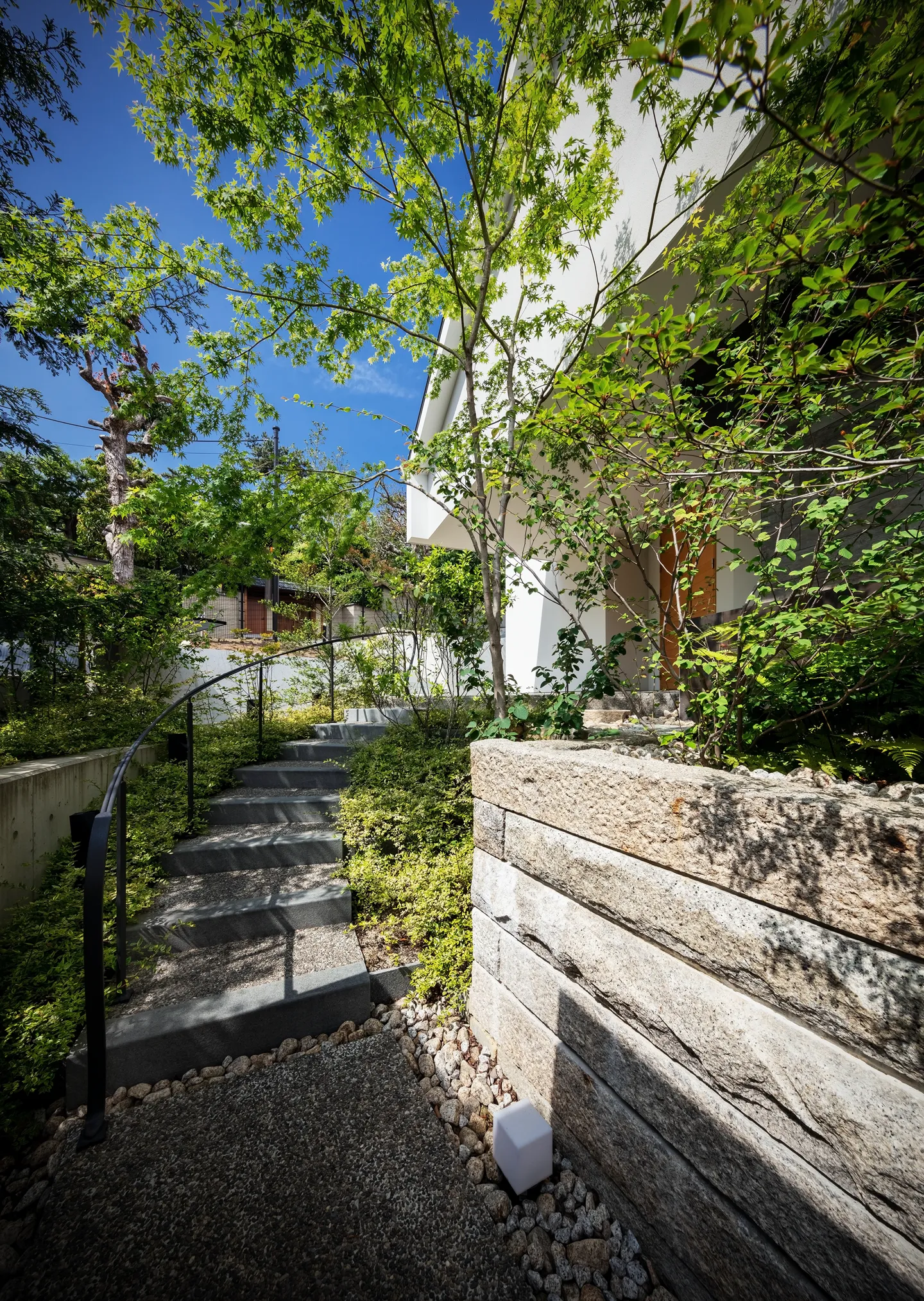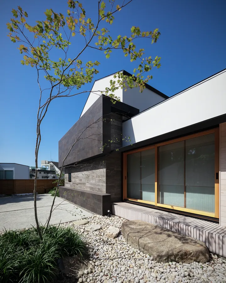 The design inherits and reinterprets the former Japanese garden. The maple trees recall those of the original setting. Against the backdrop of a traditional stone wall, natural stones create subtle undulations in the ground, forming a landscape. From the *washitsu* (Japanese-style tatami room), framed by *yukimi shoji* (sliding paper doors with a low viewing panel), one can enjoy the landscape along with the silhouettes of maple leaves cast by moonlight.