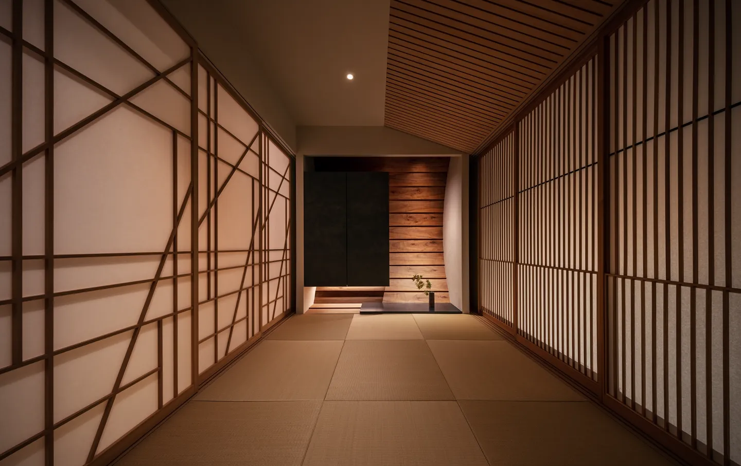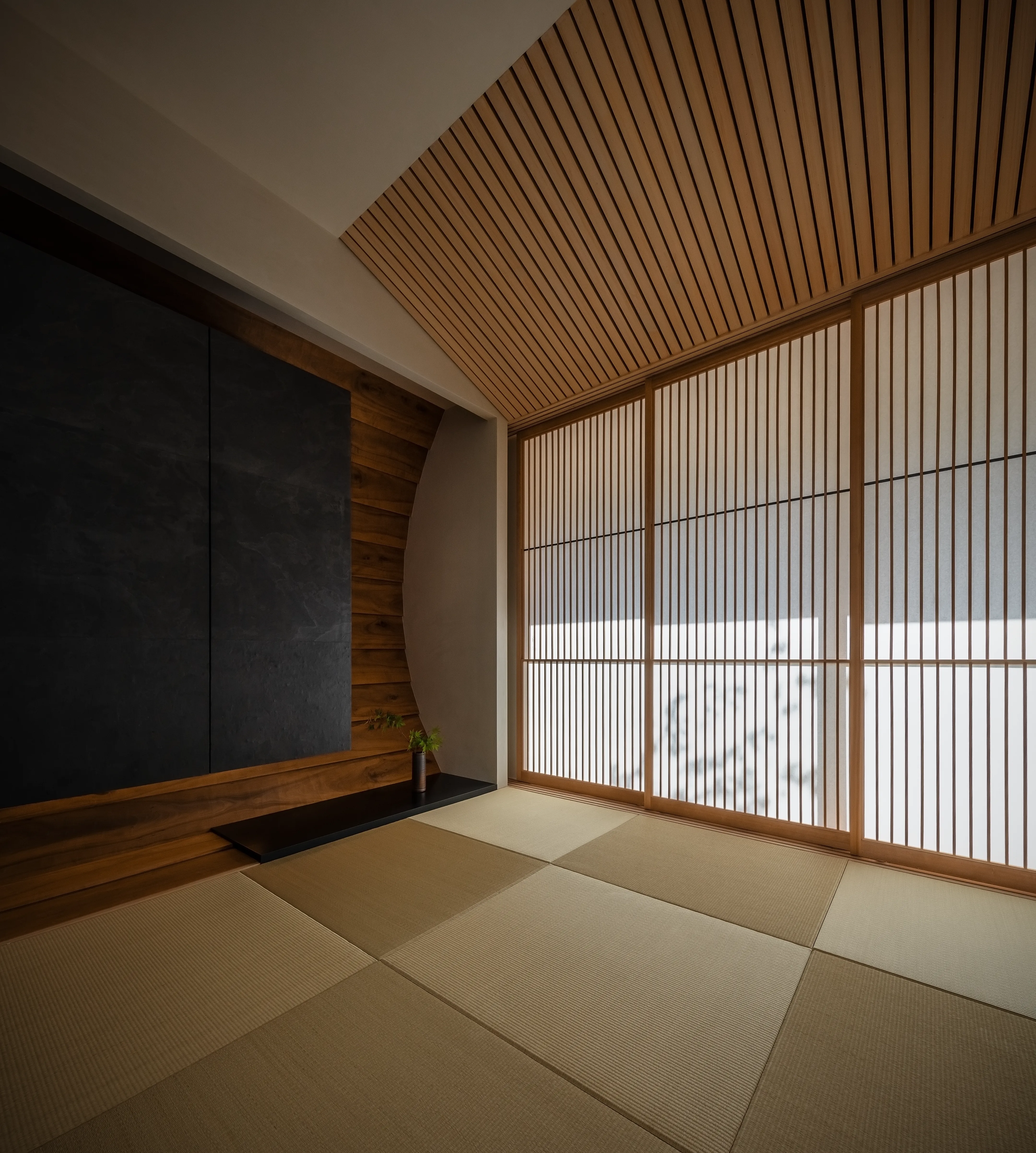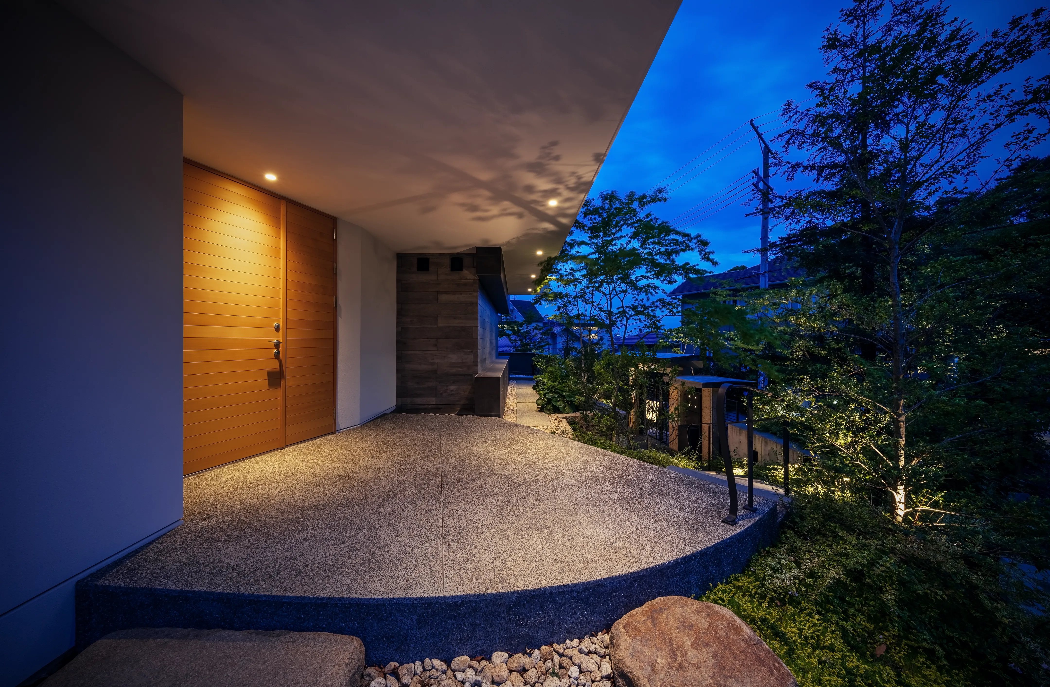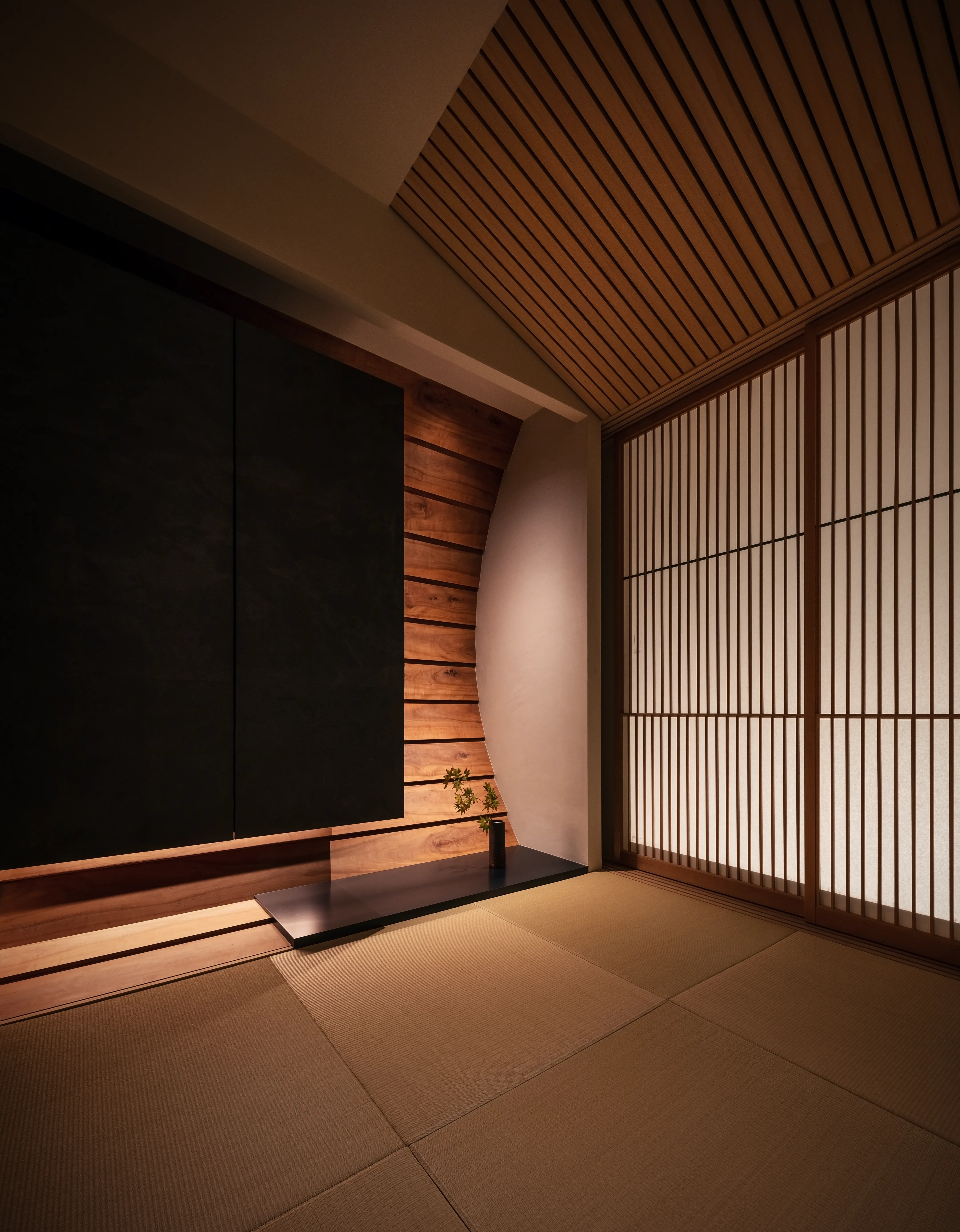 The design inherits and reinterprets the former Japanese garden. The maple trees recall those of the original setting. Against the backdrop of a traditional stone wall, natural stones create subtle undulations in the ground, forming a landscape. From the *washitsu* (Japanese-style tatami room), framed by *yukimi shoji* (sliding paper doors with a low viewing panel), one can enjoy the landscape along with the silhouettes of maple leaves cast by moonlight.