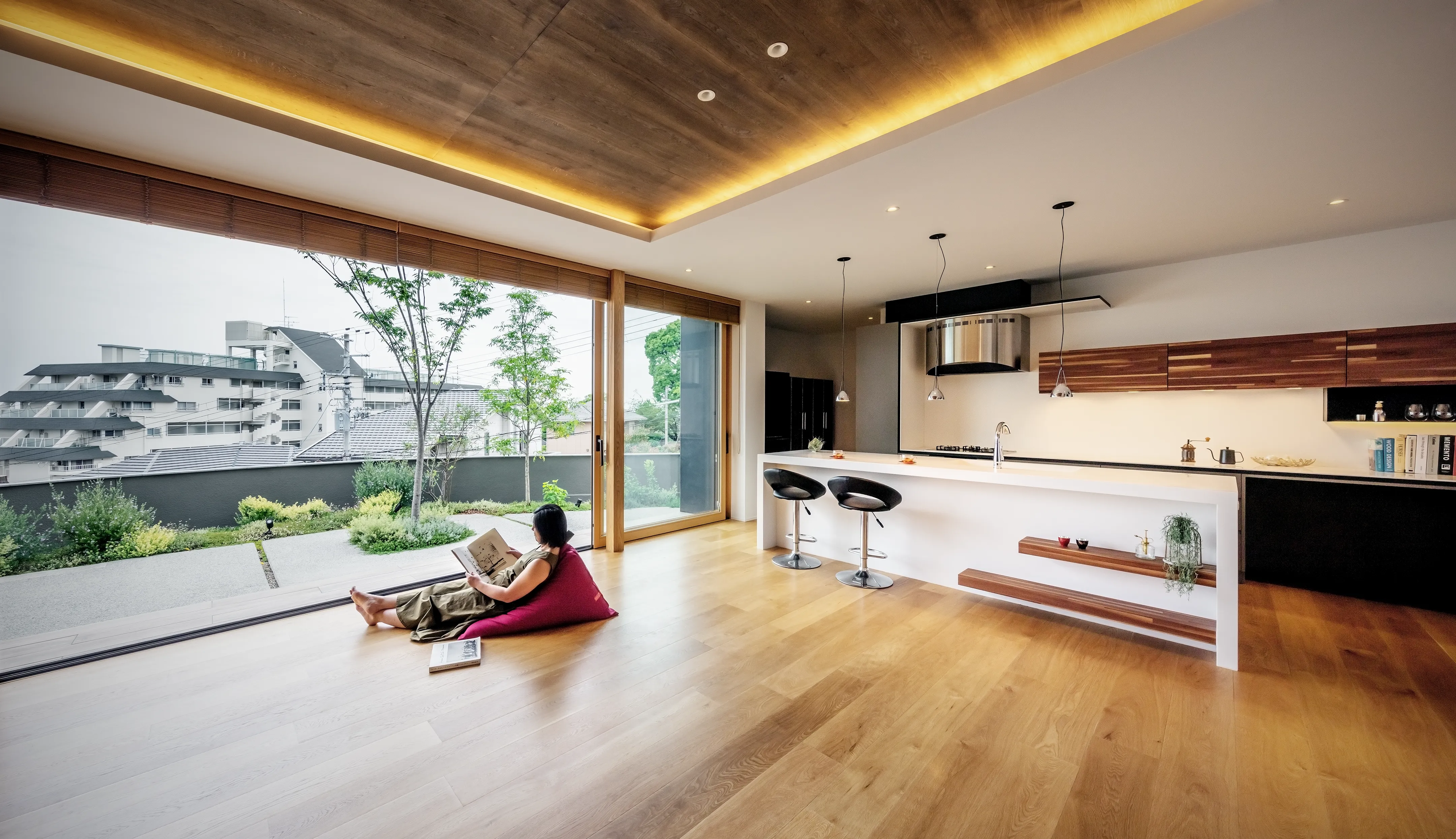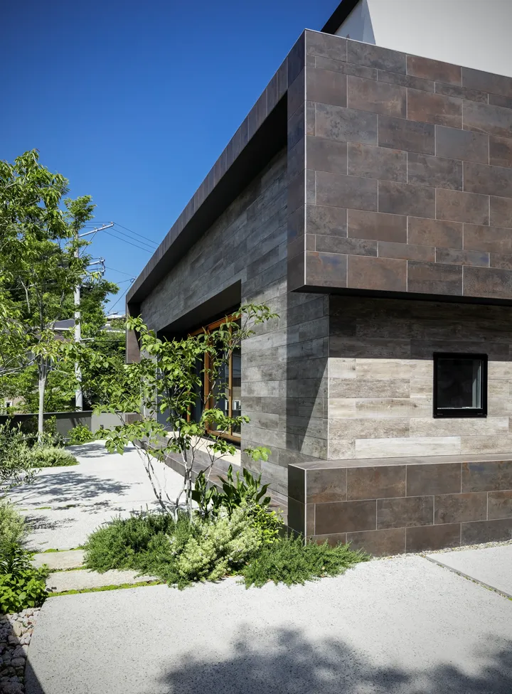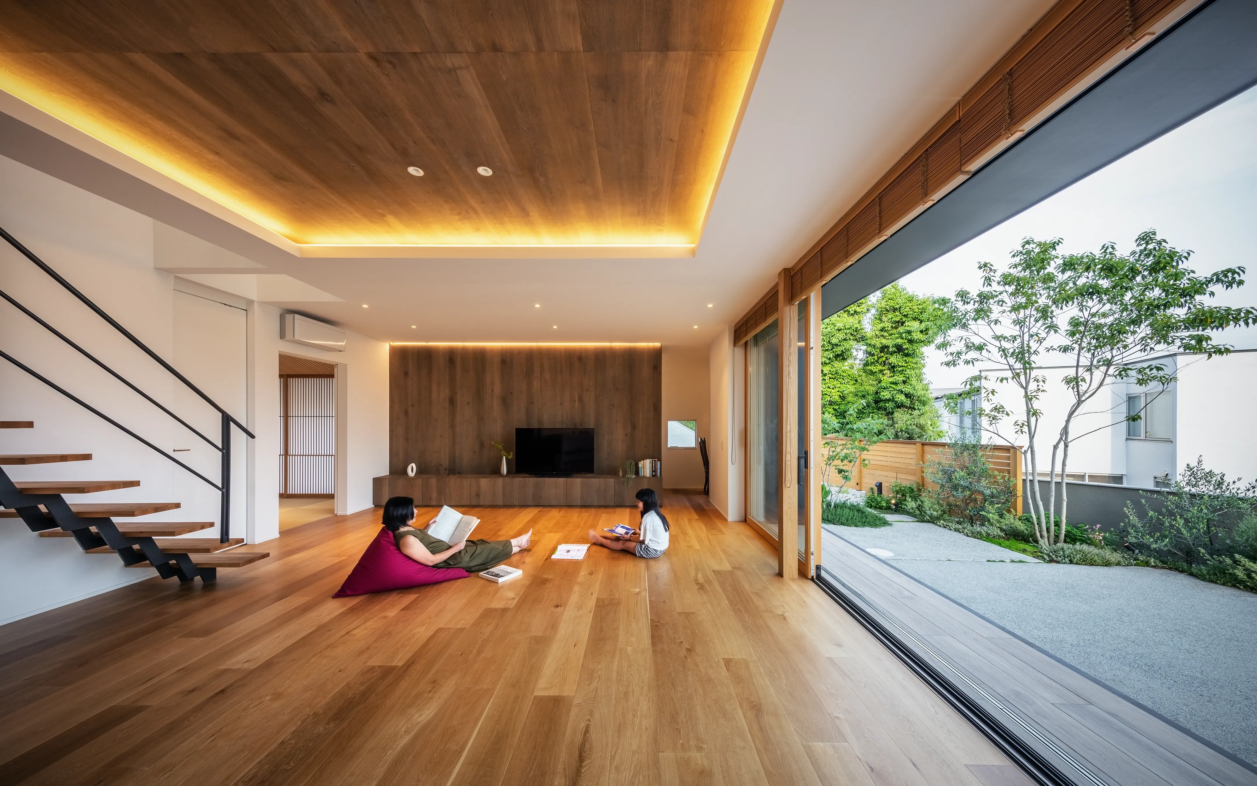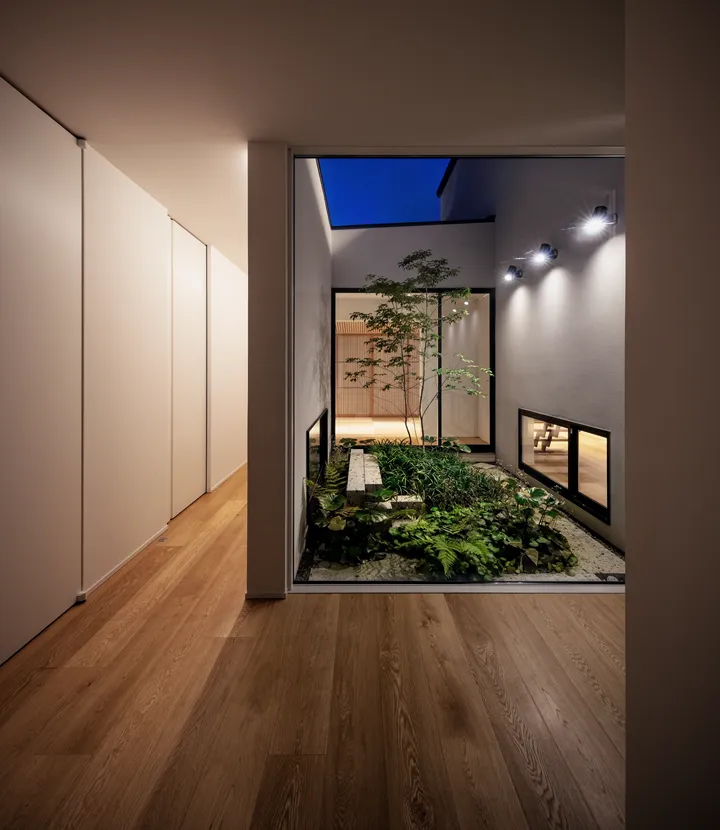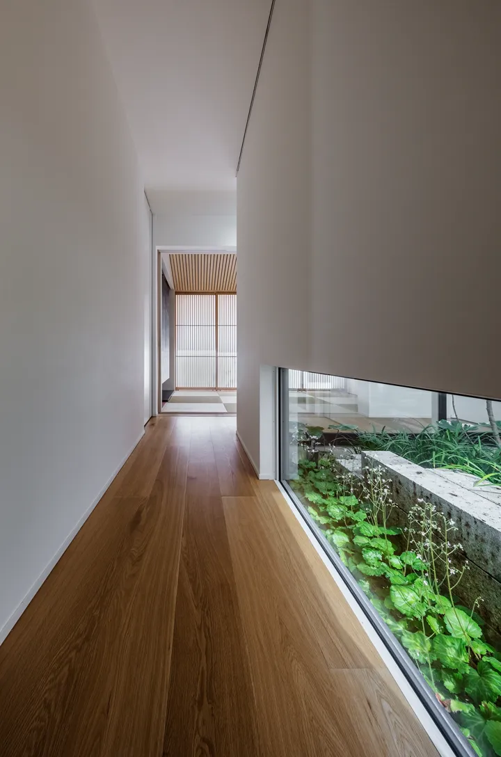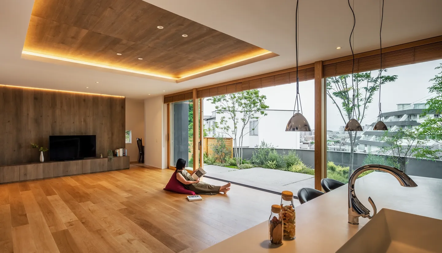 Located directly in front of the LDK, this garden connects seamlessly through a large wooden sash opening measuring 7.3 m × 2.6 m high. It creates a space that naturally invites one outdoors, where breezes pass through and distant sea views open up.