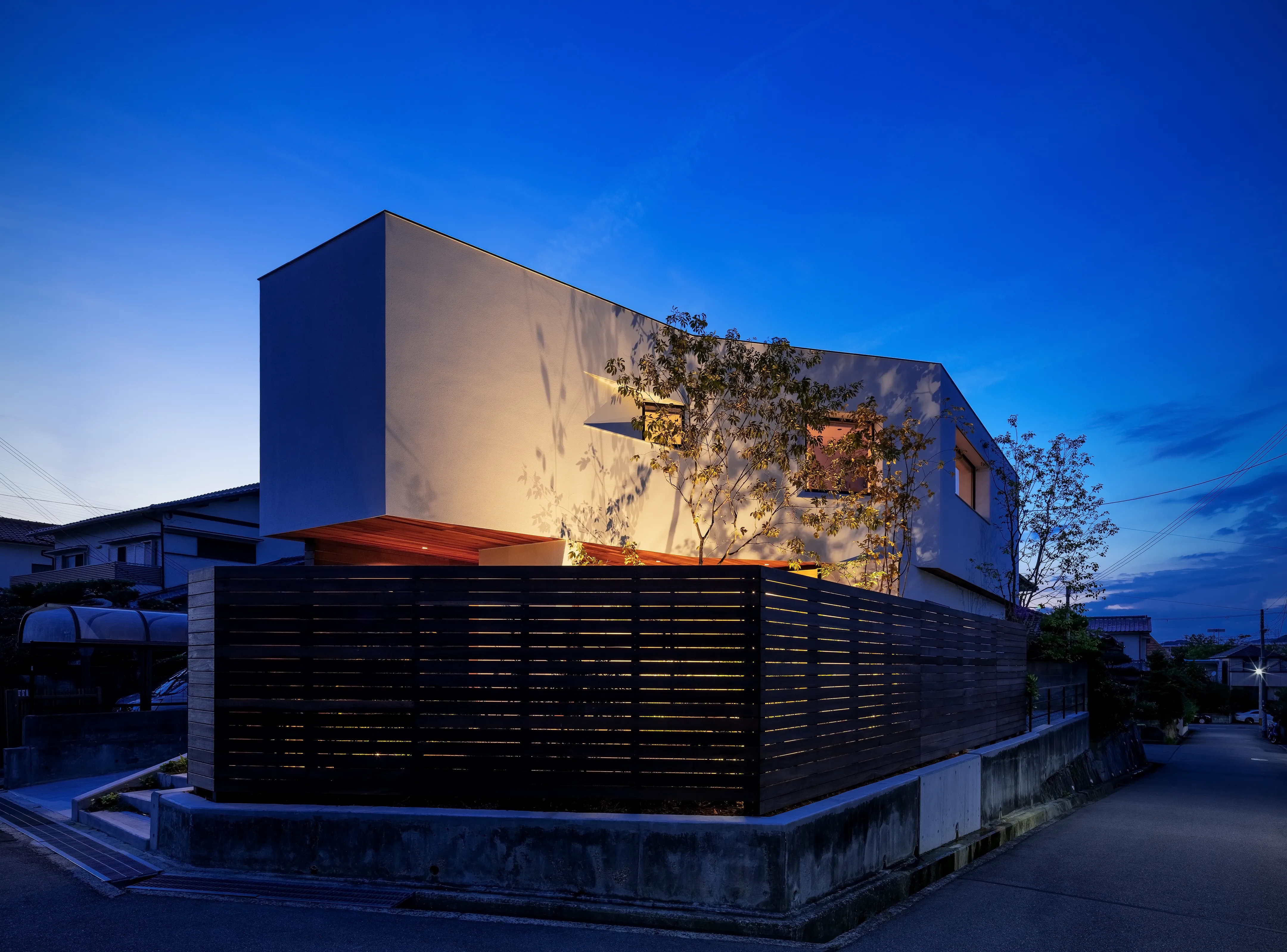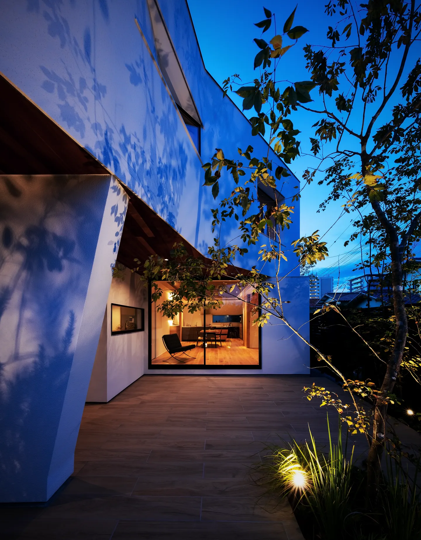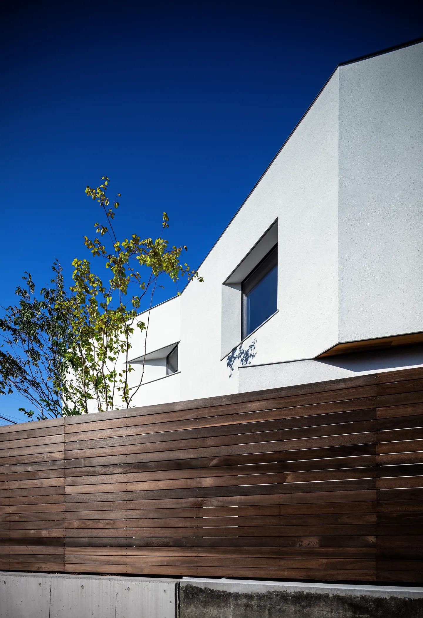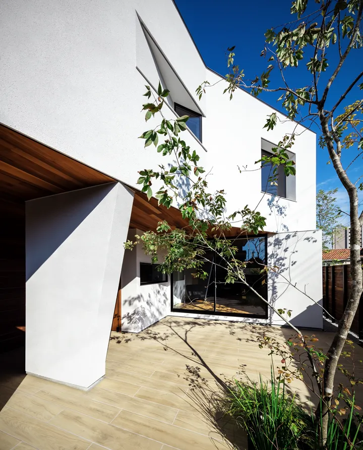 The front yard is closed to the west to block the strong western sun, and opened toward the southeast to capture morning light and the open sky. A broad roof (the 2F volume) extends diagonally above, allowing the space to serve as an outdoor living room.
