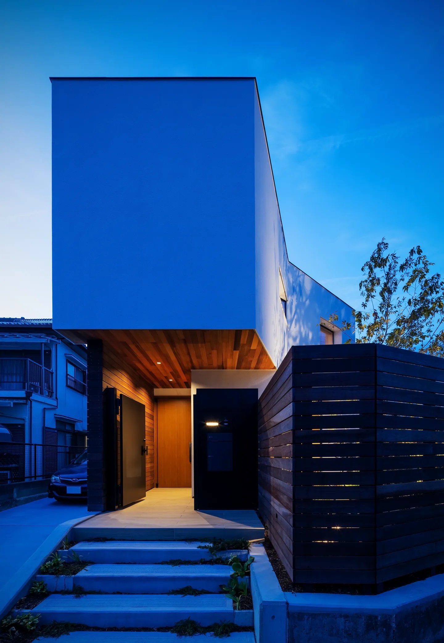 Arriving home, one ascends five broad steps, passes through a tall, auto-lock sliding gate, and is welcomed into a front yard furnished with outdoor furniture. The arrangement allows for natural interaction, where family members can wave farewell from the LDK windows or greet returning ones as they arrive.