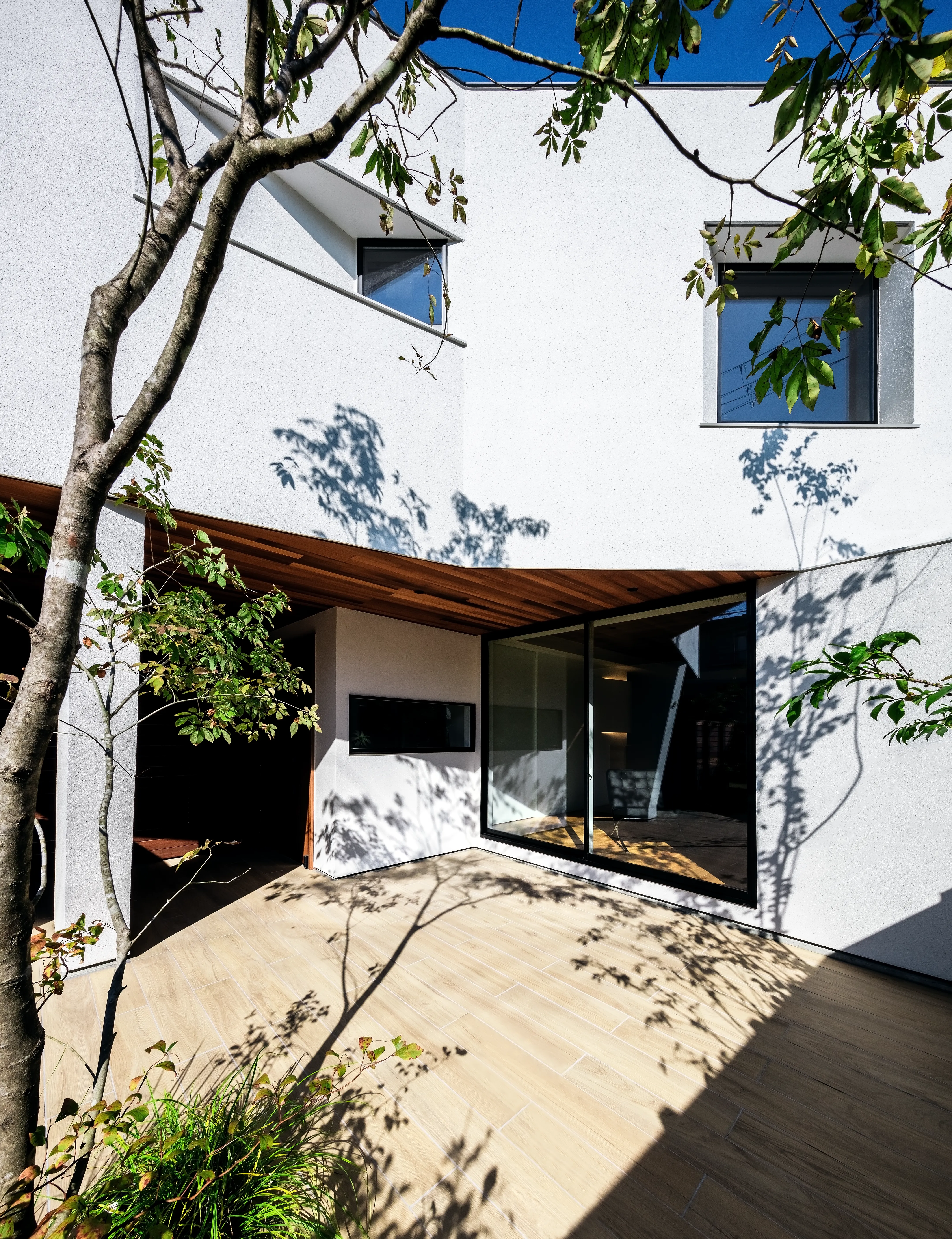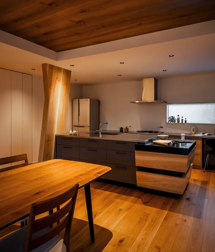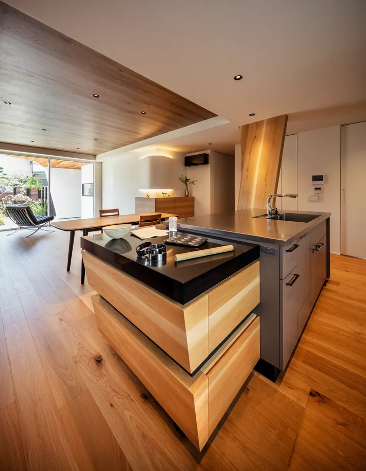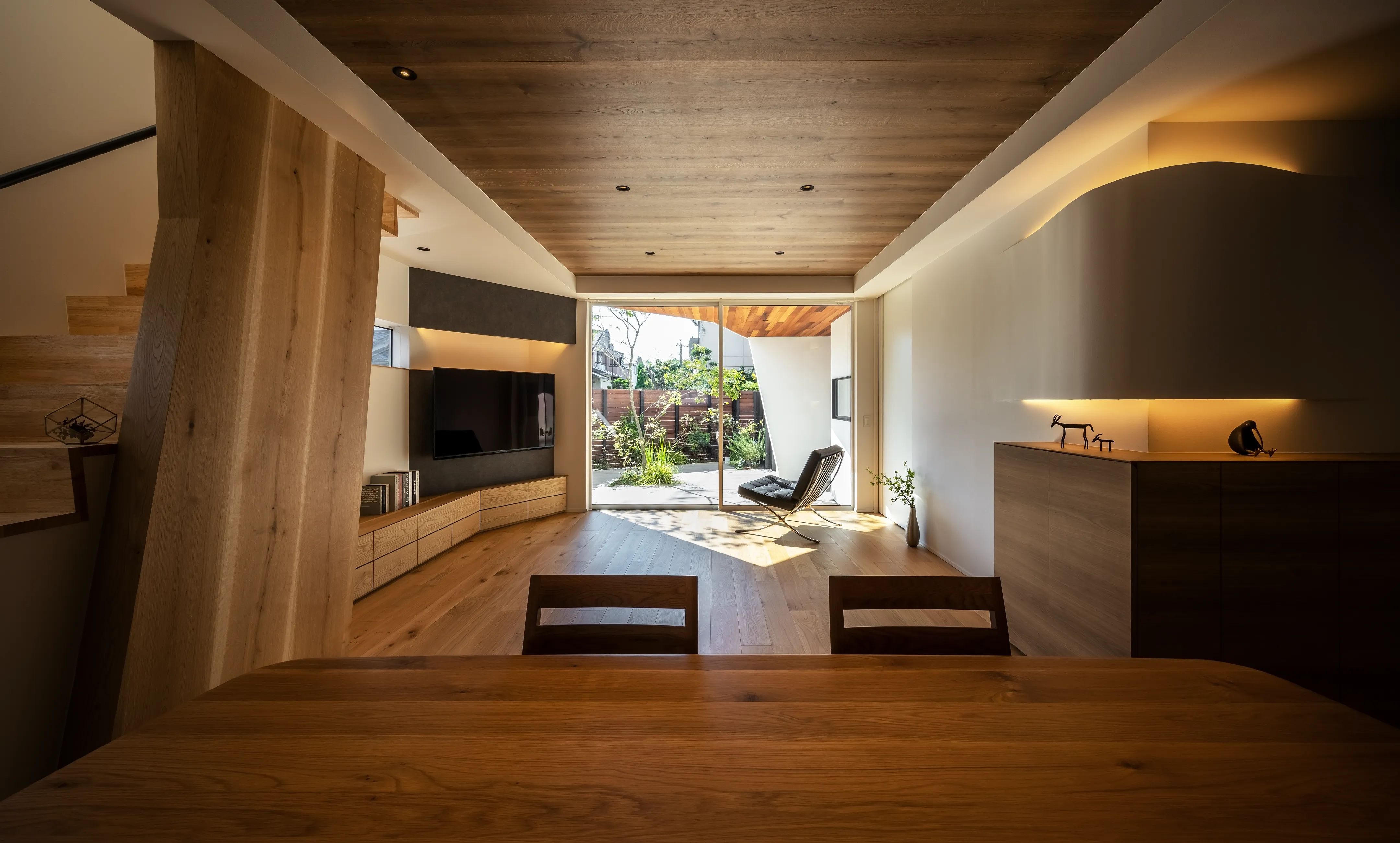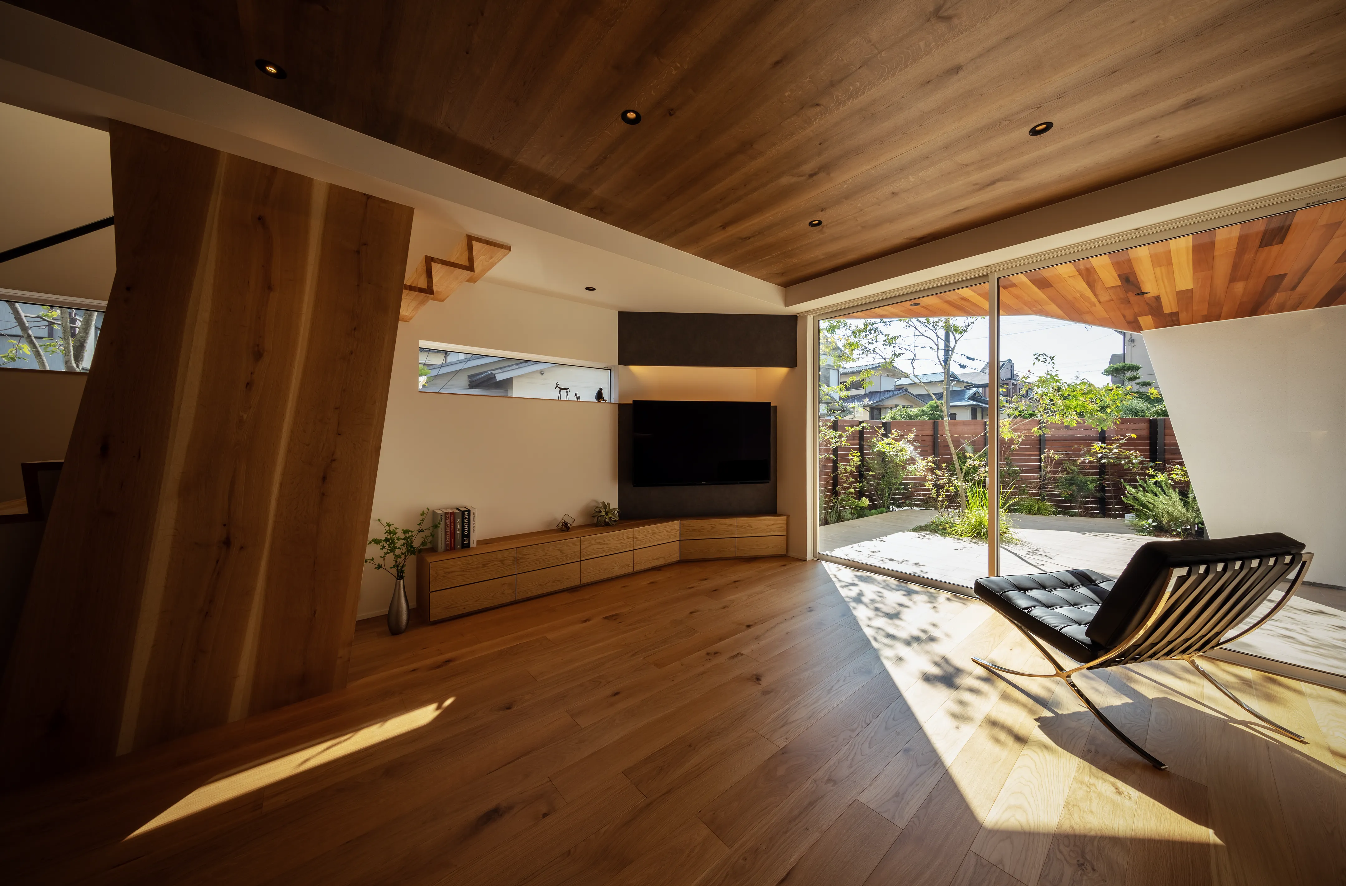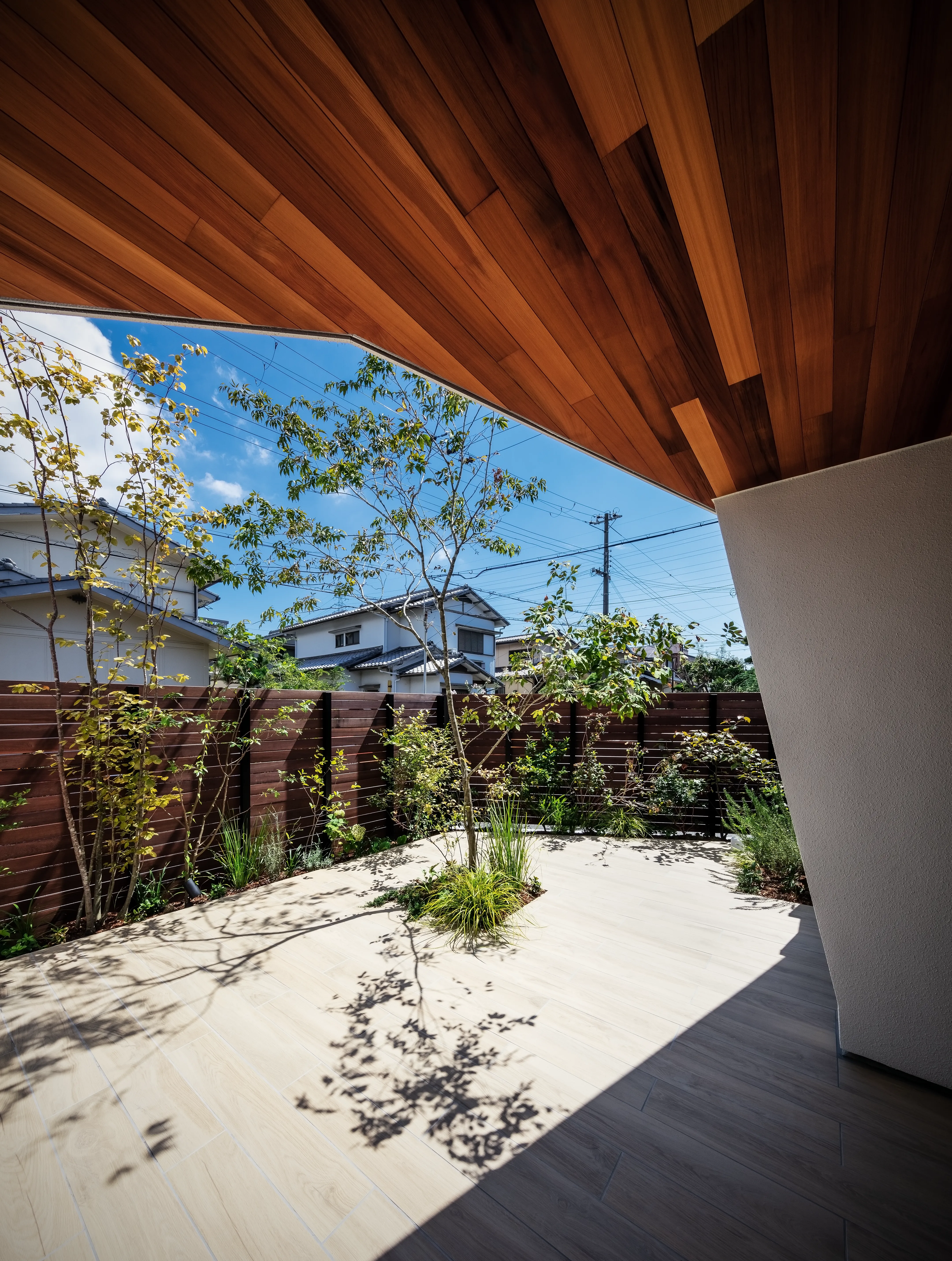 The theme is the “Front Yard House.” Benefiting from abundant sunlight and privacy created by the level difference, the south side was made into a front yard. This allowed for a compact building footprint while placing the elements most efficiently. The front yard is partially covered, conceived not as a garden to be merely viewed but as an “outdoor living room” of 28-tatami, directly connected to the 28-tatami living-dining-kitchen (LDK). Together they form a 56-tatami space that extends daily living outward.