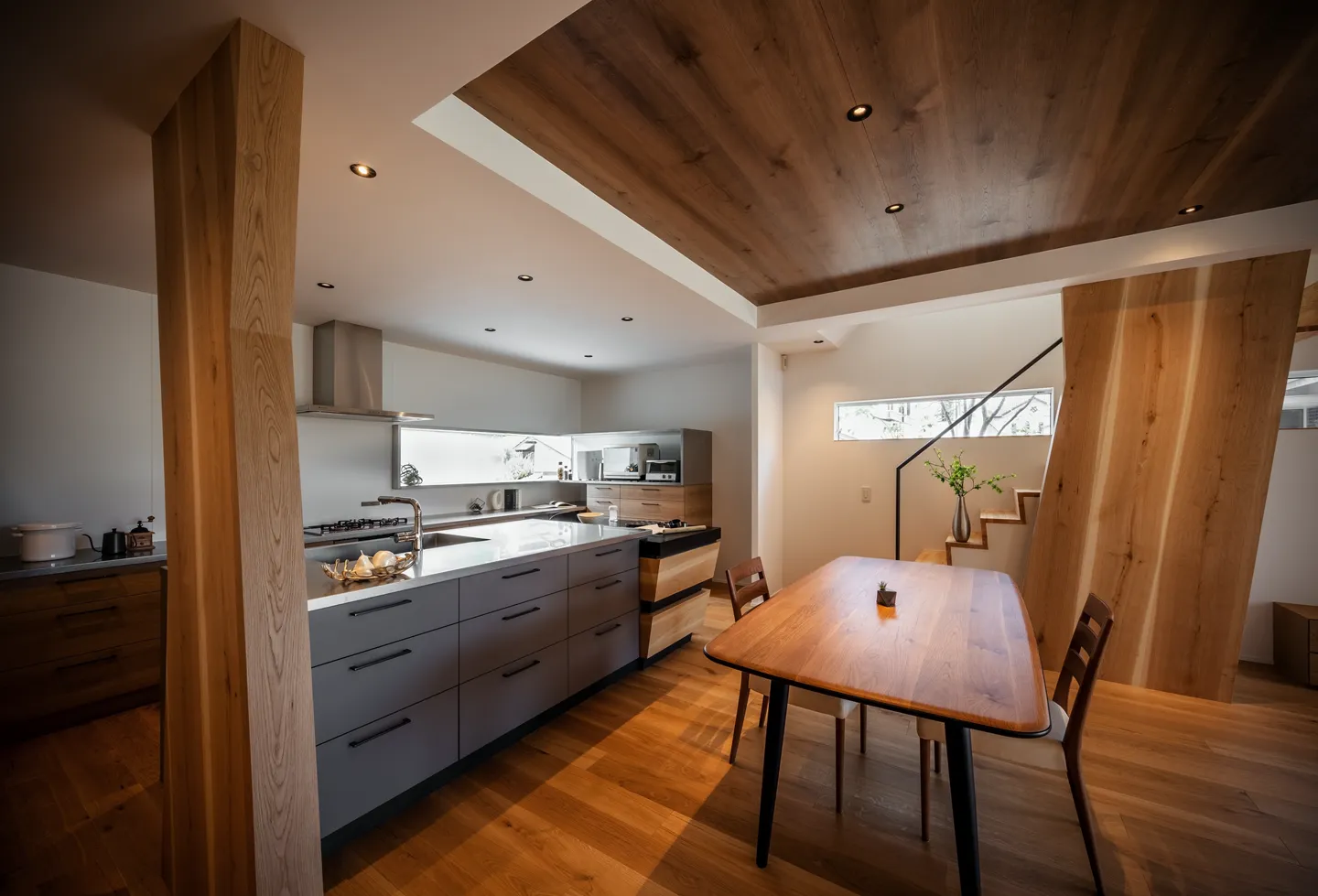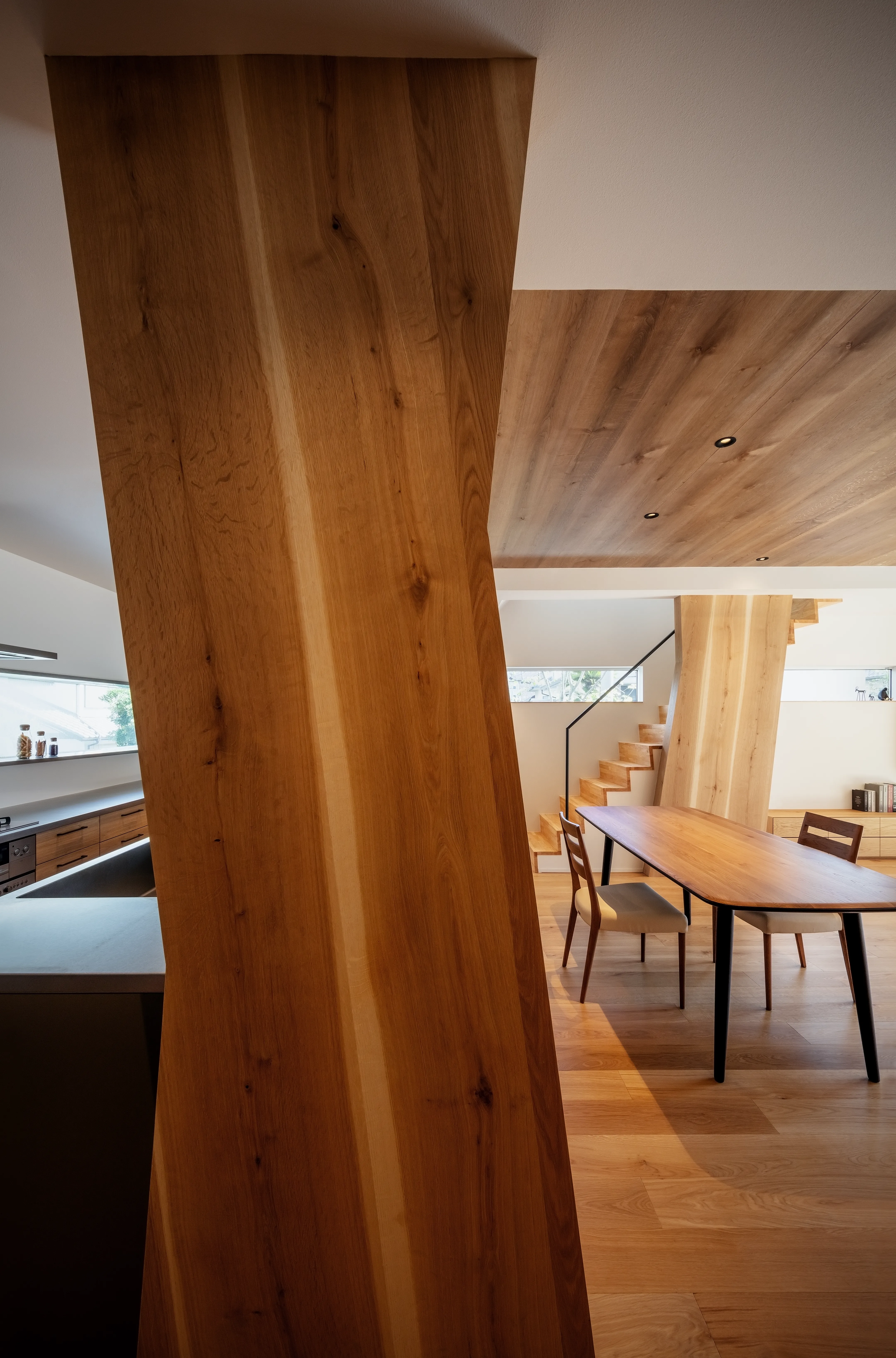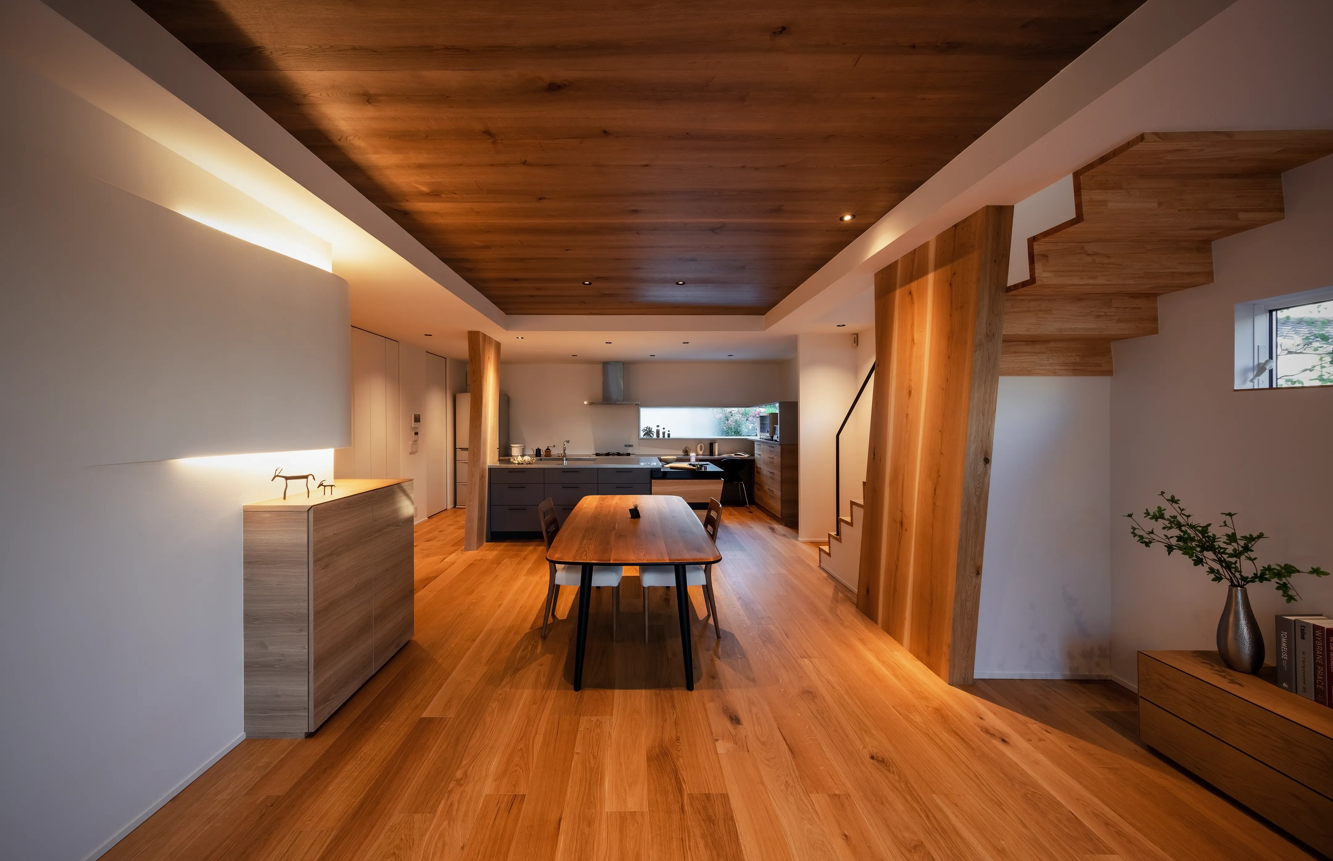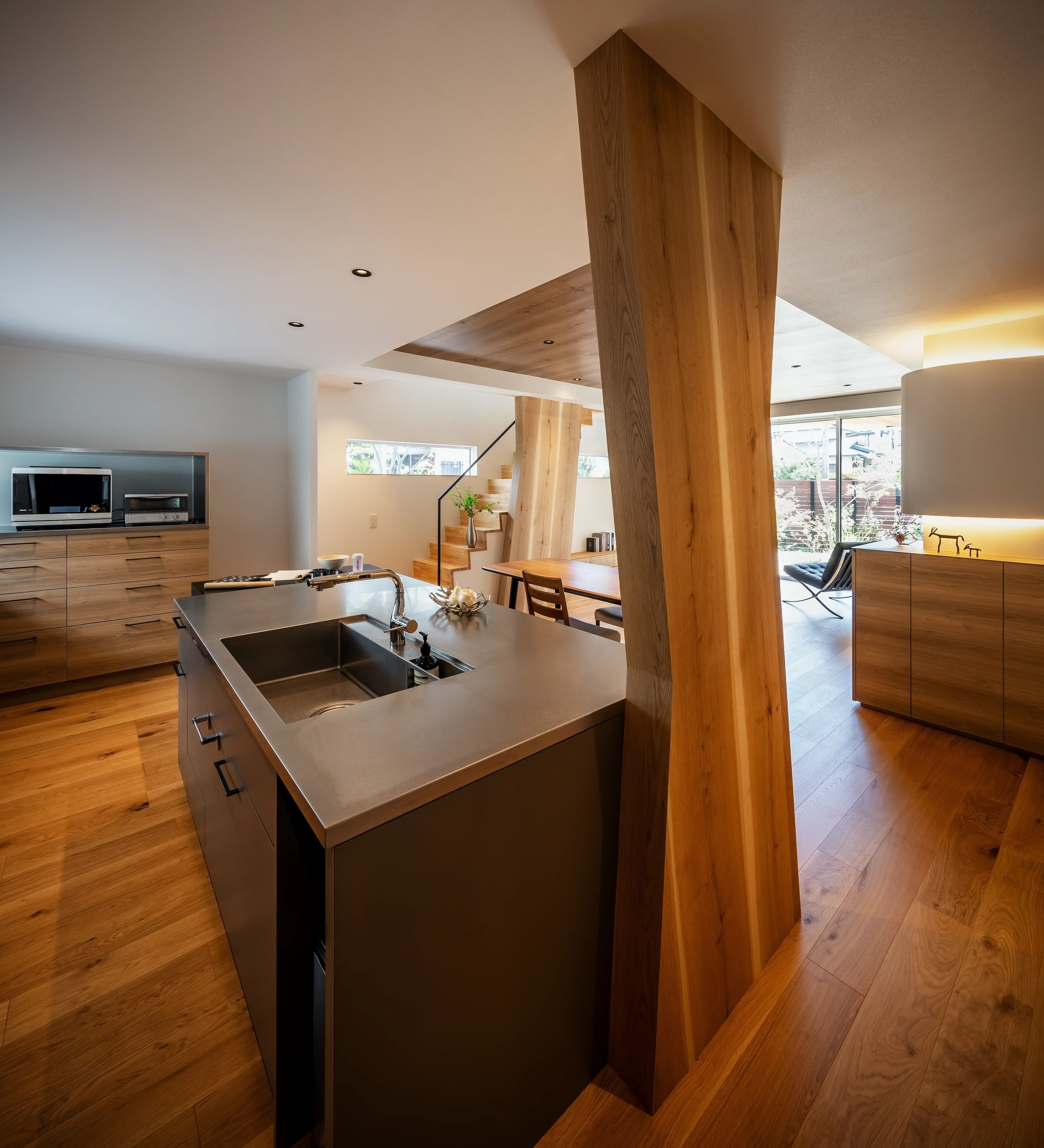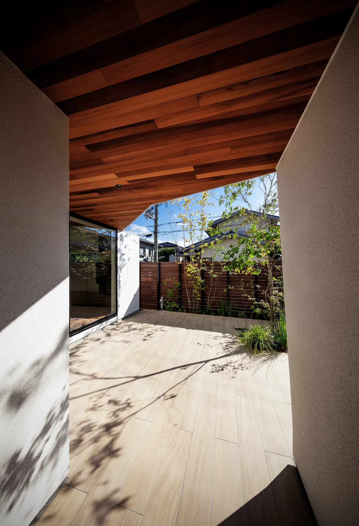 The theme is the “Front Yard House.” Benefiting from abundant sunlight and privacy created by the level difference, the south side was made into a front yard. This allowed for a compact building footprint while placing the elements most efficiently. The front yard is partially covered, conceived not as a garden to be merely viewed but as an “outdoor living room” of 28-tatami, directly connected to the 28-tatami living-dining-kitchen (LDK). Together they form a 56-tatami space that extends daily living outward.