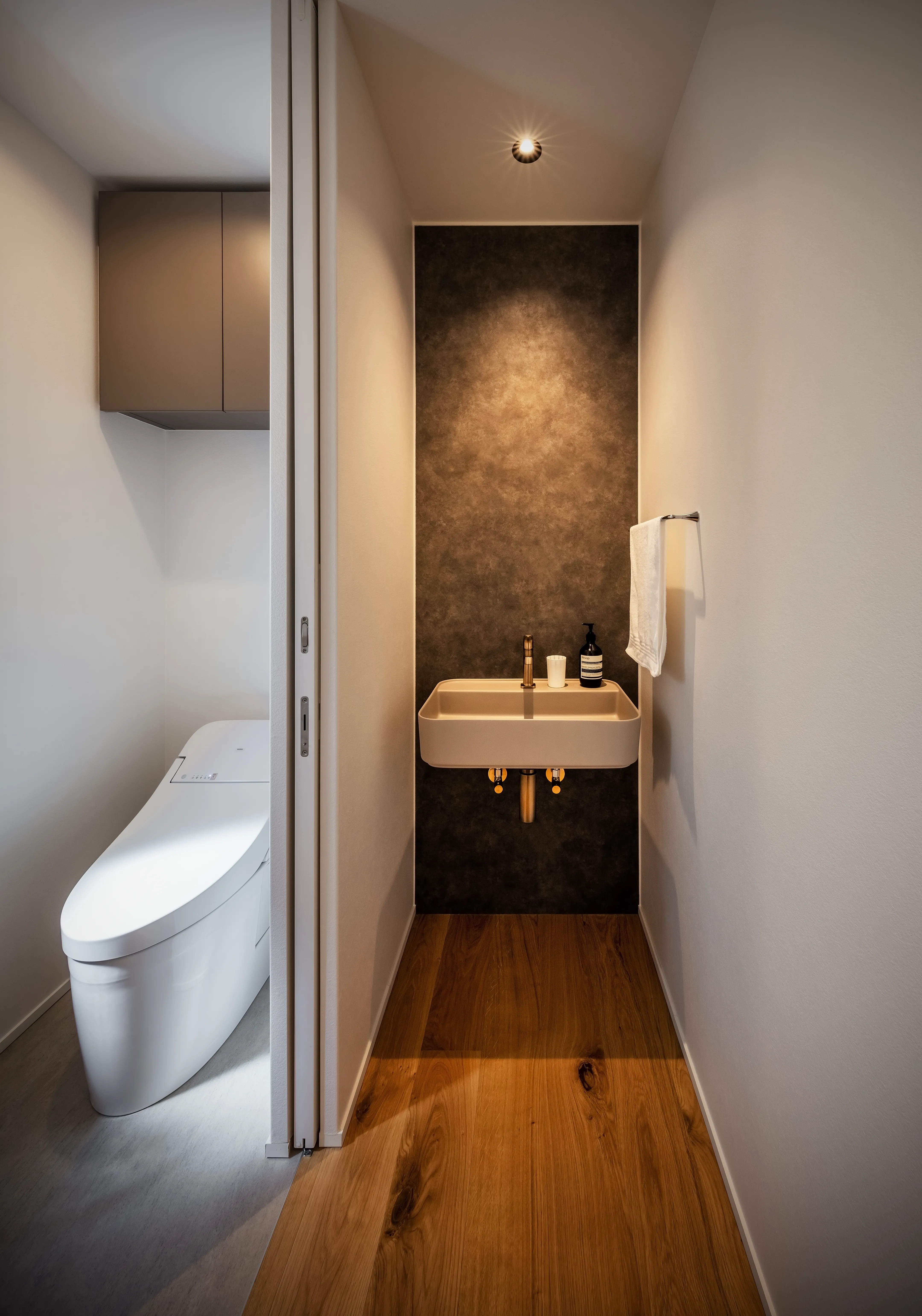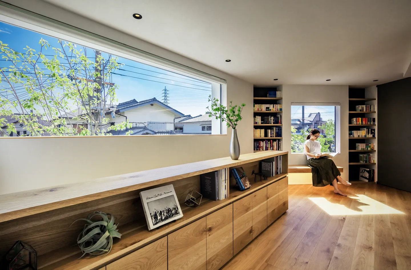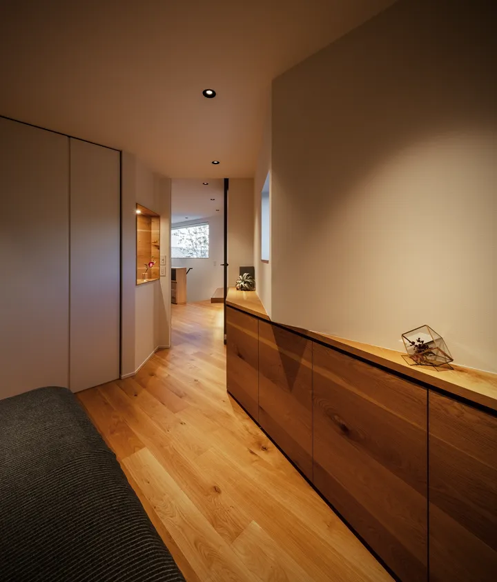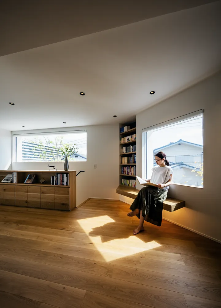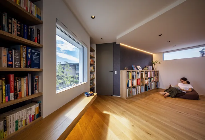 Given the size of the house, corridors were unavoidable. To avoid long, dark hallways, the 2F stair hall and a future private room were connected and appointed as a library. This creates an open and engaging space at the daily point of passage, rather than a storage-only room. The plan anticipates that, even if the room is enclosed as a bedroom in the future, the reduced library will remain functional.
