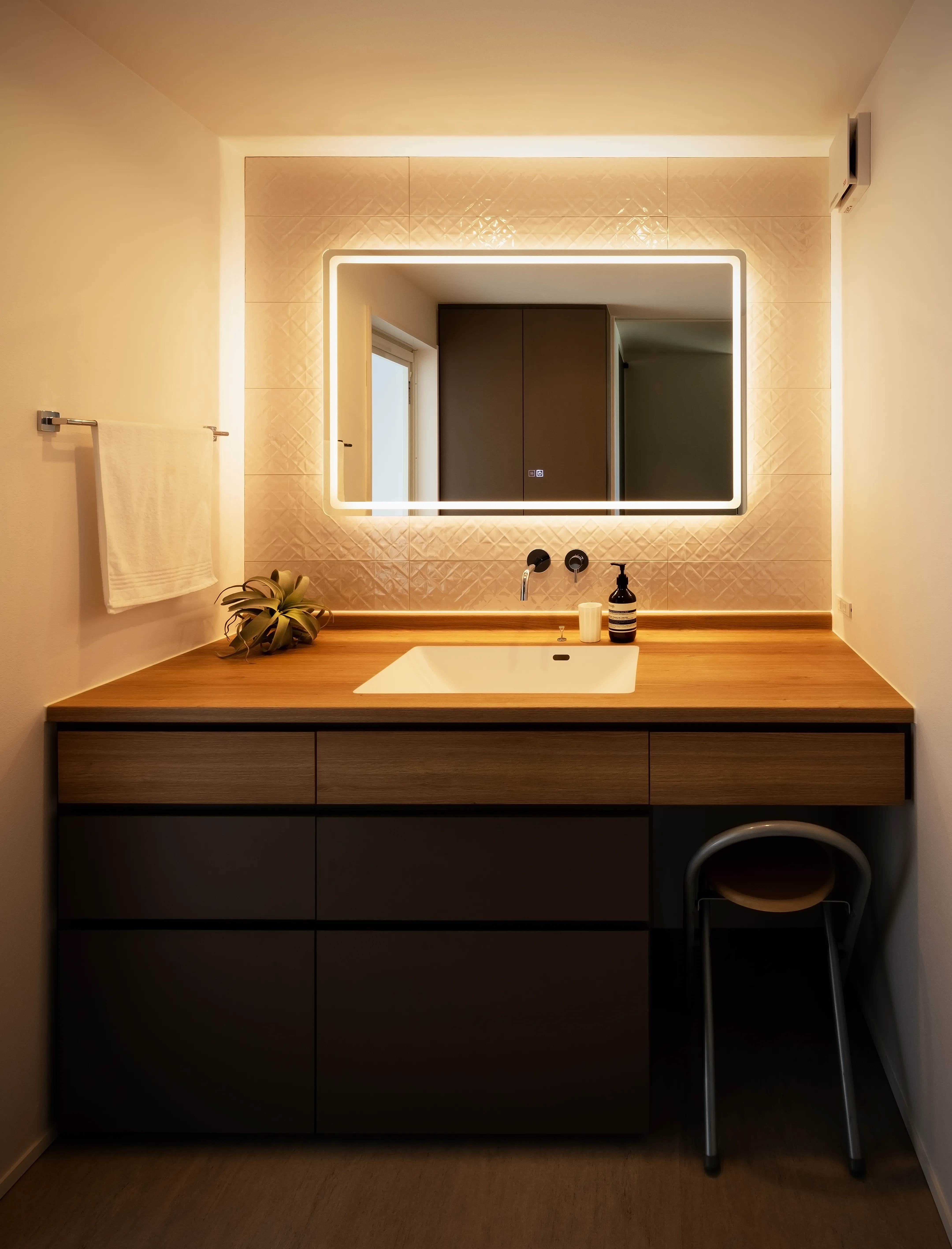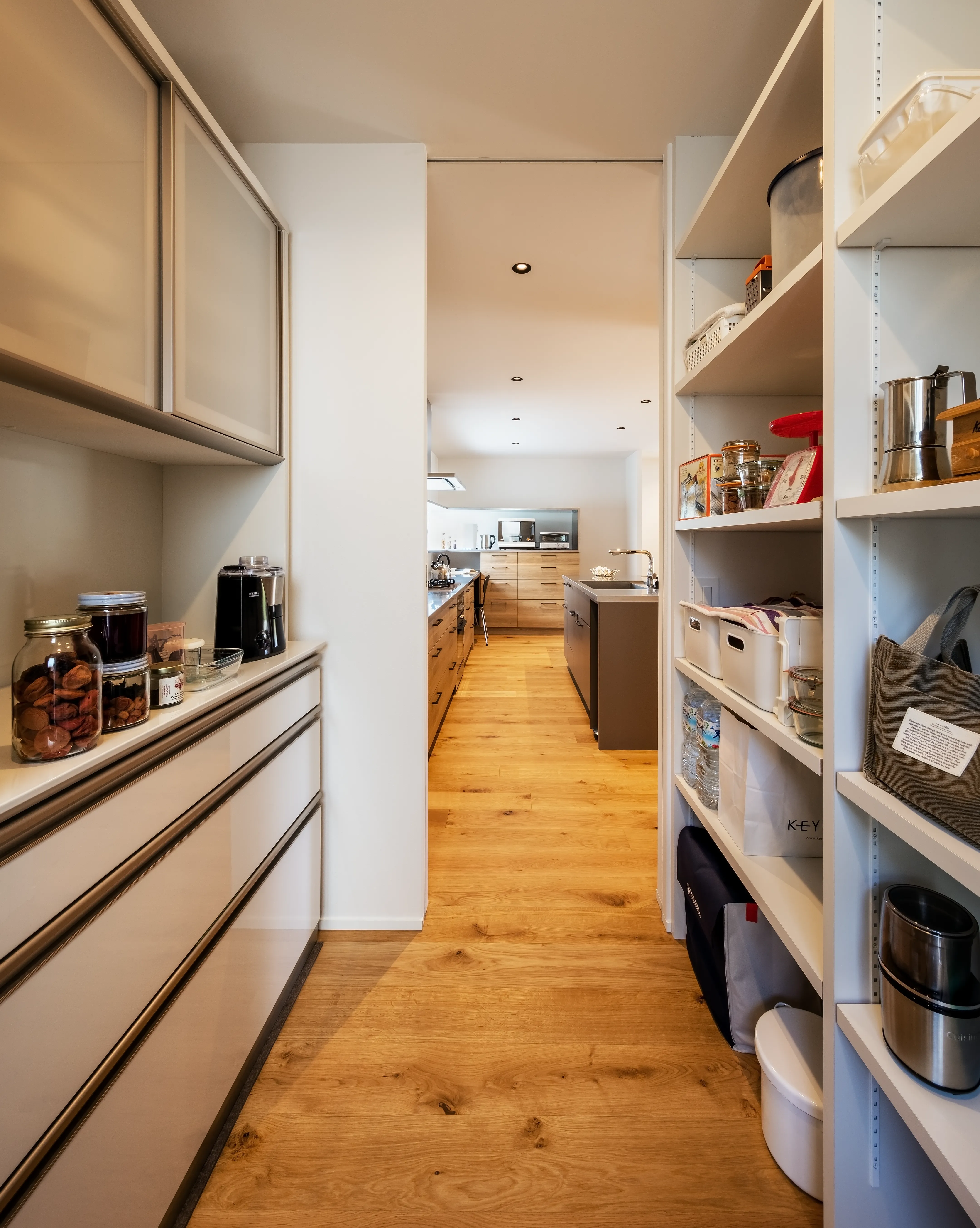 The wife’s passion is bread making, at a near-professional level. Along with a large domestic oven under the cooktop and a countertop oven, space has been reserved for a commercial oven. A dedicated stone worktable supports dough preparation and temperature control.