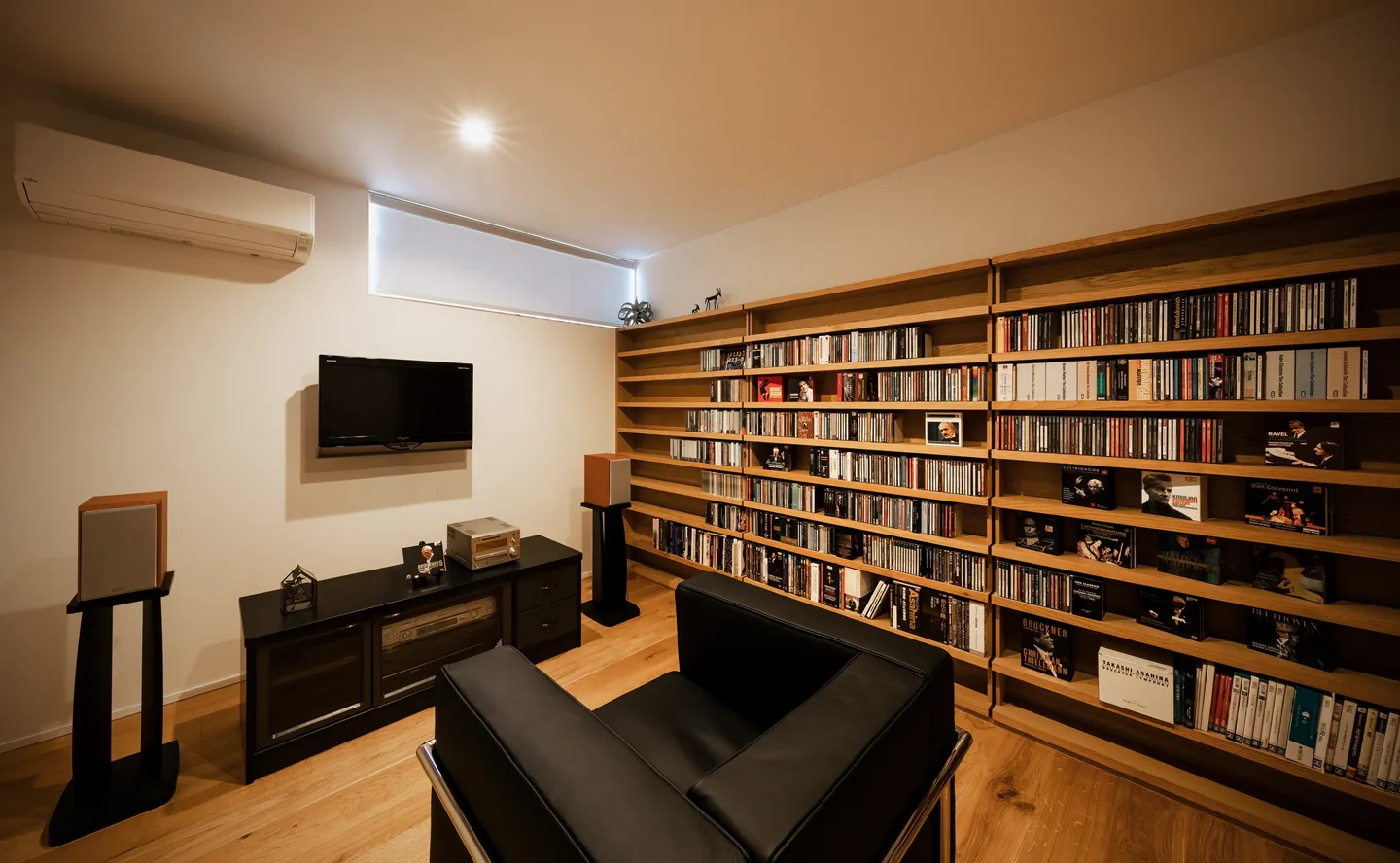 The husband’s listening room houses his cherished audio system and a custom wall unit lined with an extensive CD/DVD collection. Designed for immersion in classical music, the space incorporates sound-insulating walls and doors, modest yet effective.