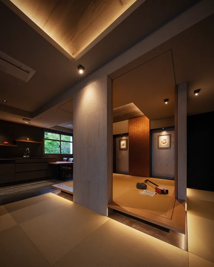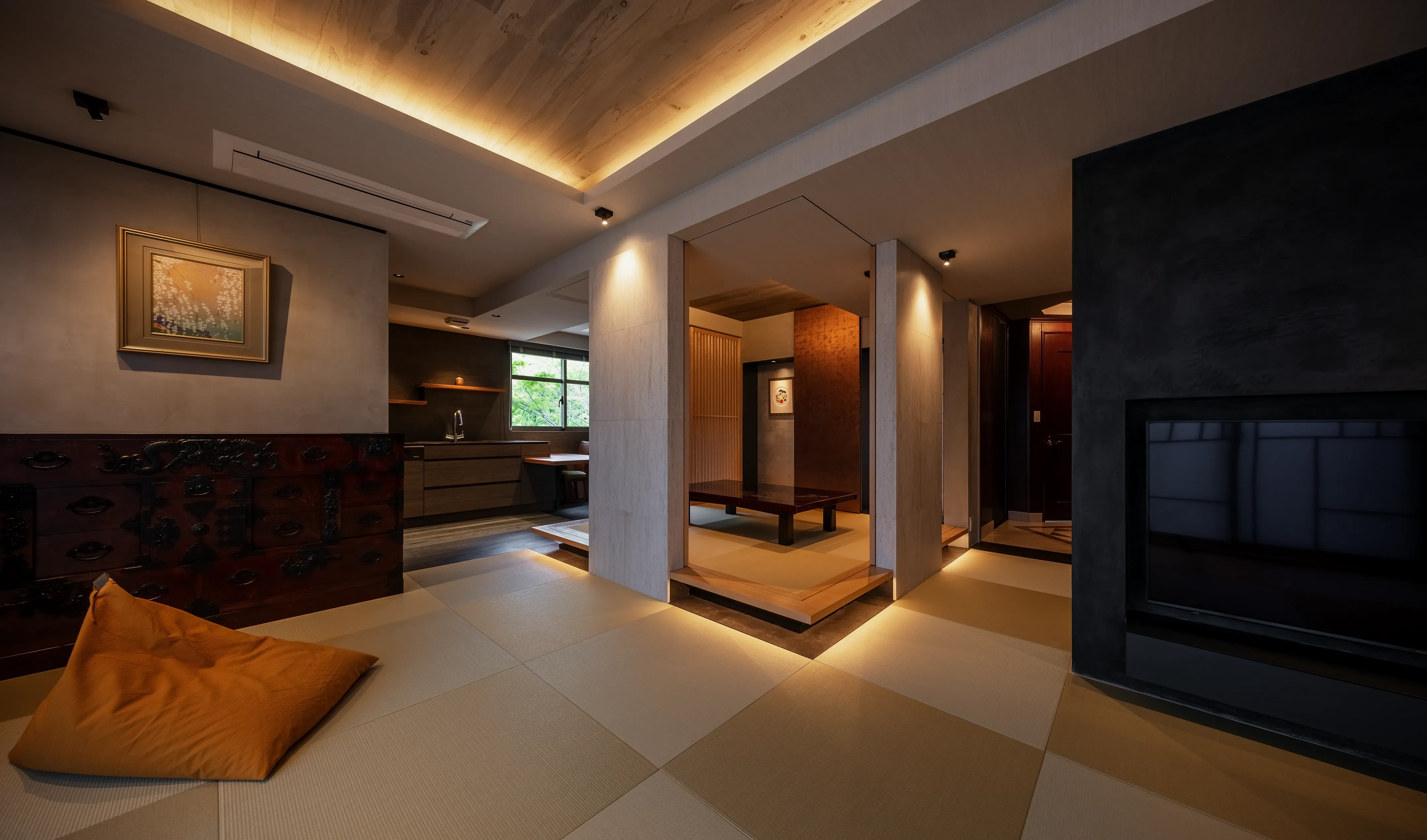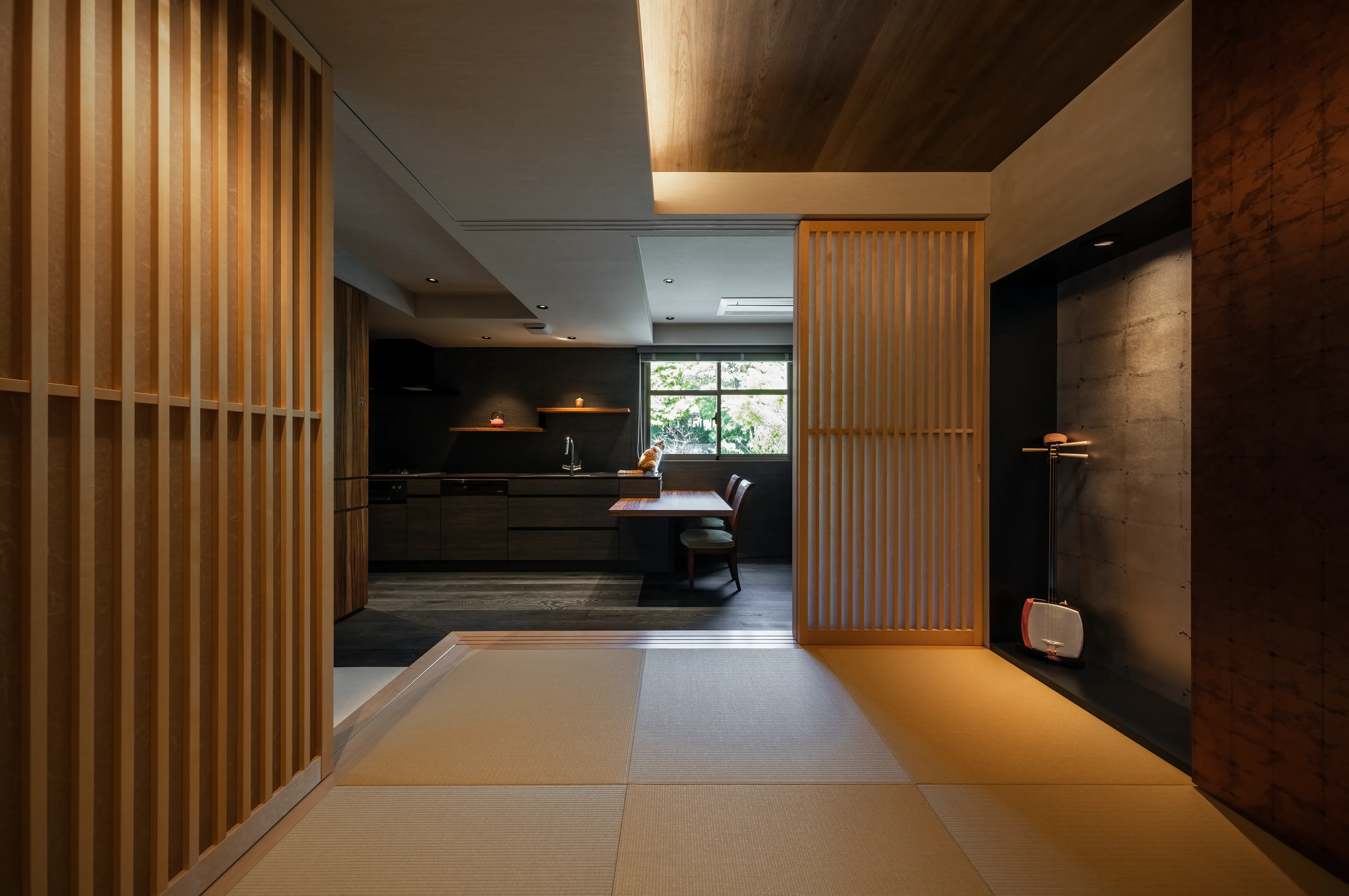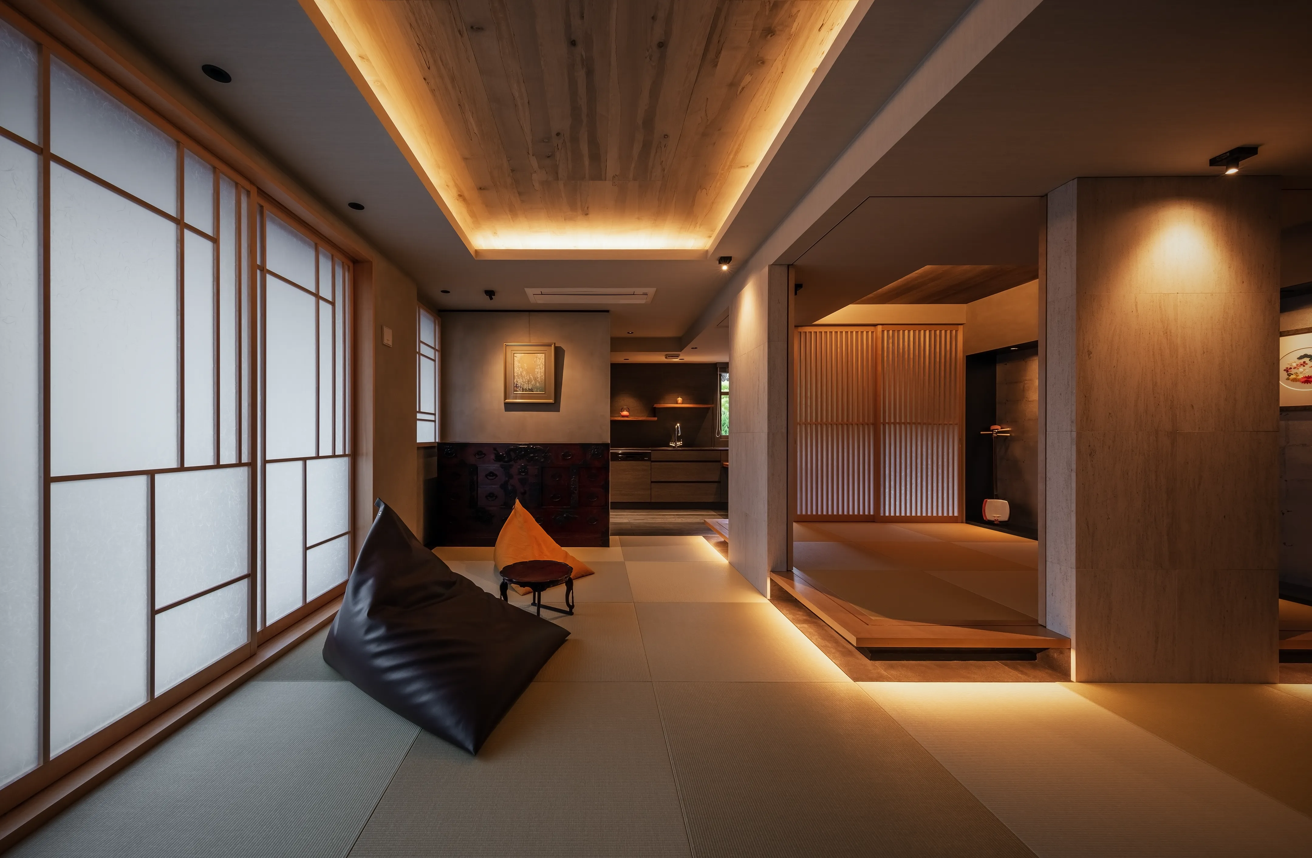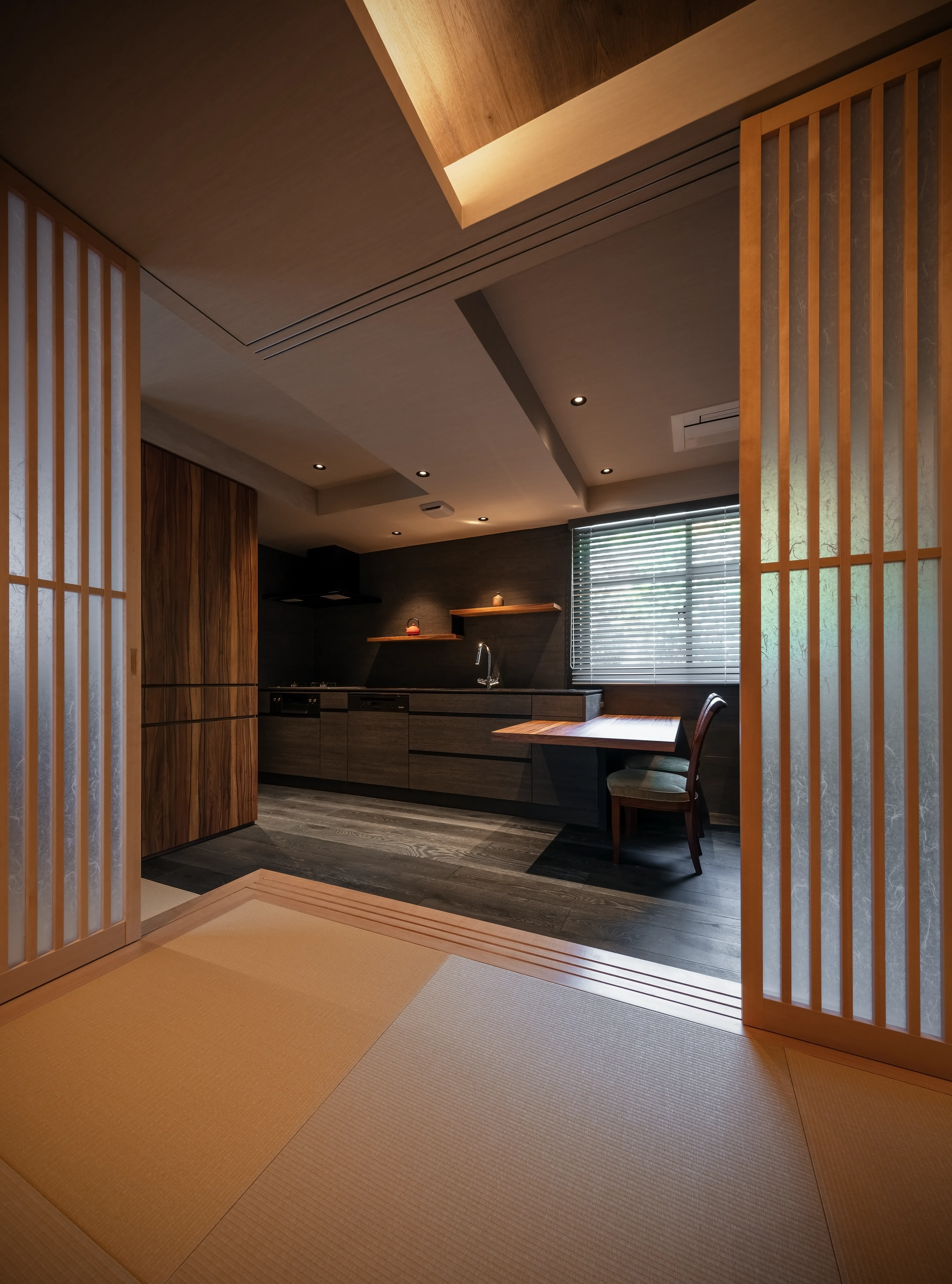 12.5帖の“chanoma”はすべて畳敷き。クライアントが以前からお持ちの座卓や輪島塗の和箪笥が似合う空間です。外部に面する窓にはモダンなデザインの障子を取りつけ、折り上げ天井には天然木の突板を貼ってモダンで高級感のあるホテルのような演出をしています。
