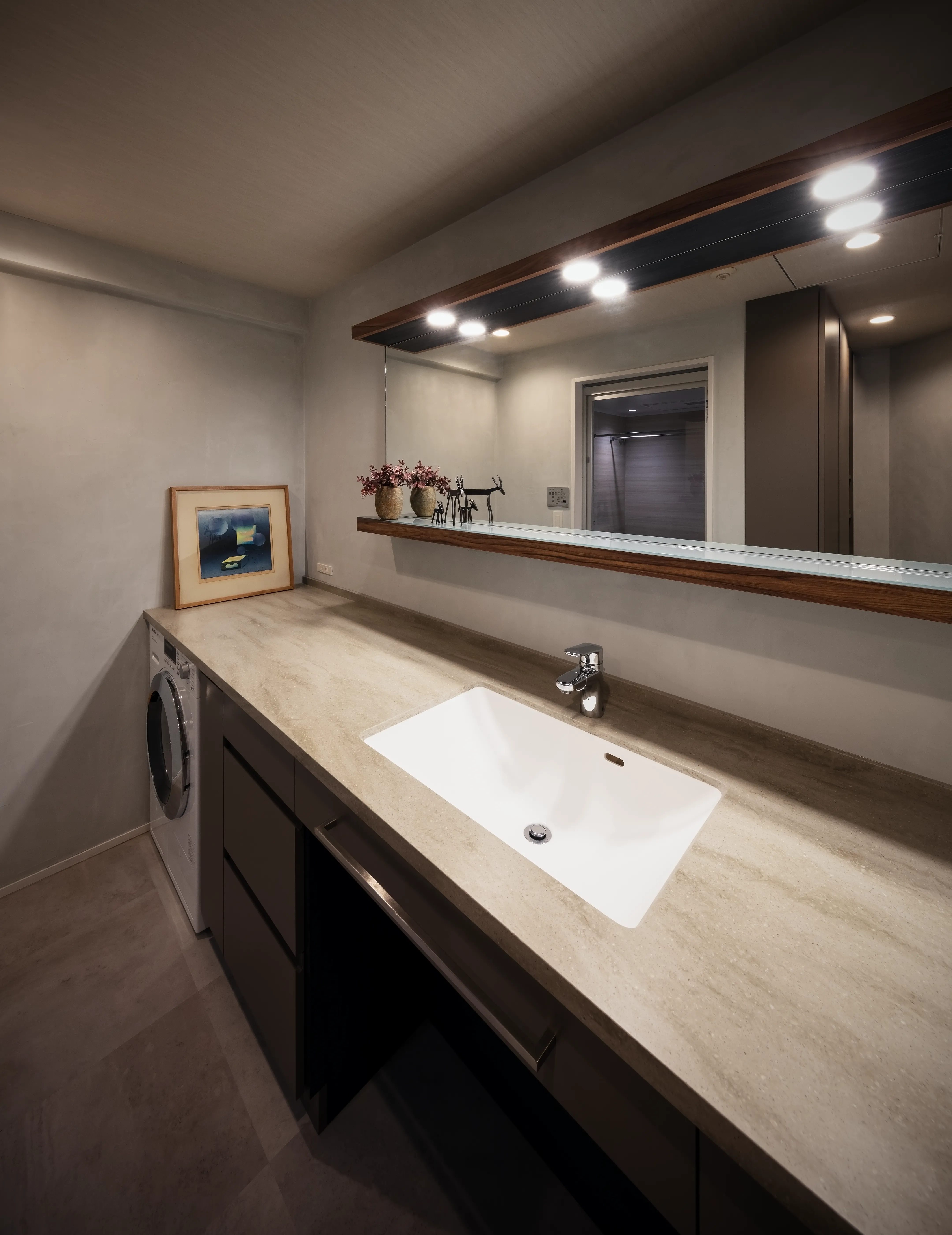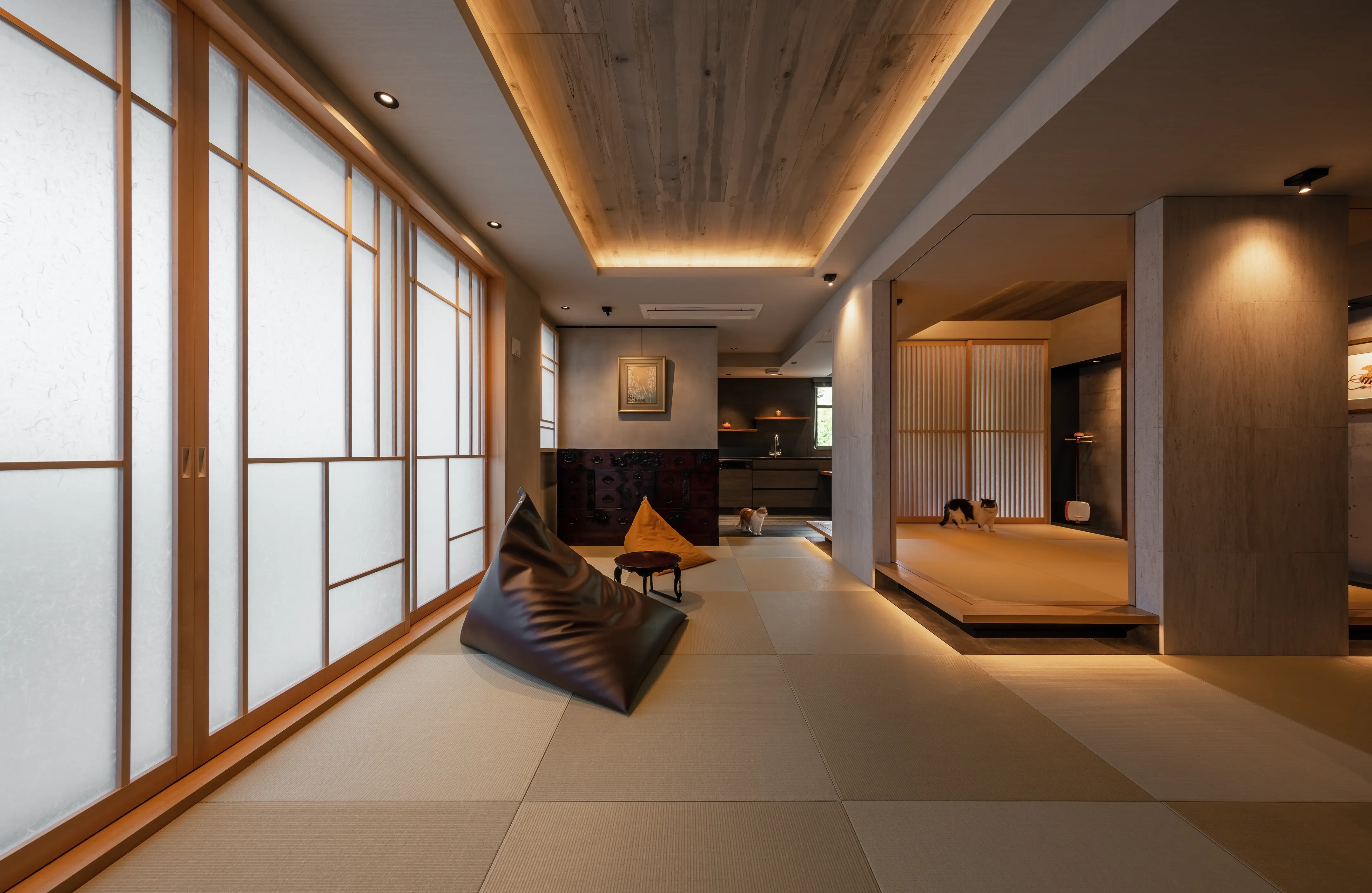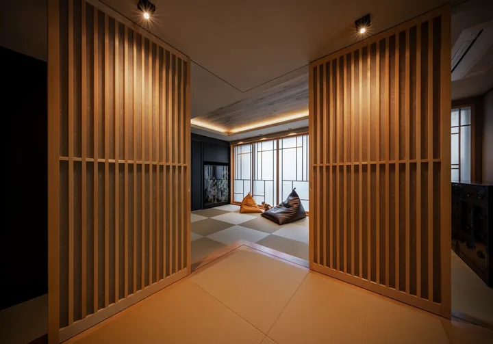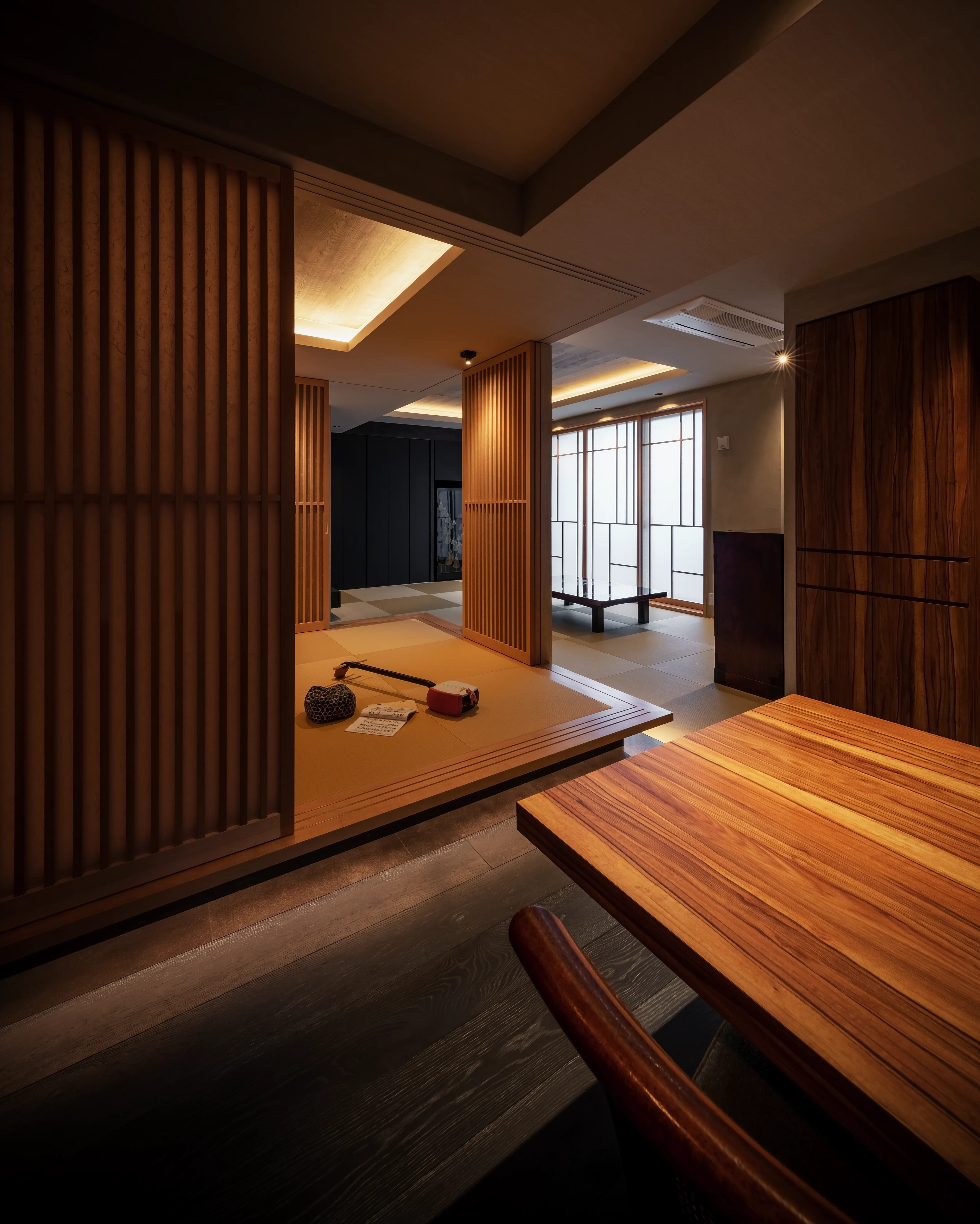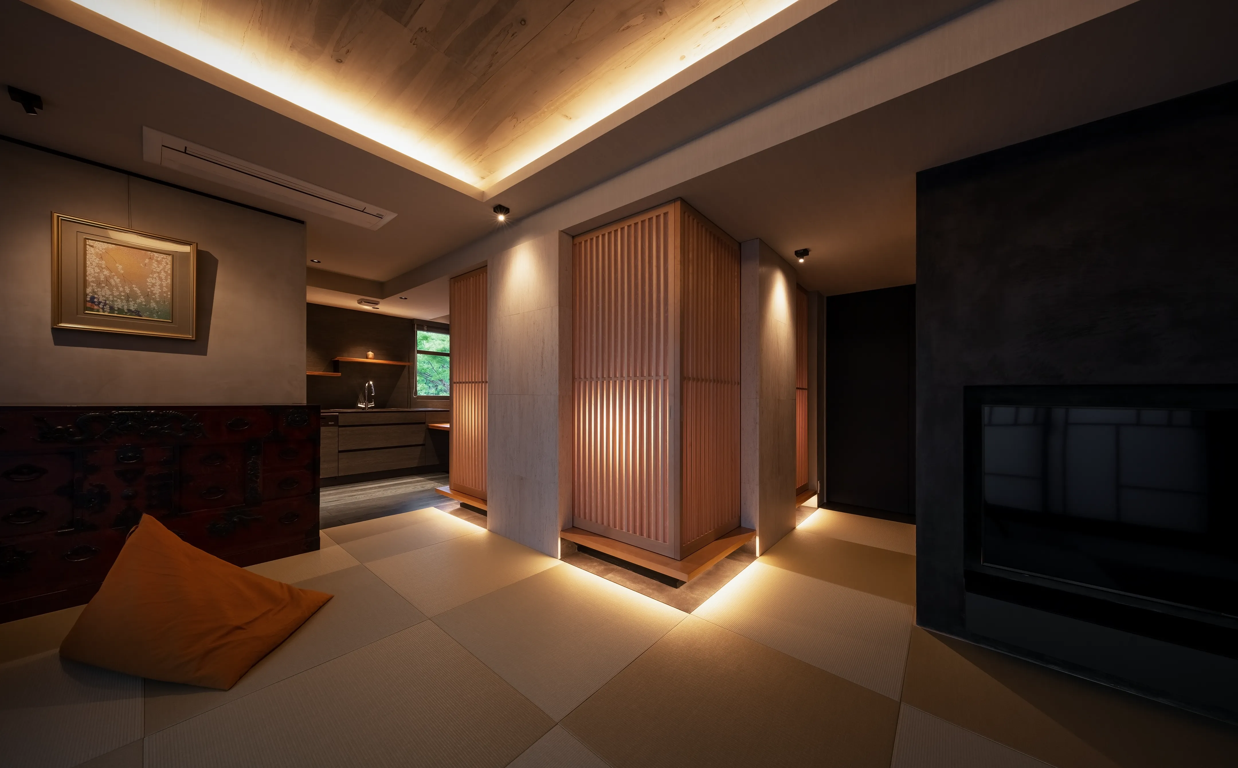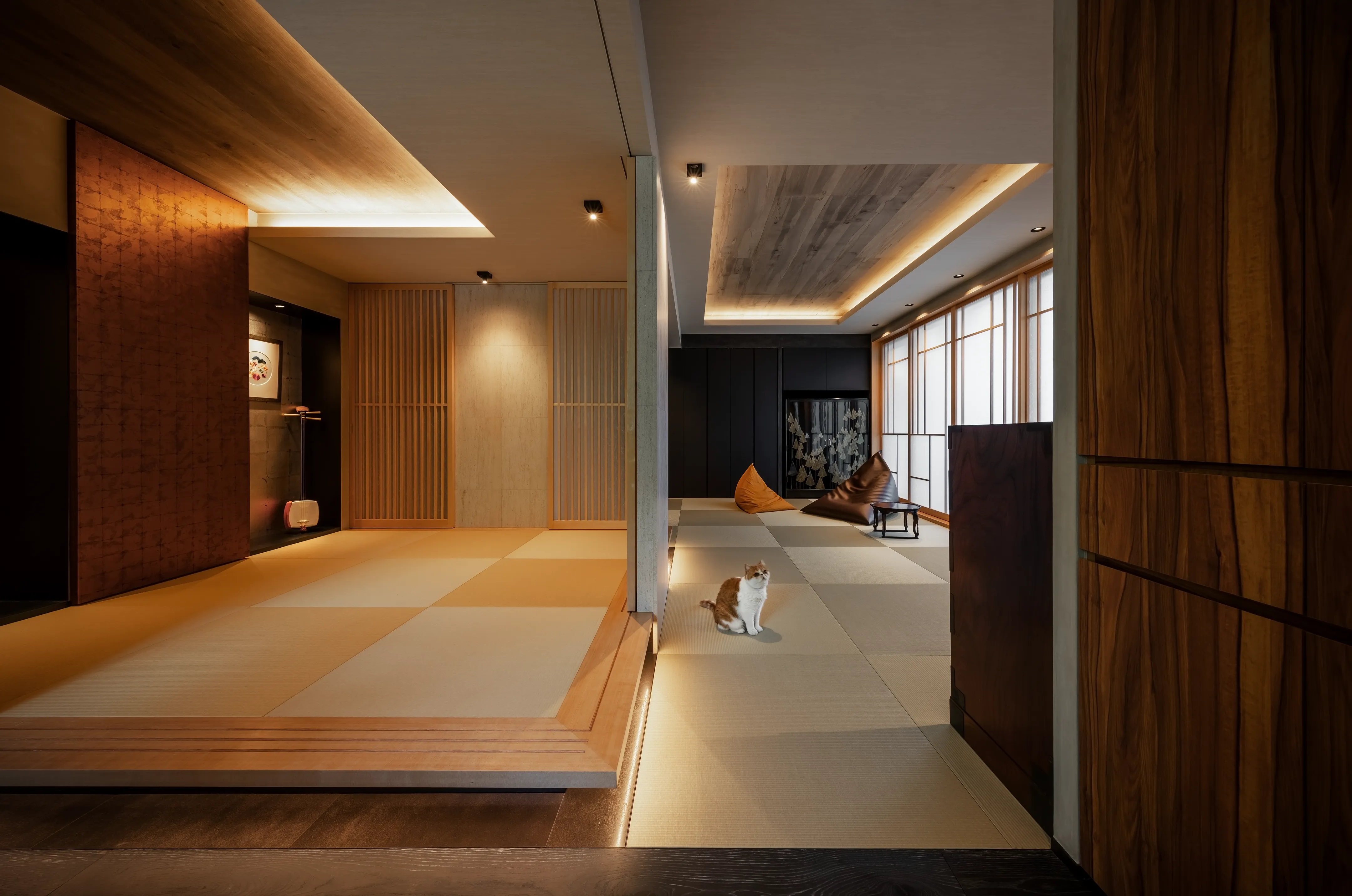 12.5帖の“chanoma”はすべて畳敷き。クライアントが以前からお持ちの座卓や輪島塗の和箪笥が似合う空間です。外部に面する窓にはモダンなデザインの障子を取りつけ、折り上げ天井には天然木の突板を貼ってモダンで高級感のあるホテルのような演出をしています。