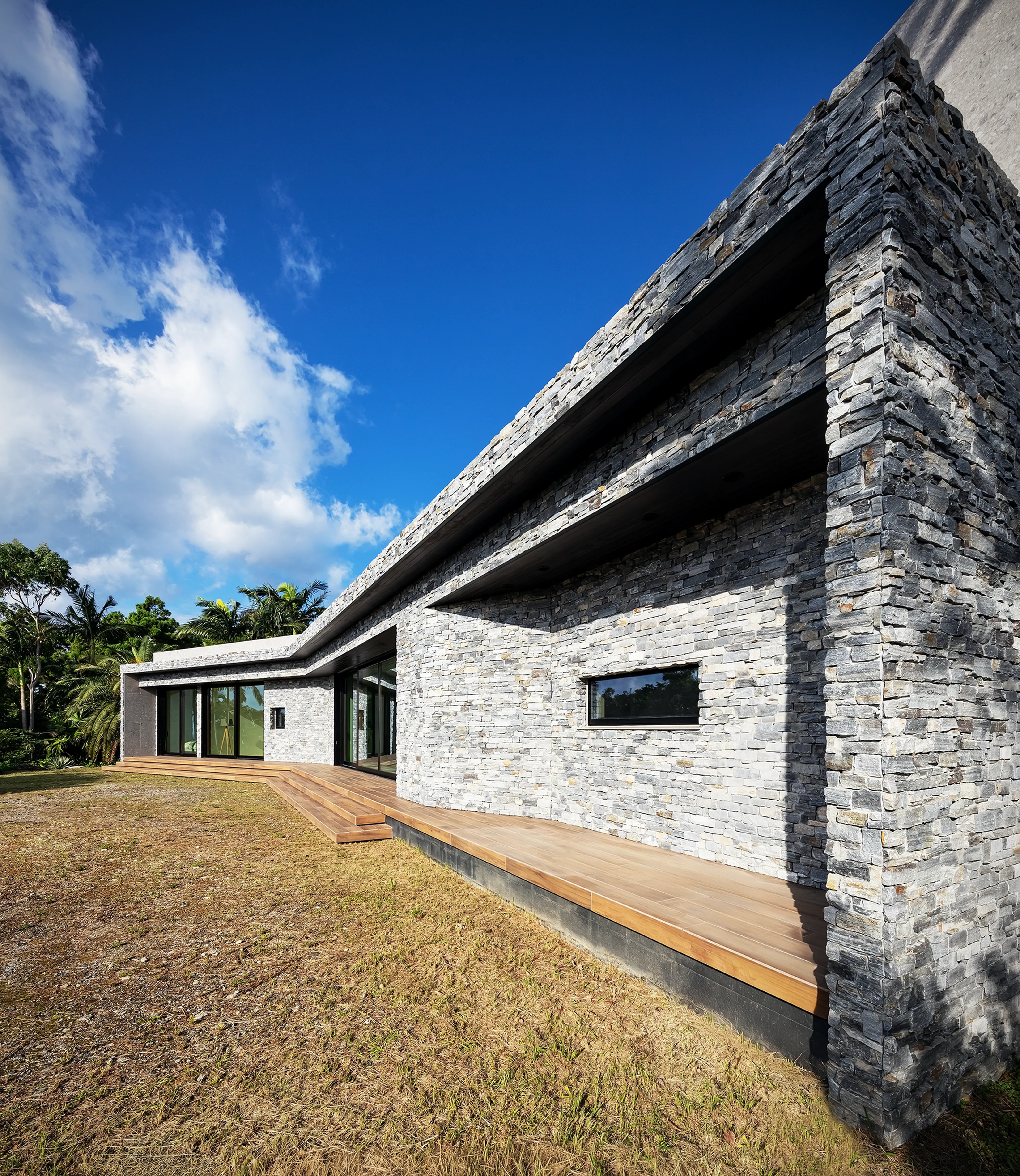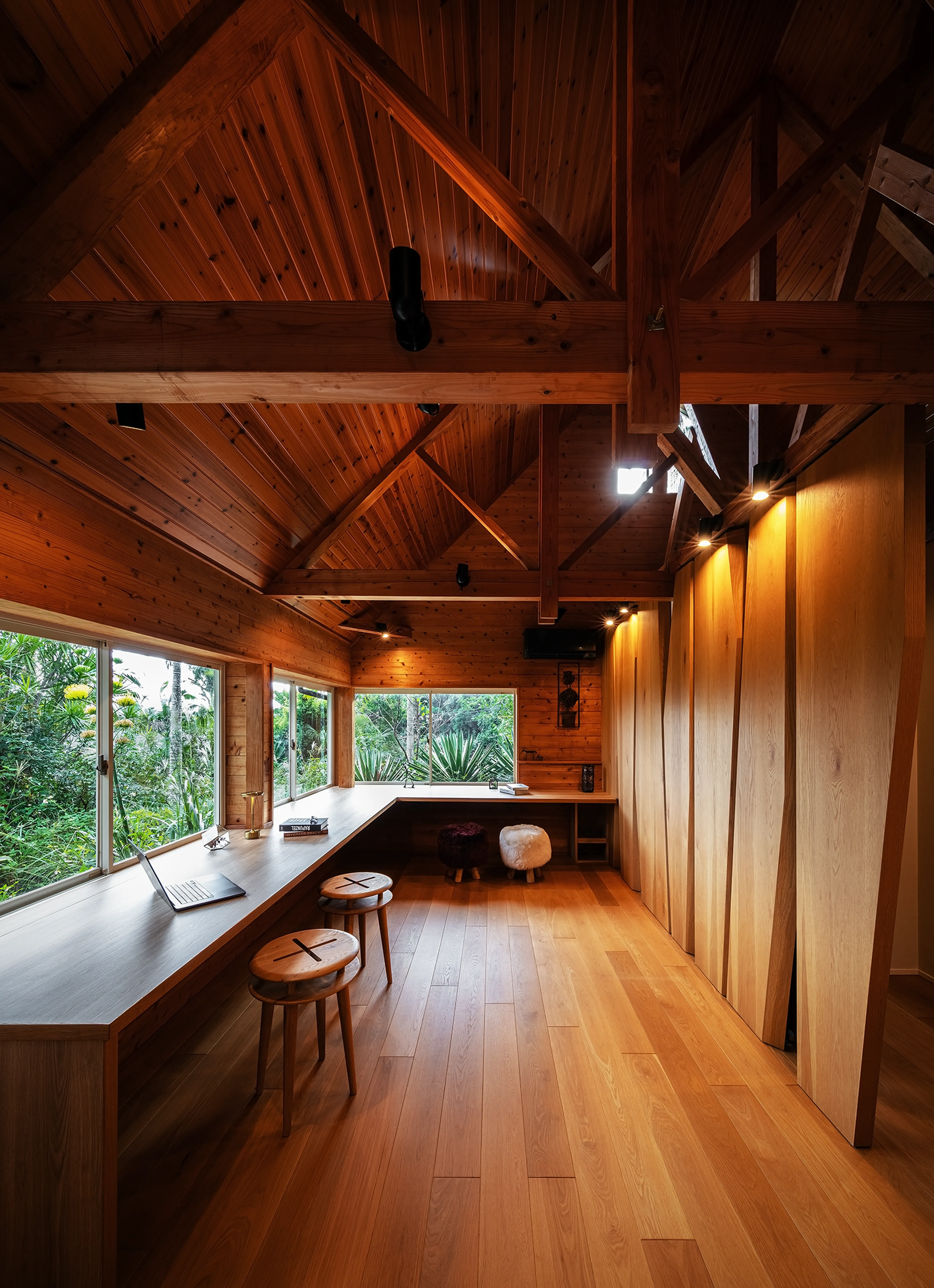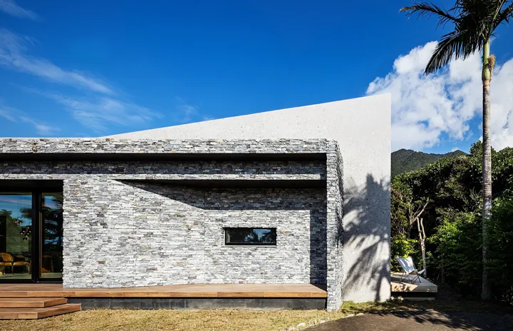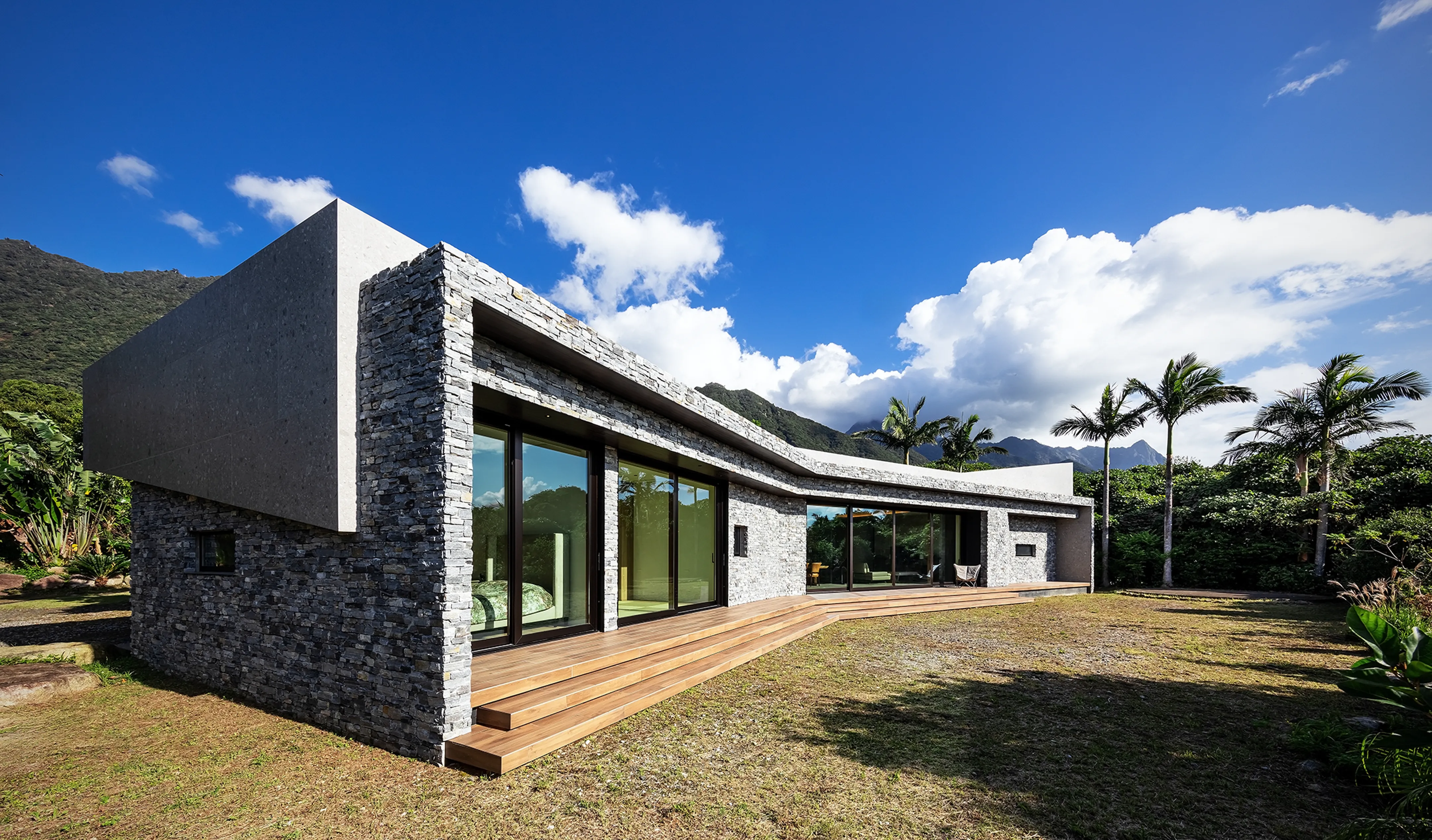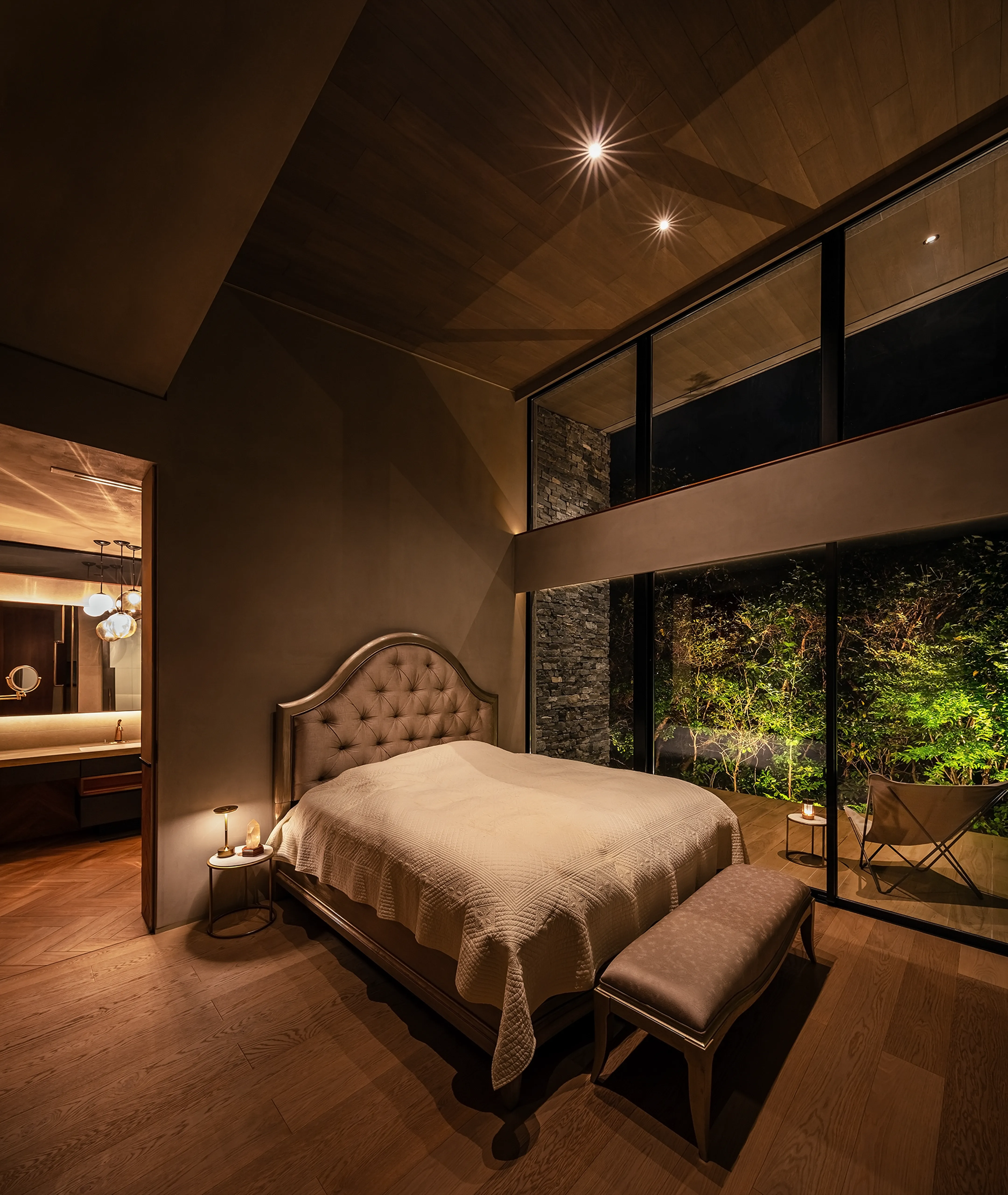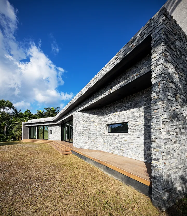 今回新たな設計とした母屋についても、屋久島の自然に同期するように存在することをめざしました。石貼りの壁は、山の中に昔からあった遺跡のような佇まいで、建築を風景の一部として静かに溶け込ませています。LDKは〈開放的で活力のある場〉に向けて大きく開き、一方で主寝室や浴室は、森や沢、落水の気配を間近に感じられる〈静寂で厳かな場〉に面して配置しました。