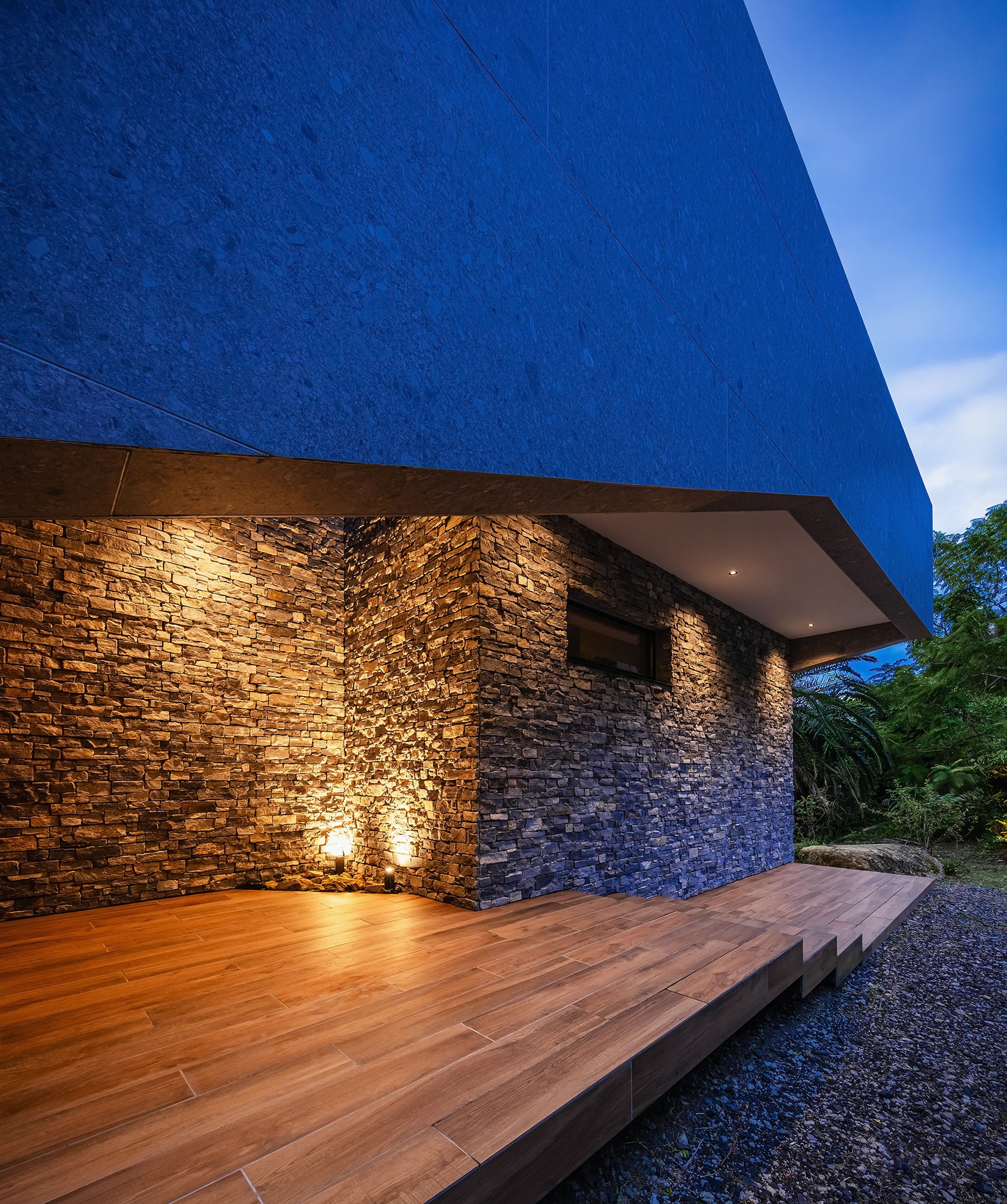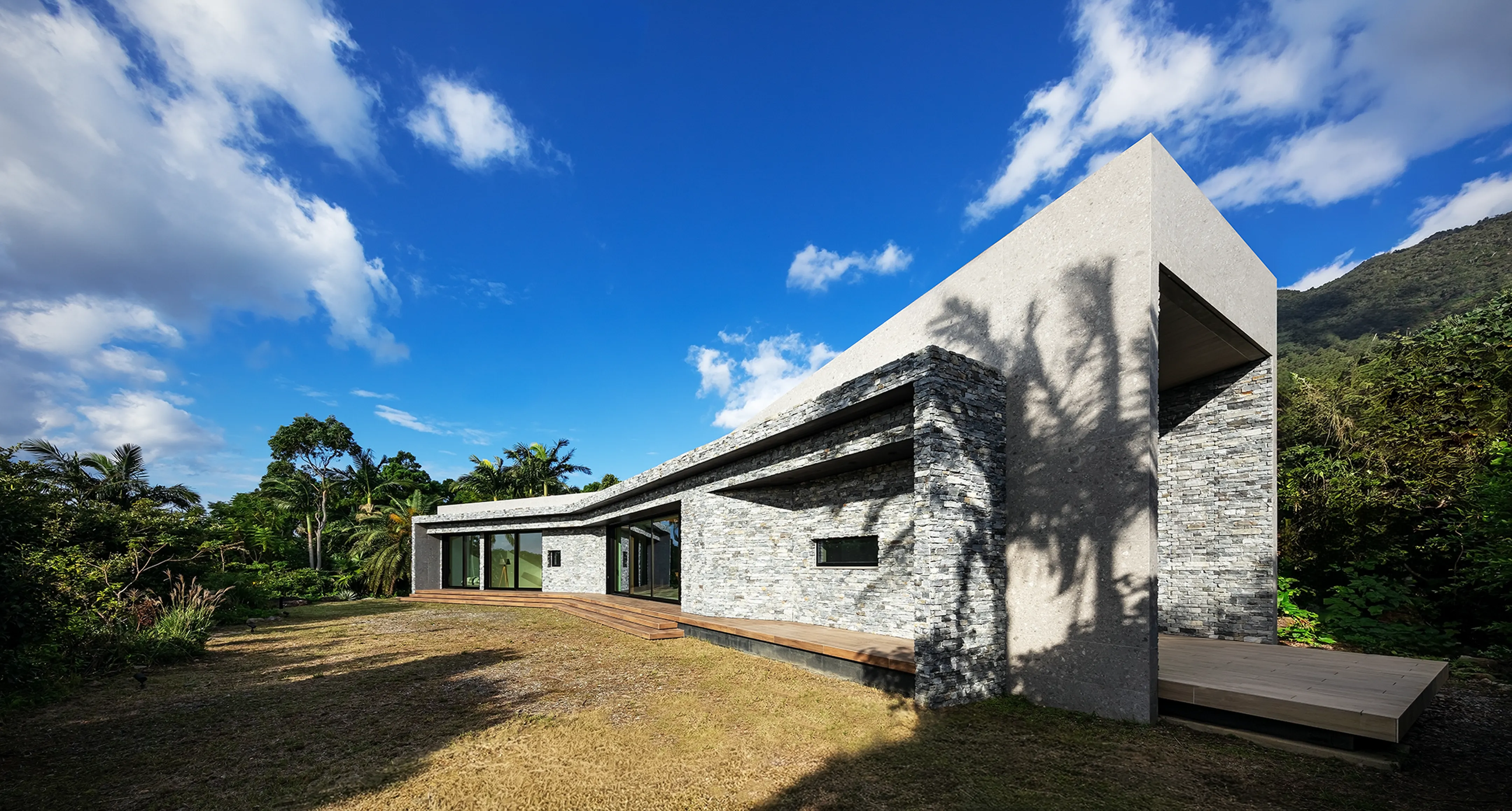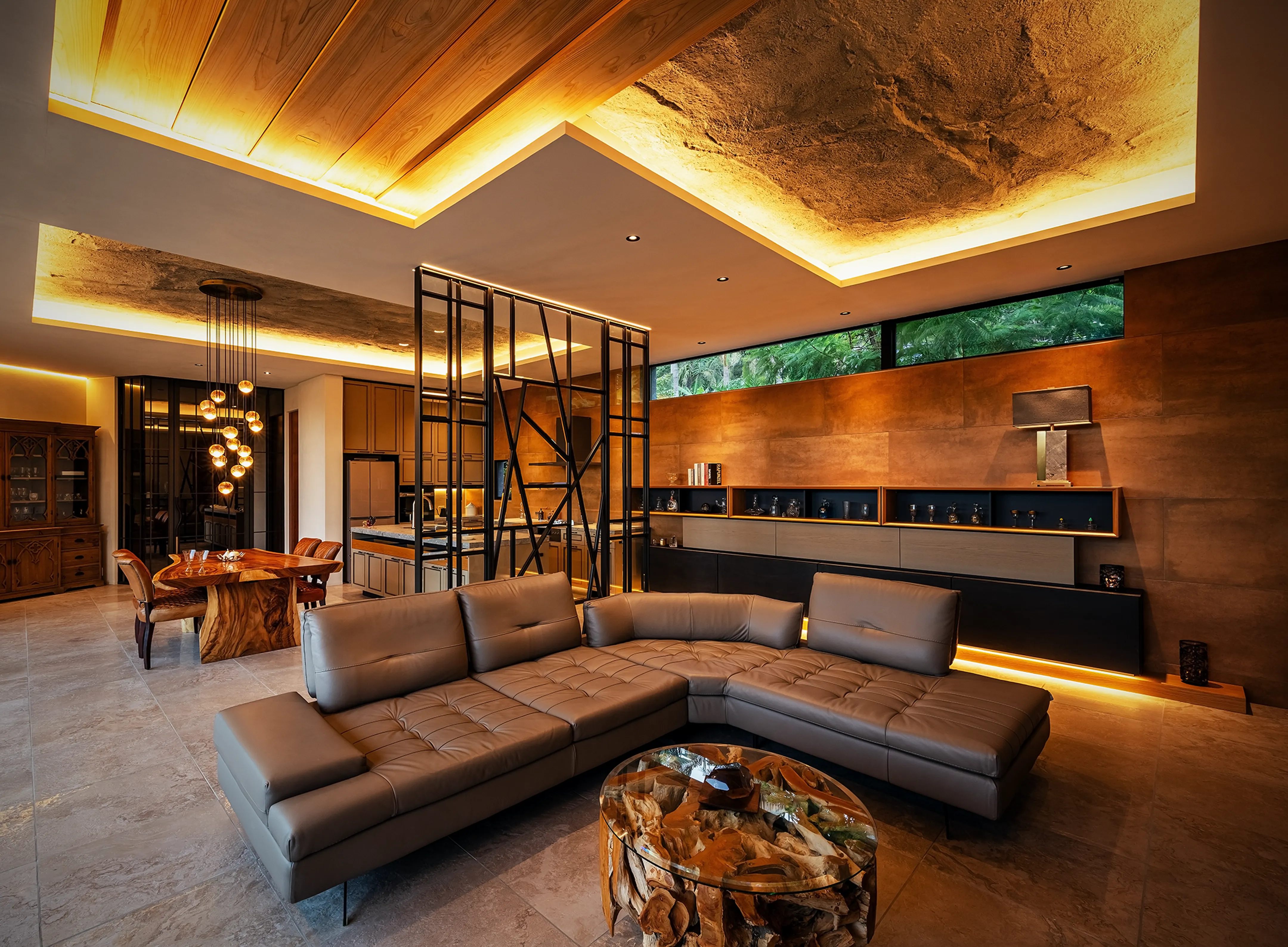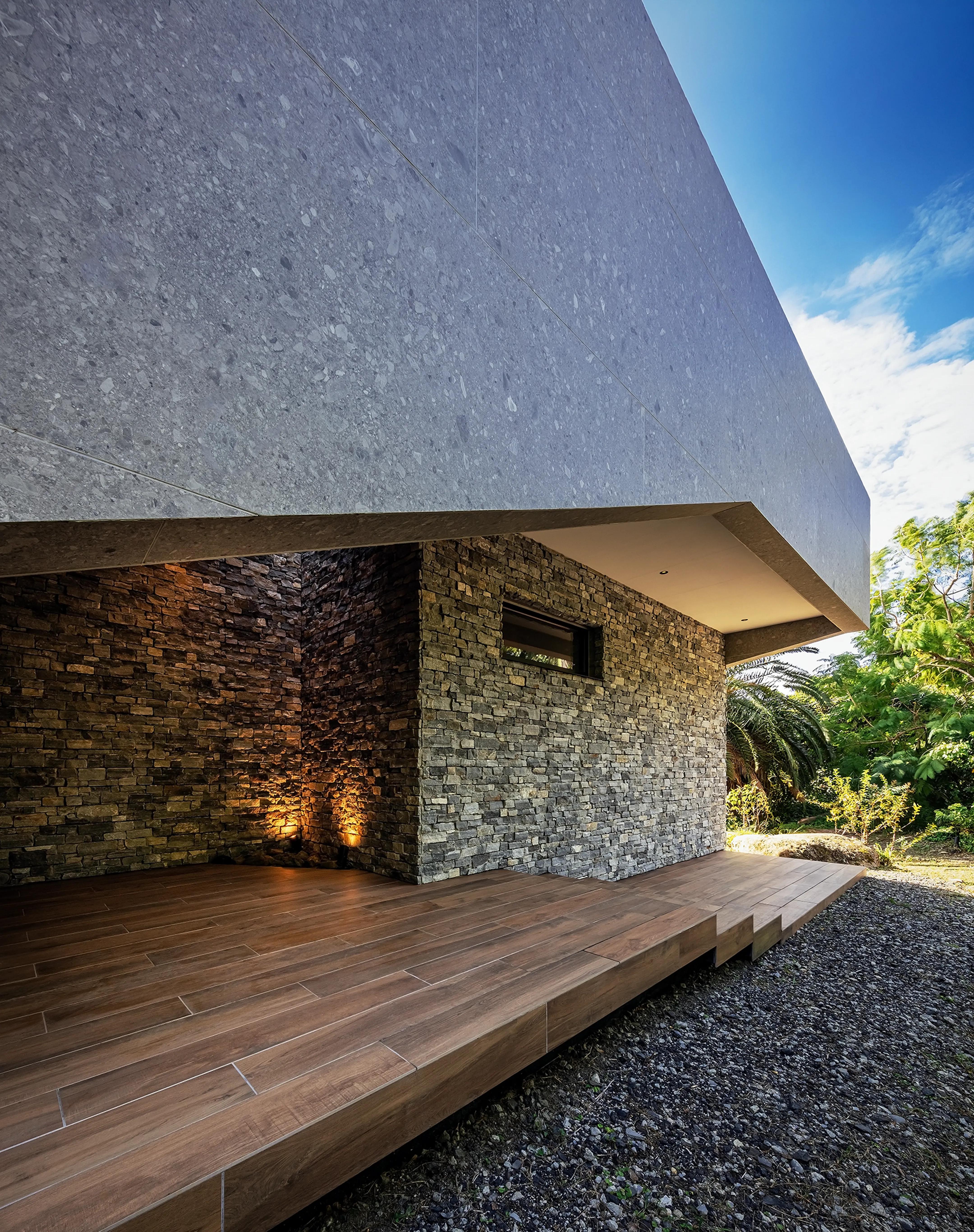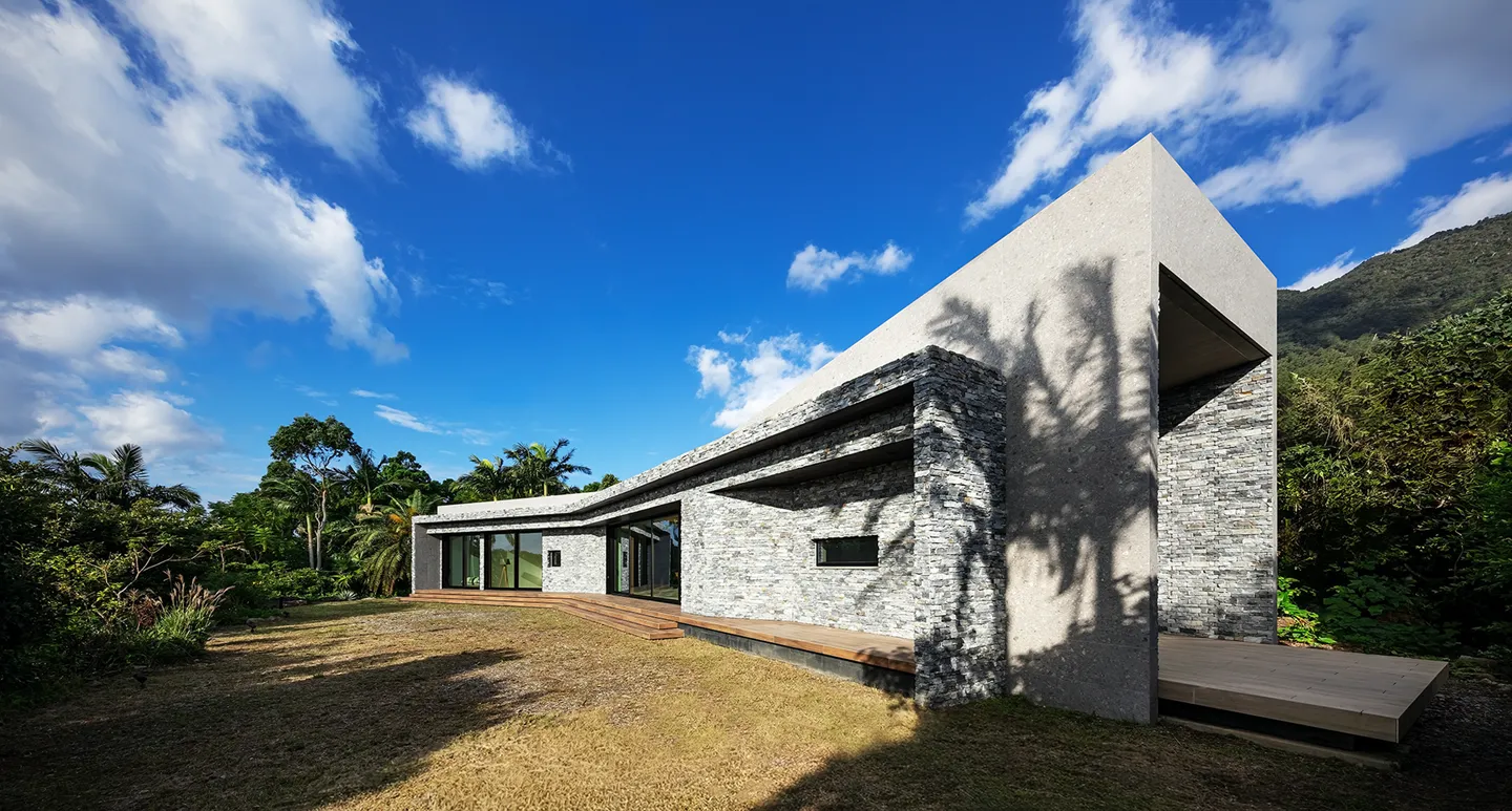 今回新たな設計とした母屋についても、屋久島の自然に同期するように存在することをめざしました。石貼りの壁は、山の中に昔からあった遺跡のような佇まいで、建築を風景の一部として静かに溶け込ませています。LDKは〈開放的で活力のある場〉に向けて大きく開き、一方で主寝室や浴室は、森や沢、落水の気配を間近に感じられる〈静寂で厳かな場〉に面して配置しました。