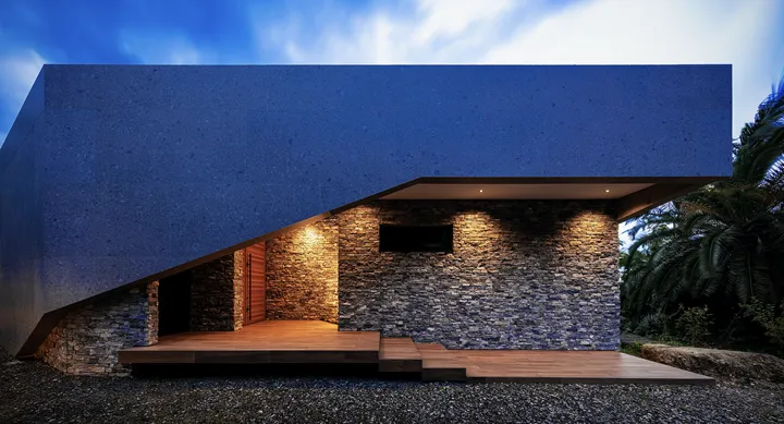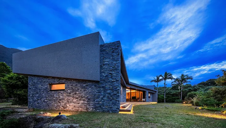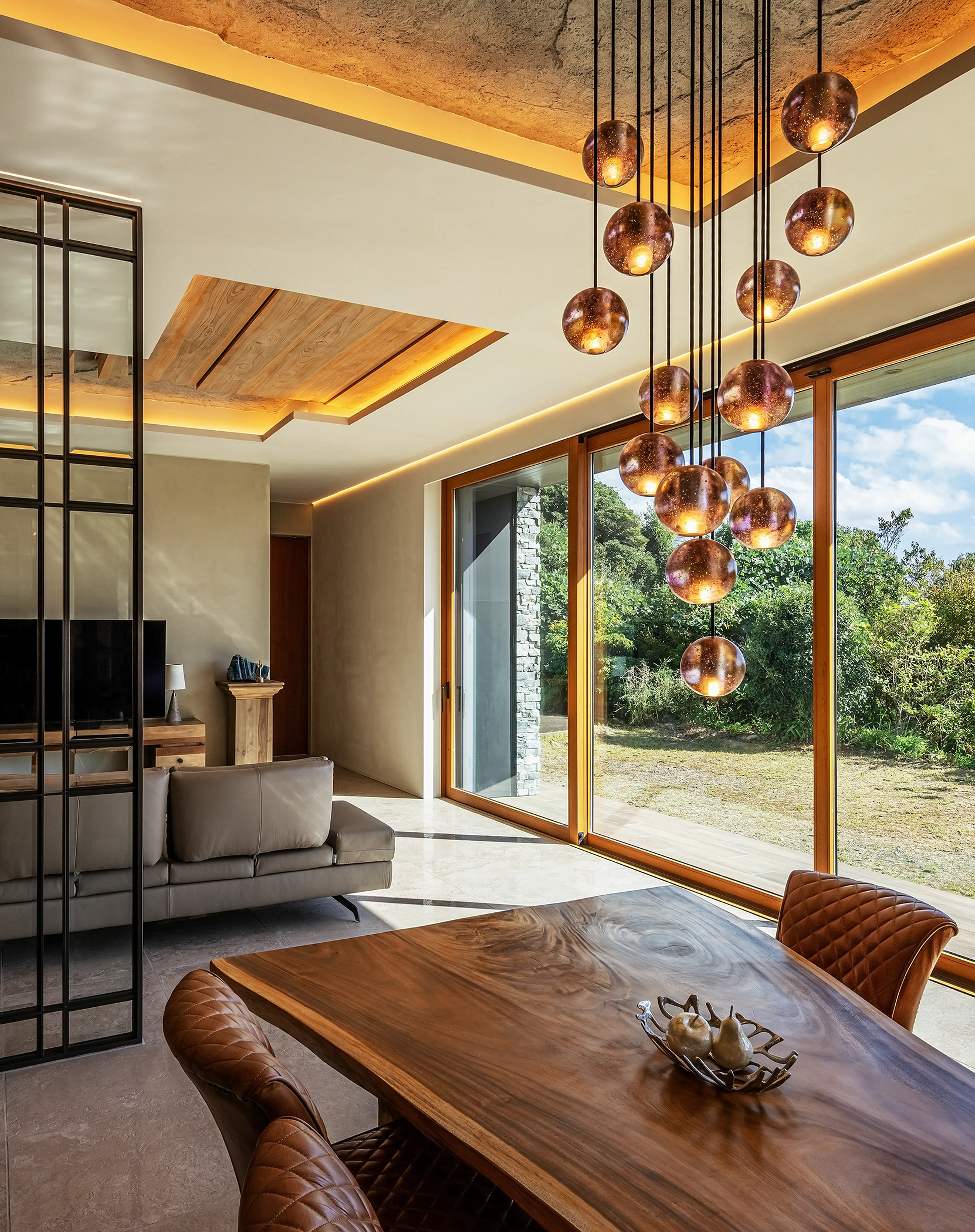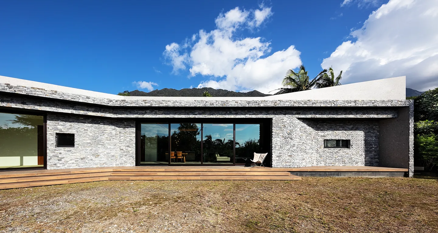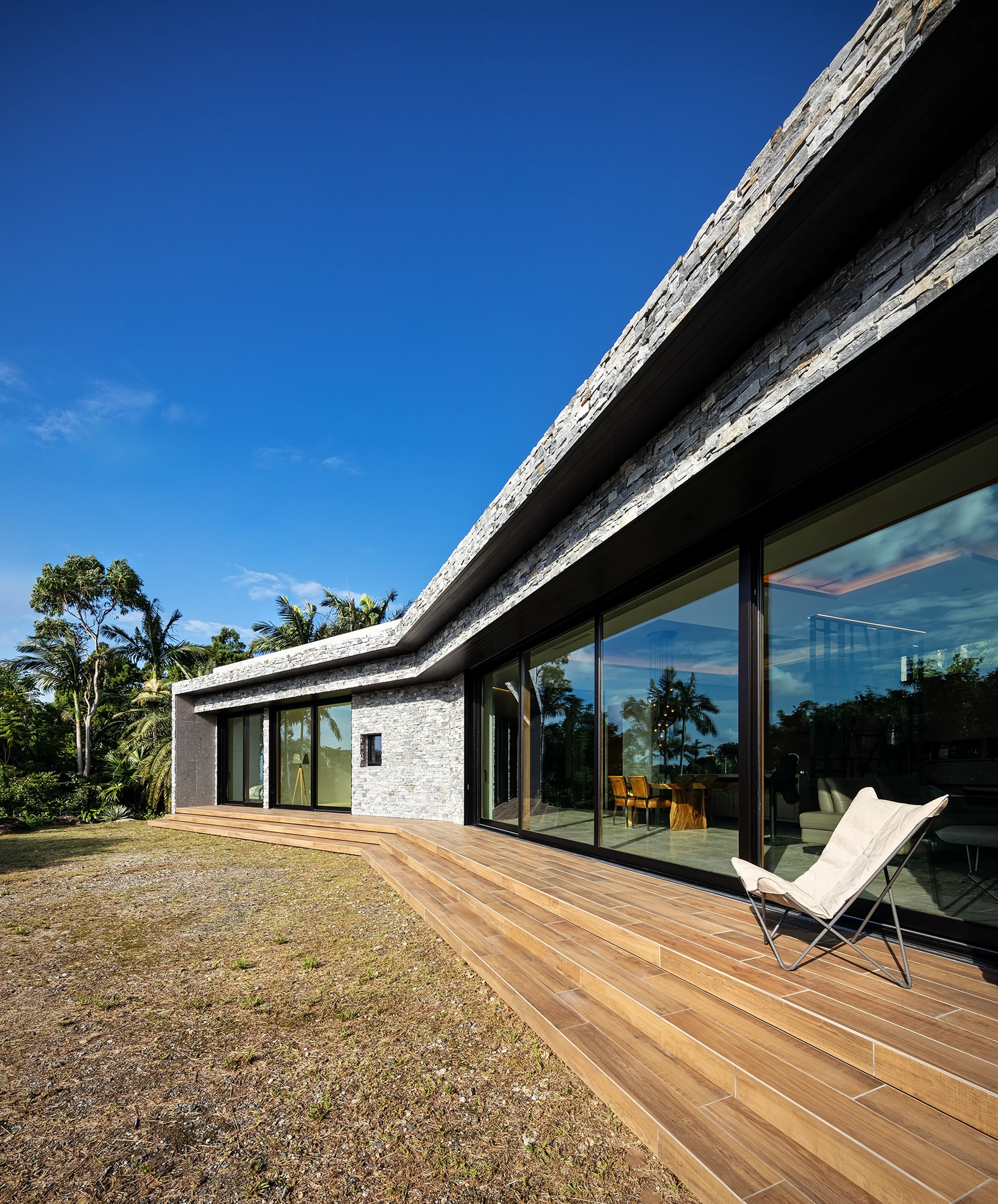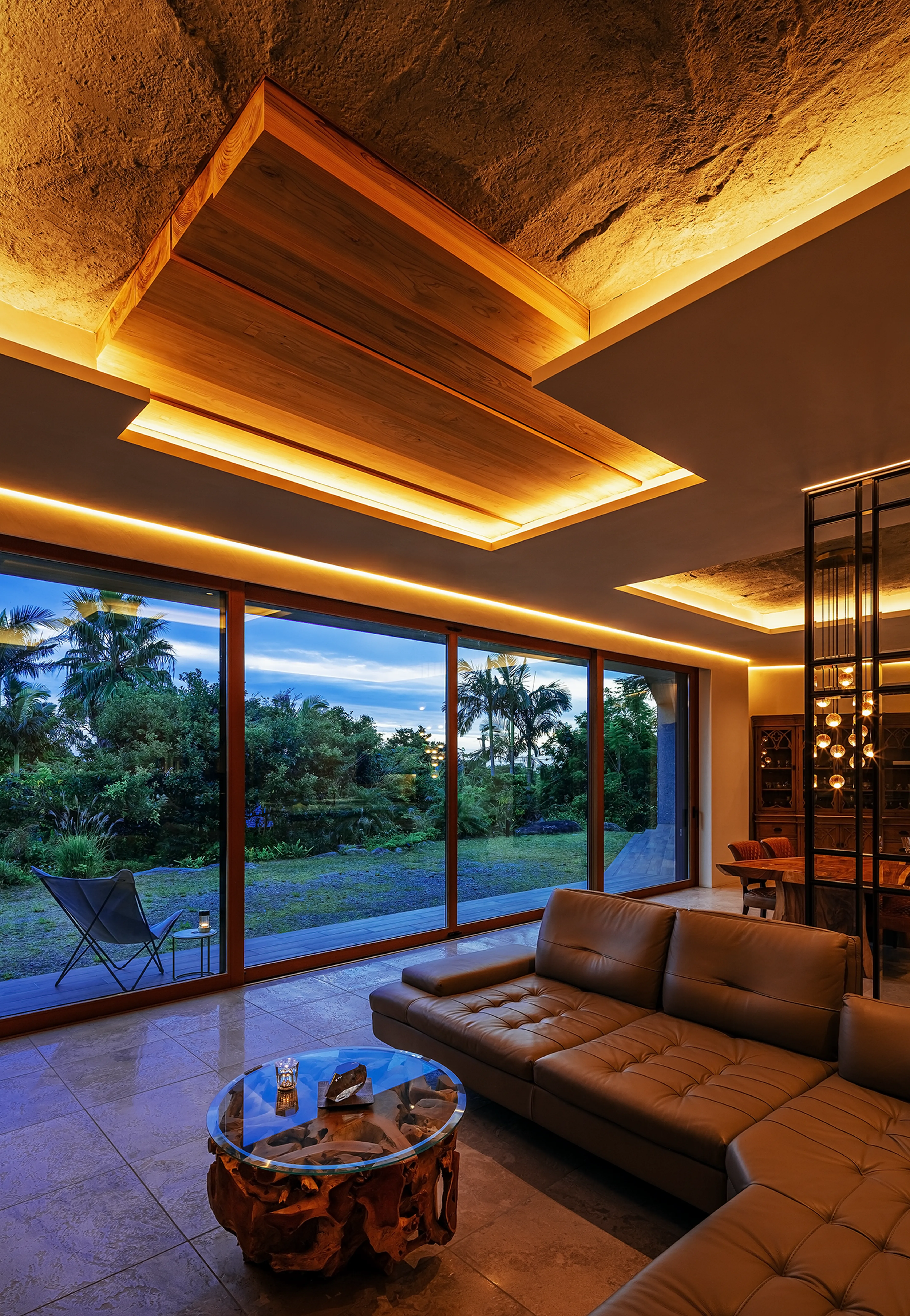 今回新たな設計とした母屋についても、屋久島の自然に同期するように存在することをめざしました。石貼りの壁は、山の中に昔からあった遺跡のような佇まいで、建築を風景の一部として静かに溶け込ませています。LDKは〈開放的で活力のある場〉に向けて大きく開き、一方で主寝室や浴室は、森や沢、落水の気配を間近に感じられる〈静寂で厳かな場〉に面して配置しました。