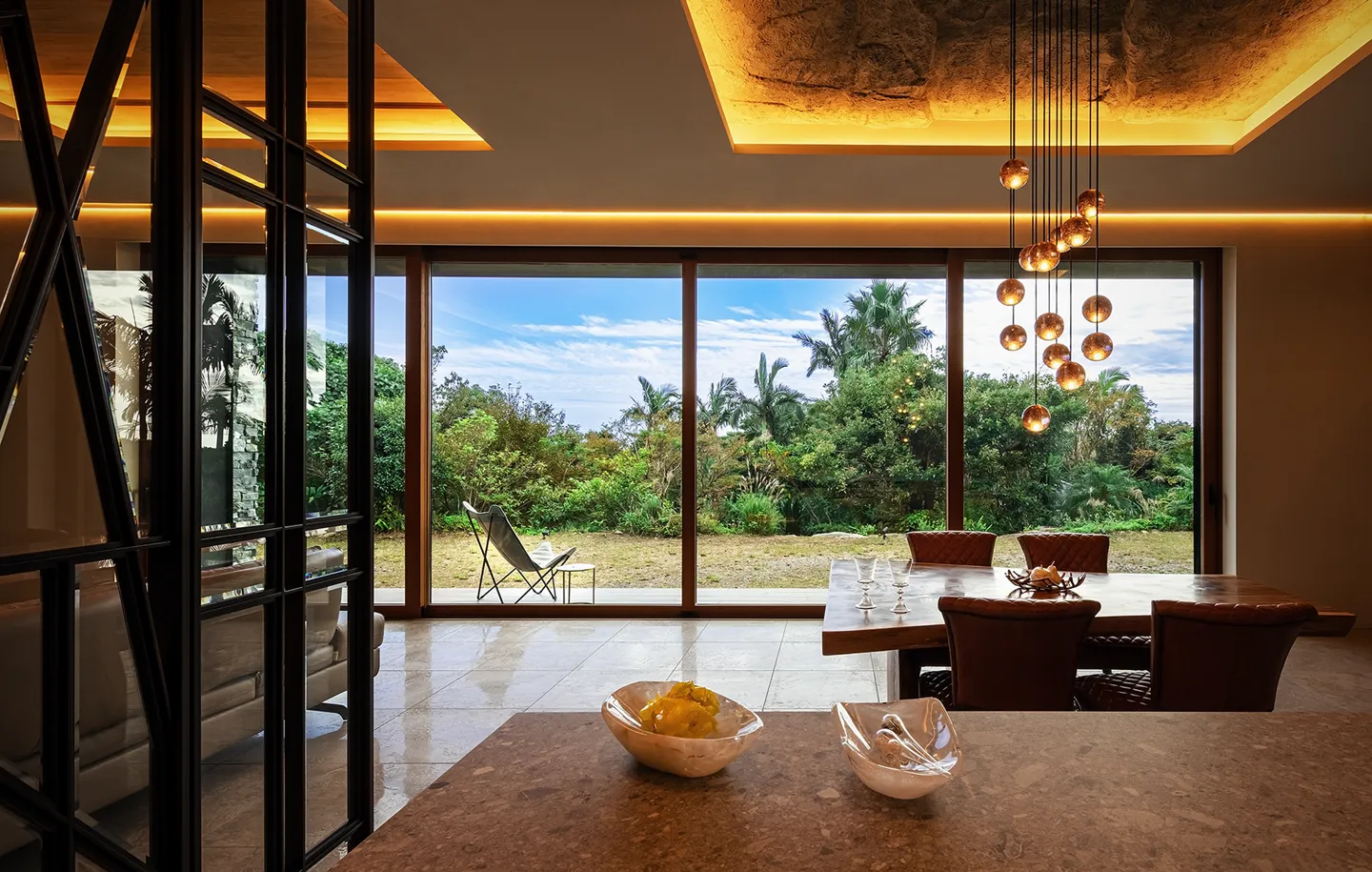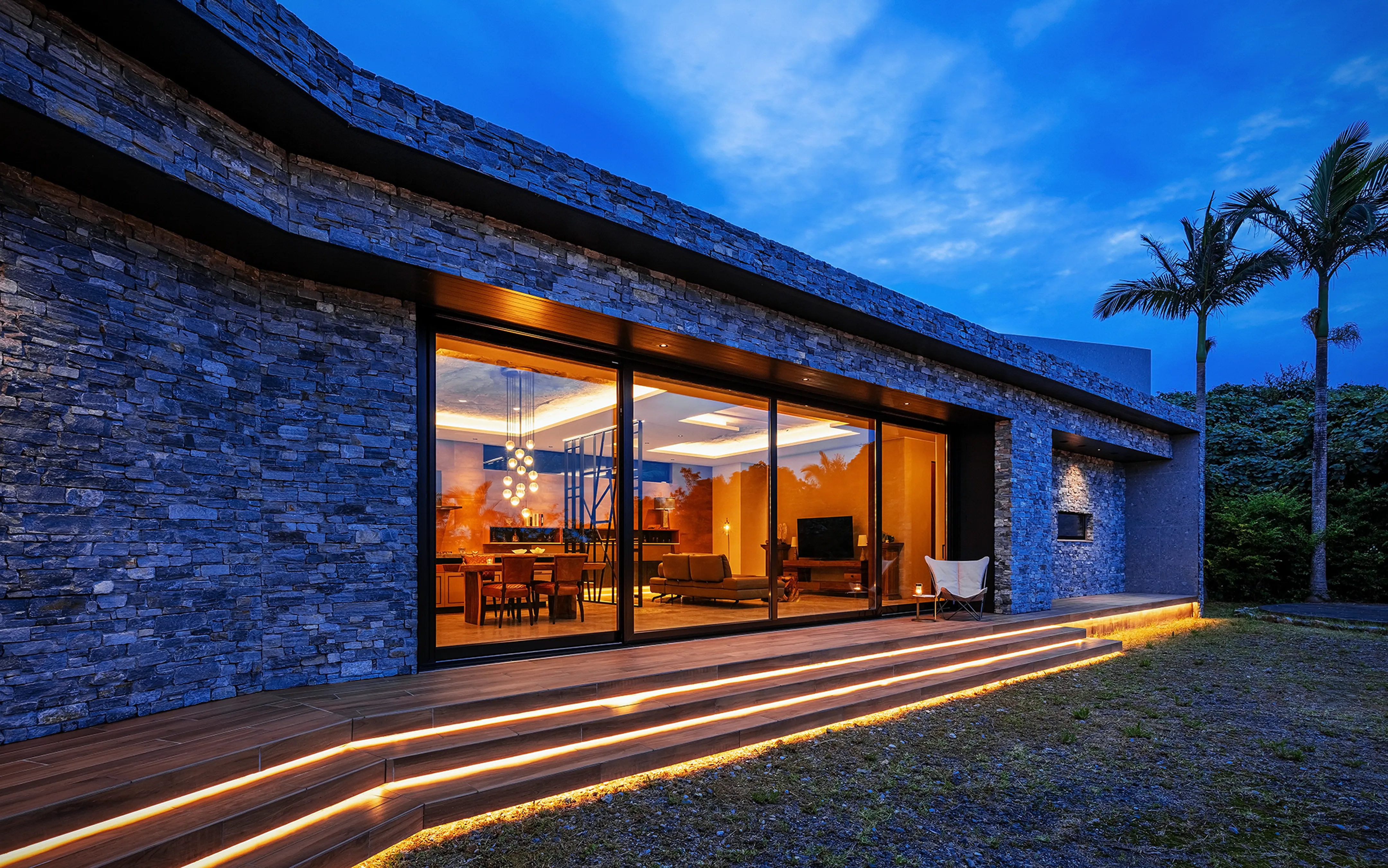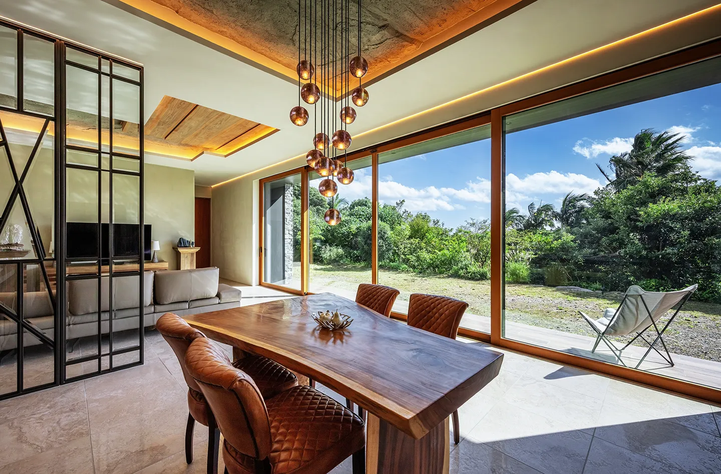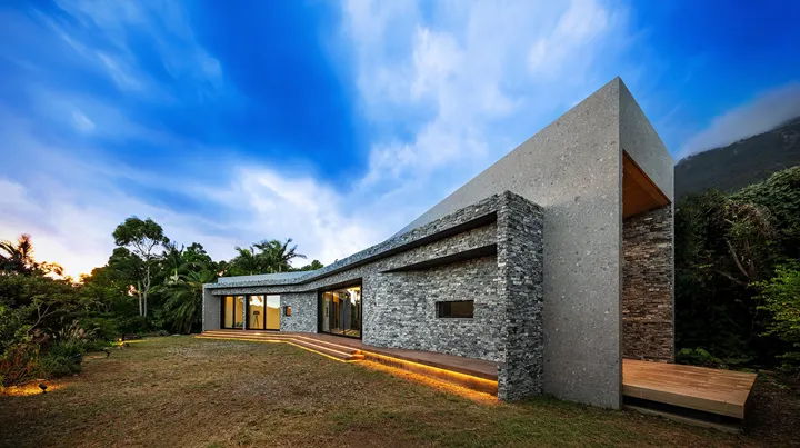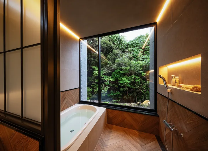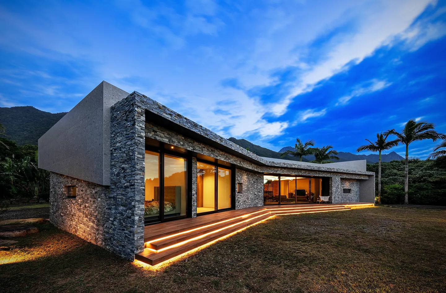 今回新たな設計とした母屋についても、屋久島の自然に同期するように存在することをめざしました。石貼りの壁は、山の中に昔からあった遺跡のような佇まいで、建築を風景の一部として静かに溶け込ませています。LDKは〈開放的で活力のある場〉に向けて大きく開き、一方で主寝室や浴室は、森や沢、落水の気配を間近に感じられる〈静寂で厳かな場〉に面して配置しました。