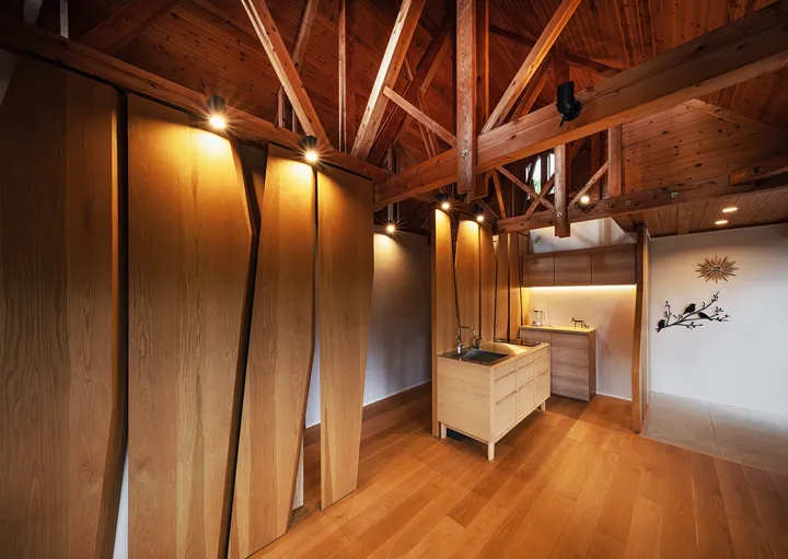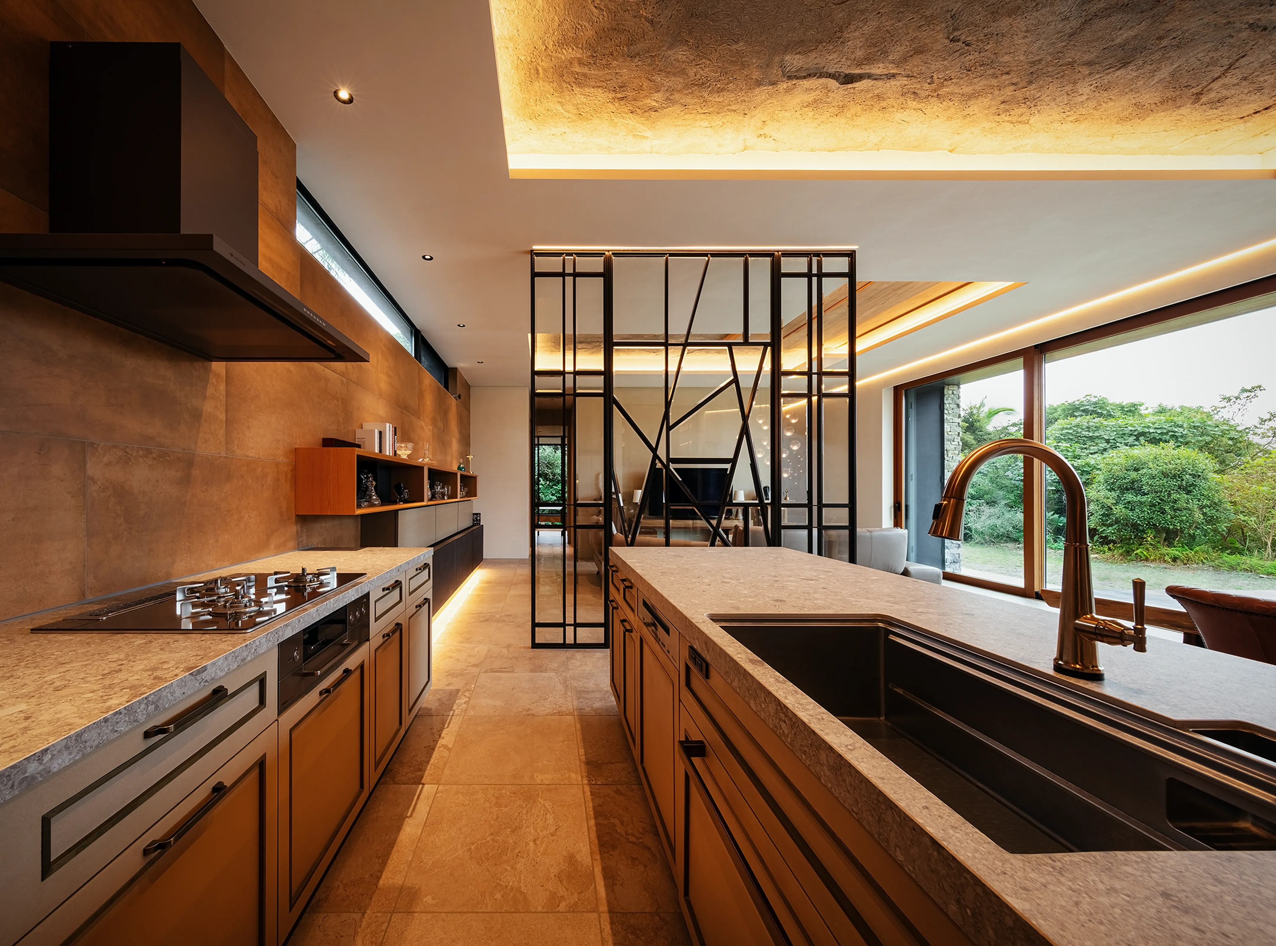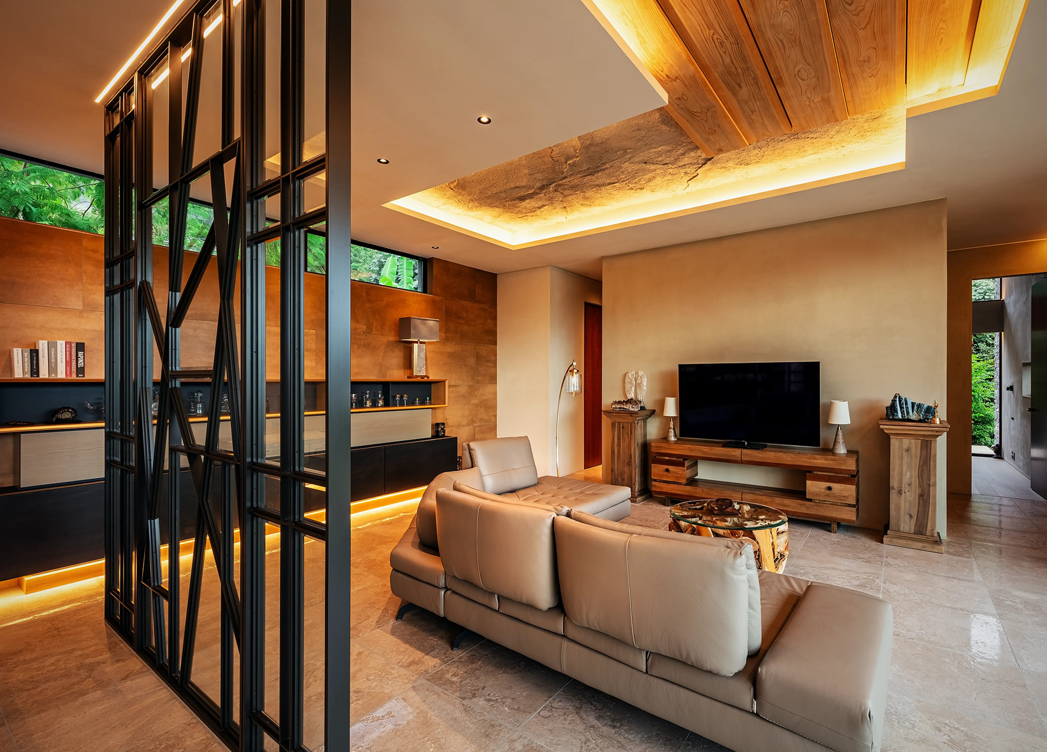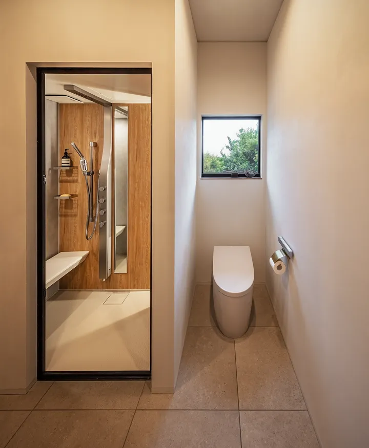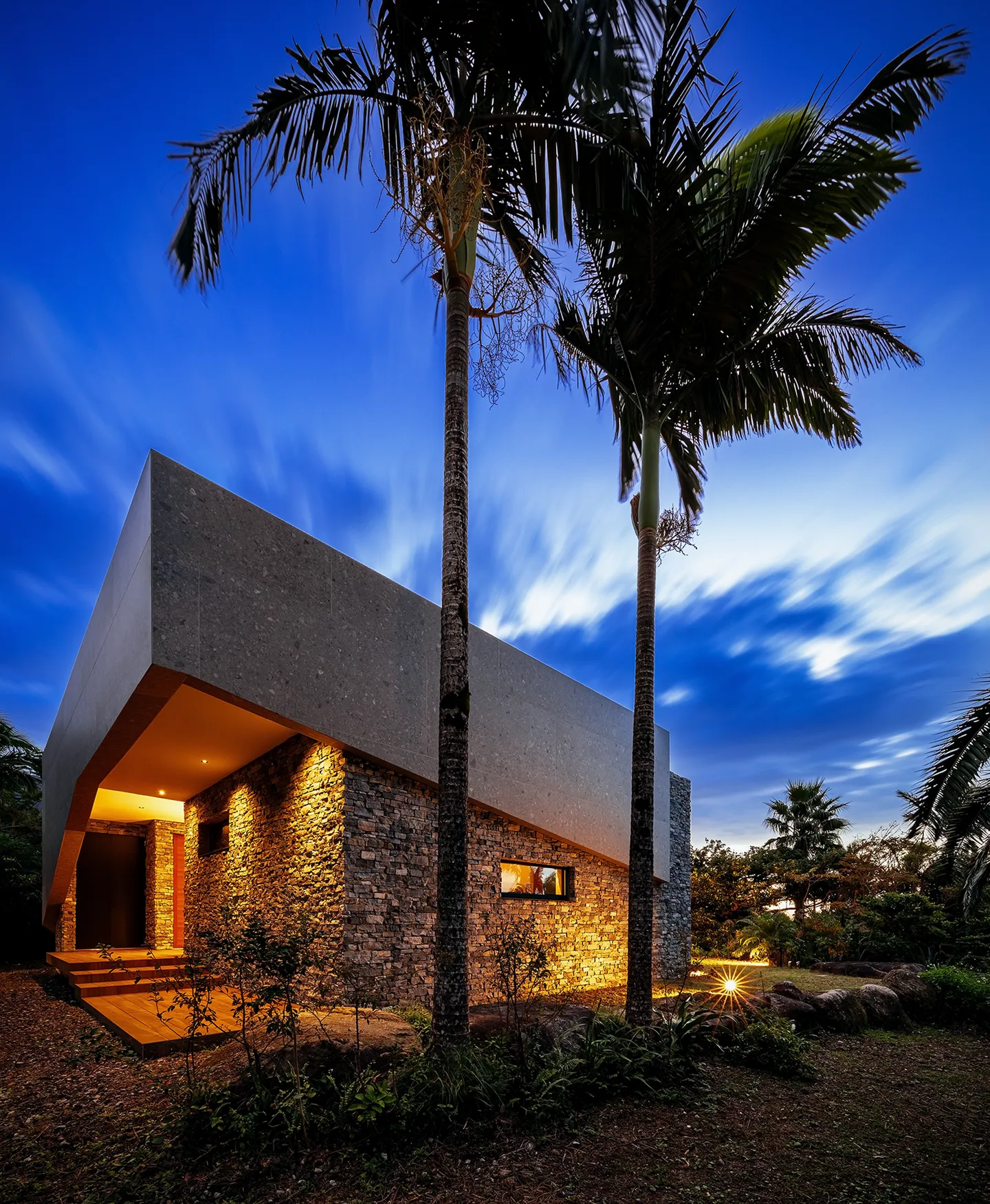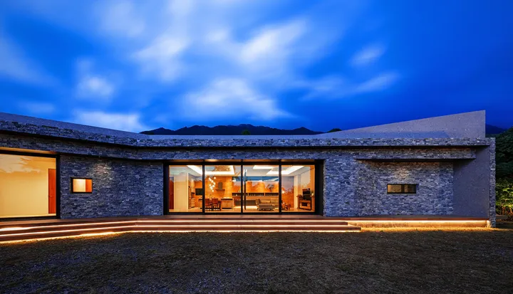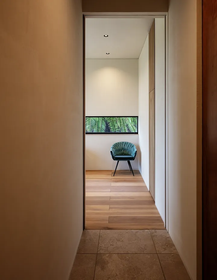 今回新たな設計とした母屋についても、屋久島の自然に同期するように存在することをめざしました。石貼りの壁は、山の中に昔からあった遺跡のような佇まいで、建築を風景の一部として静かに溶け込ませています。LDKは〈開放的で活力のある場〉に向けて大きく開き、一方で主寝室や浴室は、森や沢、落水の気配を間近に感じられる〈静寂で厳かな場〉に面して配置しました。