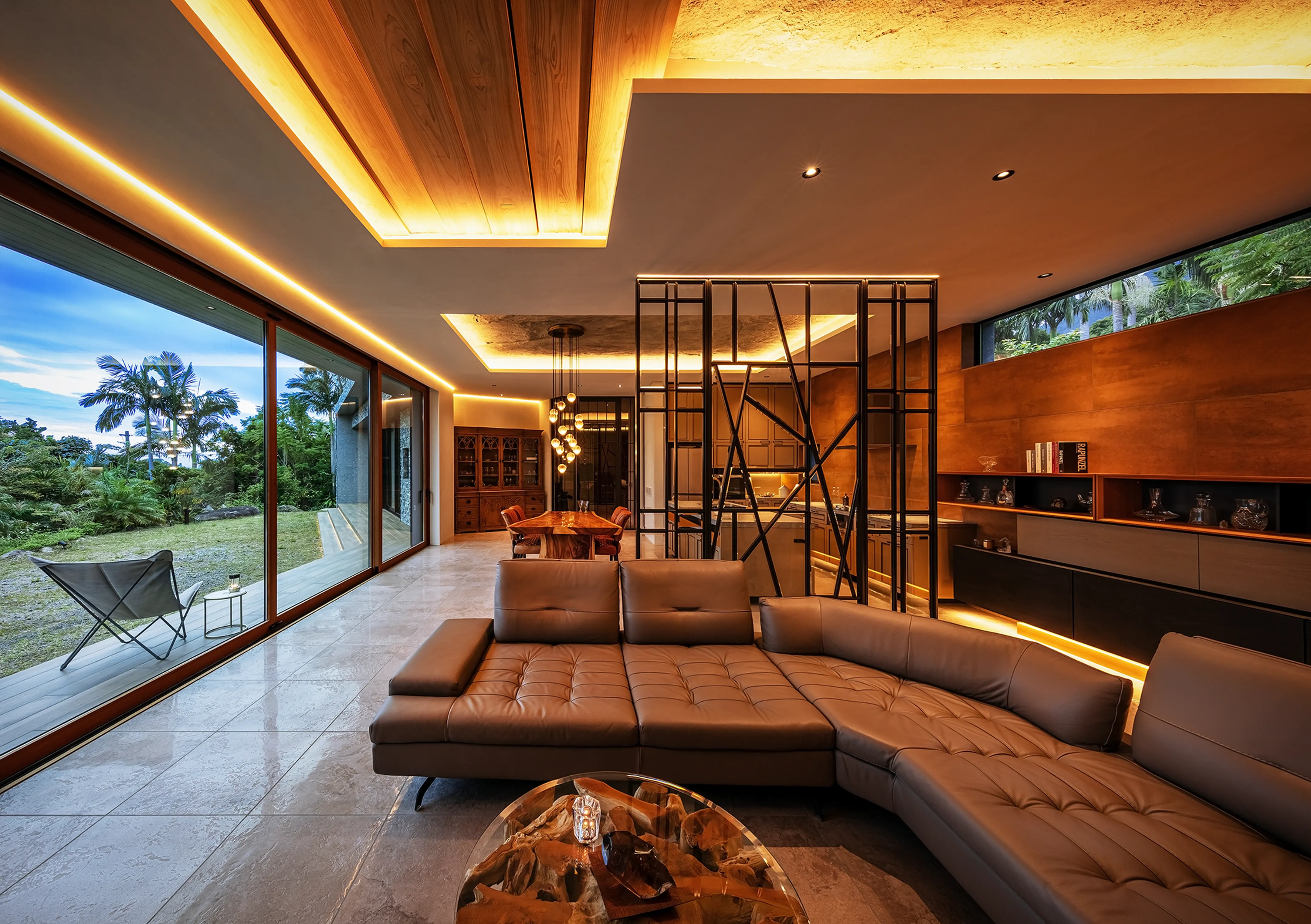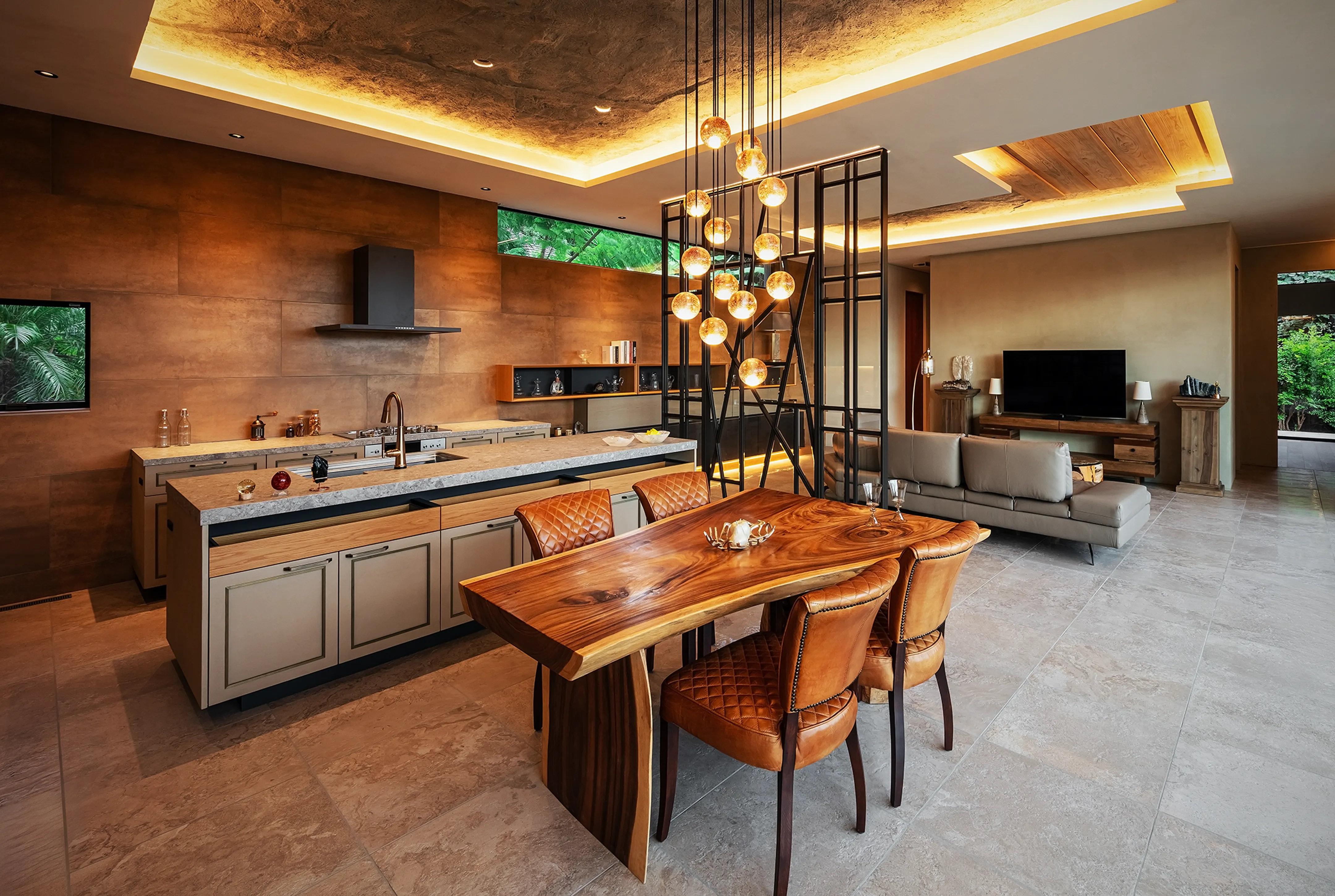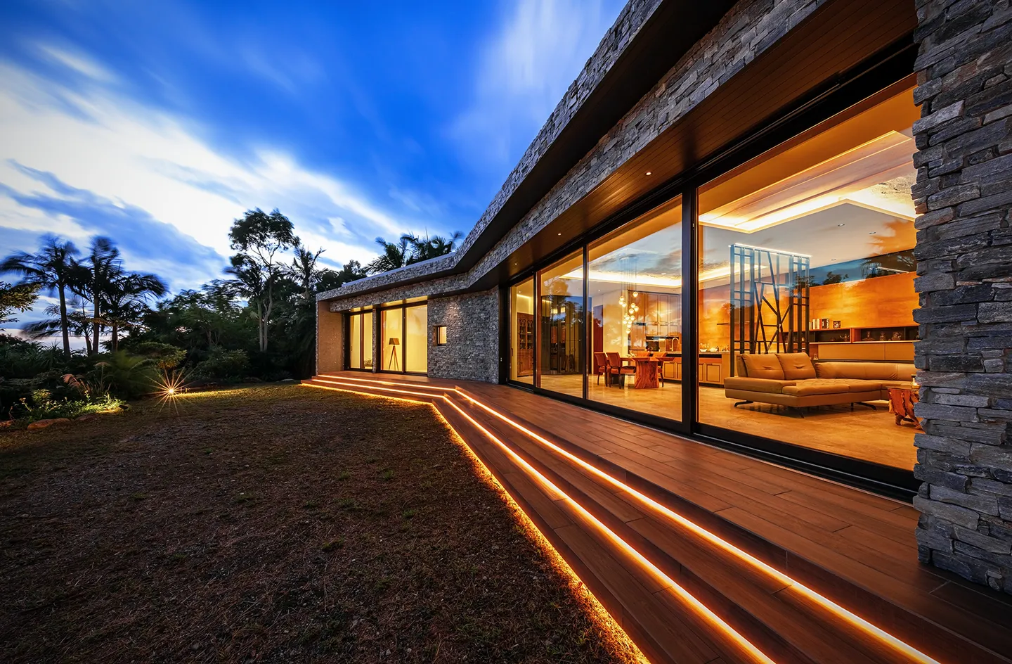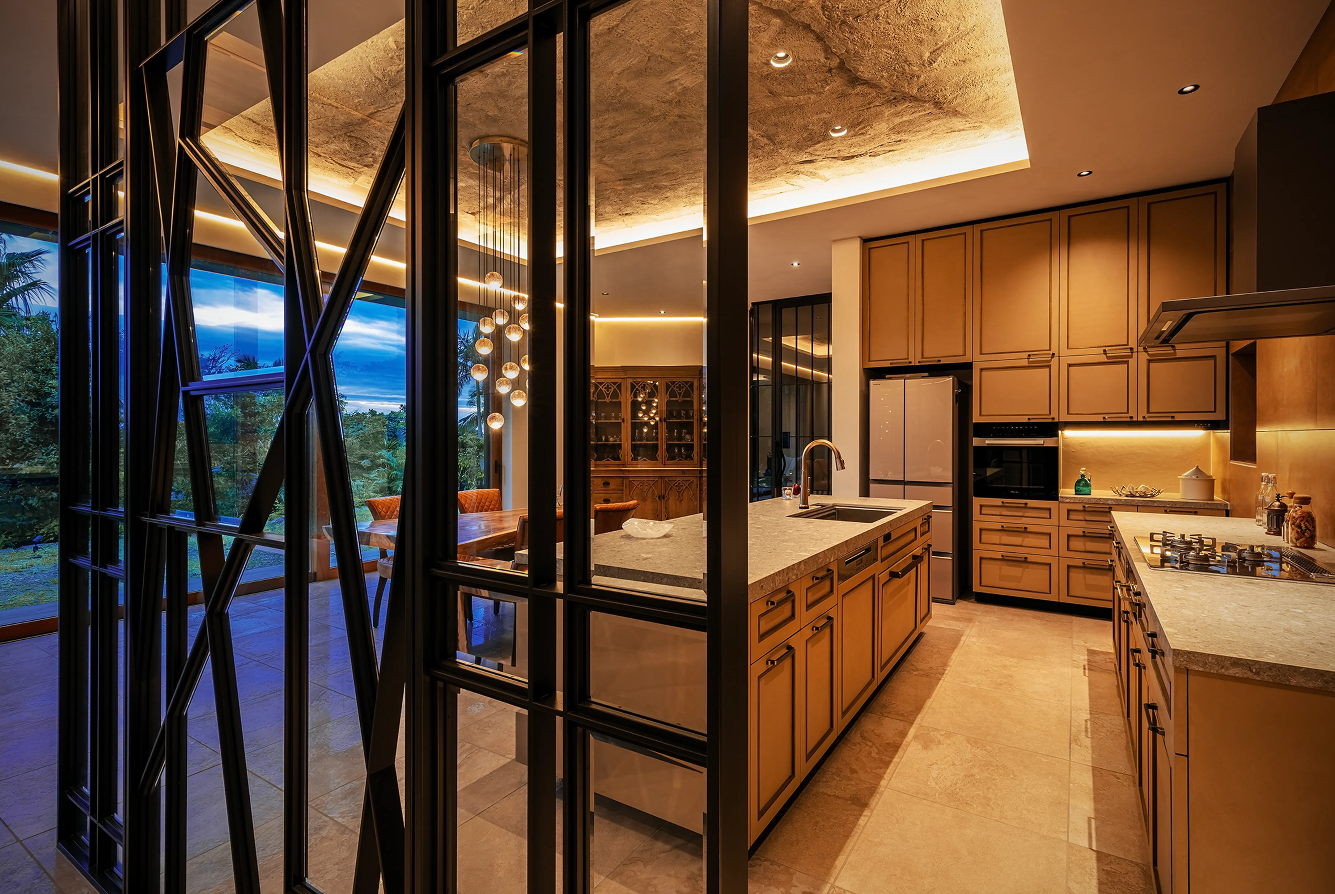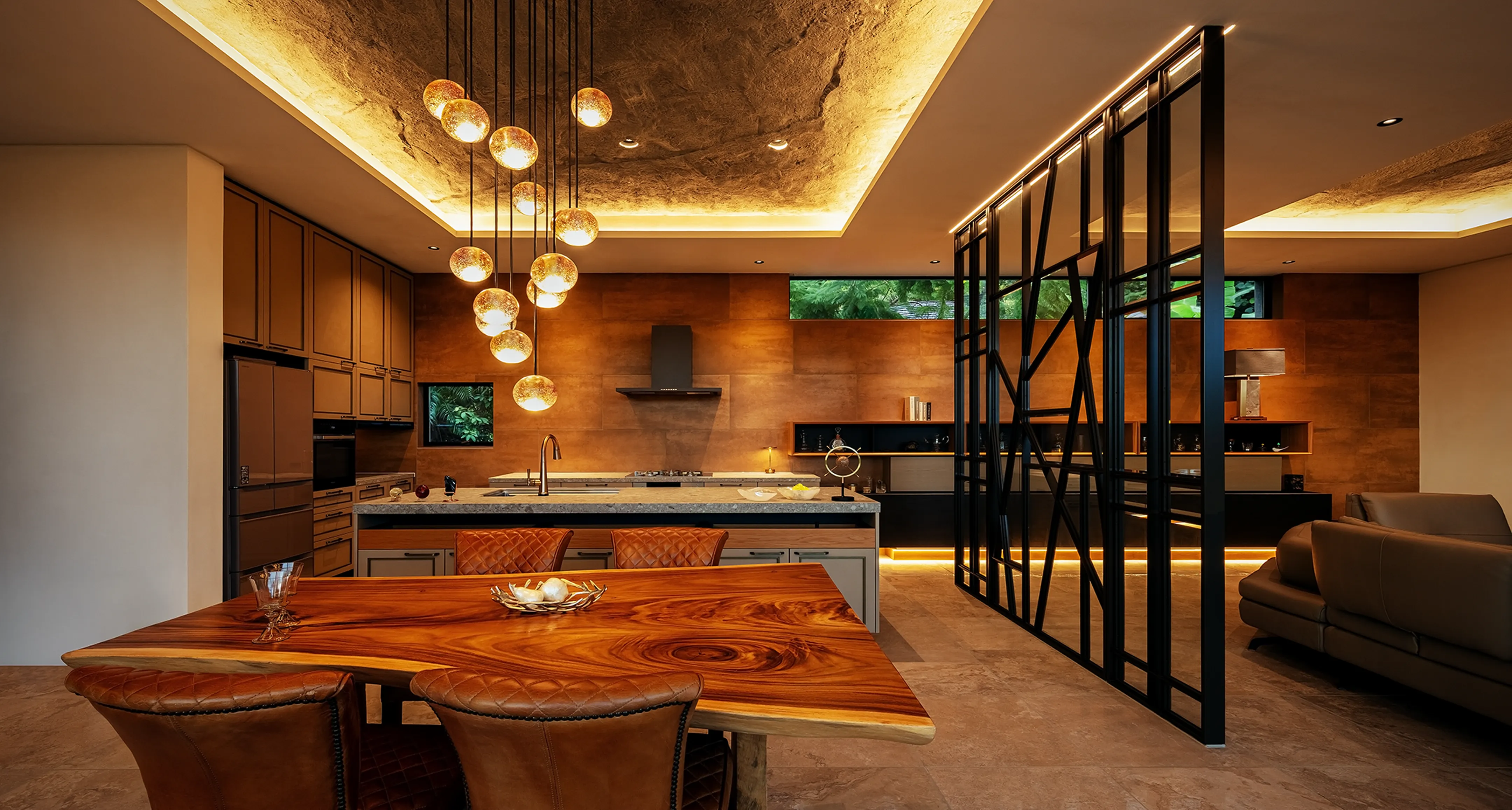 今回新たな設計とした母屋についても、屋久島の自然に同期するように存在することをめざしました。石貼りの壁は、山の中に昔からあった遺跡のような佇まいで、建築を風景の一部として静かに溶け込ませています。LDKは〈開放的で活力のある場〉に向けて大きく開き、一方で主寝室や浴室は、森や沢、落水の気配を間近に感じられる〈静寂で厳かな場〉に面して配置しました。