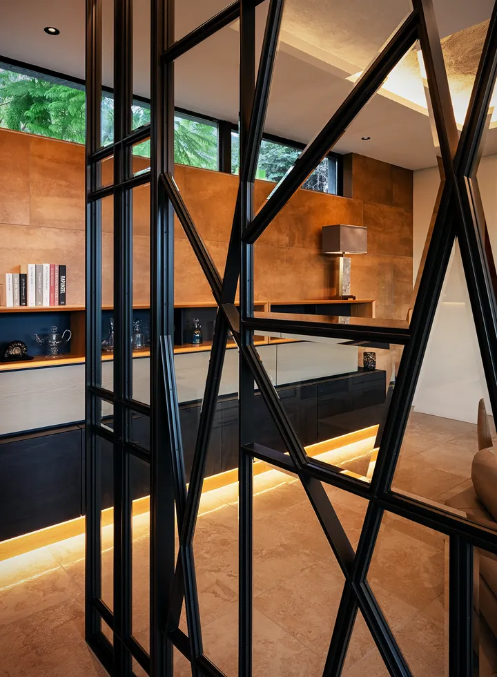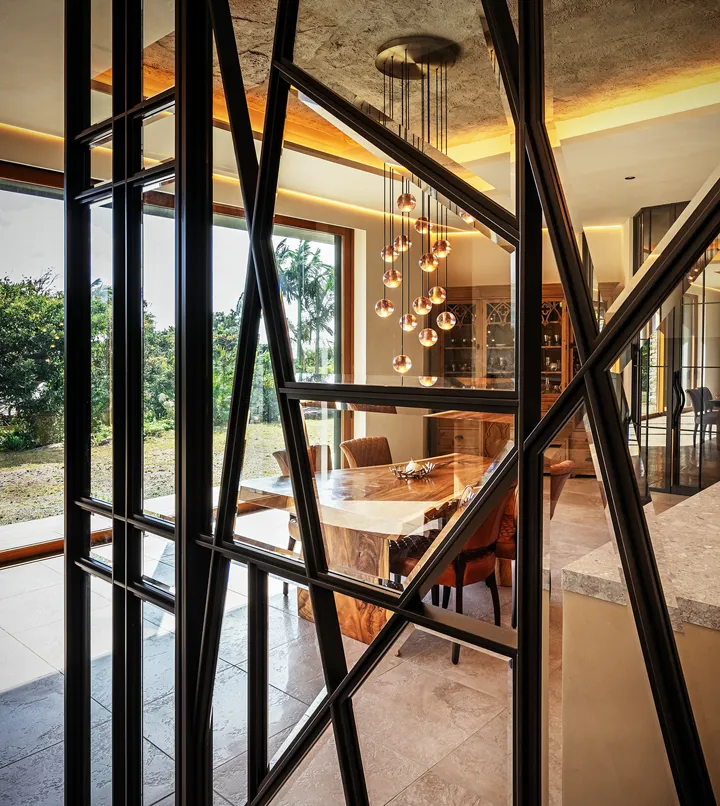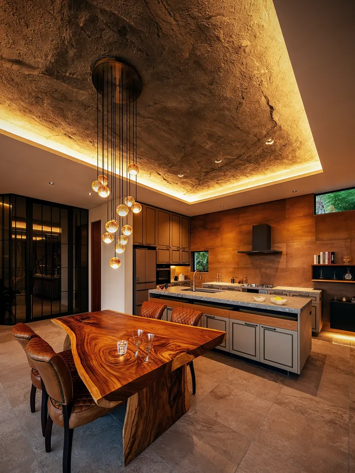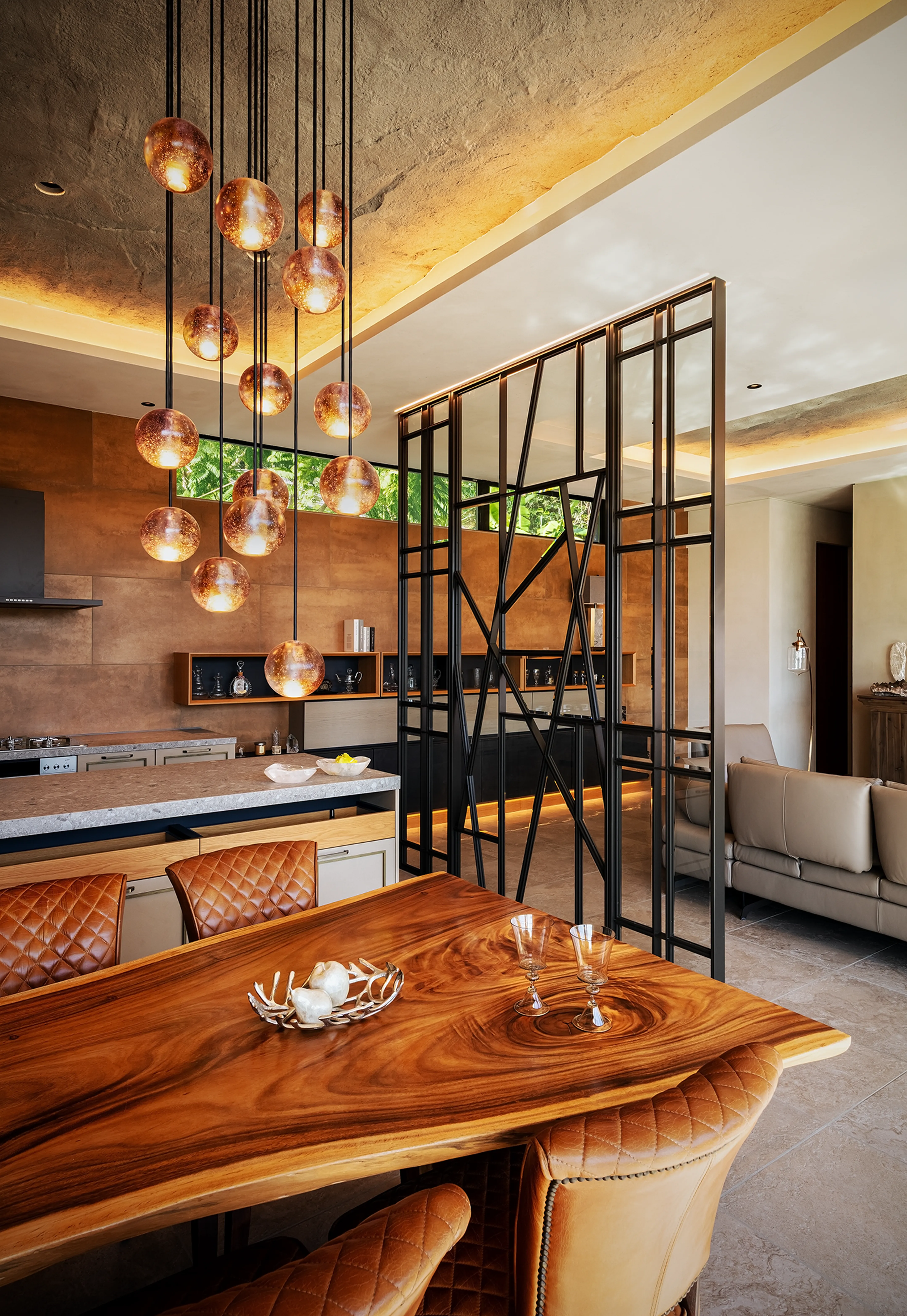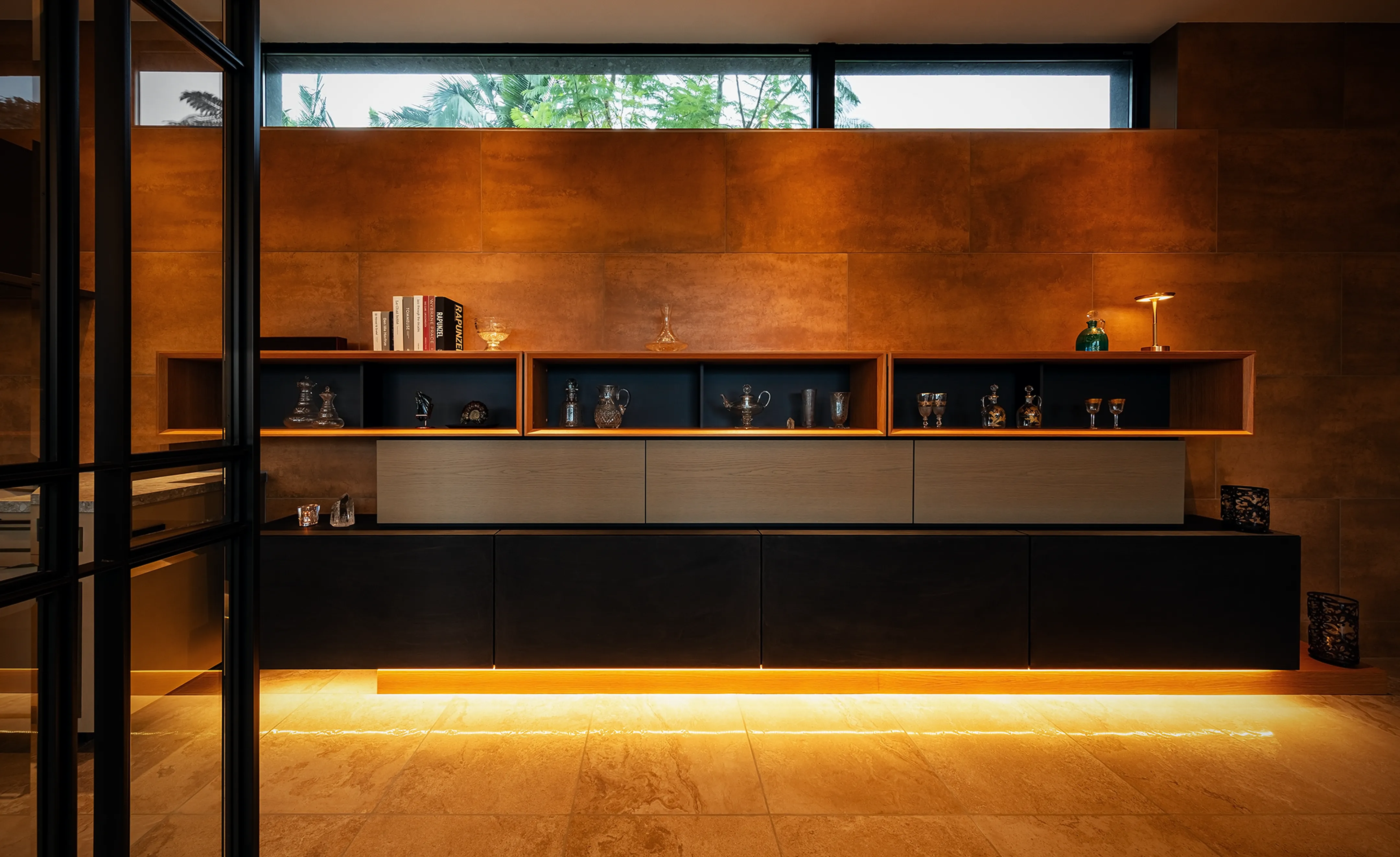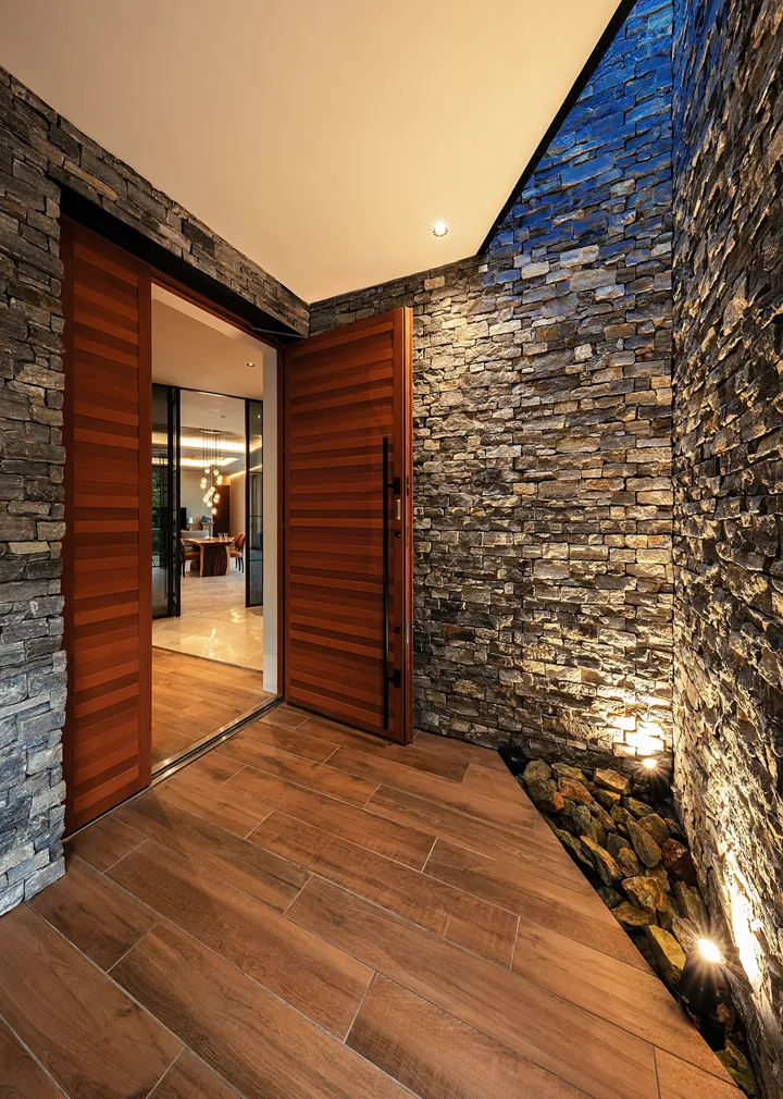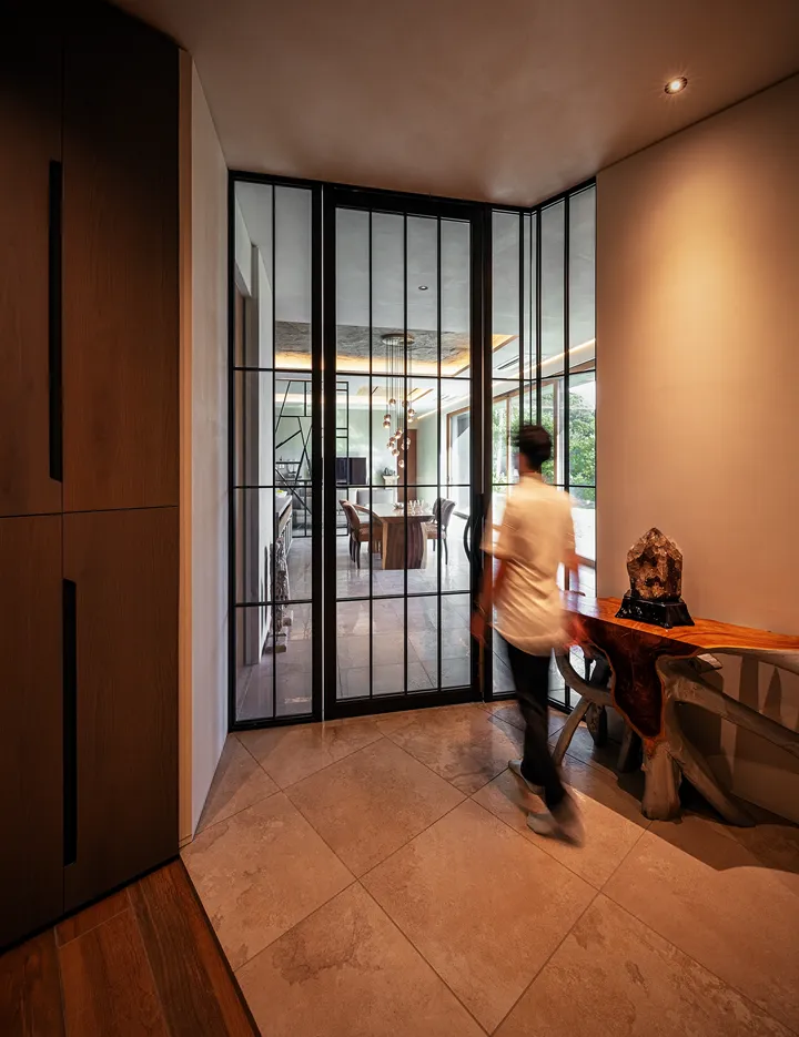 今回新たな設計とした母屋についても、屋久島の自然に同期するように存在することをめざしました。石貼りの壁は、山の中に昔からあった遺跡のような佇まいで、建築を風景の一部として静かに溶け込ませています。LDKは〈開放的で活力のある場〉に向けて大きく開き、一方で主寝室や浴室は、森や沢、落水の気配を間近に感じられる〈静寂で厳かな場〉に面して配置しました。